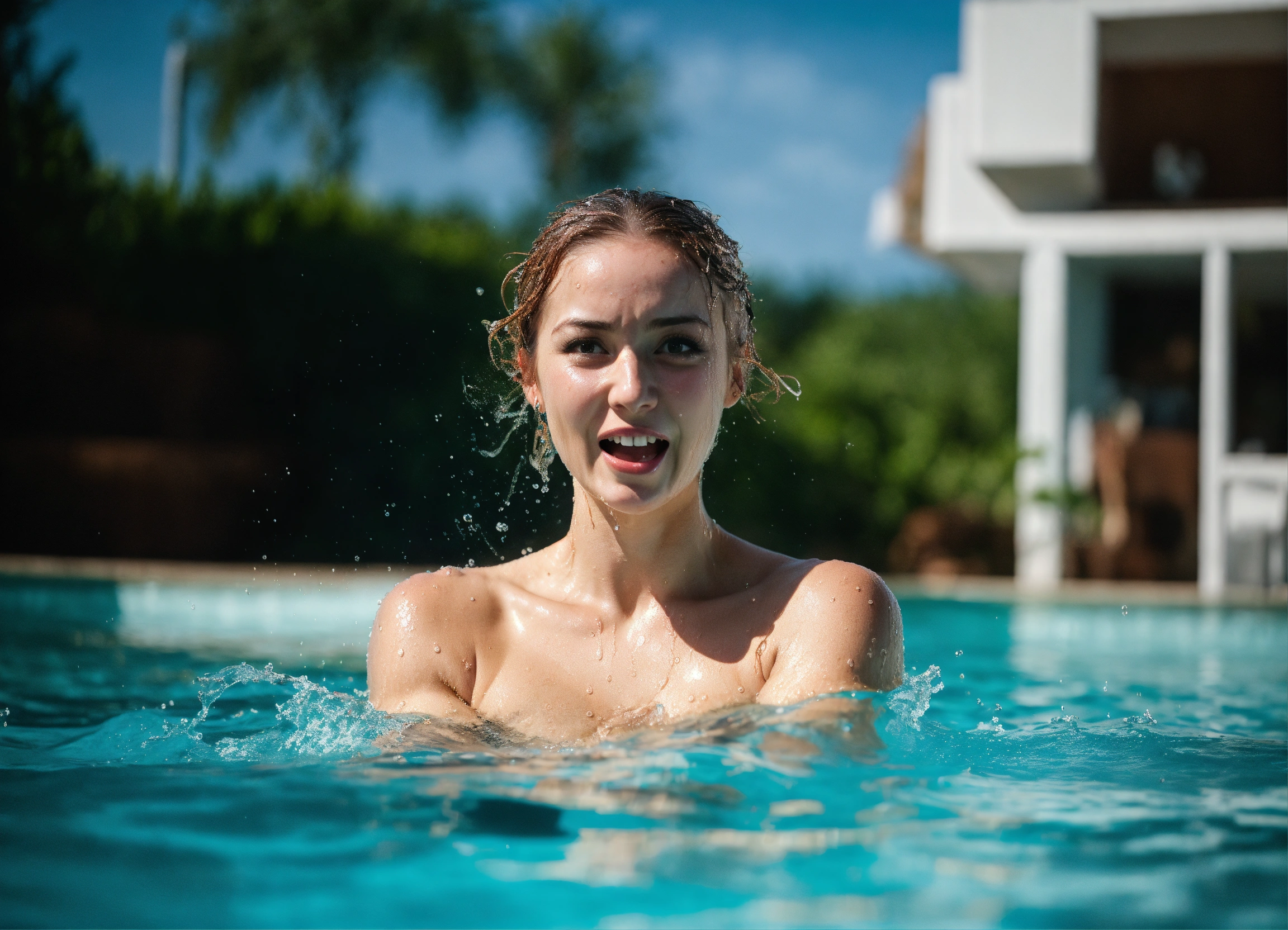 Photo, real, beautiful woman, swimming pool, flustered, shocked, arms folded over chest, hands over chest, exposed, shouting, wide-eyed, open eyes, attractive, perfect face, perfect body, missing clothes, wet skin, splash, hugging self, deep eyes, grabbing chest, gasping, laughing, surprise, wide hips, biceps