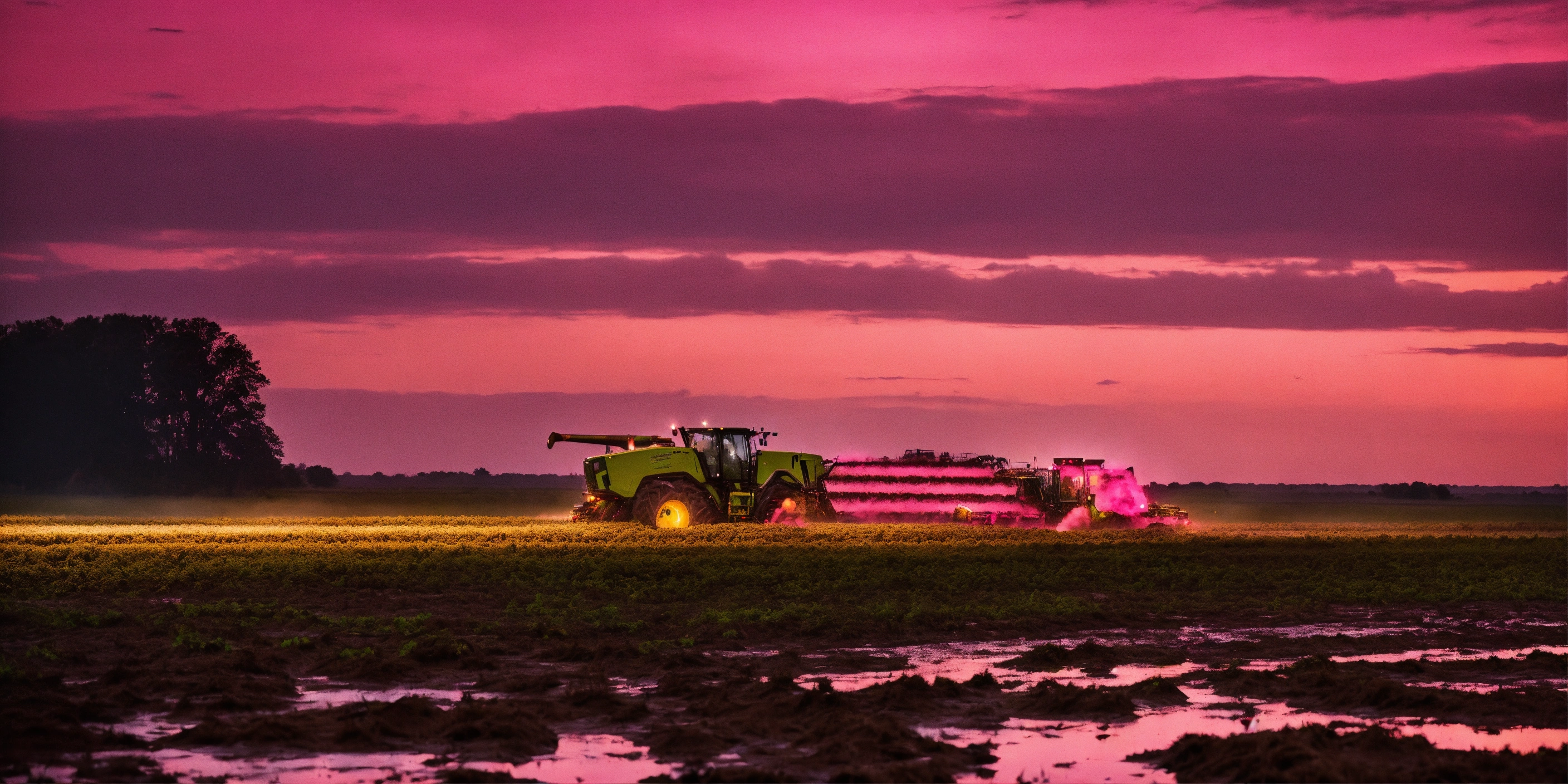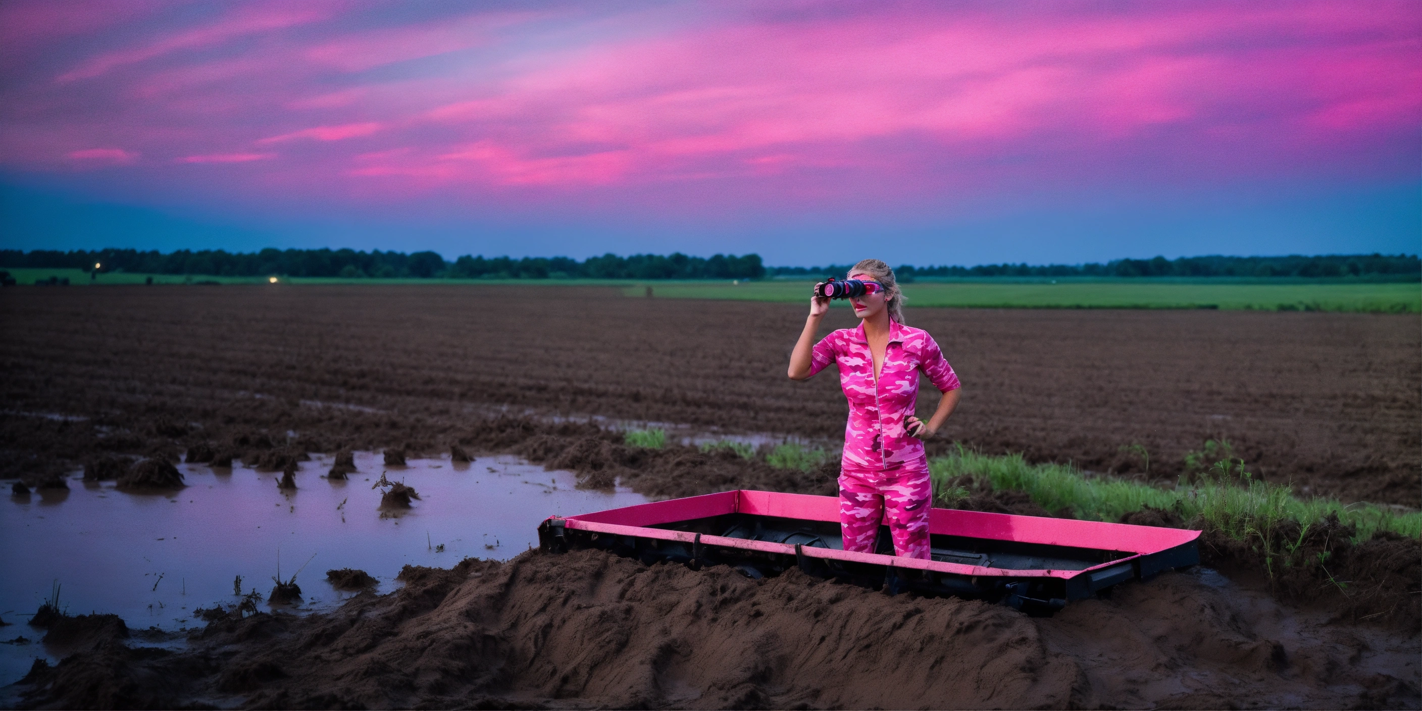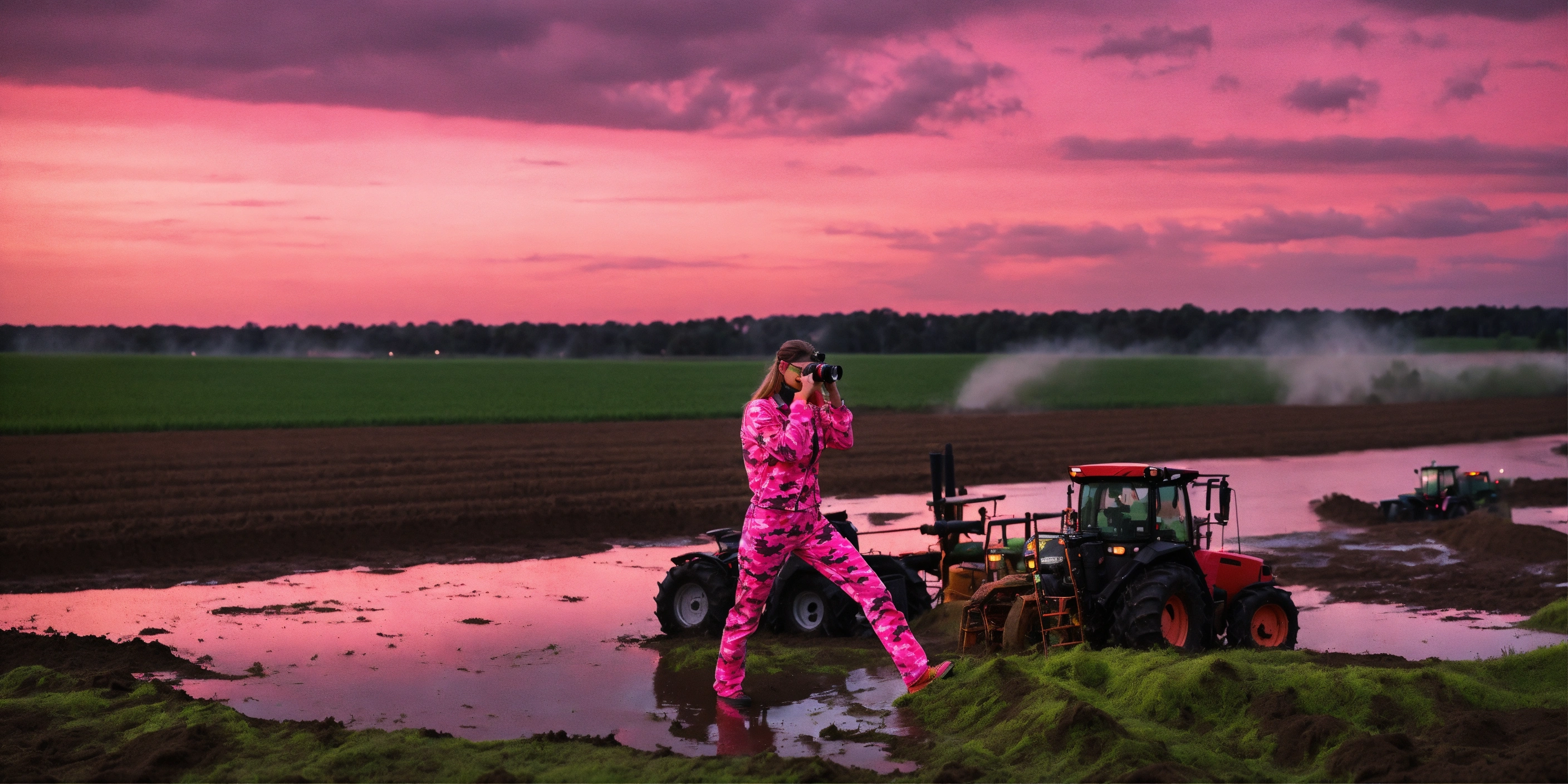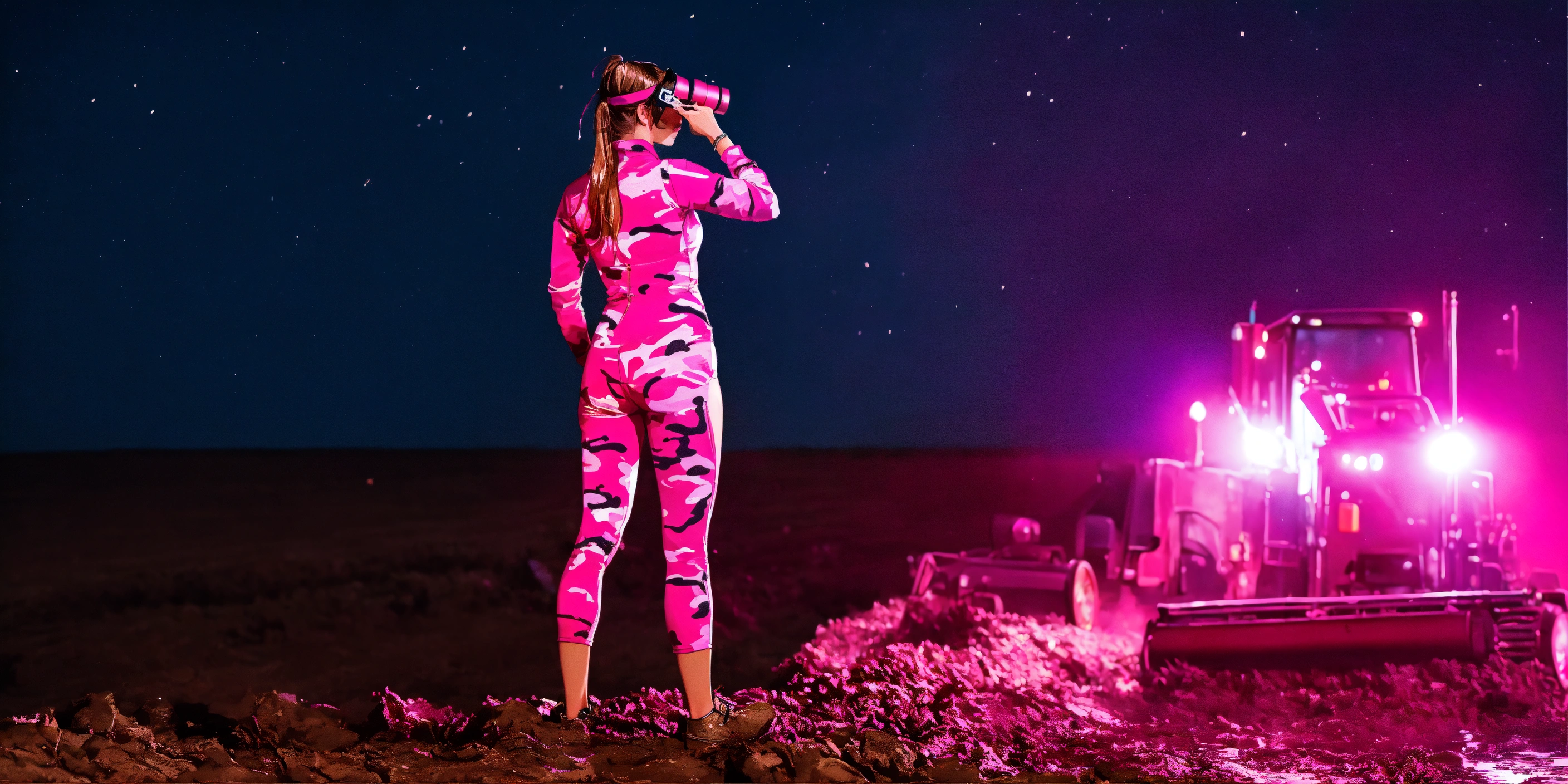 A woman in a pink swimsuit, with her face painted in pink camouflage, is hiding in the mud during nighttime. she’s using binoculars to covertly observe multiple combines and tractors working in a distant field, controlling them with a concealed remote device