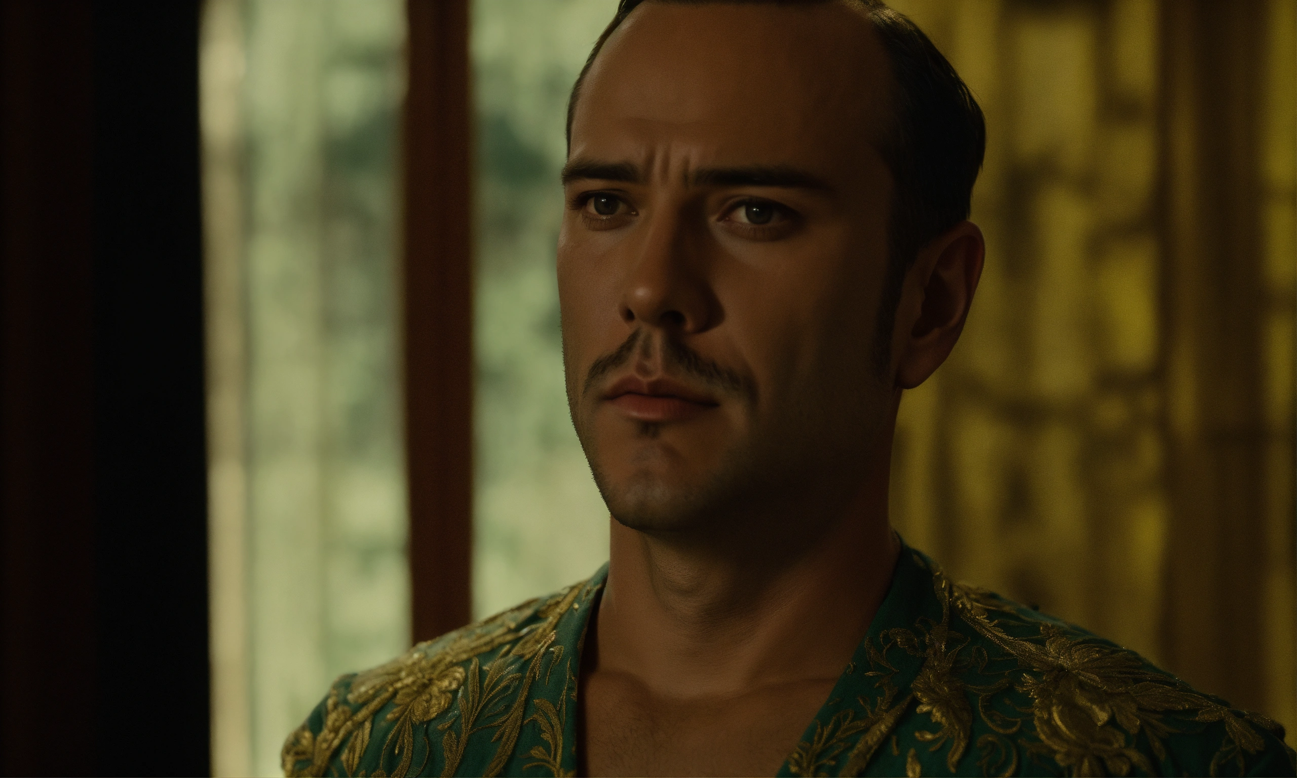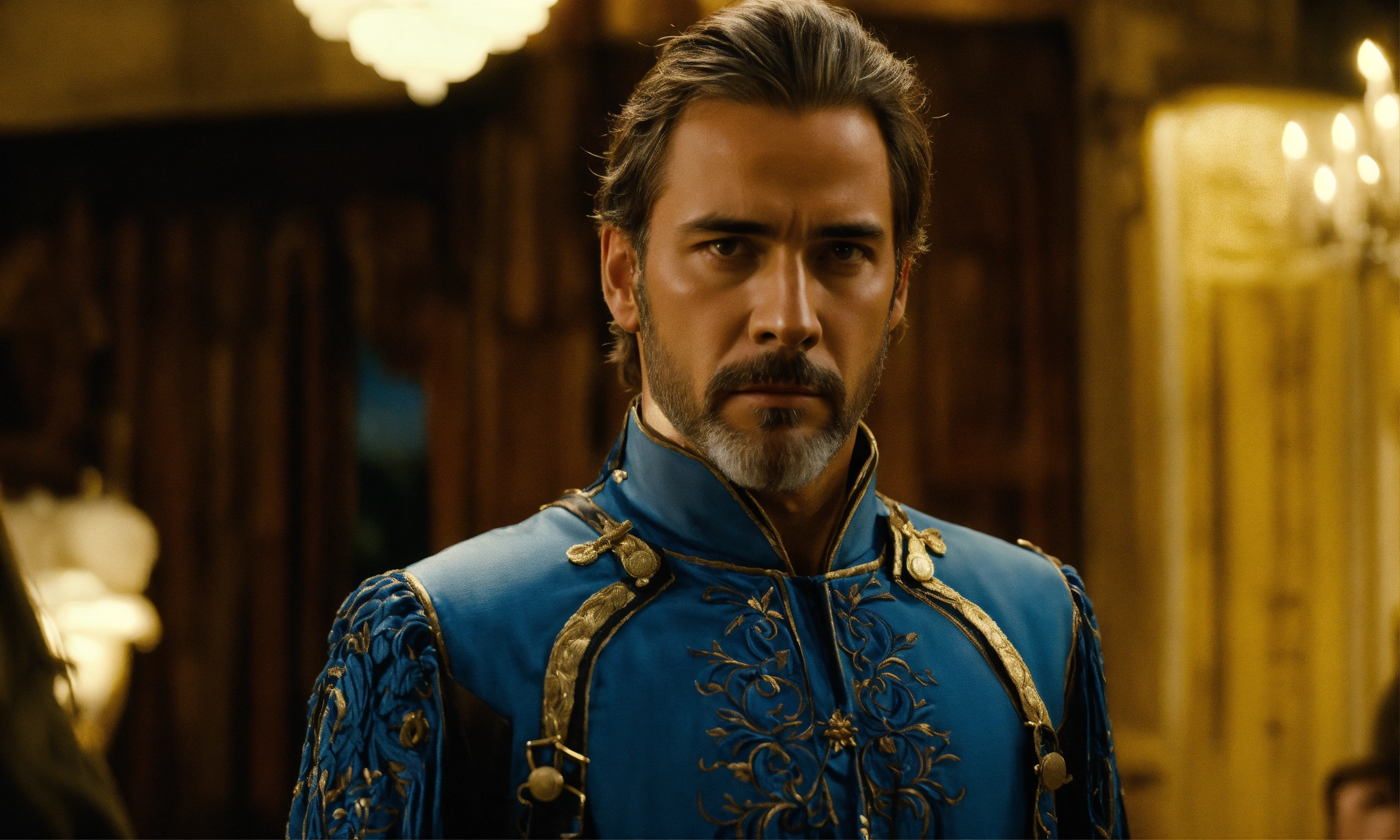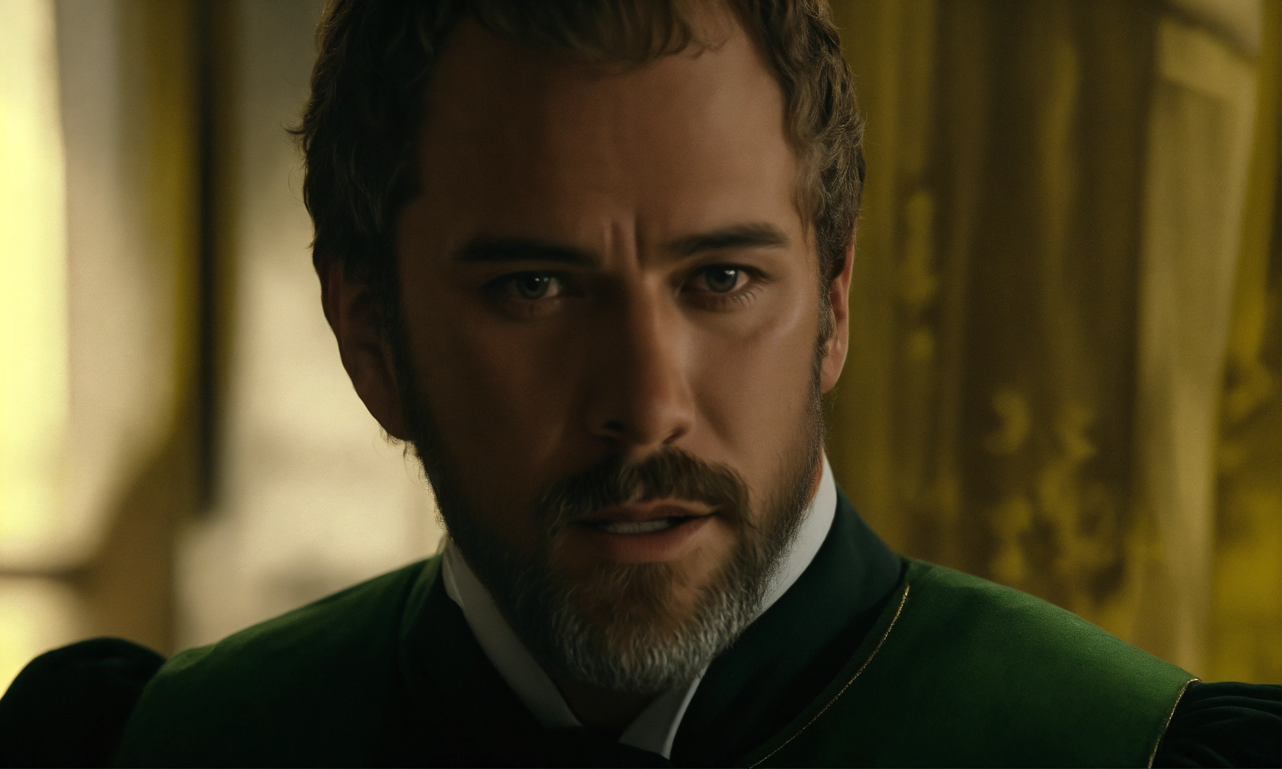 Hombre de cuerpo entero, vestido, del siglo xv, realista y cinematografico, mirando de frente de unos 45 años