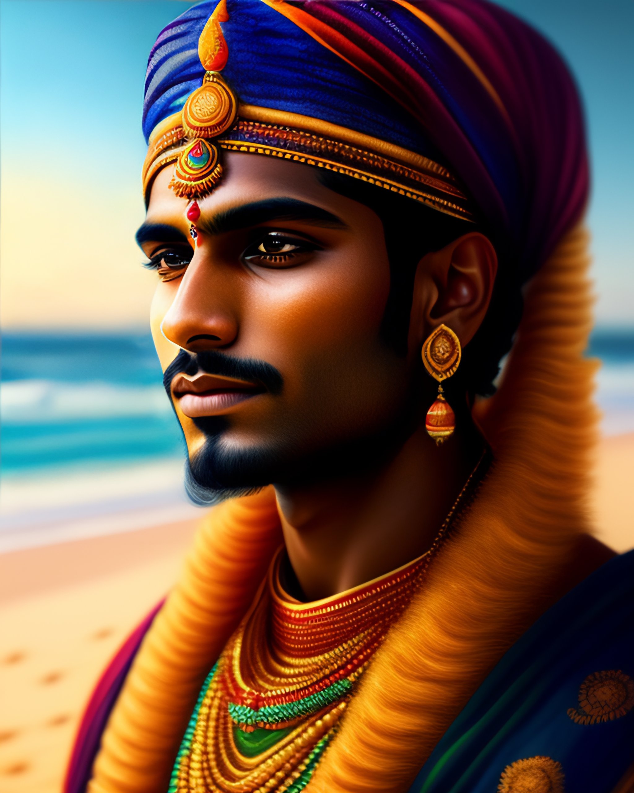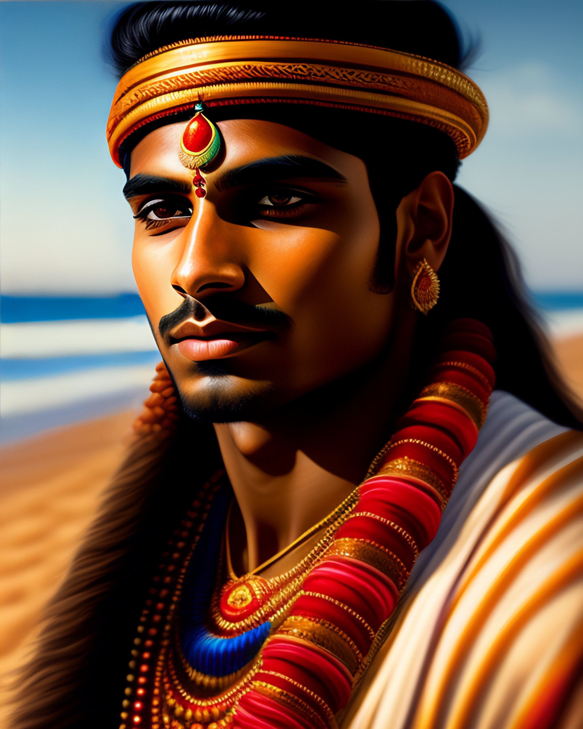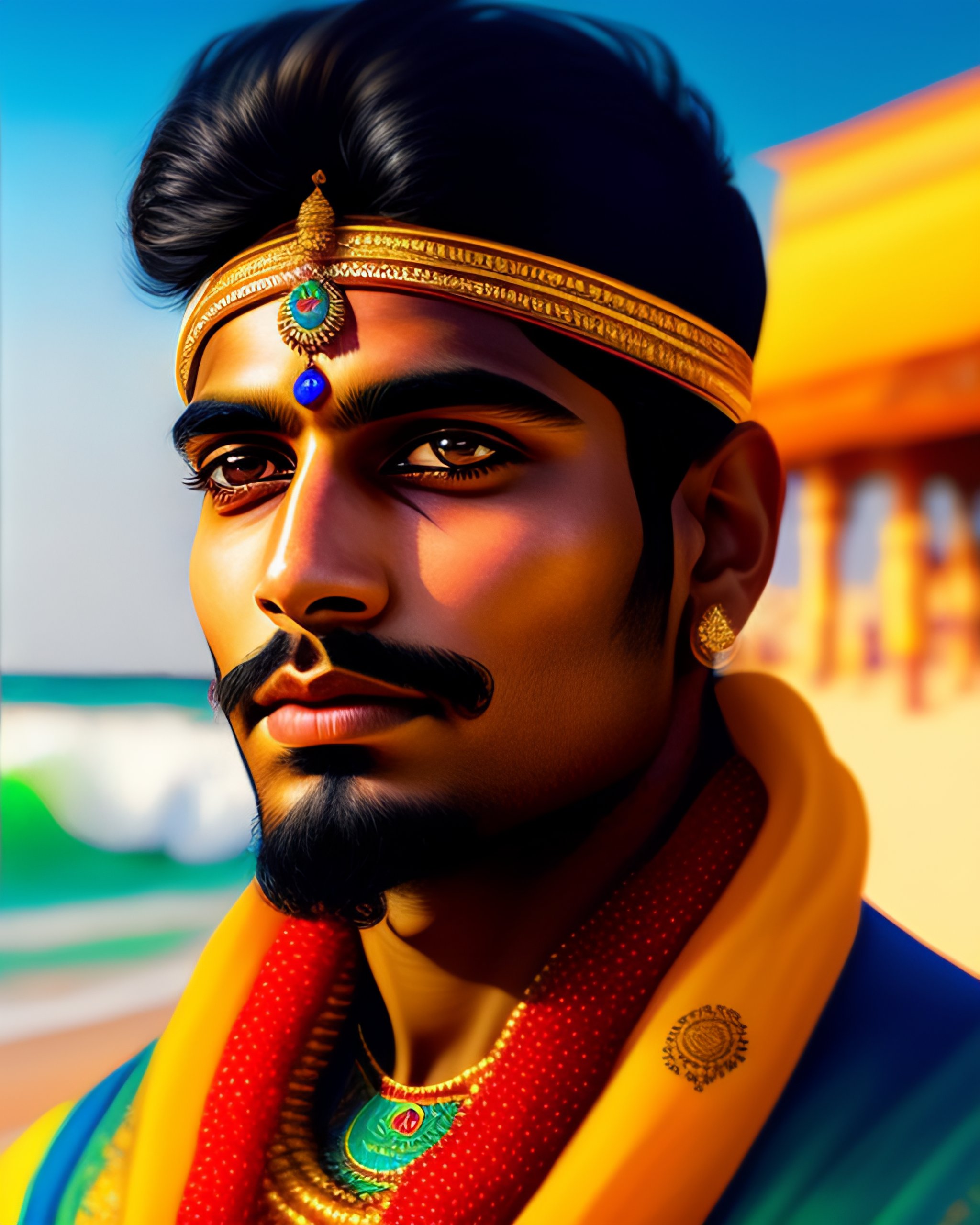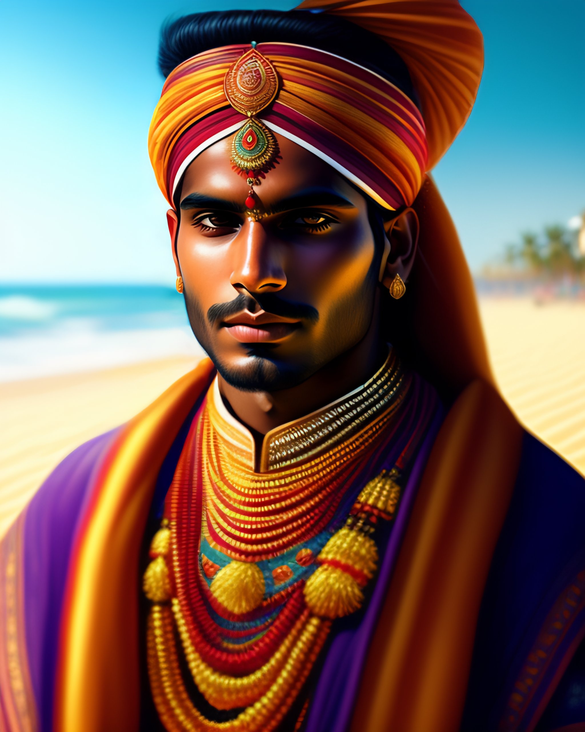 Beautiful highly detailed portrait of a young indian man in traditional clothing at a sunny beach, amazing portrait, intricate, concept art, tender, expressive depiction, illustration, sharp focus, clear lighting, golden ratio, digital painting, masterpiece