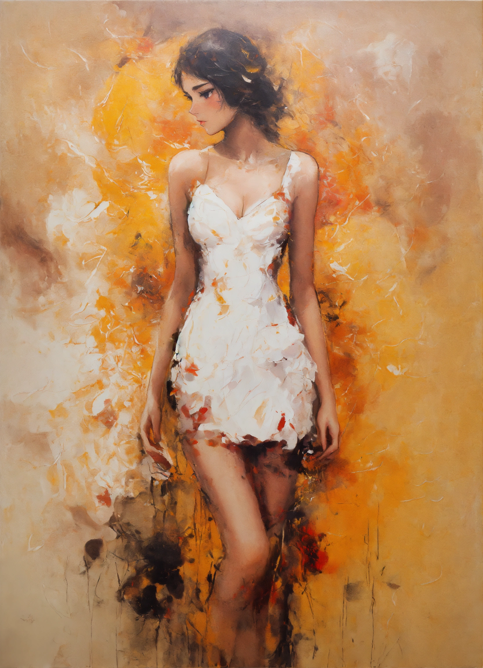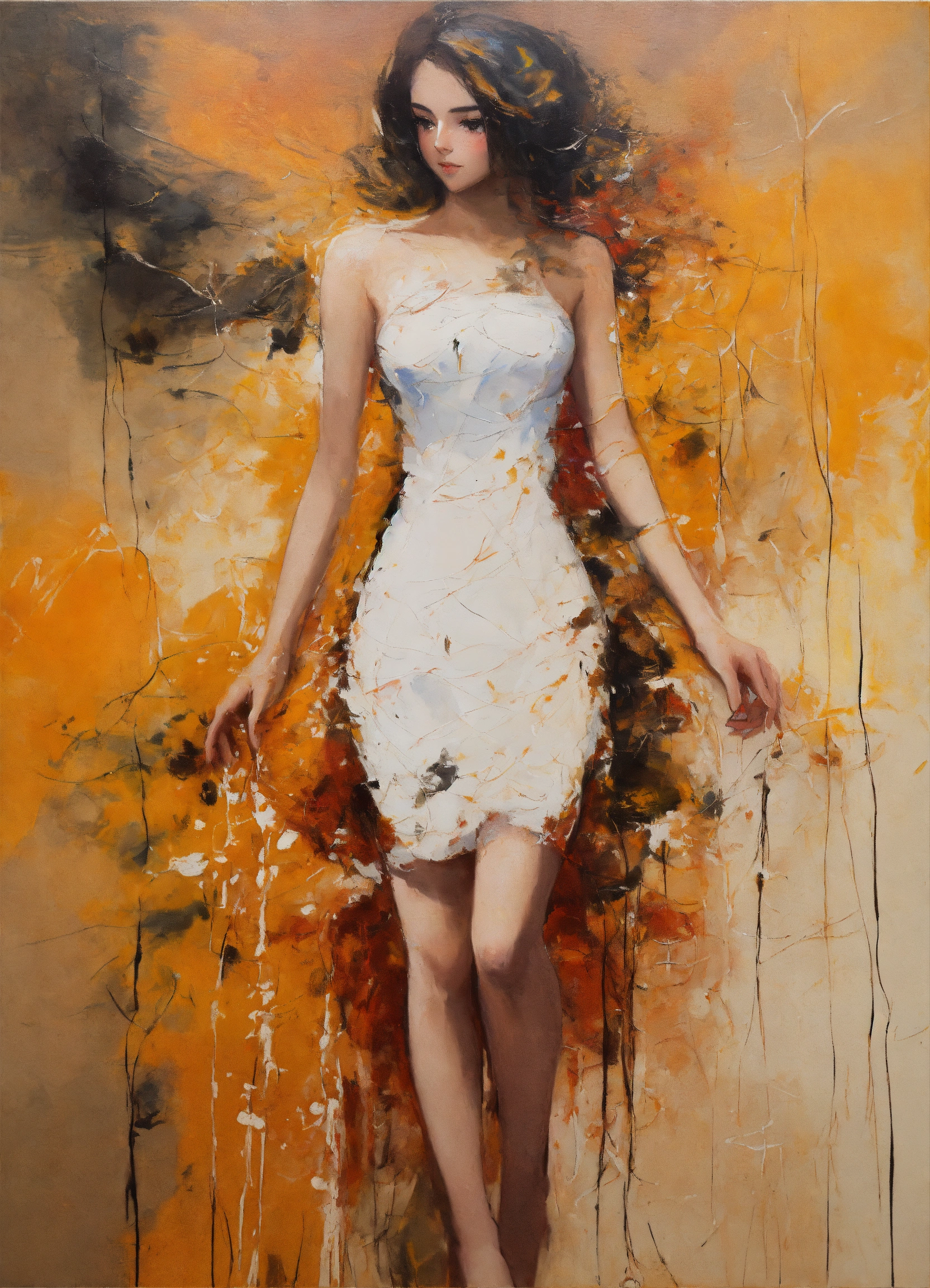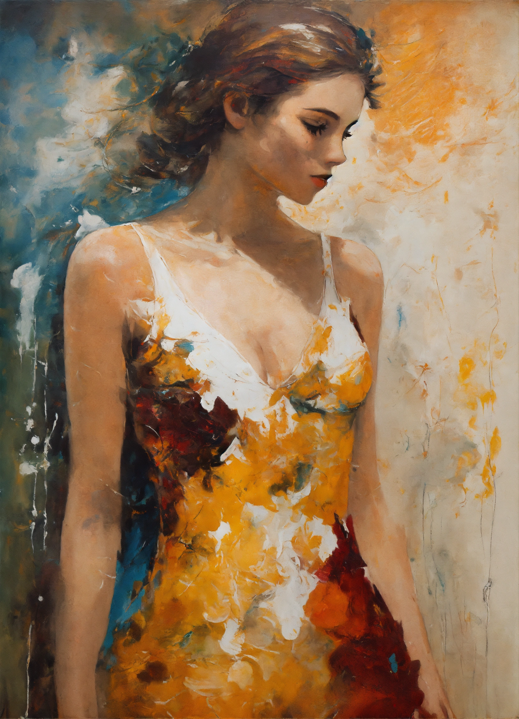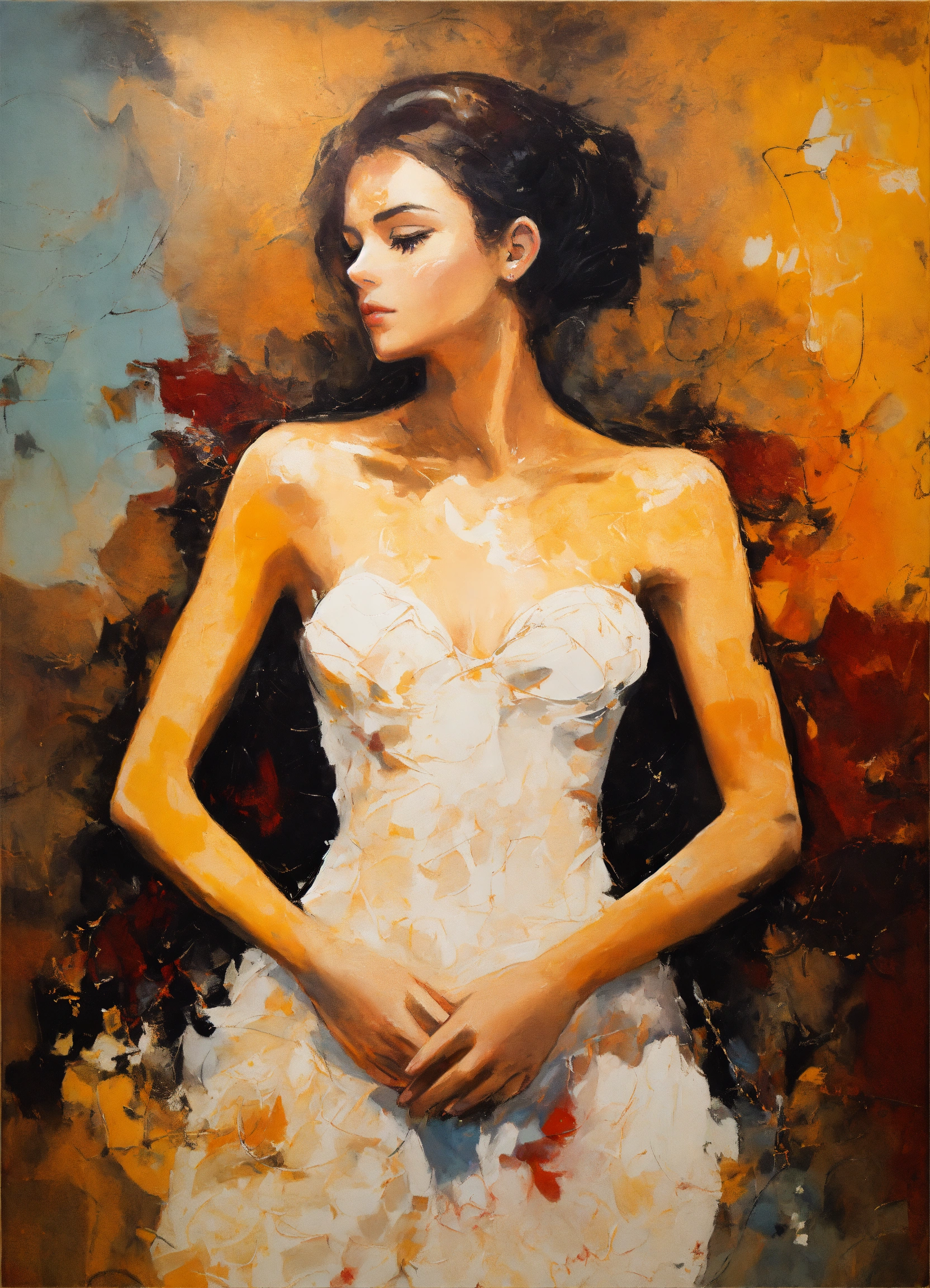 Abstract and minimalist oil painting of a beautiful, different, young, white and mysterious woman body with perfect arms and hands with prom dress in warm tones jackson pollock style