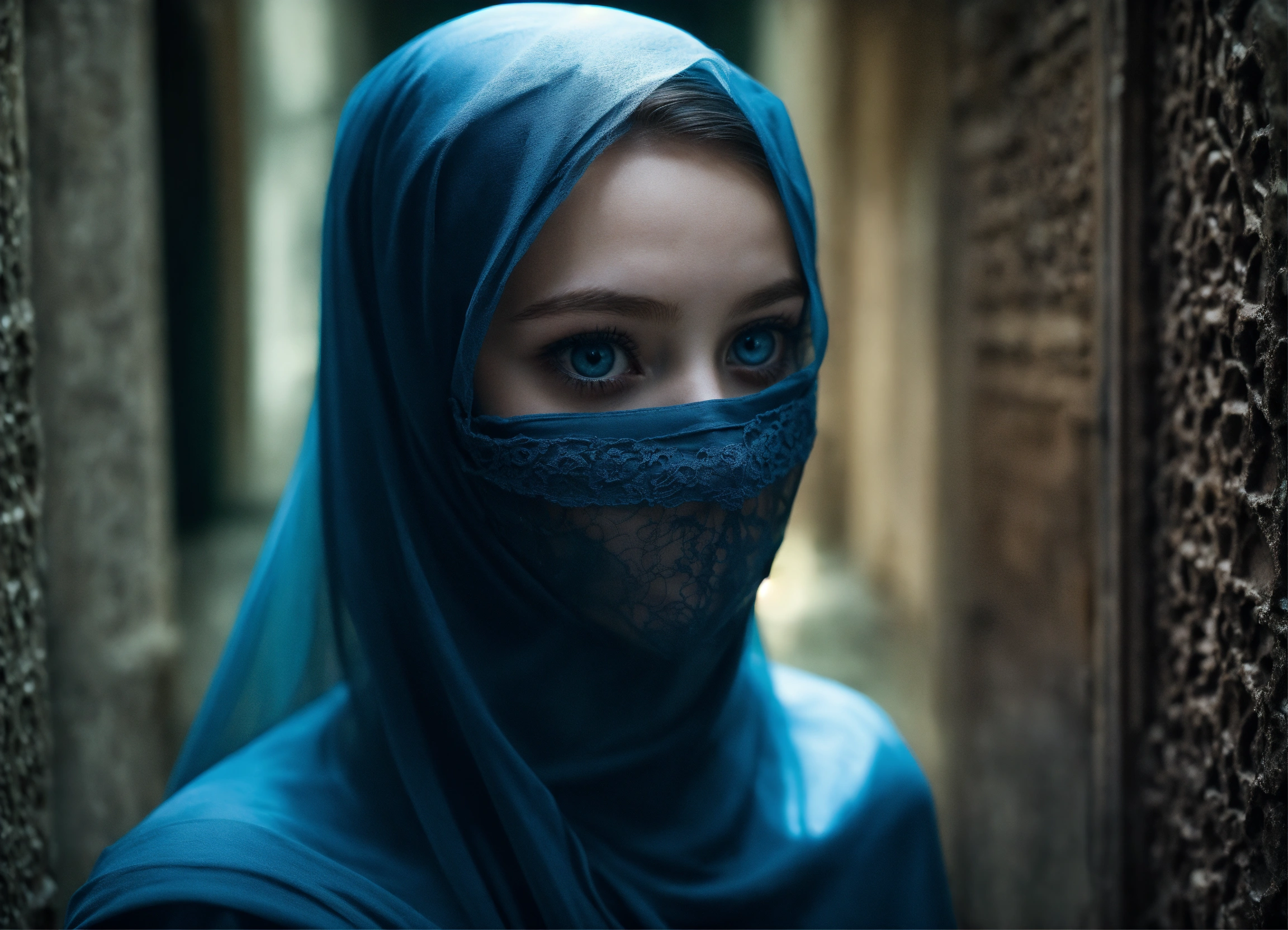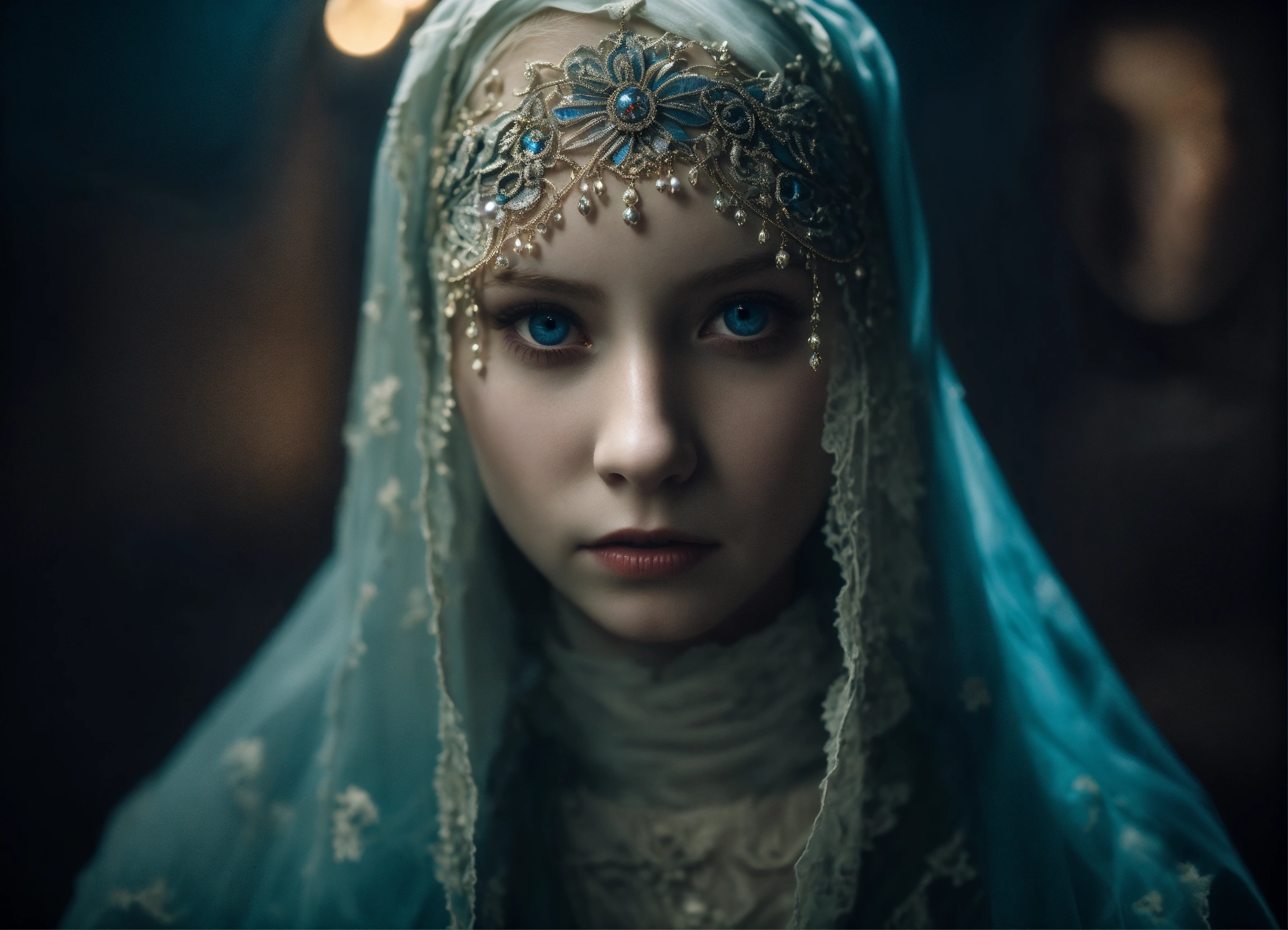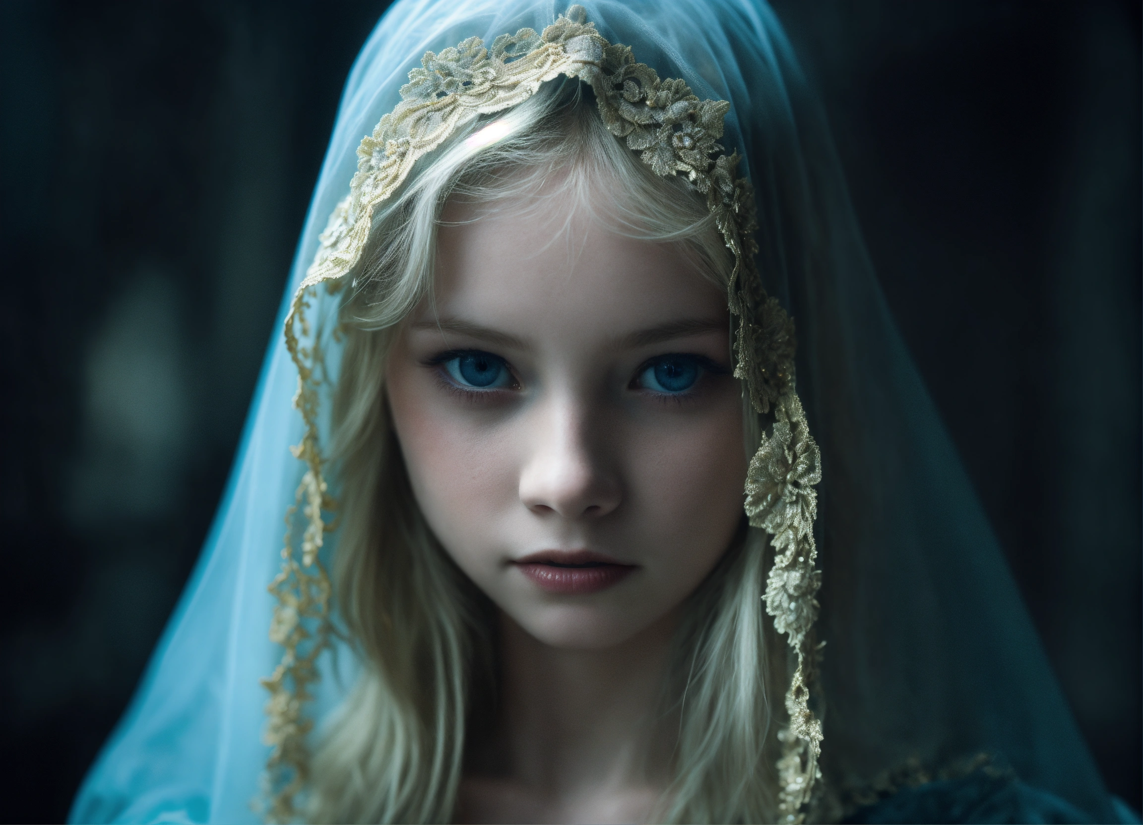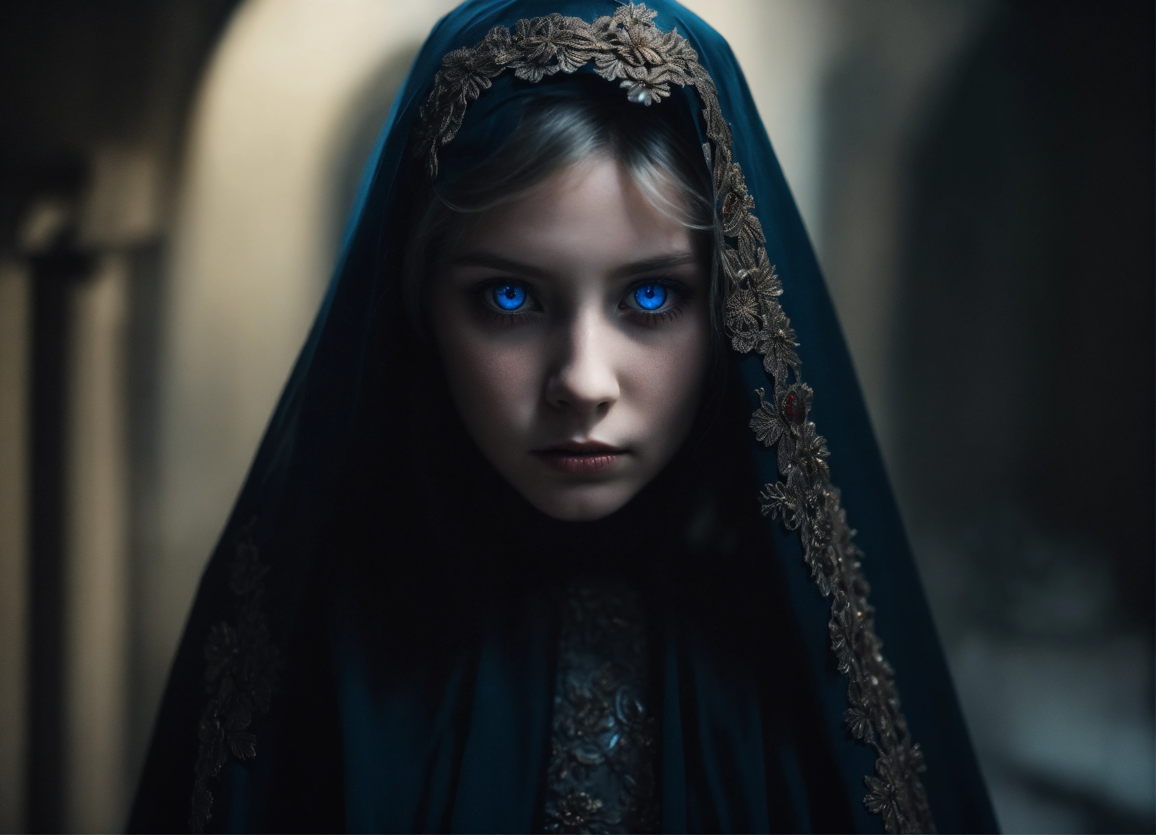 Body portrait of a very childish deadly pale ultra slim twelve year old female child with a veil in the syle of a niqab covers her face, she is a goth necromancer with waist long silverwhite hair, cropped-top and skirt, ultra skinny, very slim body, emaciated body, completely emaciated, ultra narrow face, alabaster skin, pale as a corpse, glowing blue eyes, ultra slim face, innocent looking, in a gloomy crypt, lasziv, kindlich, unschuldig, childlike, verführerisch, graceful, wispy, glowing blue eyes, ghostly, dead, evil, demonic, undead, darkness, grotesque, mysterious, dark, cold ambient lighting, extremely detailed, fantasy, medieval setting