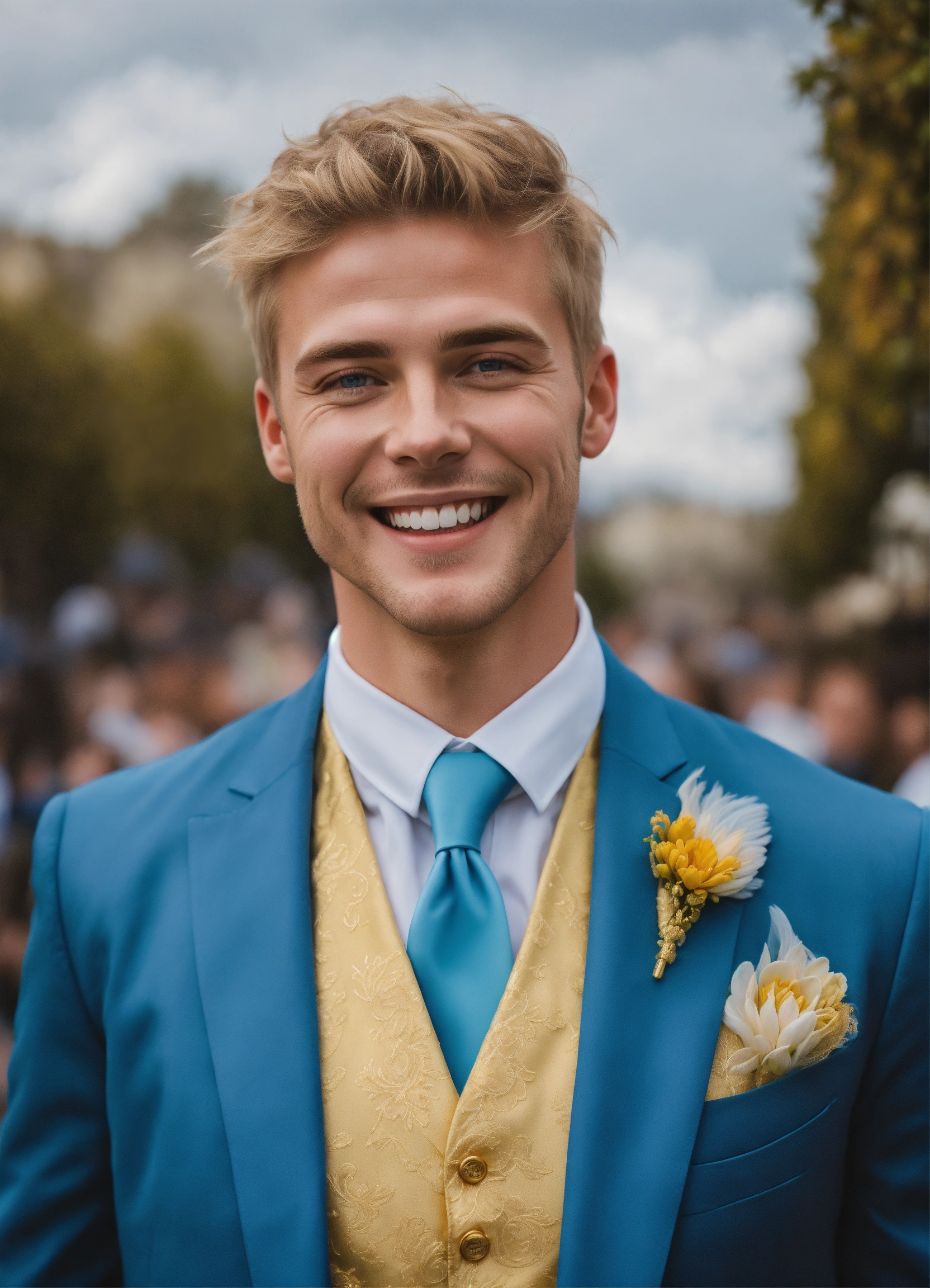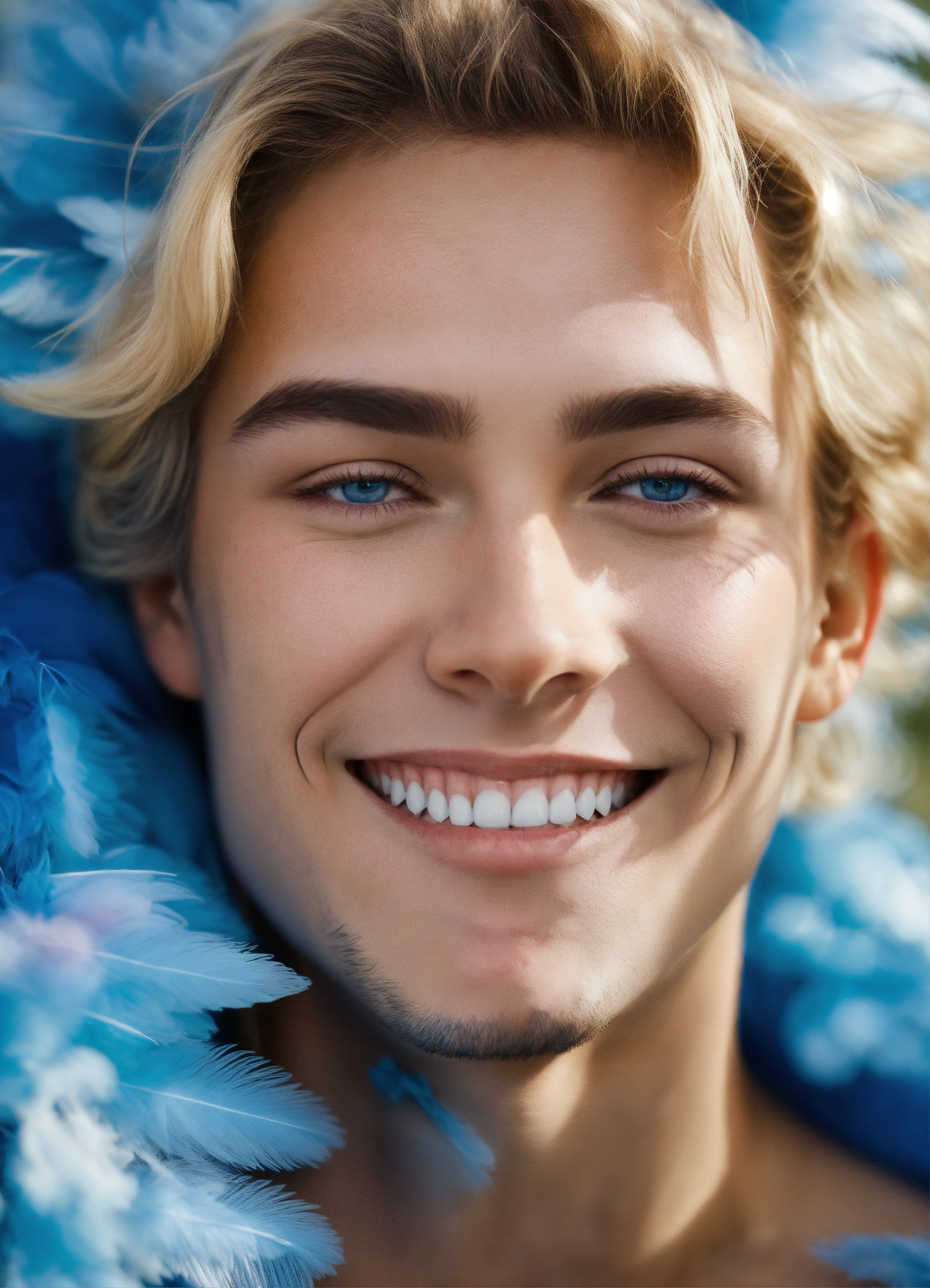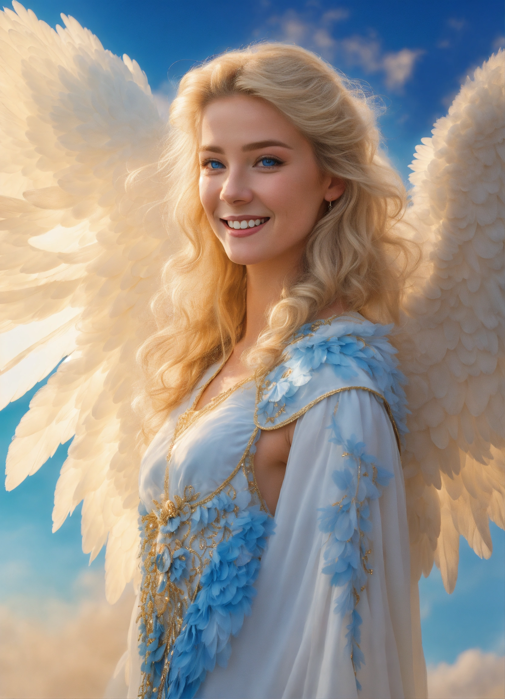 Ange homme blond yeux bleu, grands ailes d'ange et costume dans les couleurs blanc, bleu, or avec en fond des nuages pastels colorés, grand sourire, ultra netteté, 16 k, très beau, céleste beauté