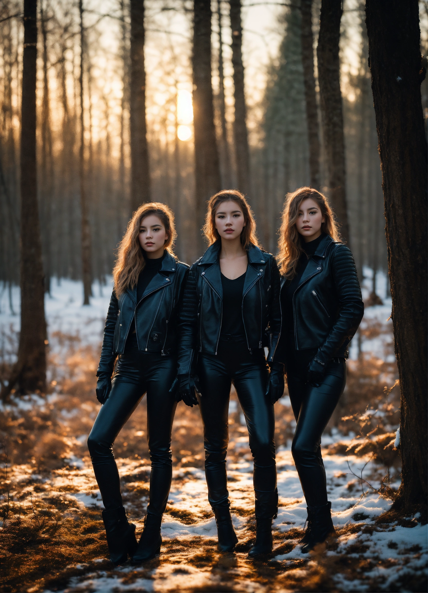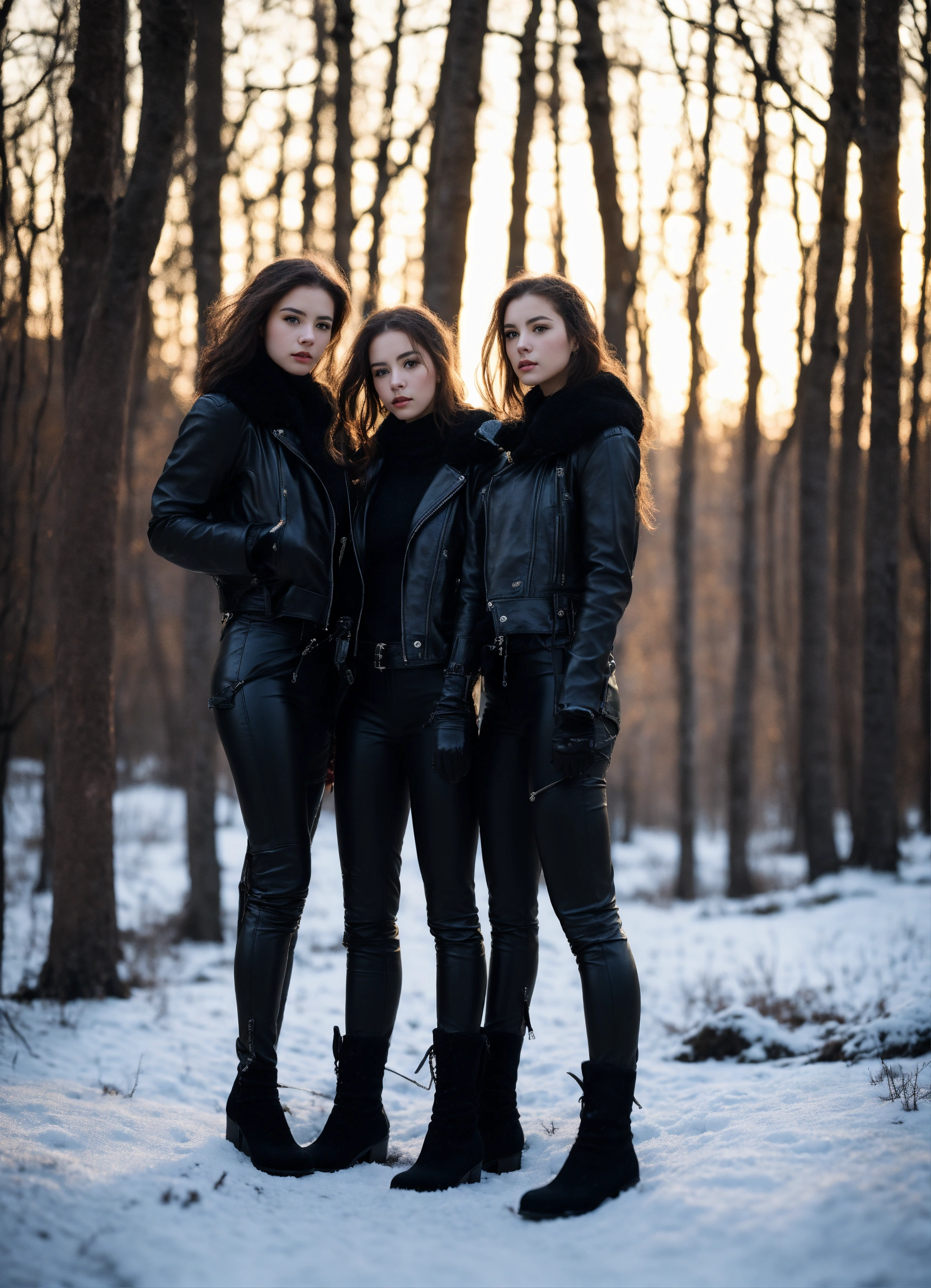 Three young women, wearing a closed black leather jackets and black leather pants, black leather gloves, posing in a snowy forrest landscape, beautiful, moody lighting, sunset, best quality, full body portrait, real picture, intricate details, depth of field, fujifilm xt3, outdoors, beautiful lighting, raw photo, 8k uhd, film grain