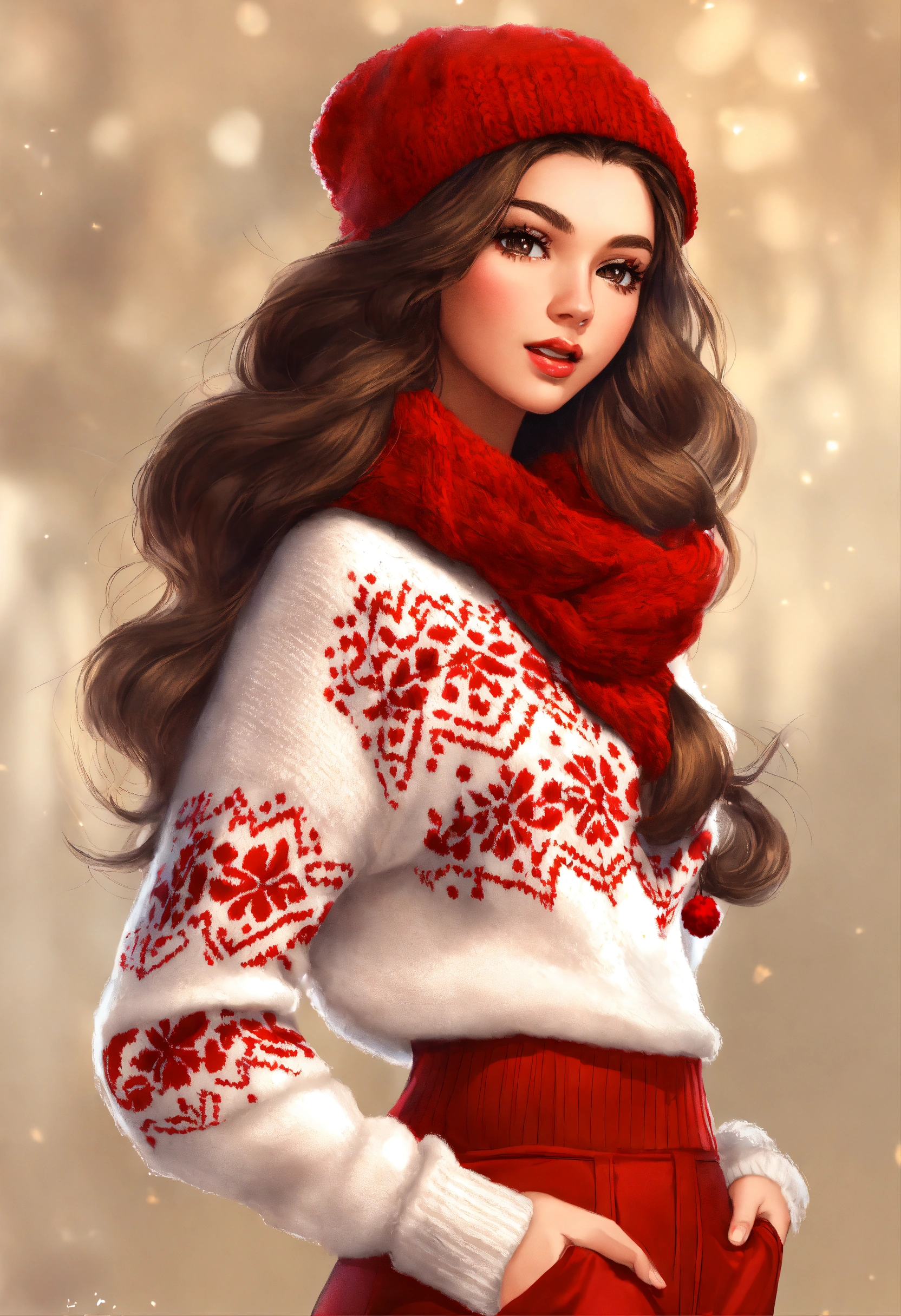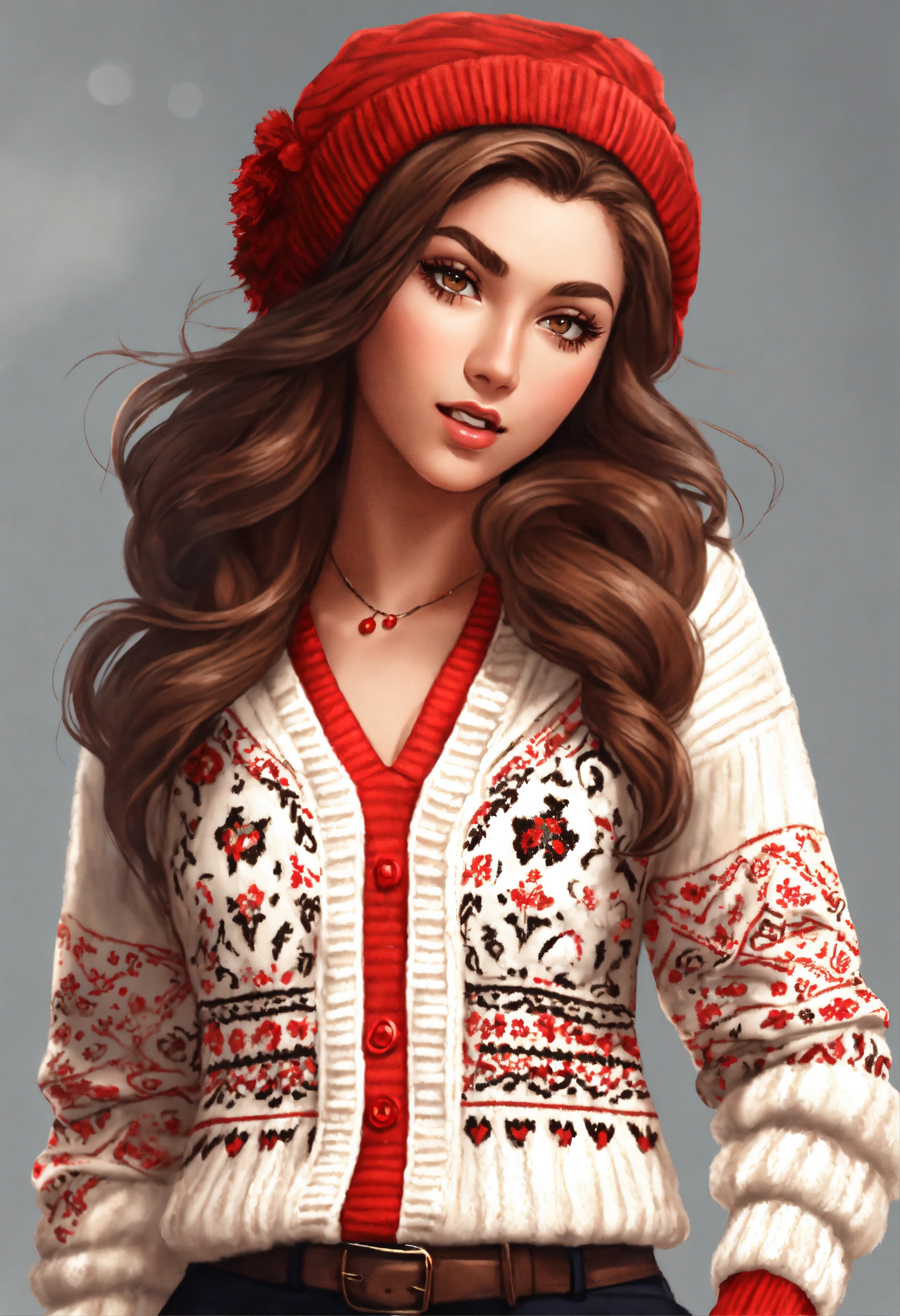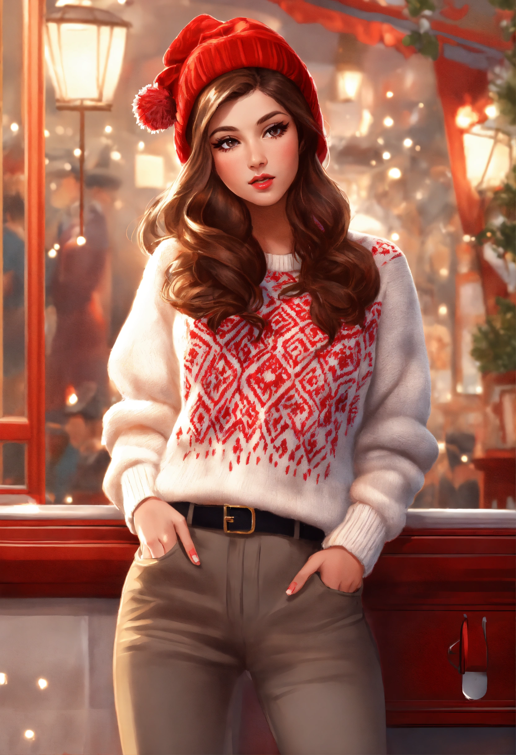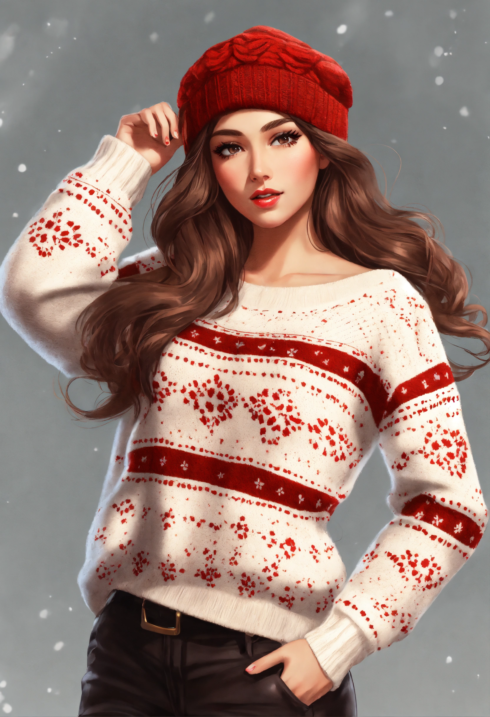 Full body, beautiful pinup woman, long brown hair and large hazel eyes, white wool sweater with red patterns, black pants, red bonnet with pompom, animated but very realistic, realistic illustration, white background, disney, centered