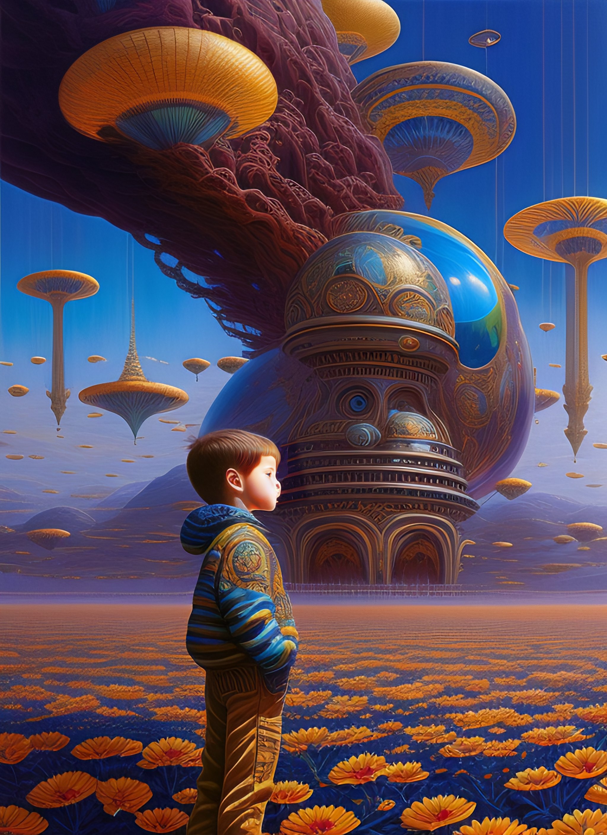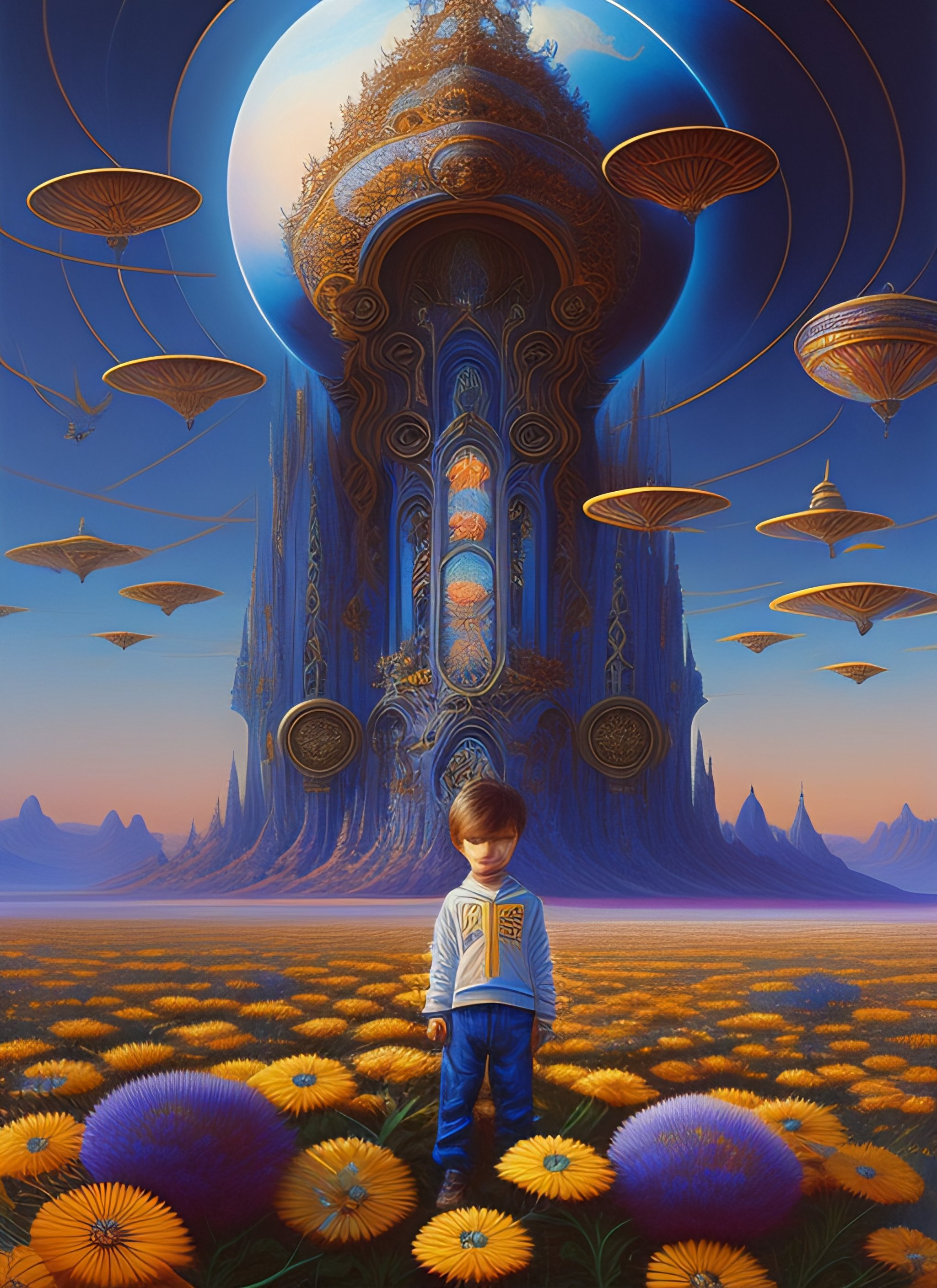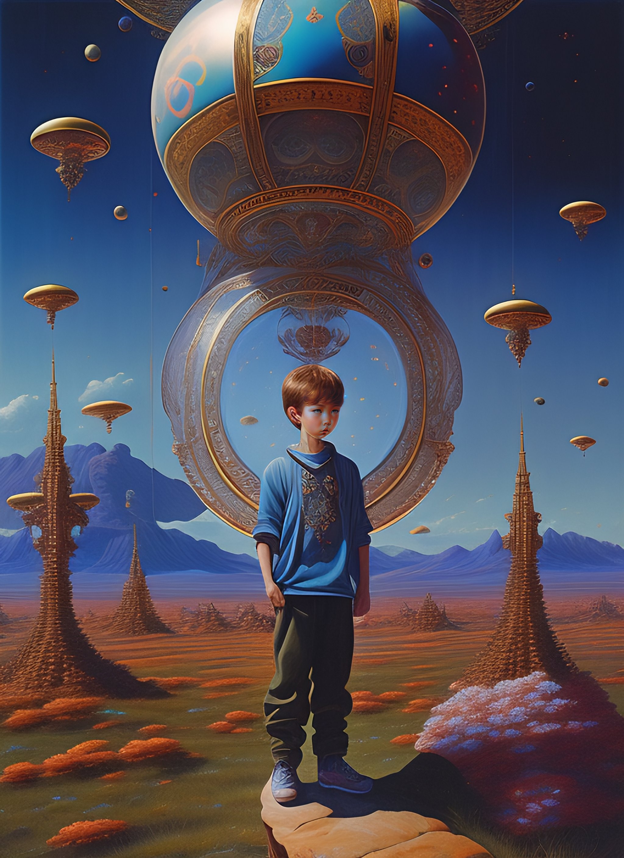 Realistic extremely detailed image of boy ##floating in the air## surrounded by extraterrestrial aliens reaching up to him by ayami kojima, amano, karol bak, greg hildebrandt, and mark brooks, neo-gothic, intricate, rich deep colors. by goro fujita and simon stalenhag, beksinski, 8k masterpiece