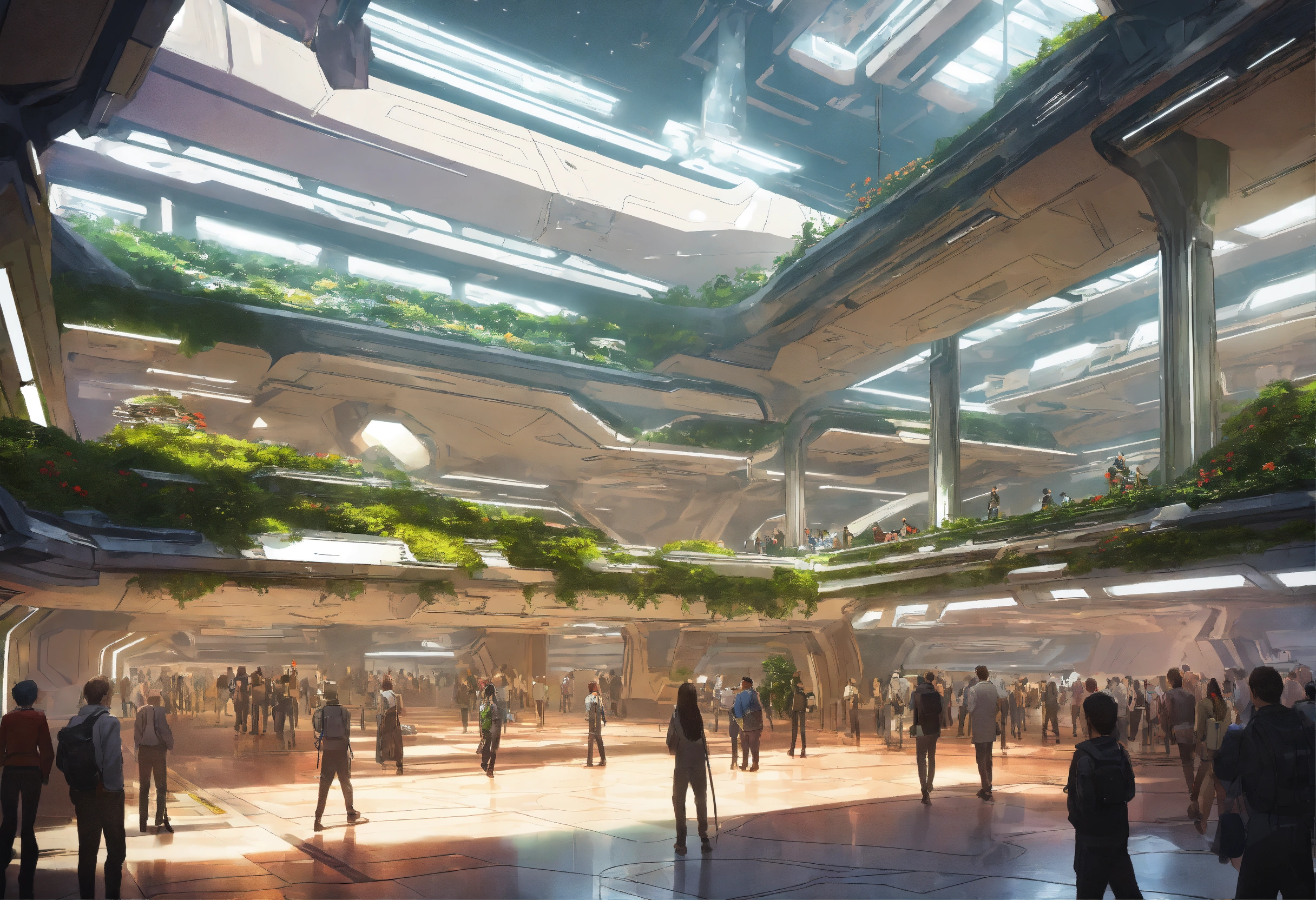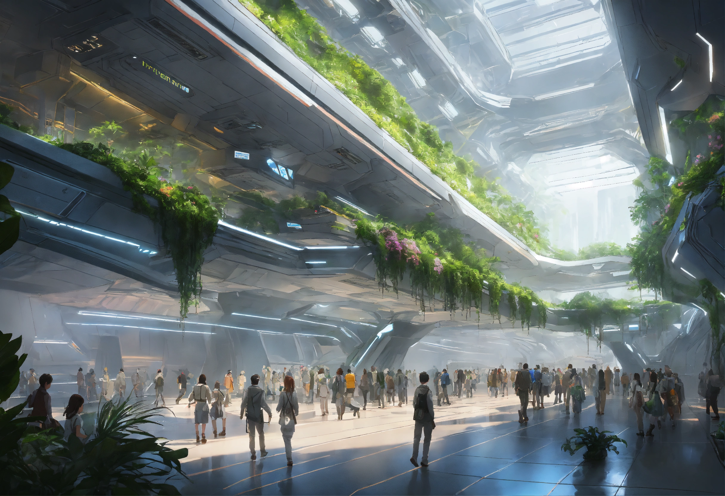 A crowded huge hall in the interior of a futuristic space station, with many people walking around, white metal walls, with some decorative vegetation, with a little calm waterfall, no windows, hyperralistic, hyperdetailed