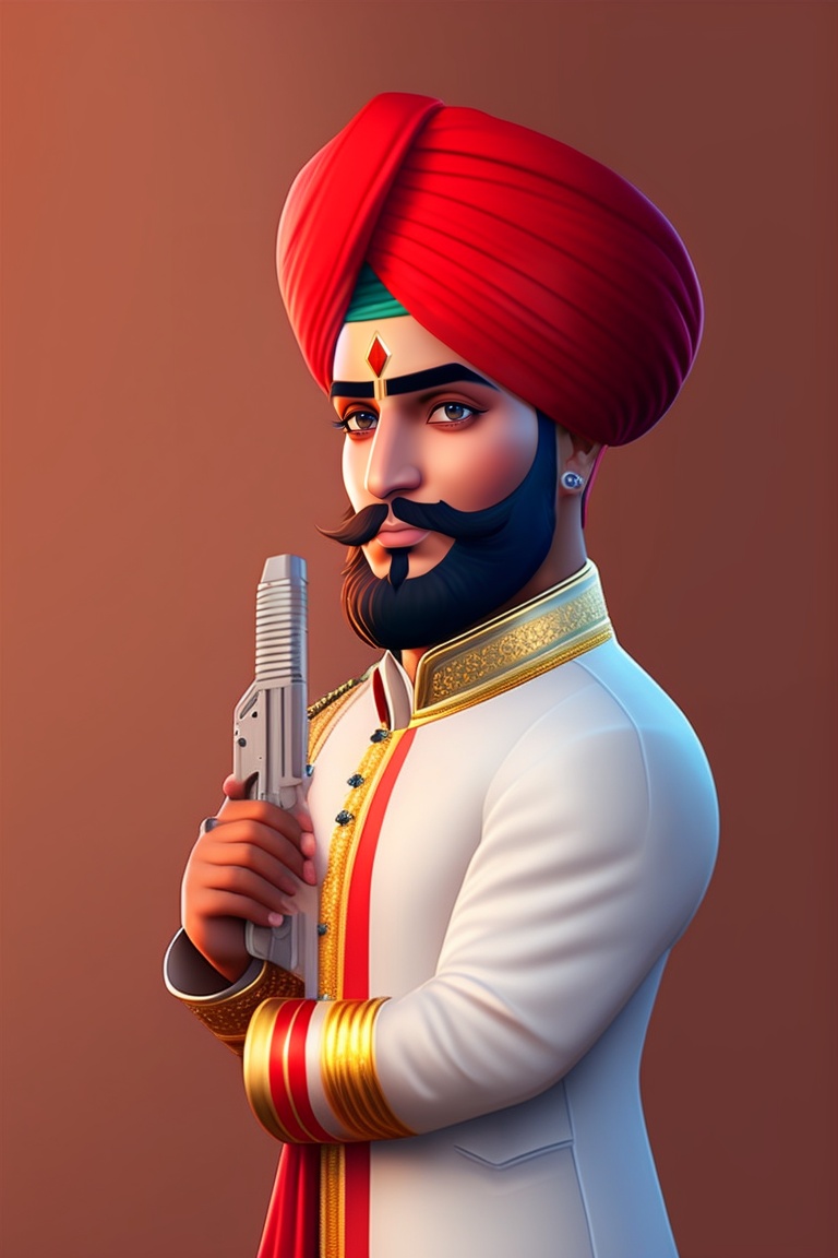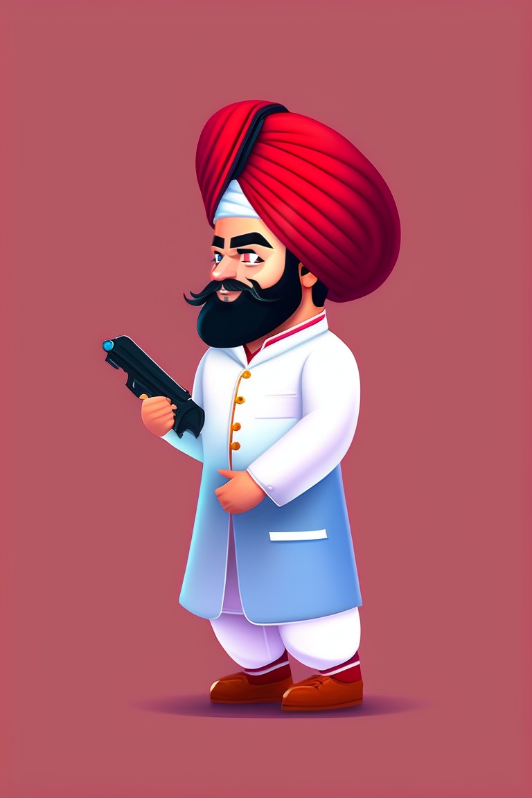 Design an ai avatar of a punjabi boy age 35 wearing red turban and white kurta pajama, holding pistol in right hand