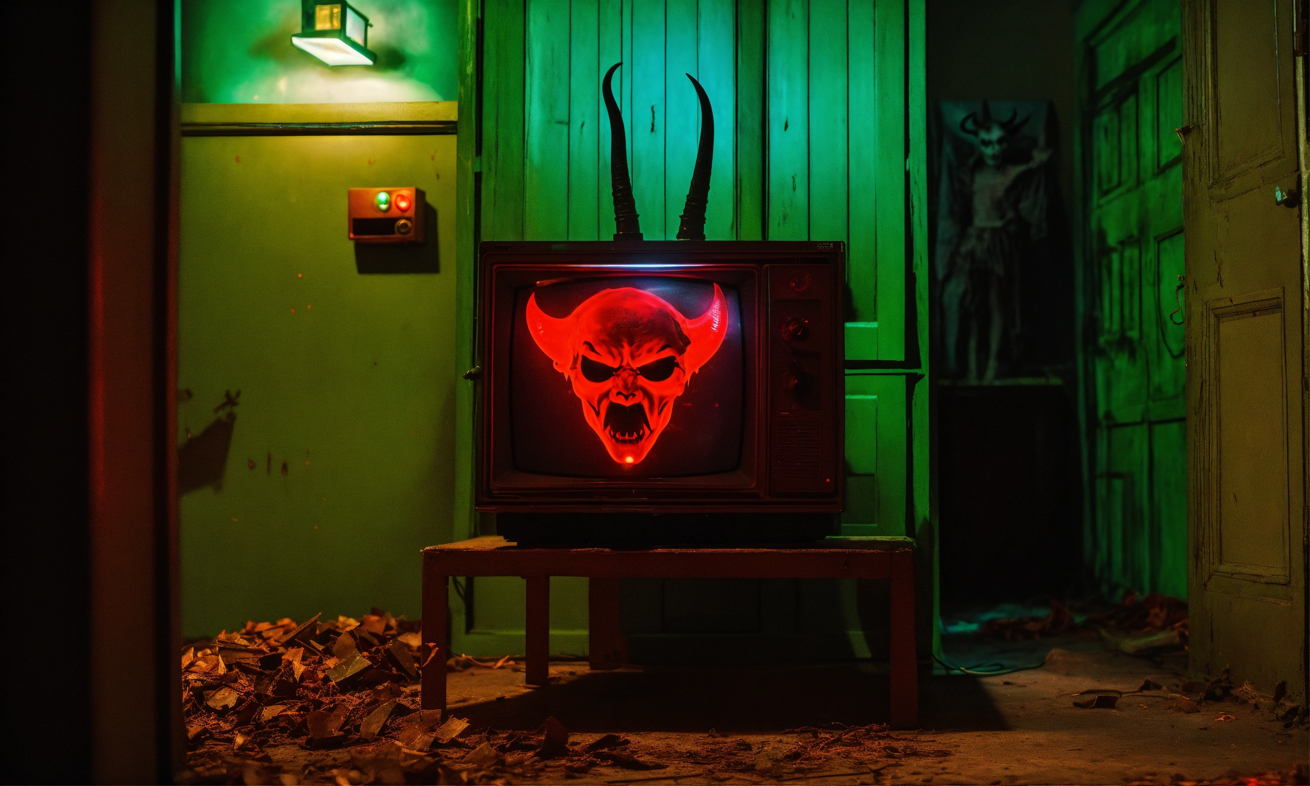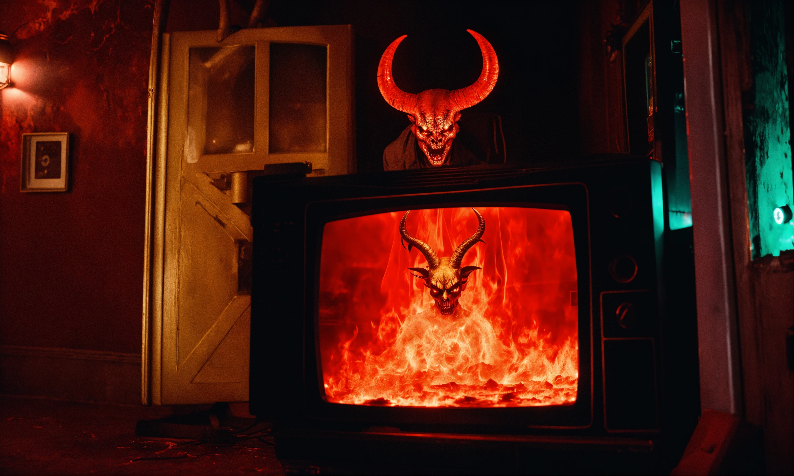 In a spooky room in hell, an old tv set flickers in the corner. inside the tv, a figure emerges. it is a demon, with glowing red eyes and horns.