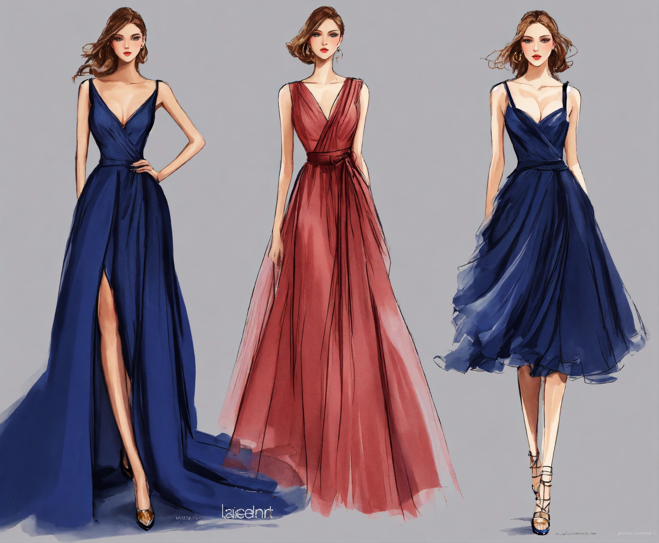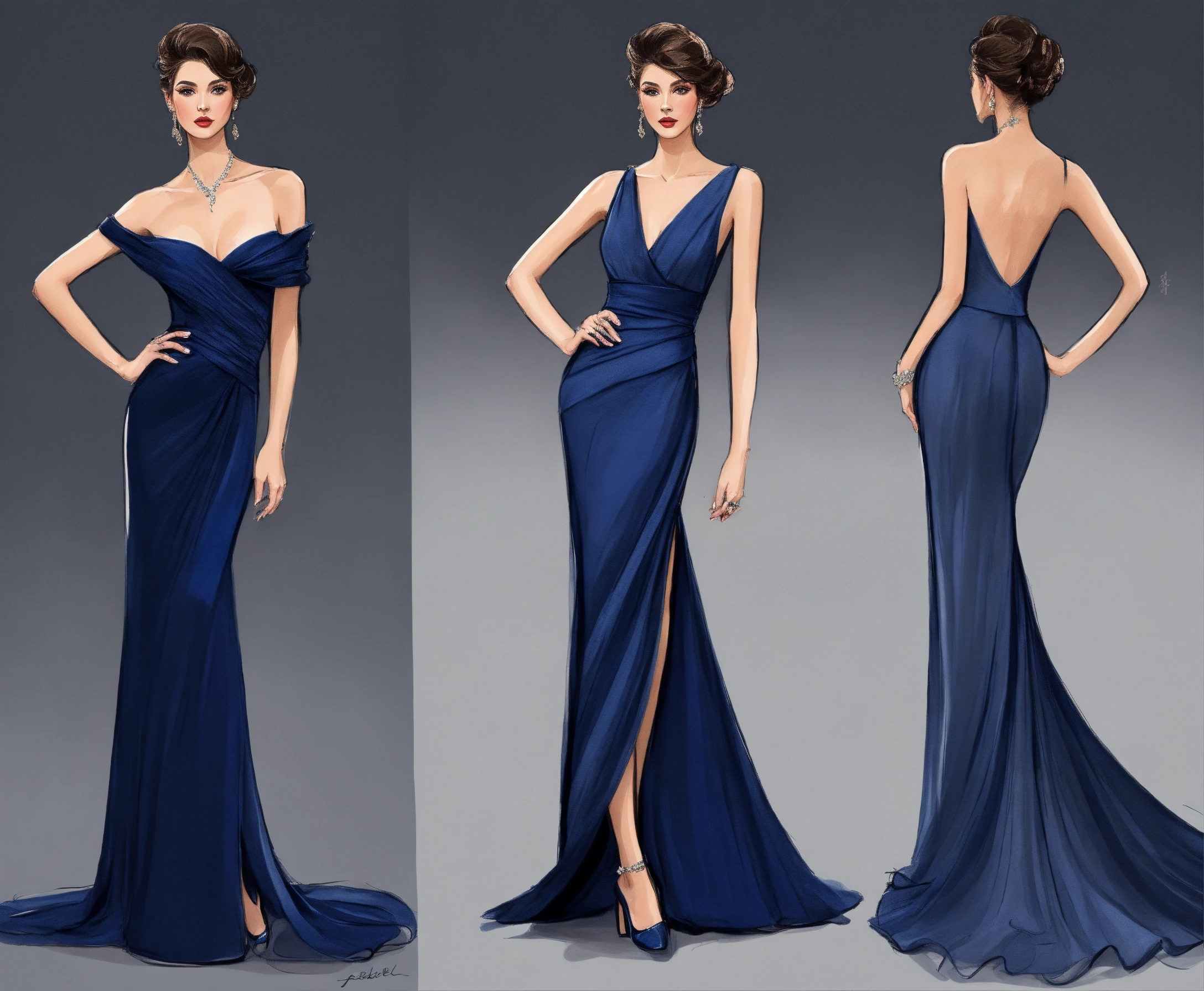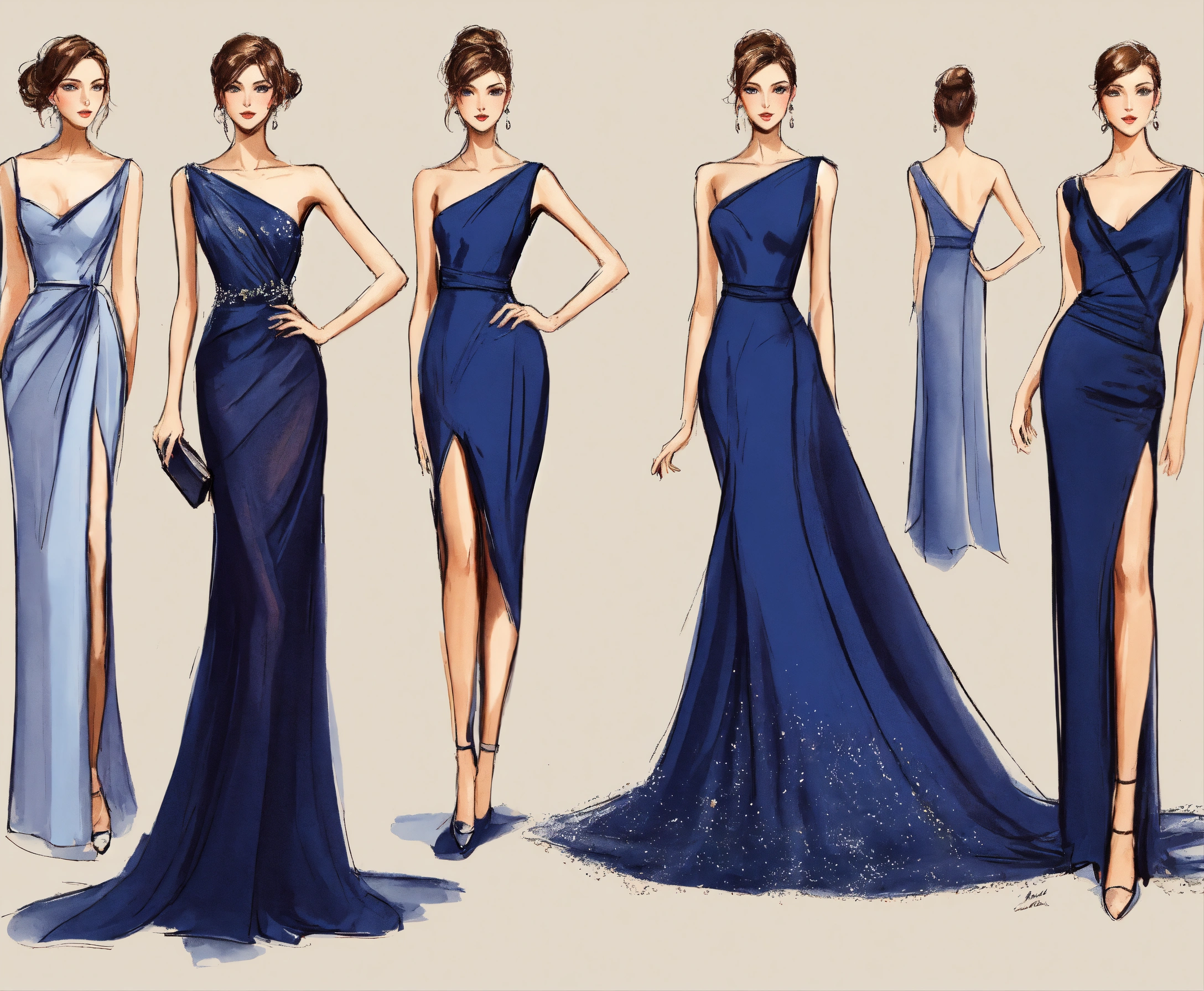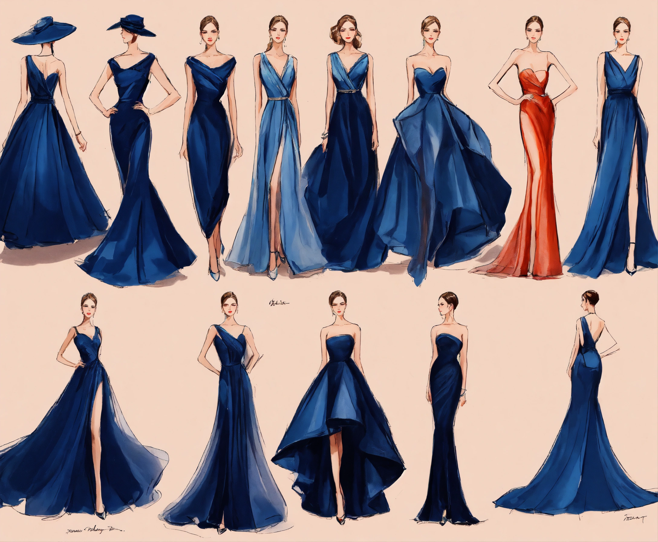 Fashion illustrations, 12 different designs, rough sketches, navy blue color dresses, illustrations, figure drawing, evening dresses, fancy lady, elegant, different poses, couture