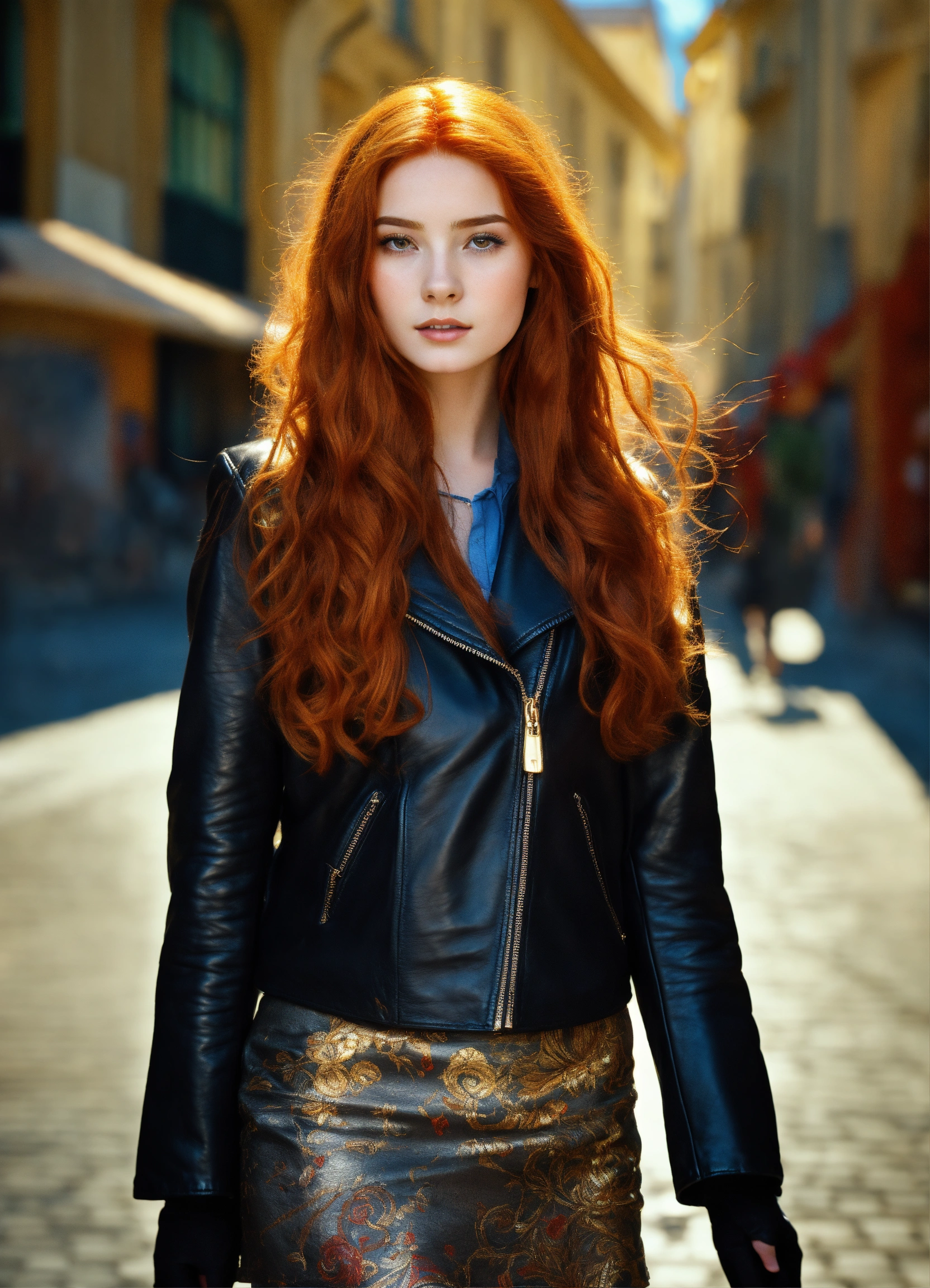 A beautiful 20 years old girl wearing a black leather jacket, mini skirt and gloves walking in a sunny european city outside golden summer light, by gustav klimt art, deco art nouveau style, stunning intricate details, high definition, 8k render fullbody, very long red hair looks like a real life version of amy pond