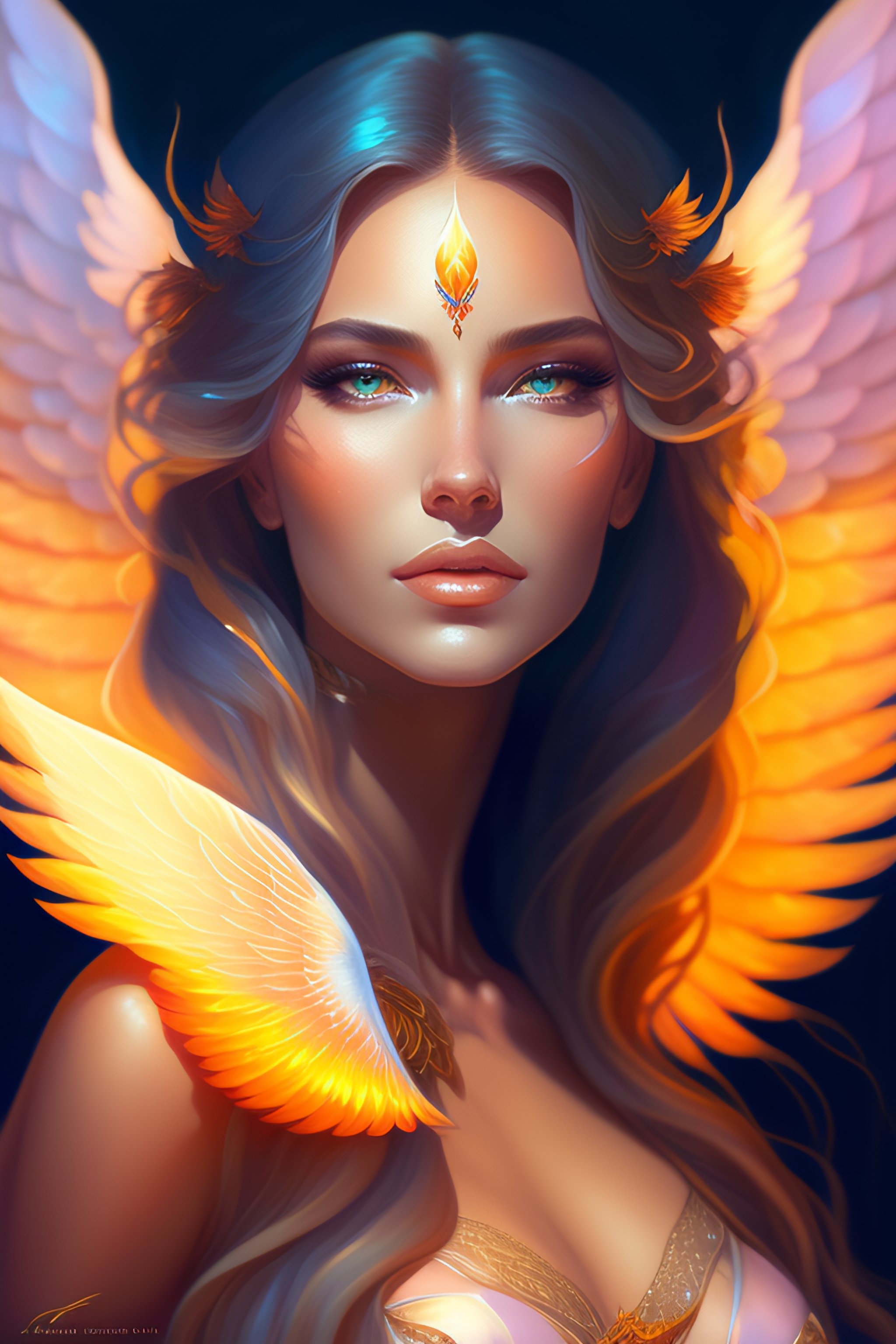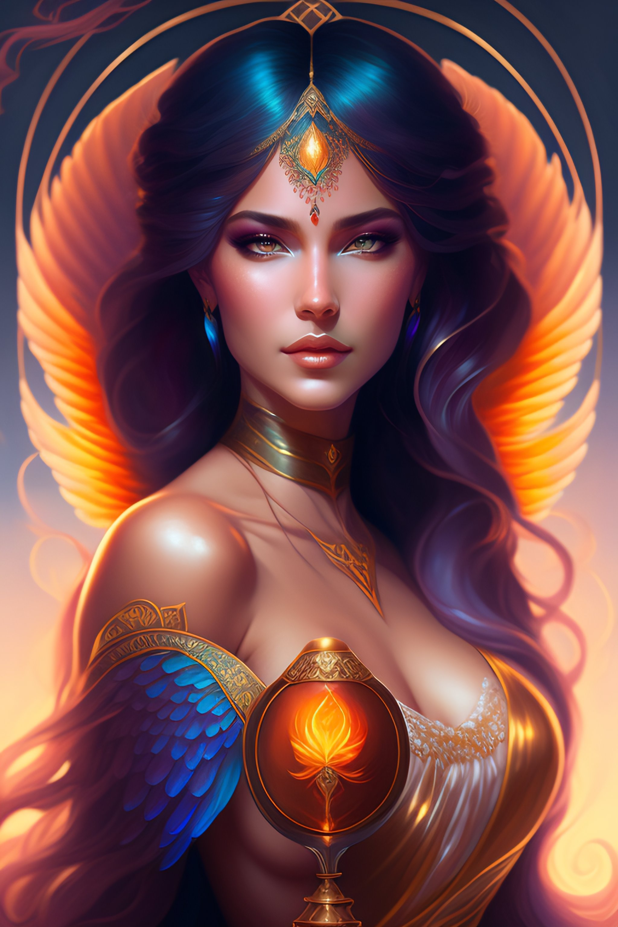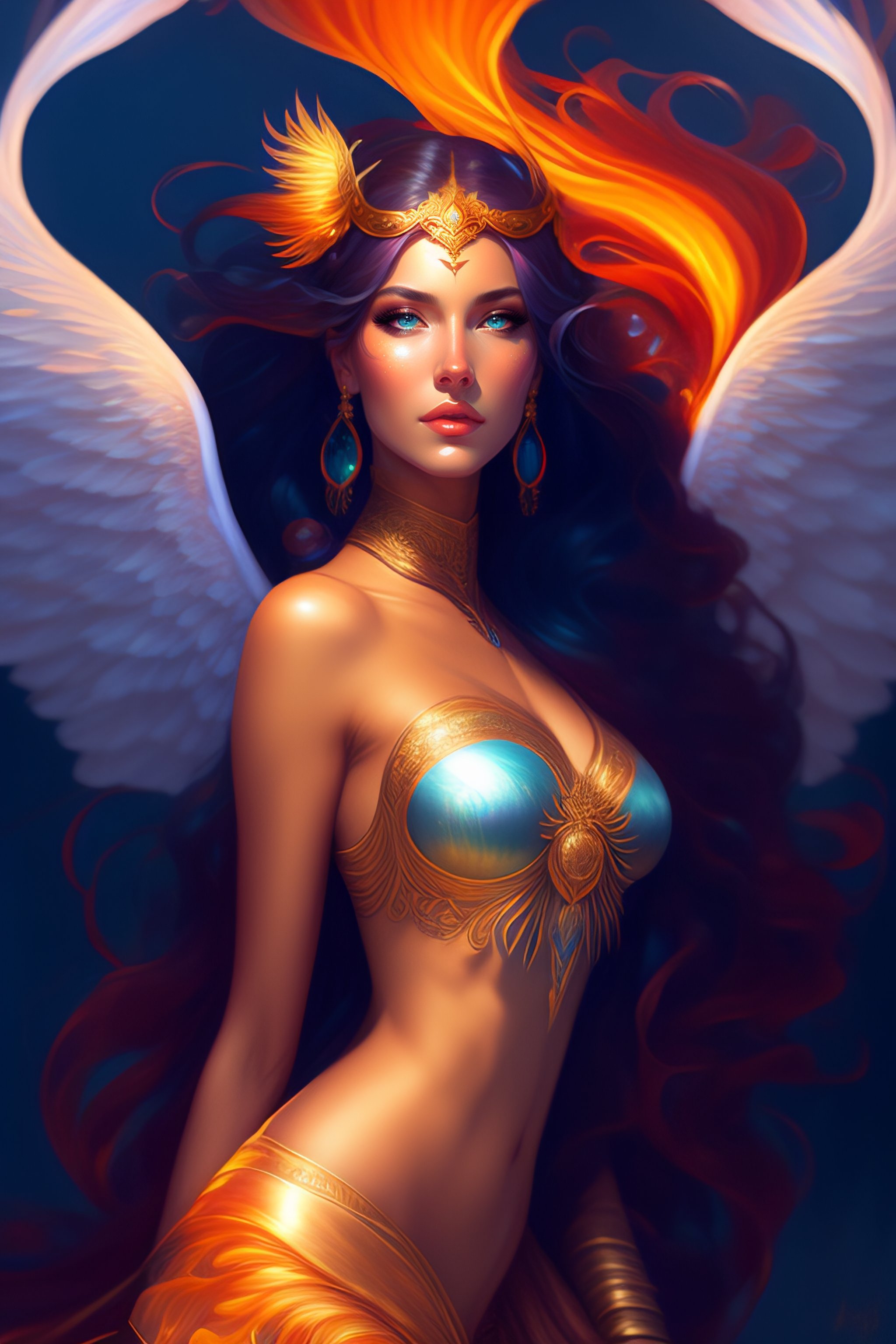 Aquarius lady, flaming wings!!!, fantasy, bioluminiscence, flowing hair, portrait, highly detailed, digital painting, beautiful eyes!, symmetry, concept art, sharp focus, illustration, art by artgerm! greg rutkowski magali villeneuve wlop!!!! ilya kuvshinov!! : : alphonse mucha : : 0. 2