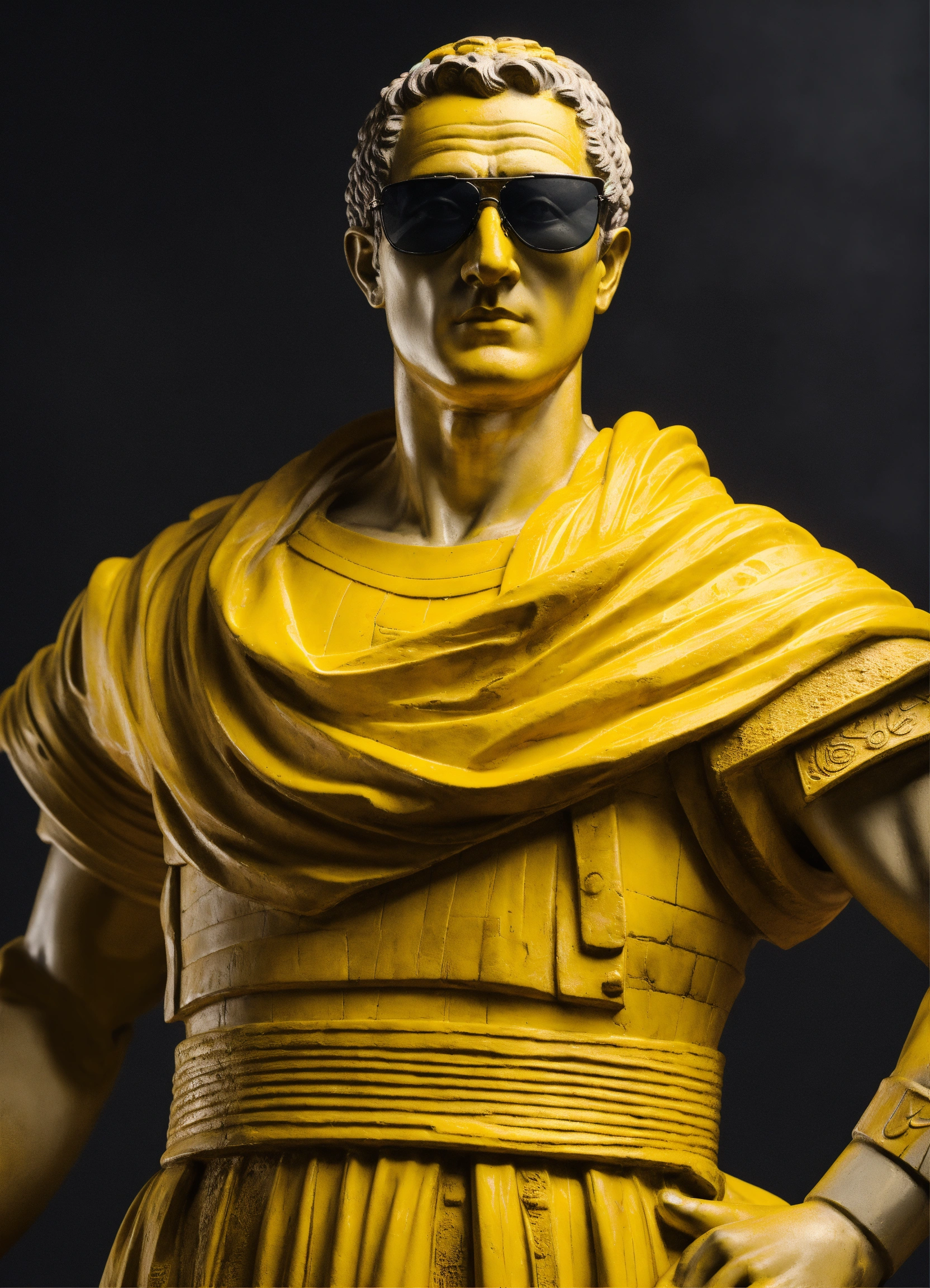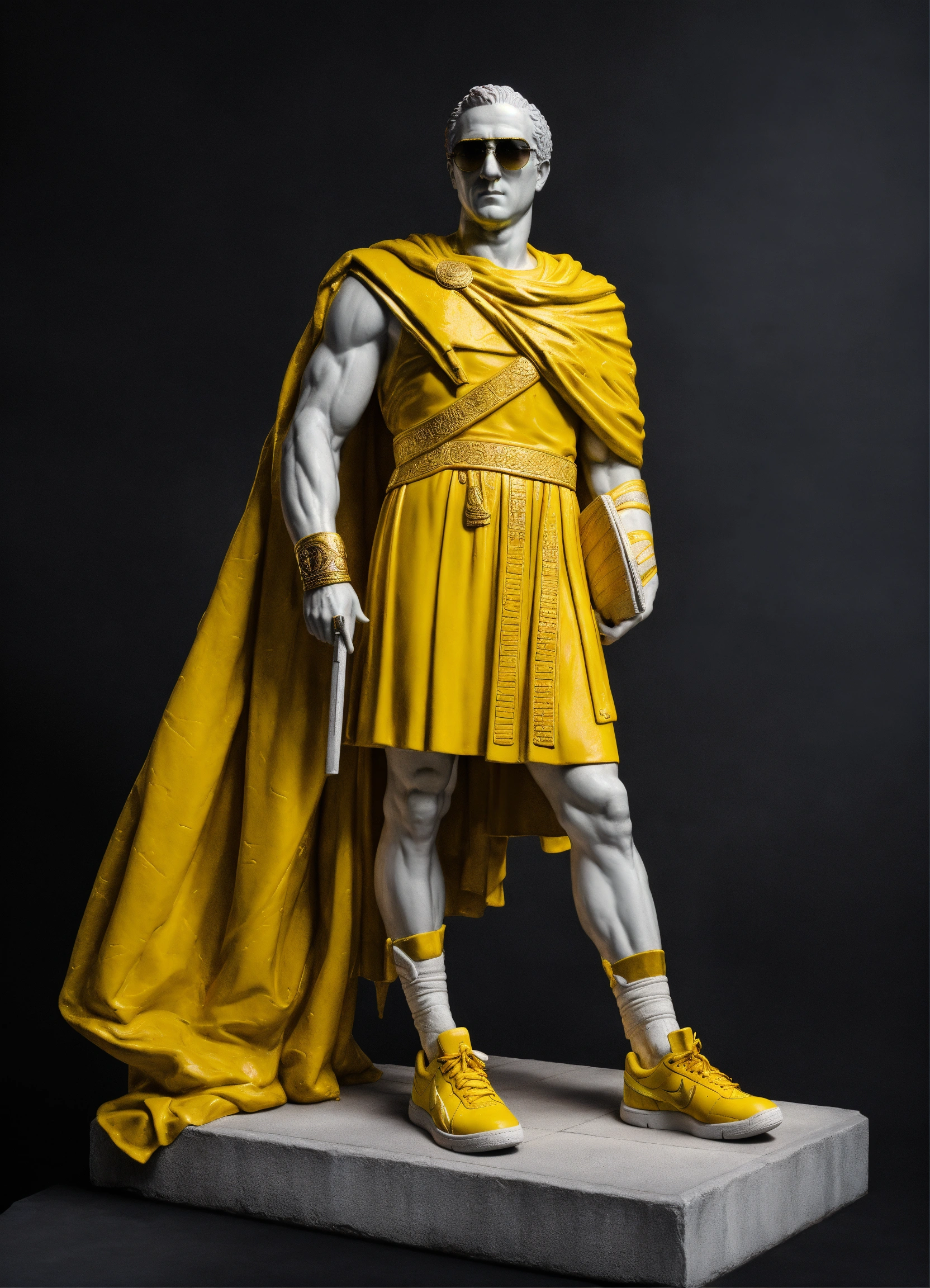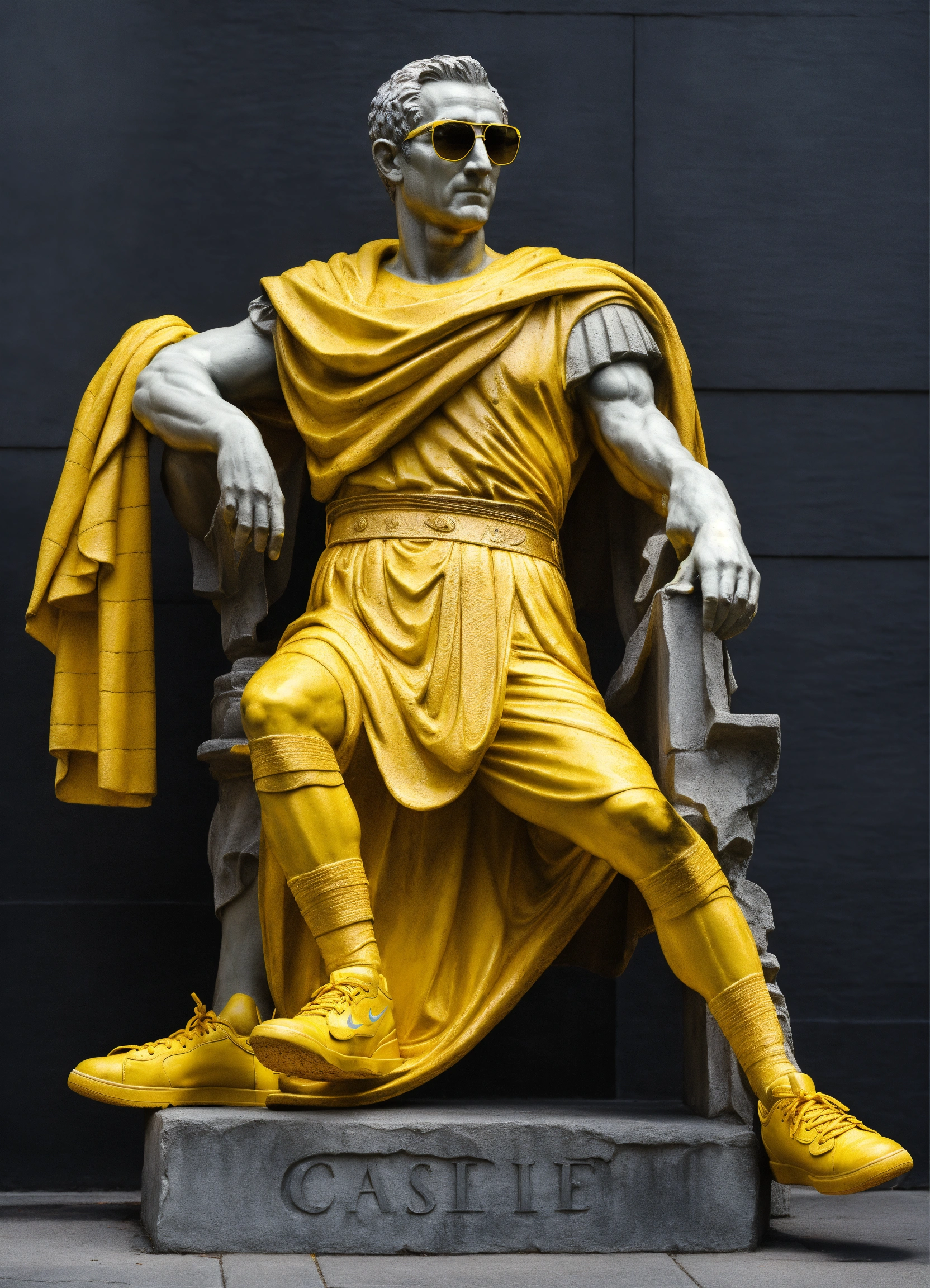 Statue of julius caesar in glorious pose with yellow clothing, nike shoes, and matte texture, with modern sunglasses and dark gray background