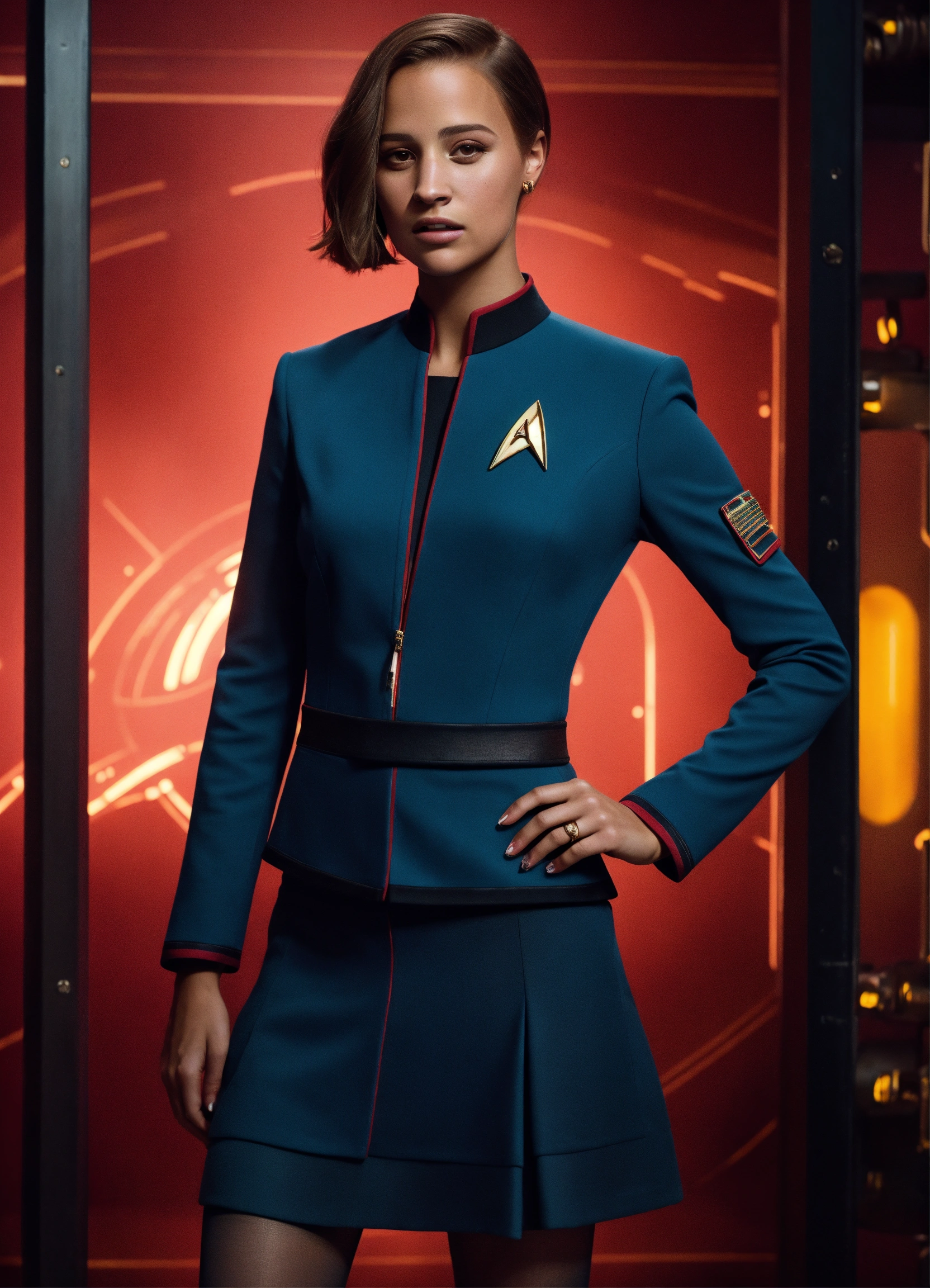 Studio portrait of short hair alicia vikander as a star trek captain in skirt suit uniform, tights and high heels, full body, 100% real, natural light, studio background, fashion magazine, hyper realistic, ultra-detailed, no filter, depth of field, fashion, iso 400, photorealistic, 8k