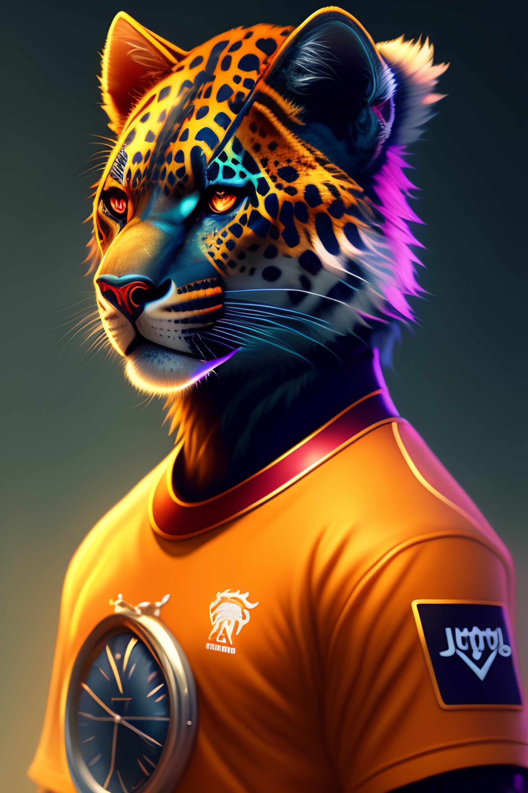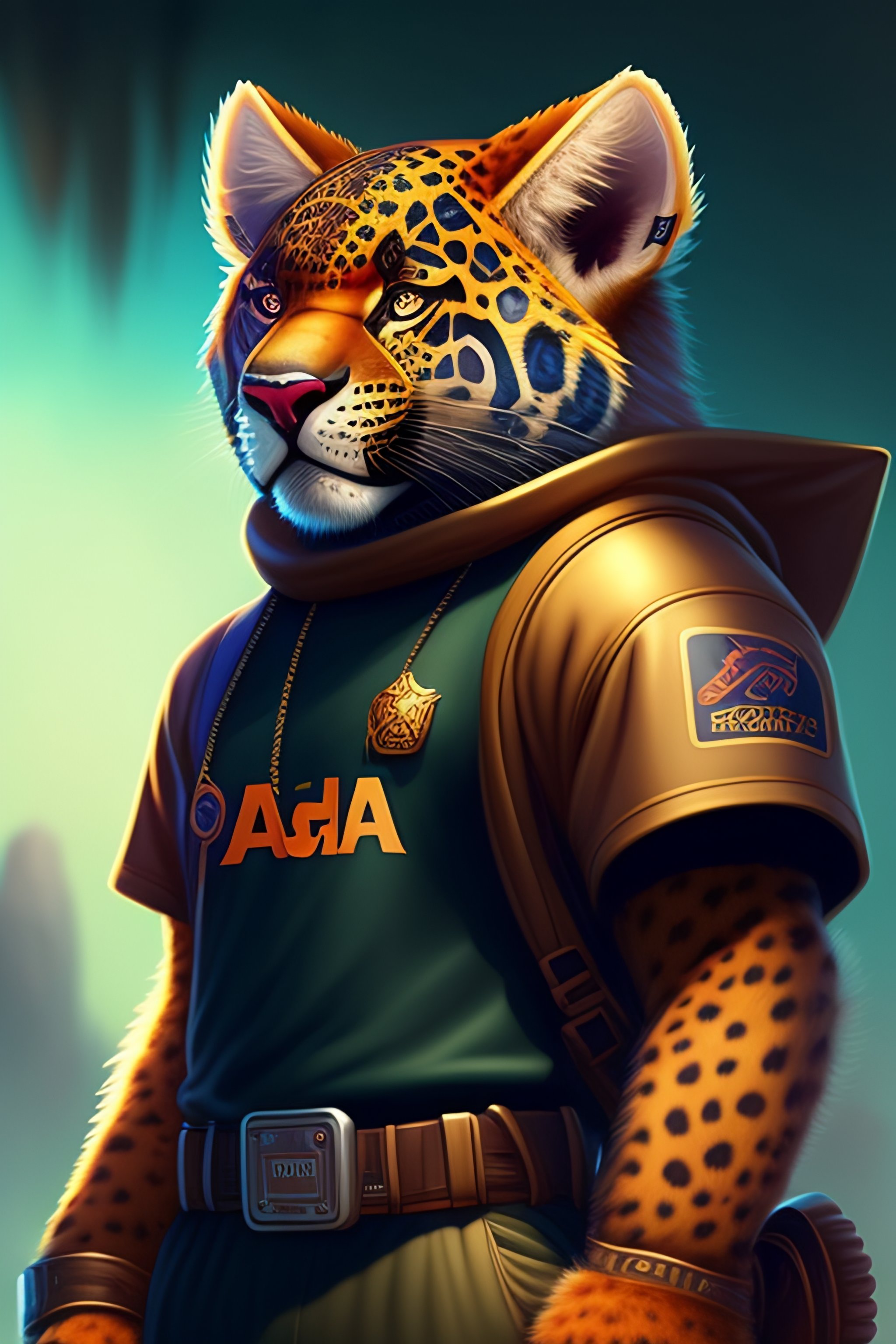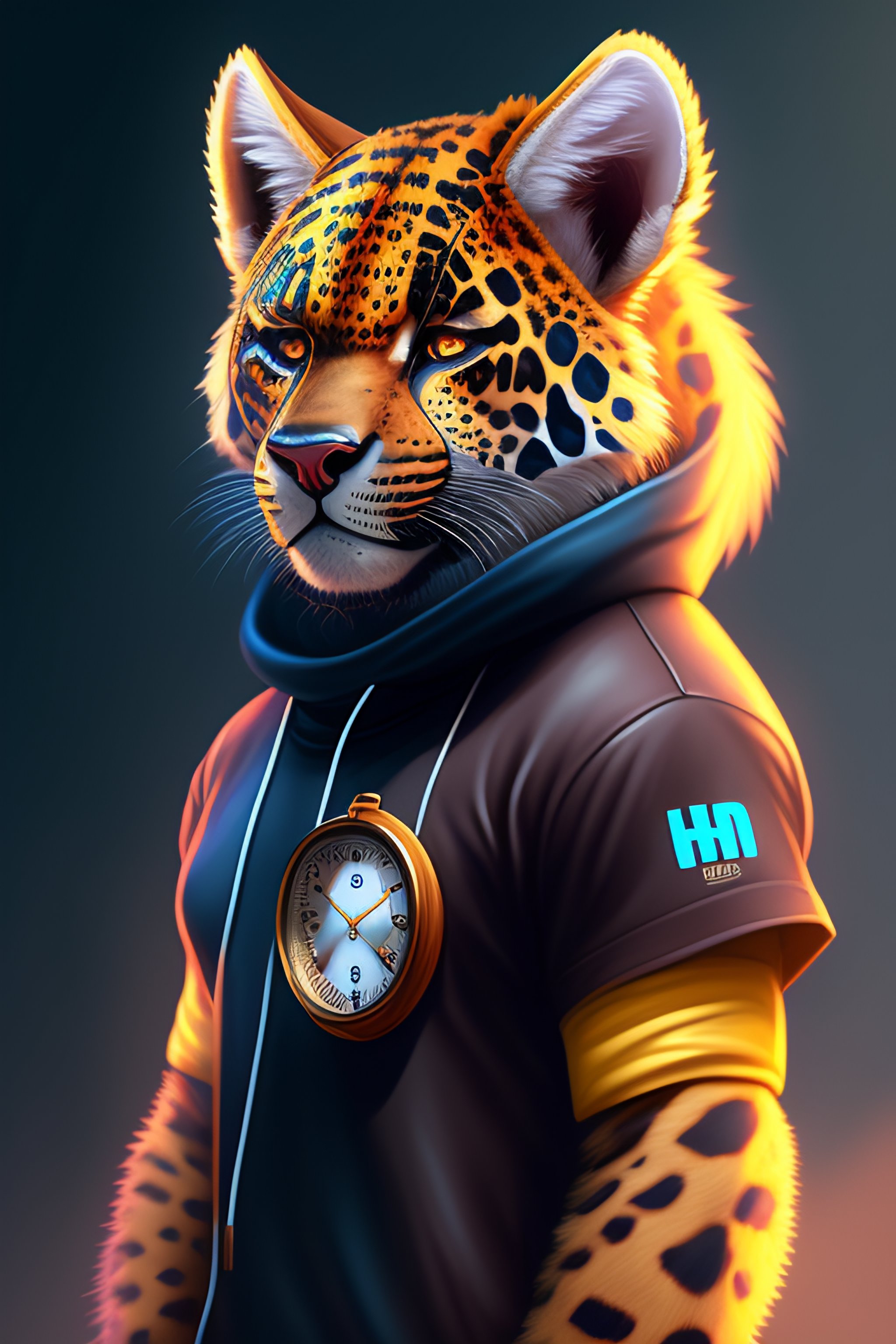 Anthro furry humanoid jaguar, baggy t-shirt, checking watch, character concept design, painting, detailed, vivid, trending on artstation
