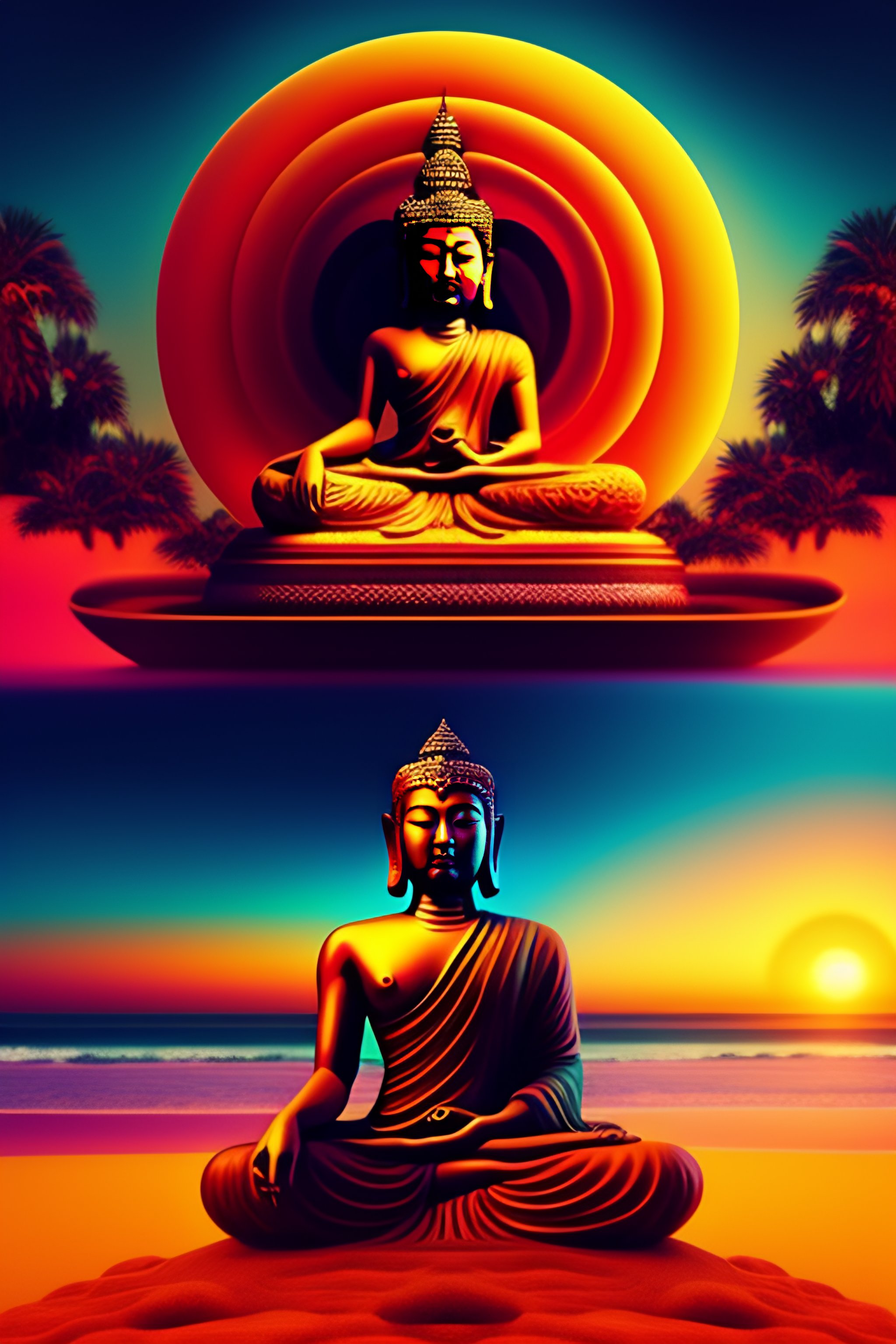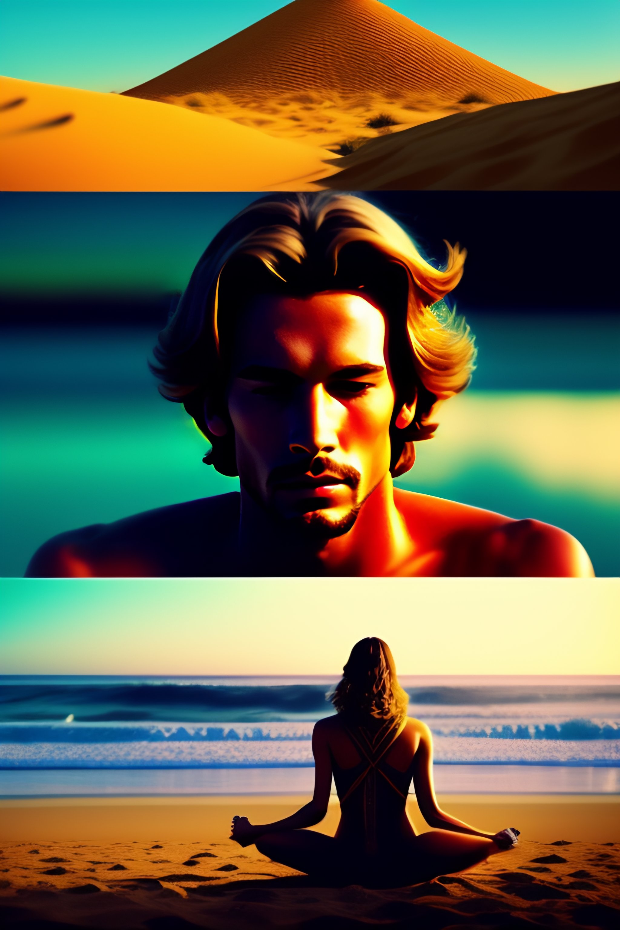 Californian hippie tripping on lsd meditating on the beach in a buddha pose, psychedelic photorealistic movie cinematic