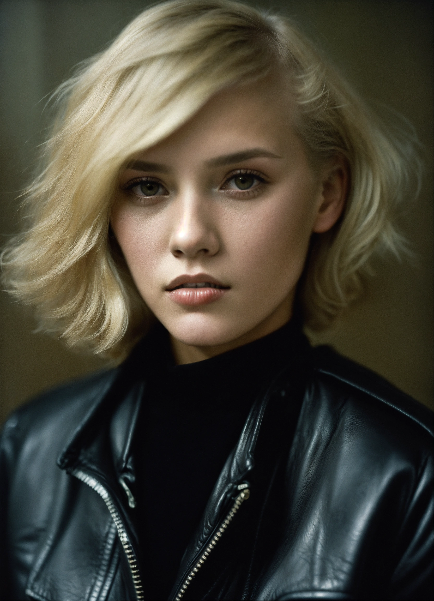 A mysterious photo of a blond girl in a leather jacket, very short undercut extremely detailed image, by diane arbus.