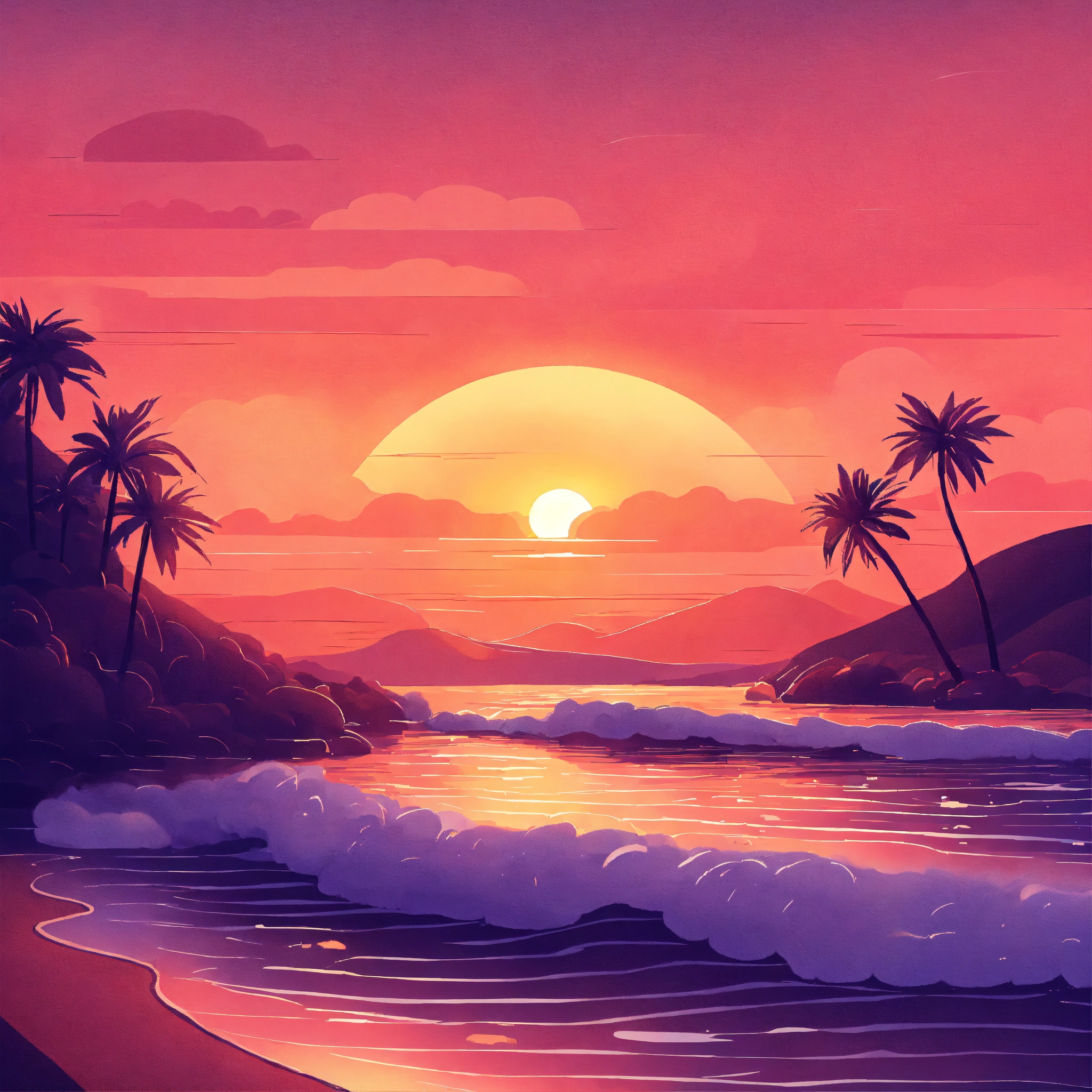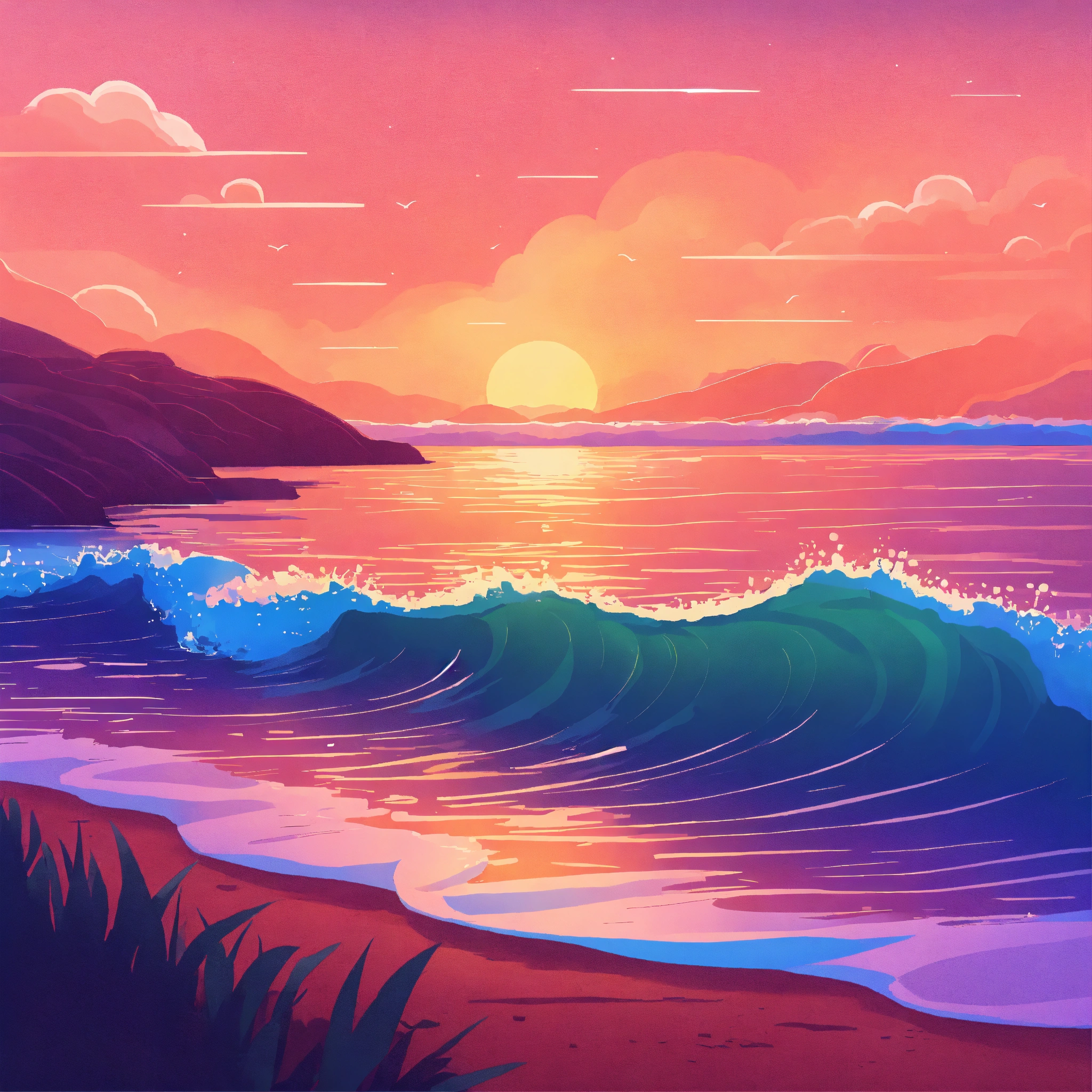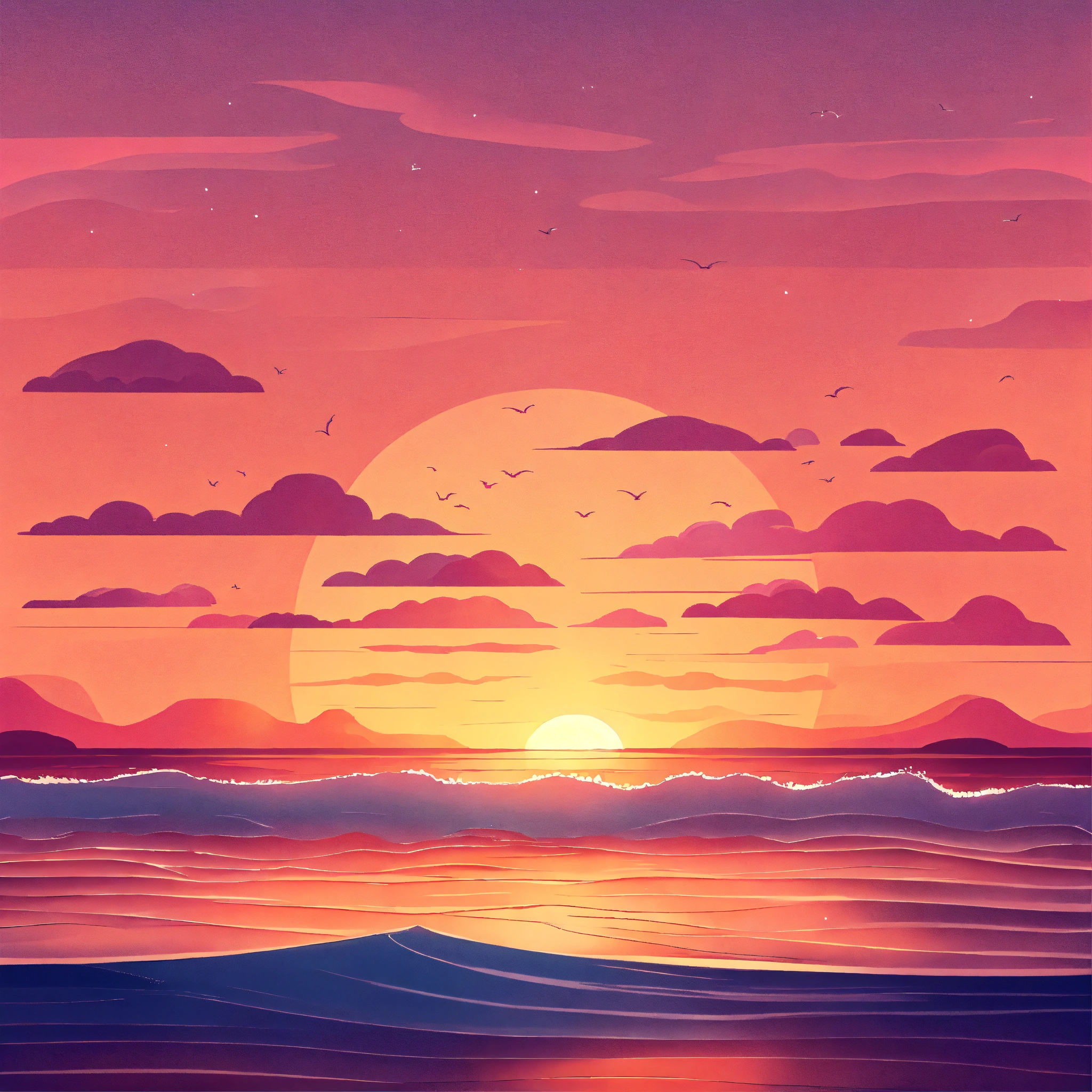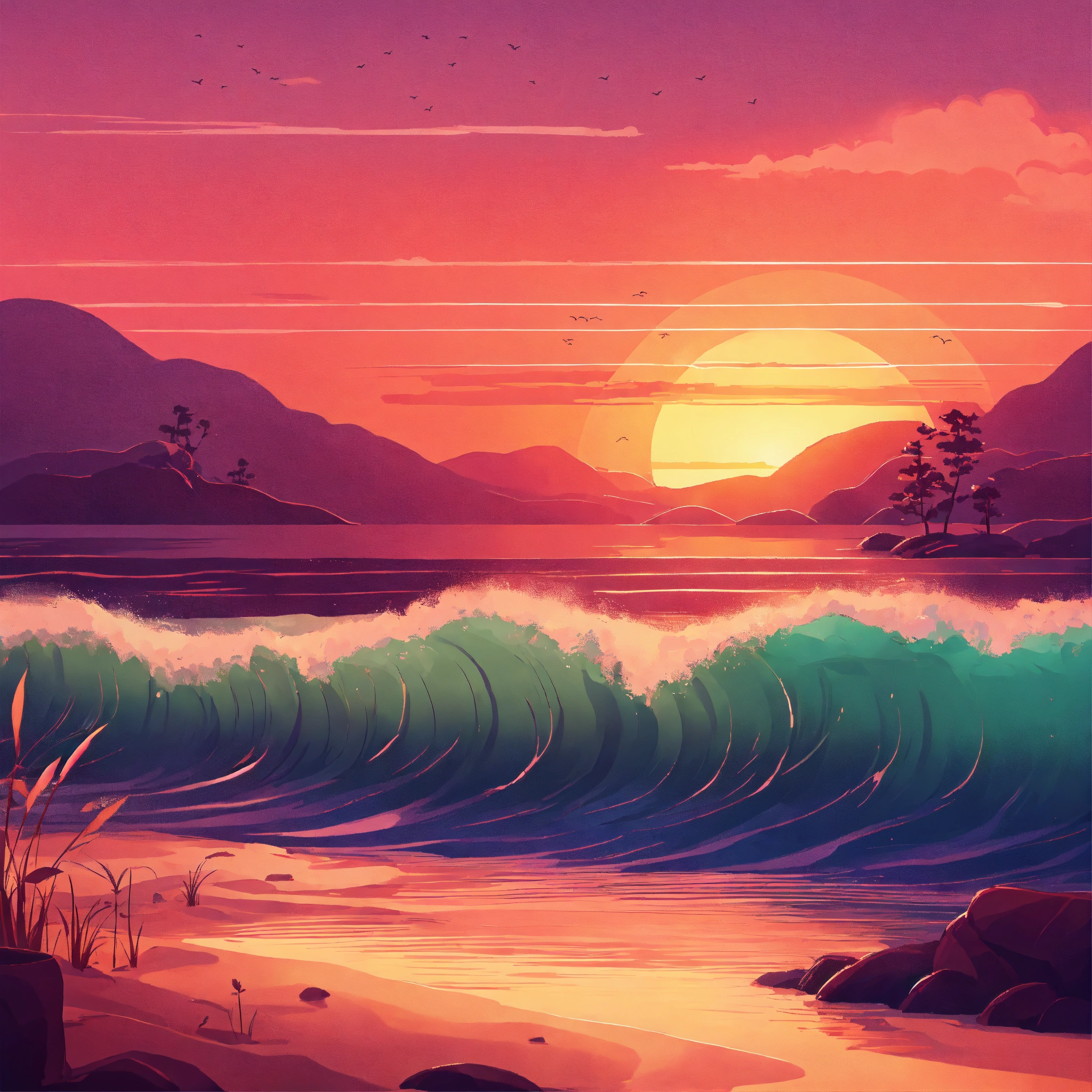 Sunset waves beautiful nature scene, cozy webpage background hero image for adorable platform modern minimalist illustration, lofi
