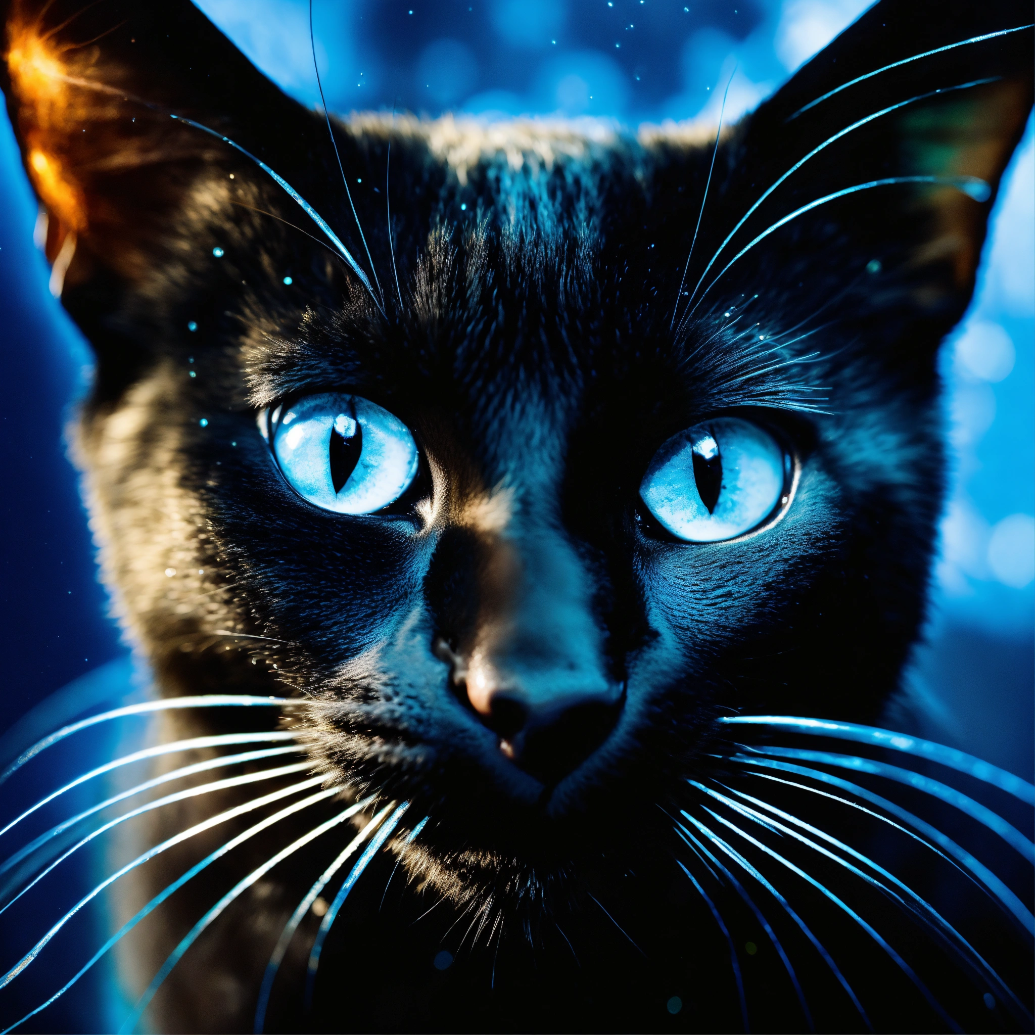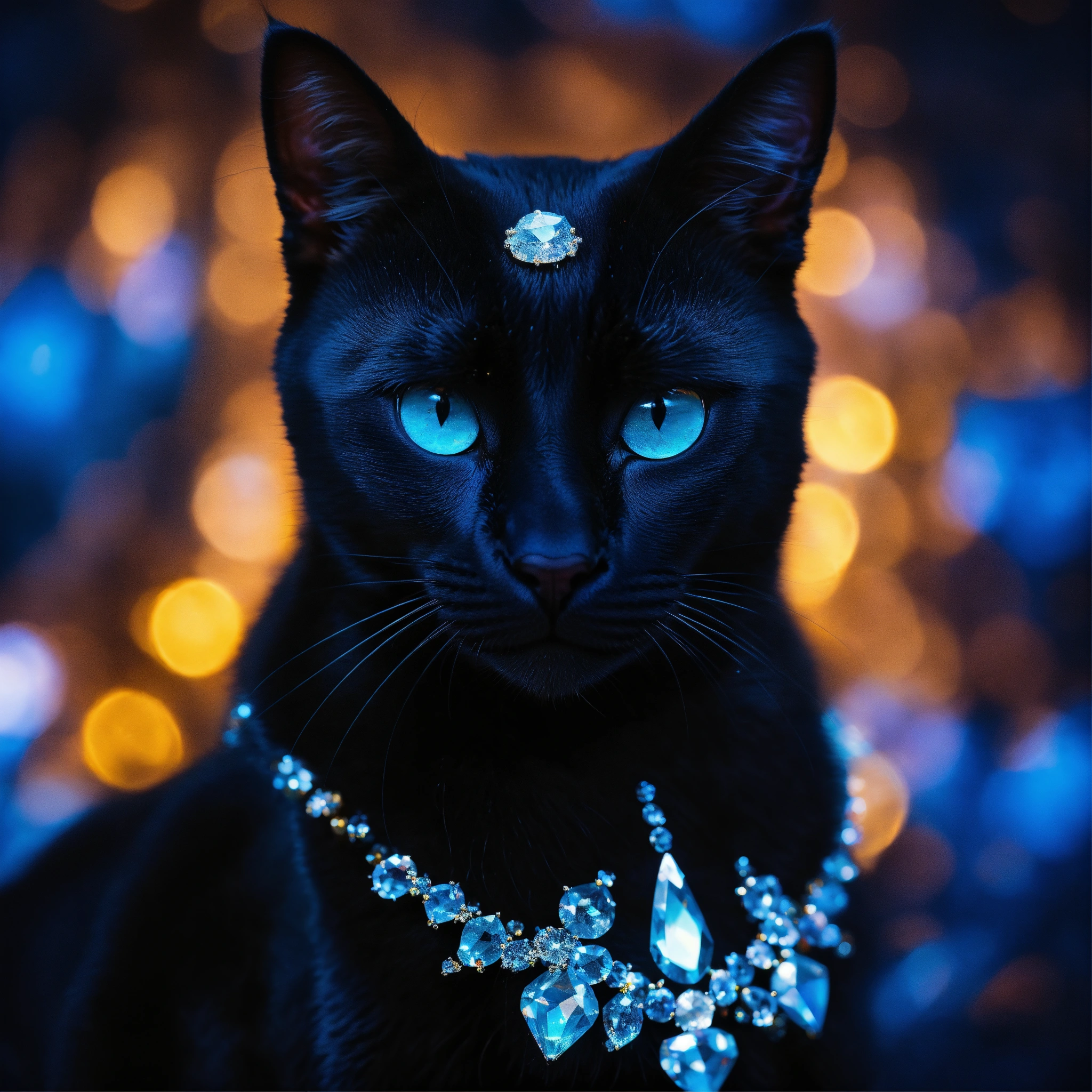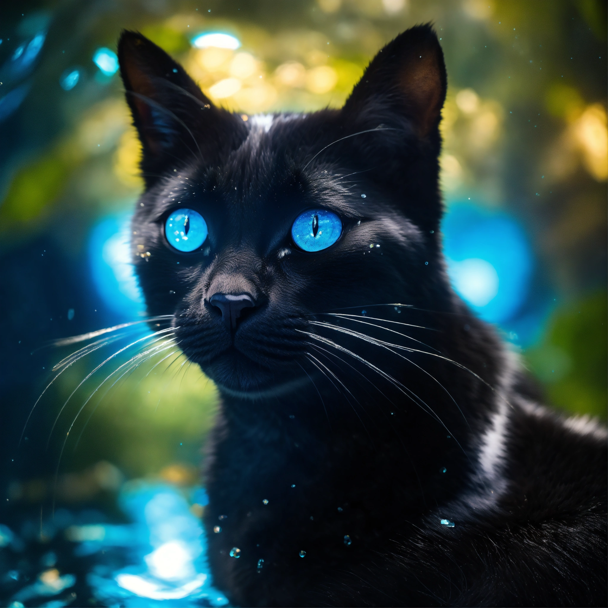 Underwater photography, long exposure, elegant black female cat face portrait with white crystal on the forehead, facing front, blue eyes. front view. front portrait, no angle. backlit. in the style of disney, pixar, tim burton, beauty and the beast, and peter pan. enchanting aura. fractal, volumetric lighting, and the power of the god. white background, no background, zero background, 0 background.