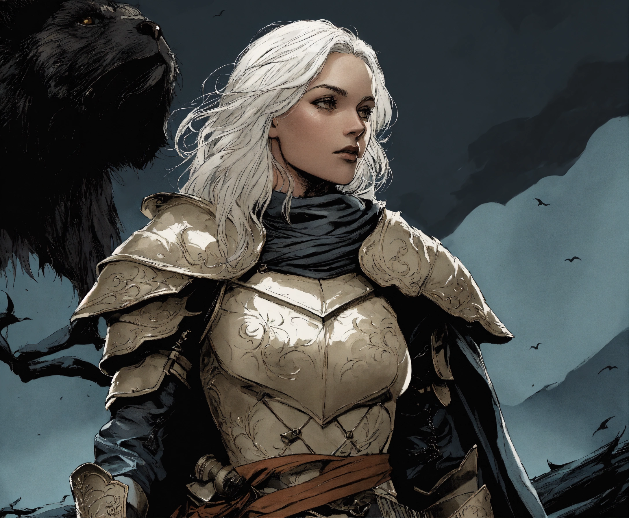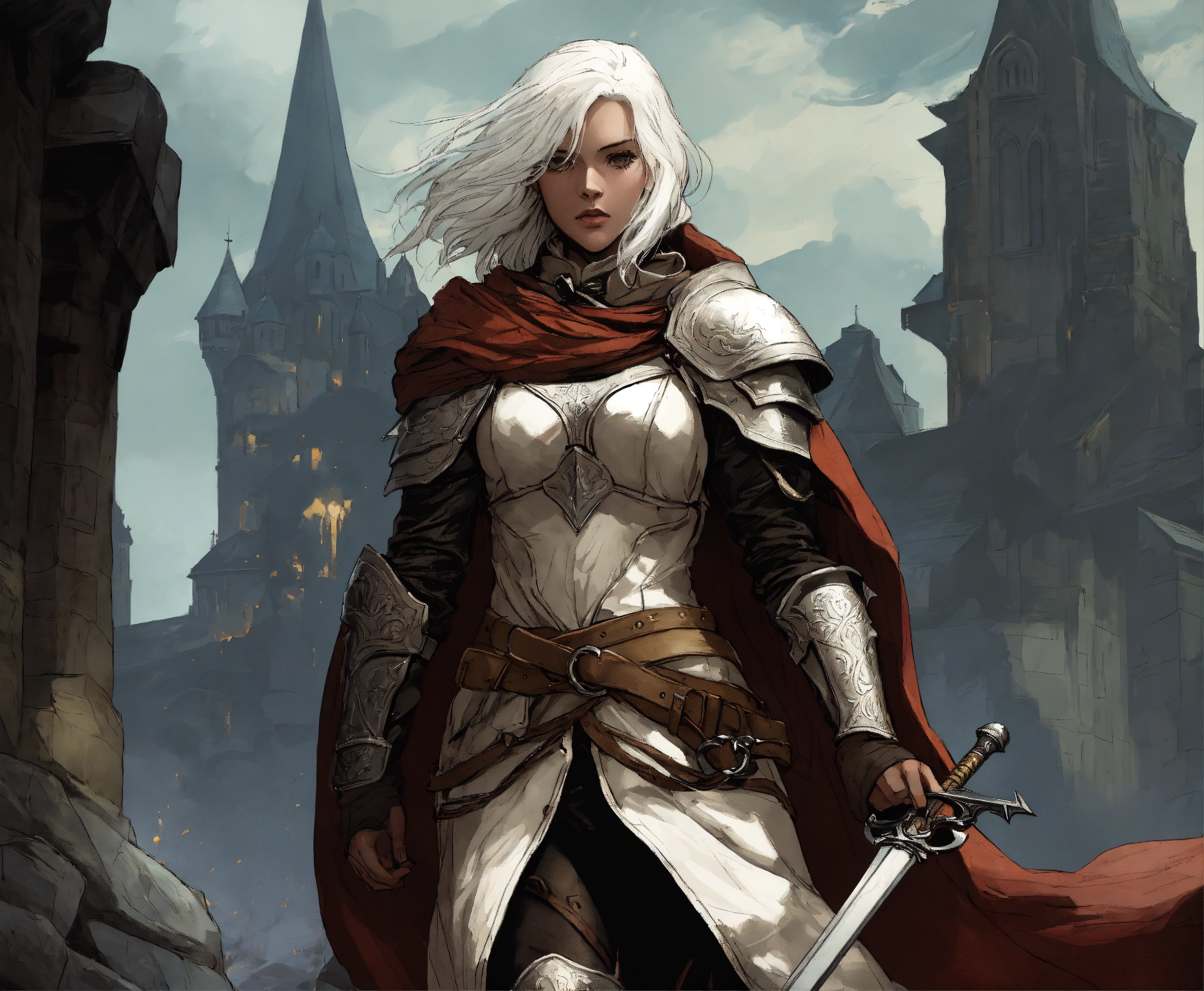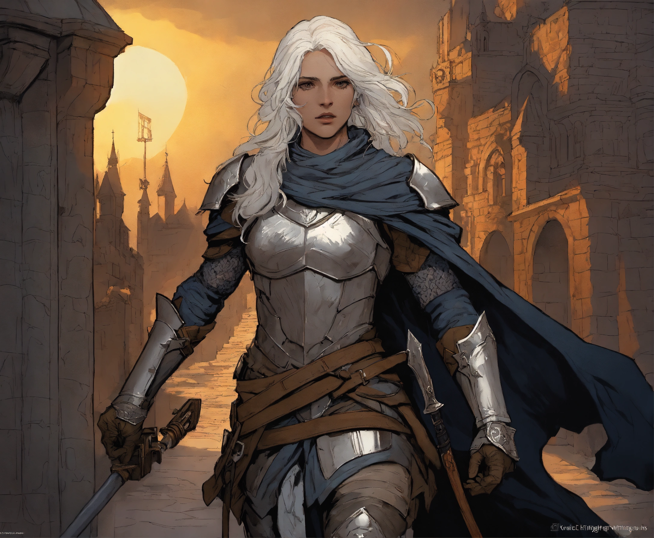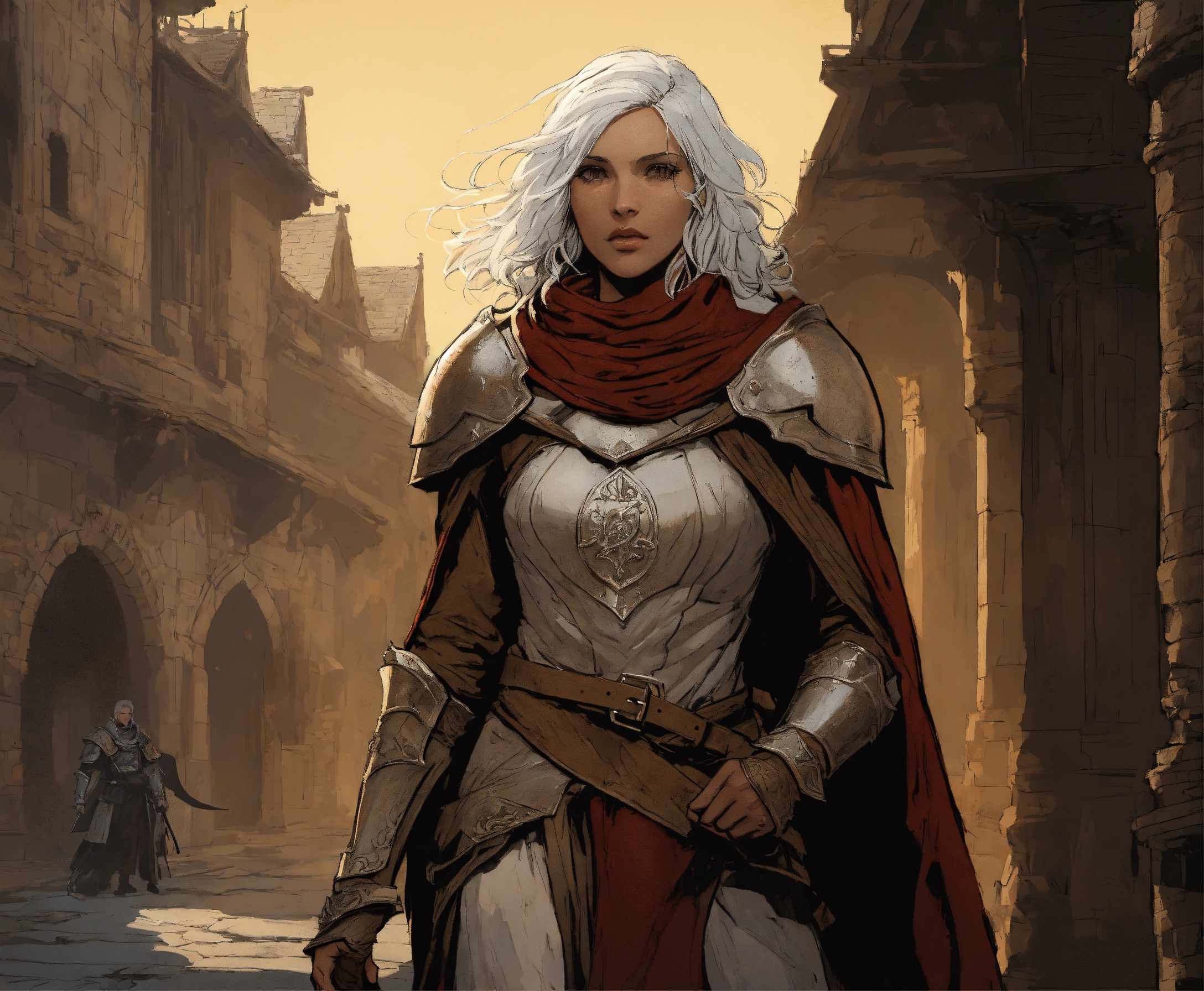 Illustration of a cool and badass white haired female paladin in white battle cowl with cloth and armor, kingsguard, sublime and strong in the style of in a training camp of medieval city bernie wrightson. olive skin, white hair full body. medieval city environment, gloomy and depressing atmosphere. dark hues color palette, composition balance, outlined silhouettes, shadows, highlights, intricate details, dark fantasy, narrative-rich illustration, visual compellingness in the style of bernie wrightson. inspired by magic the gathering and final fantasy