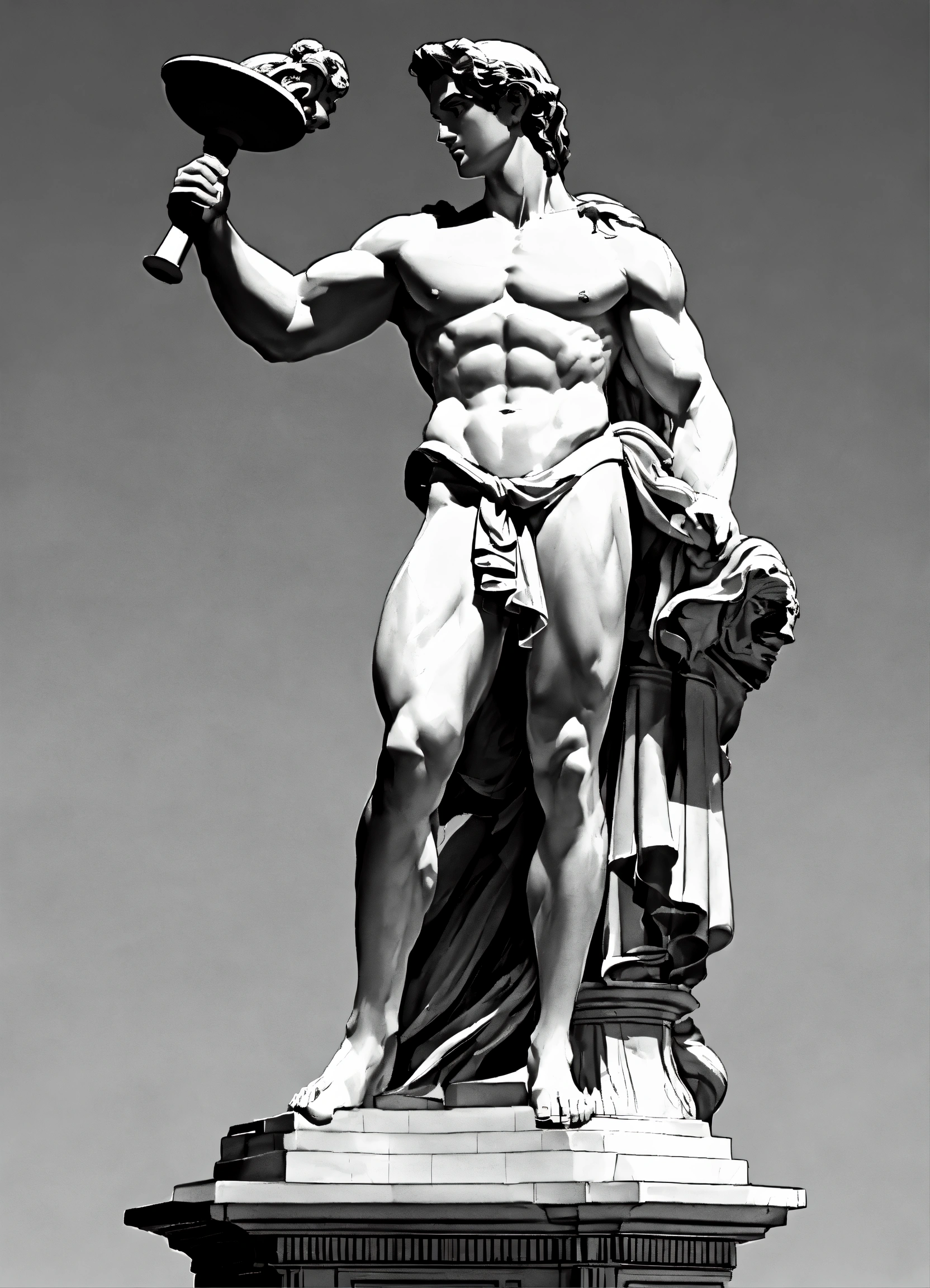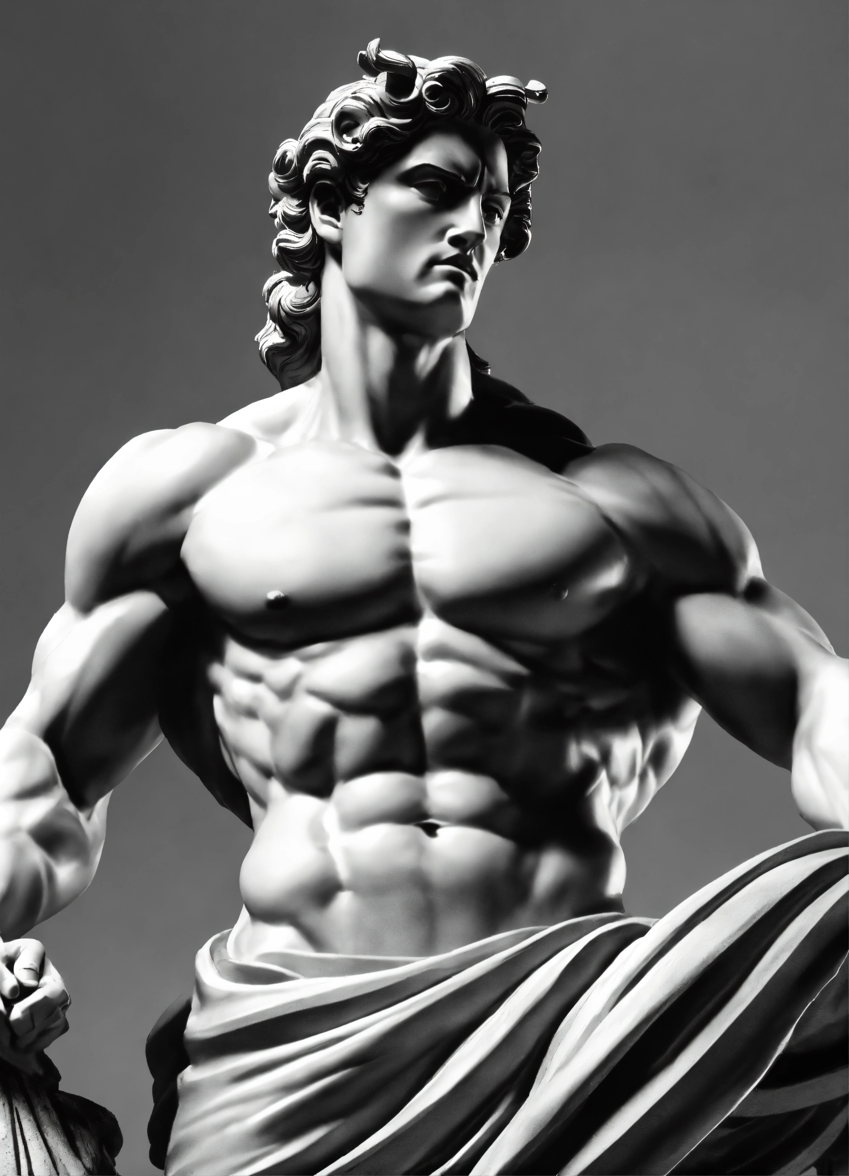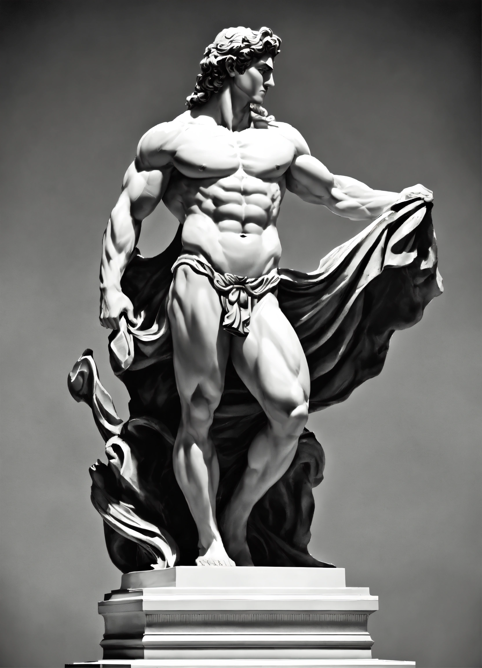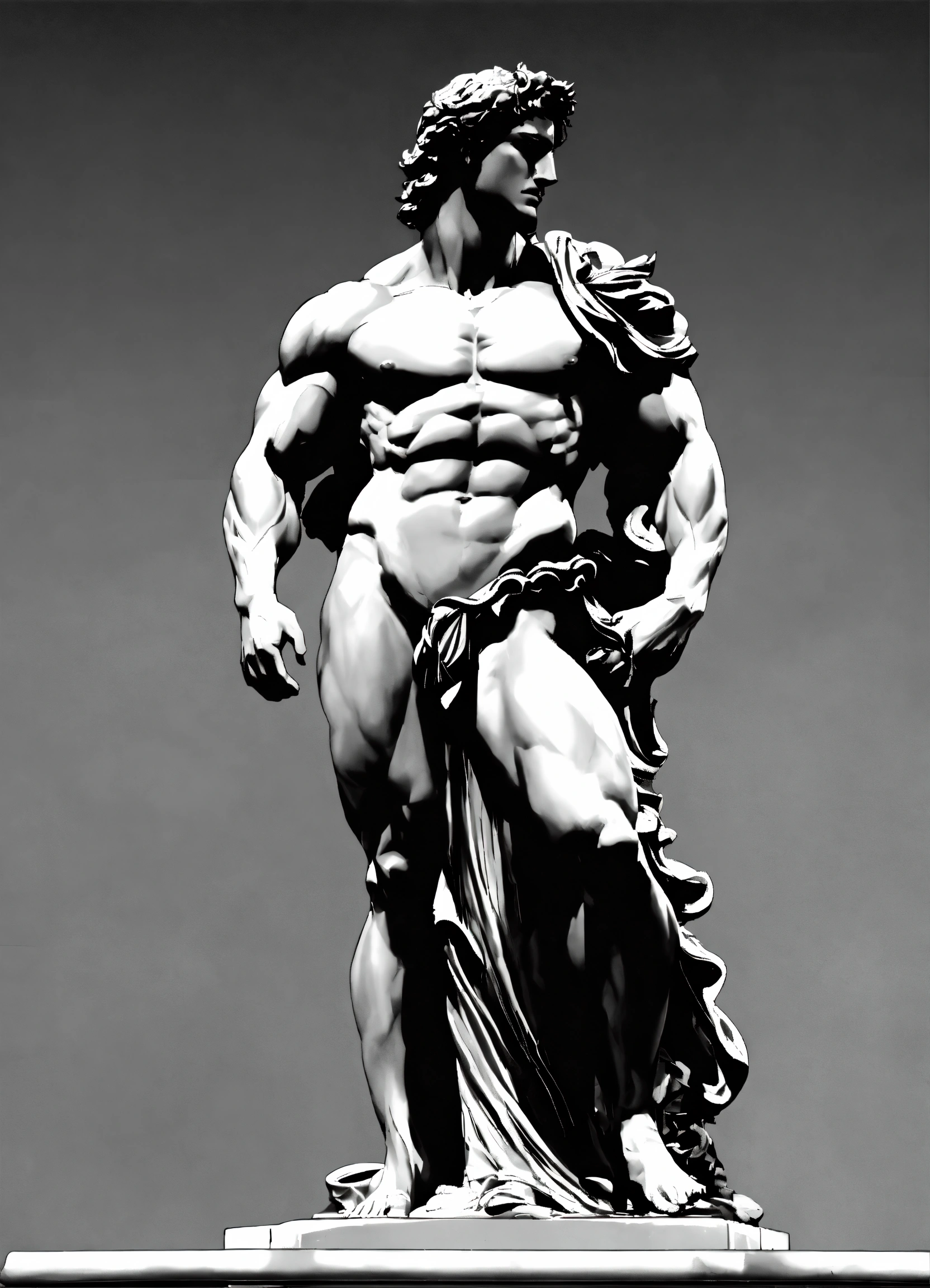 A statue from a muscular greek god statue with a wavey middel parting hair with standing on a podest animeted style 8k doing the apollo pose drawed in black and white