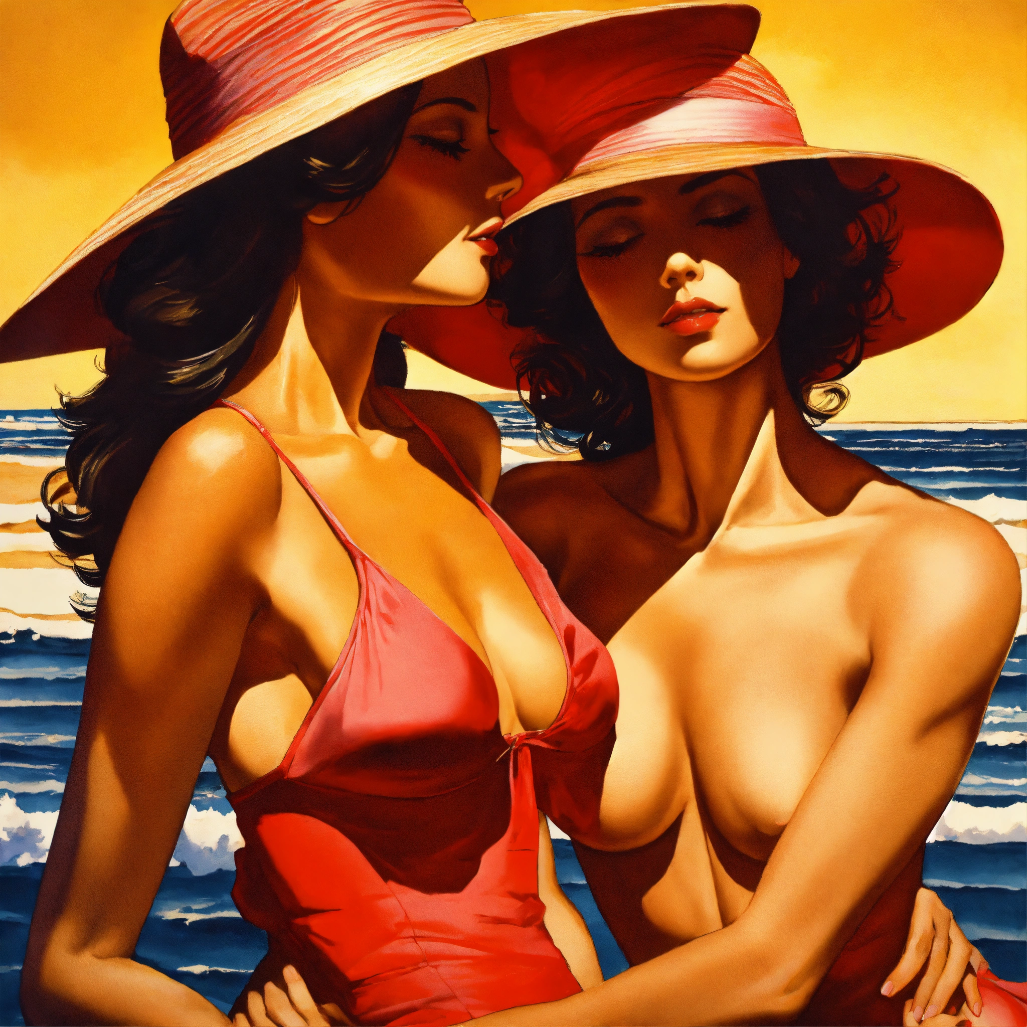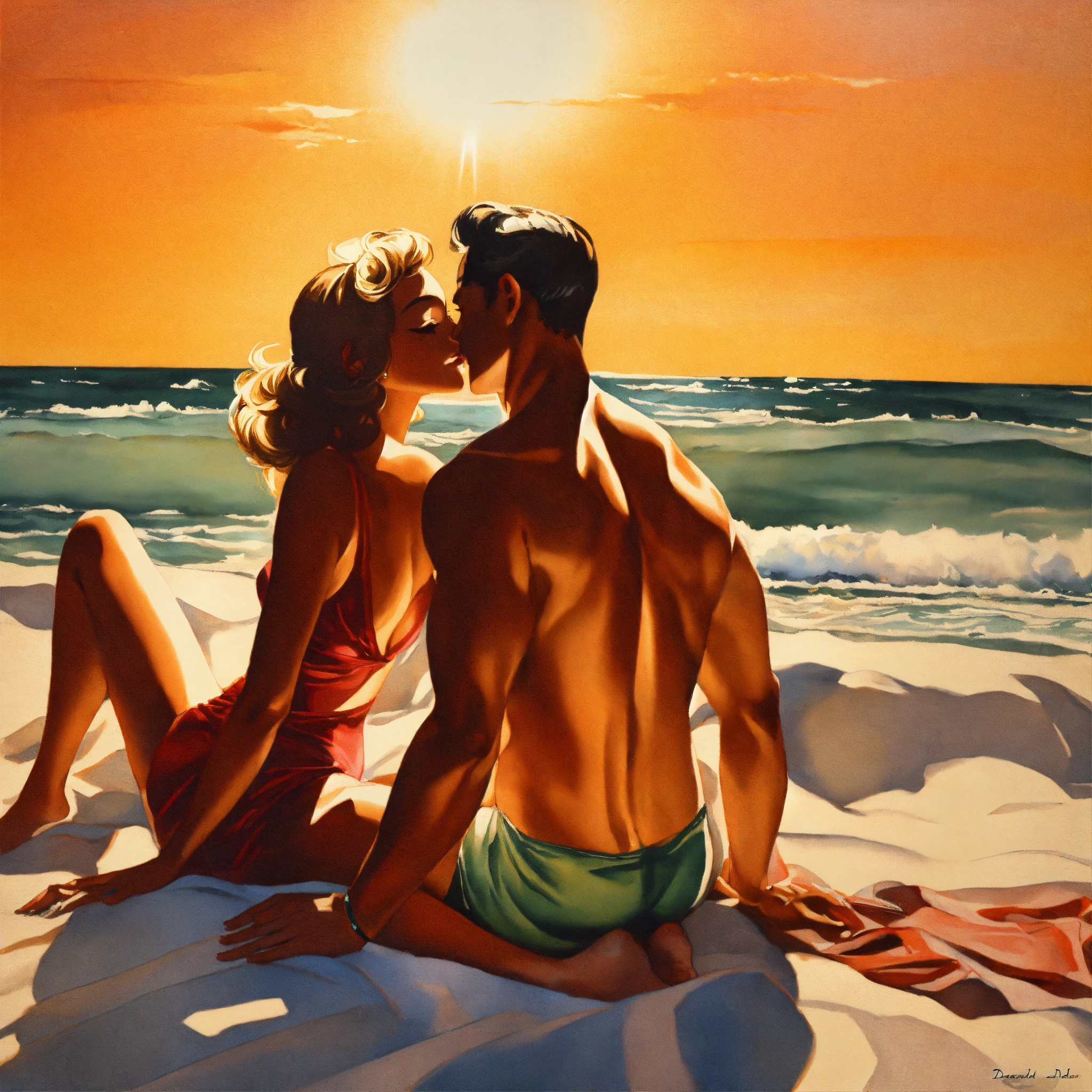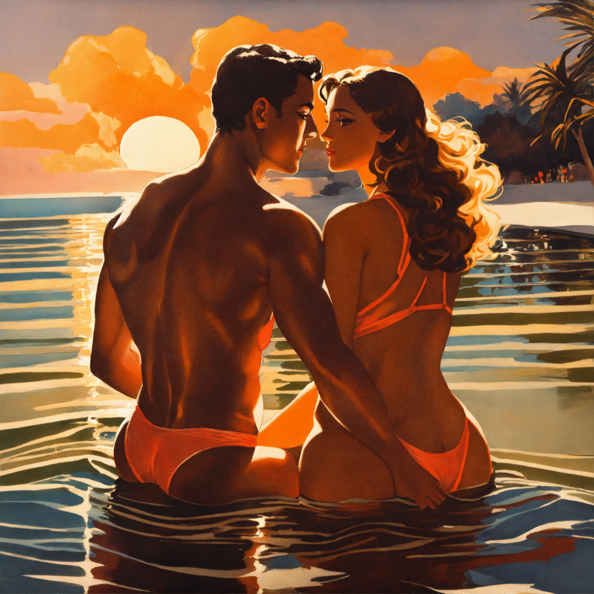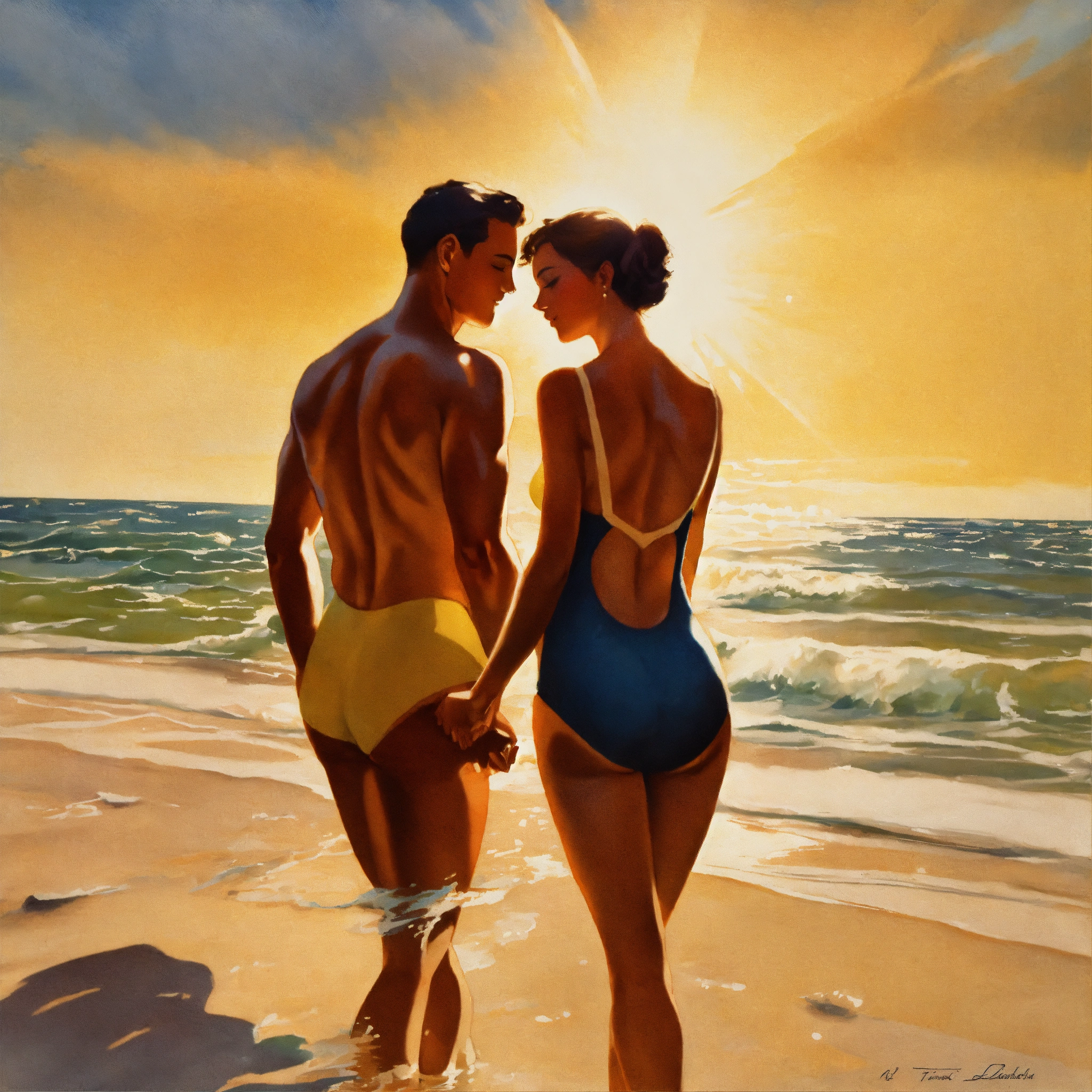 Pen and ink, illustrated by tamara de limpicka, a close up of loving couple in swim suits alone forever with blazzing sun. stunning color scheme, masterpiece.beach scene with loads of sun shadows and shades. tricks of the light