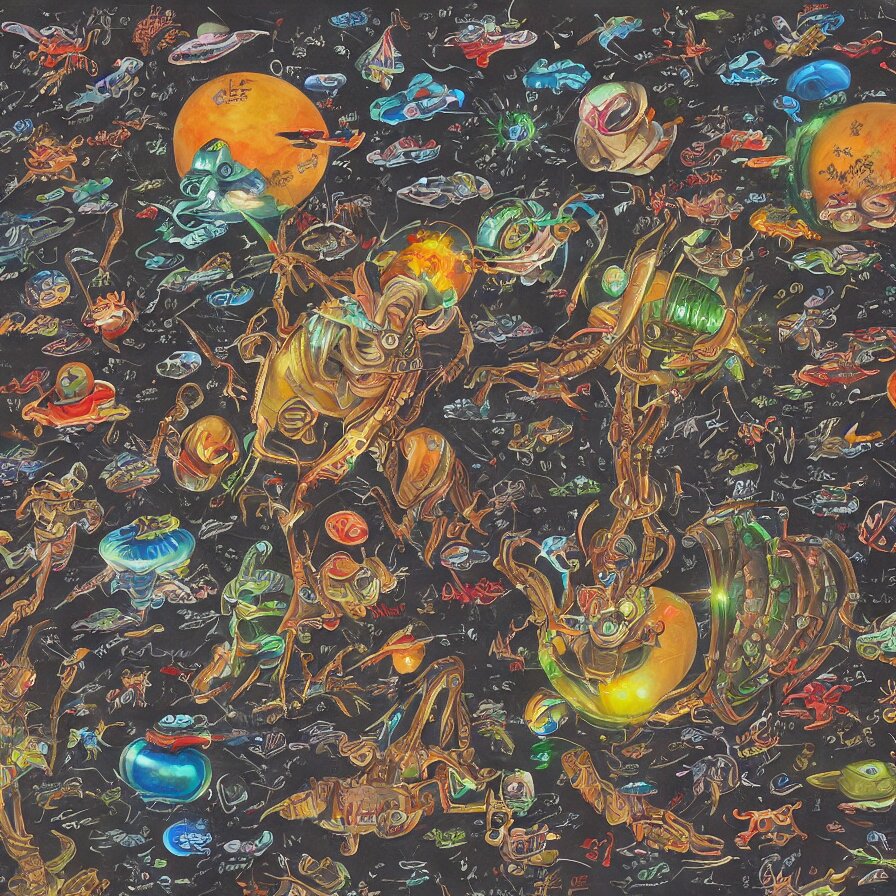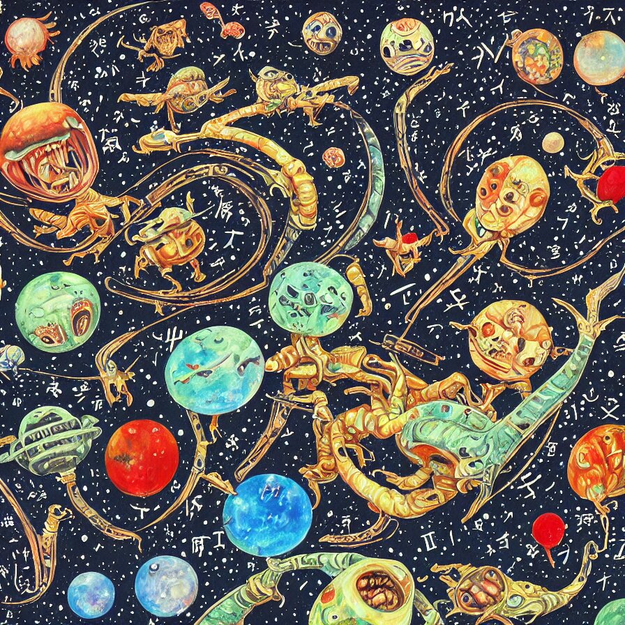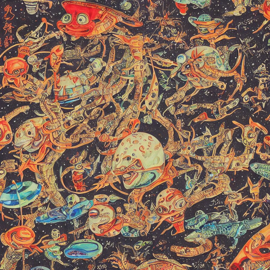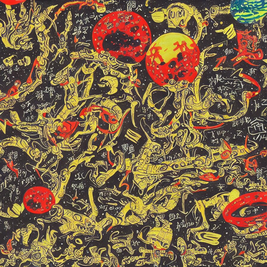 Realistic detailed painting of aliens and ufos, ufos, vivid, japanese kanji everywhere, japanese kanji, kanji