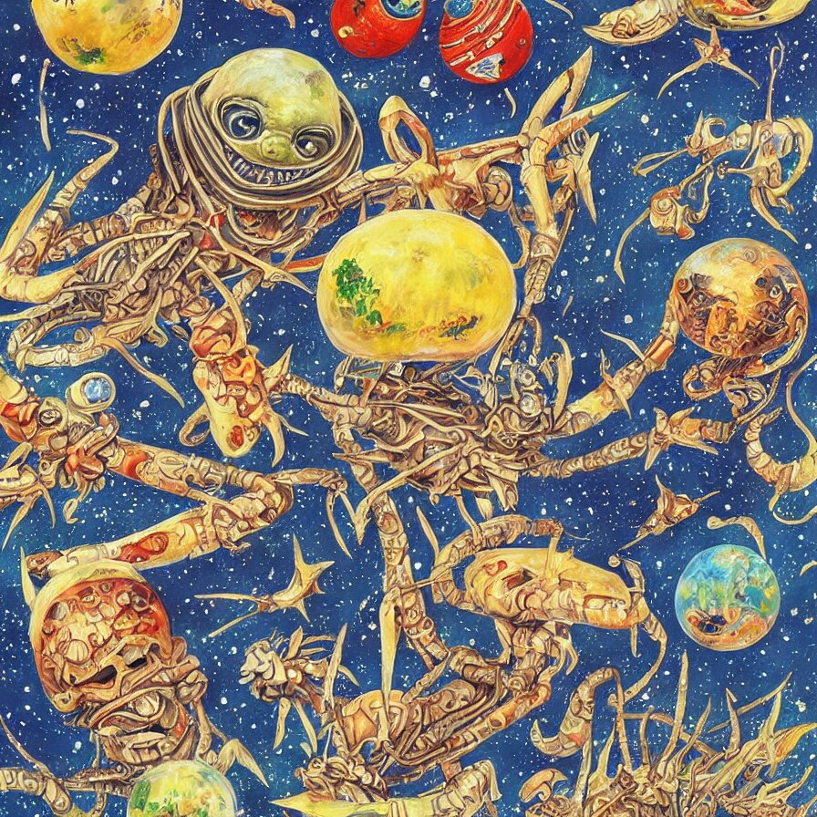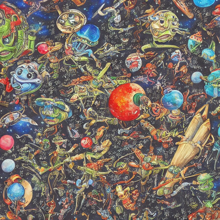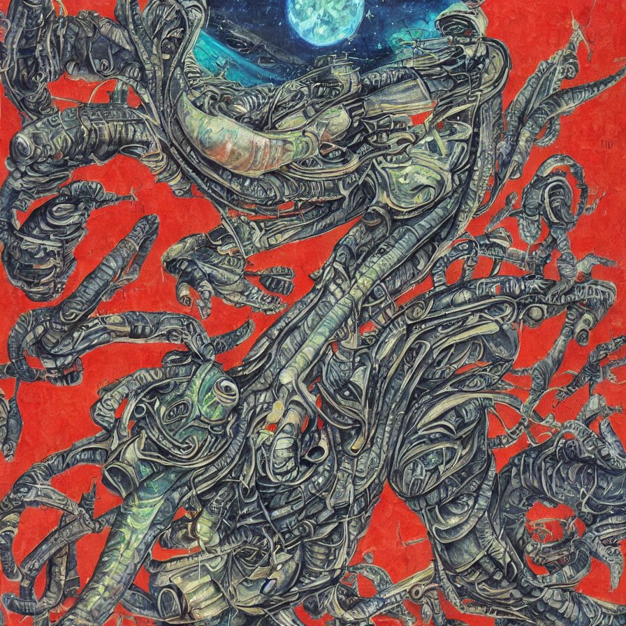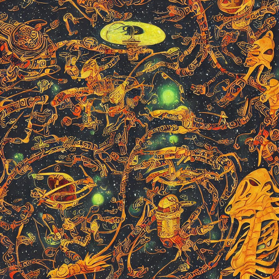 Realistic detailed painting of aliens and ufos, ufos, vivid, japanese kanji everywhere, japanese kanji, kanji
