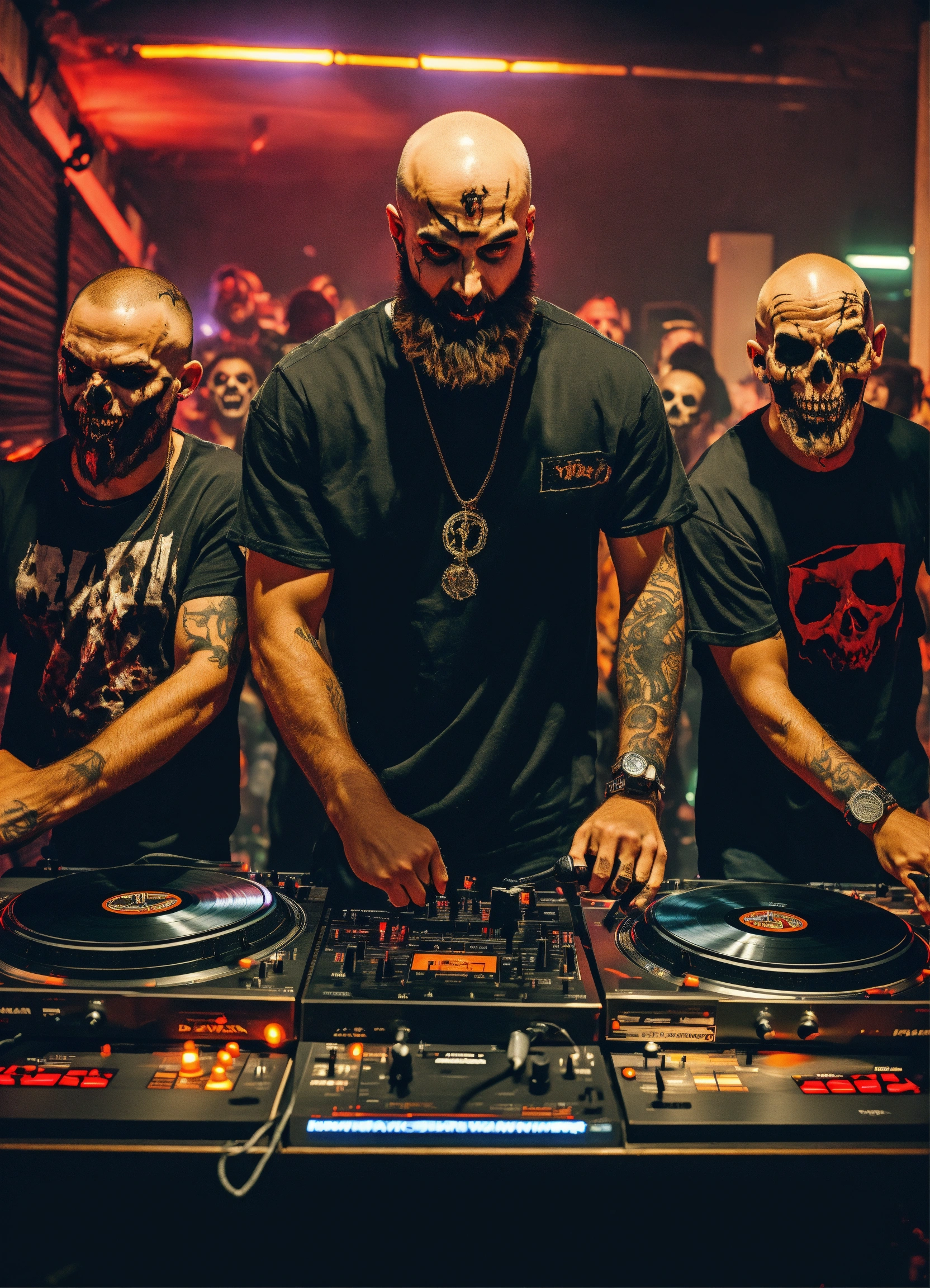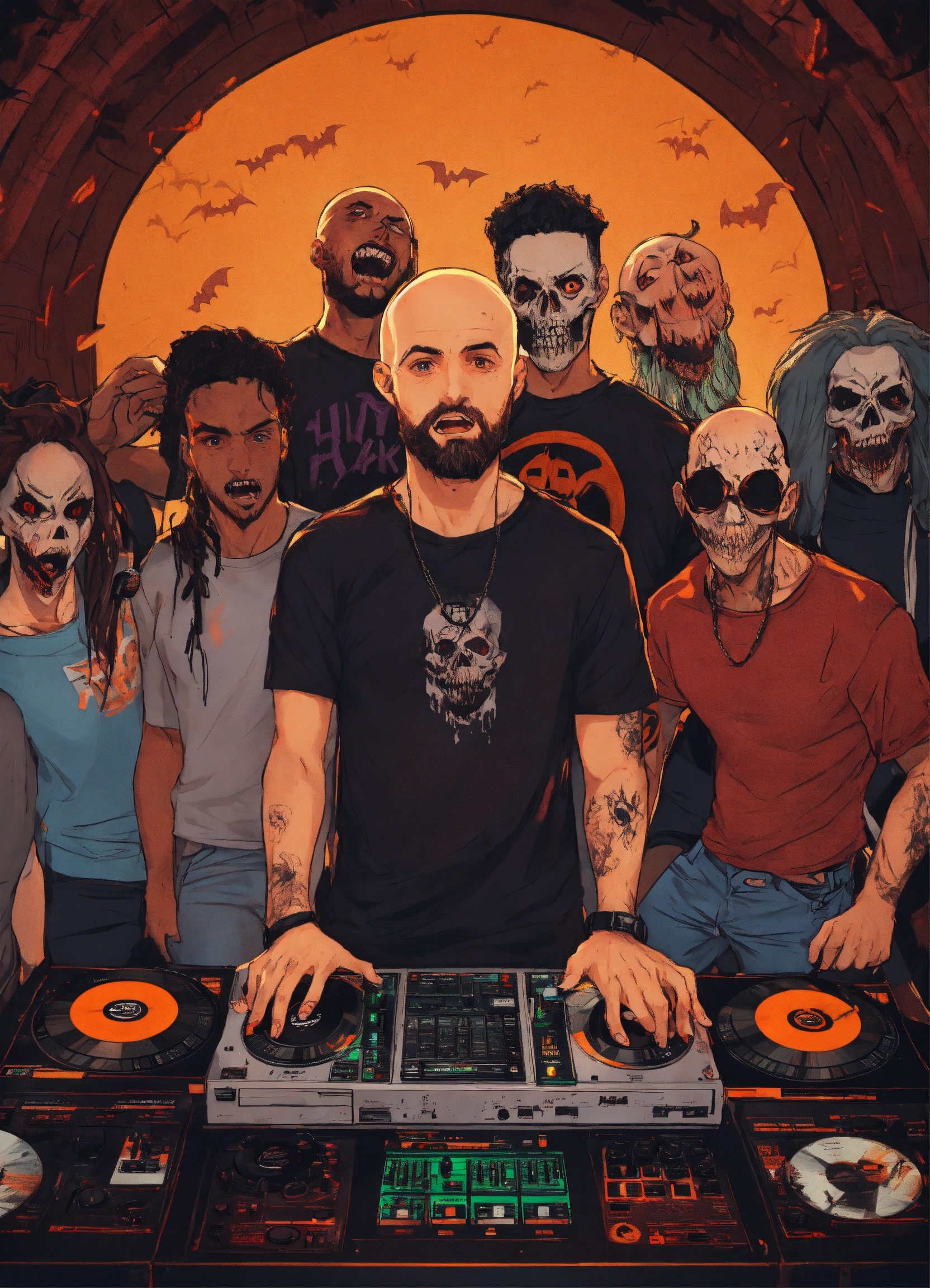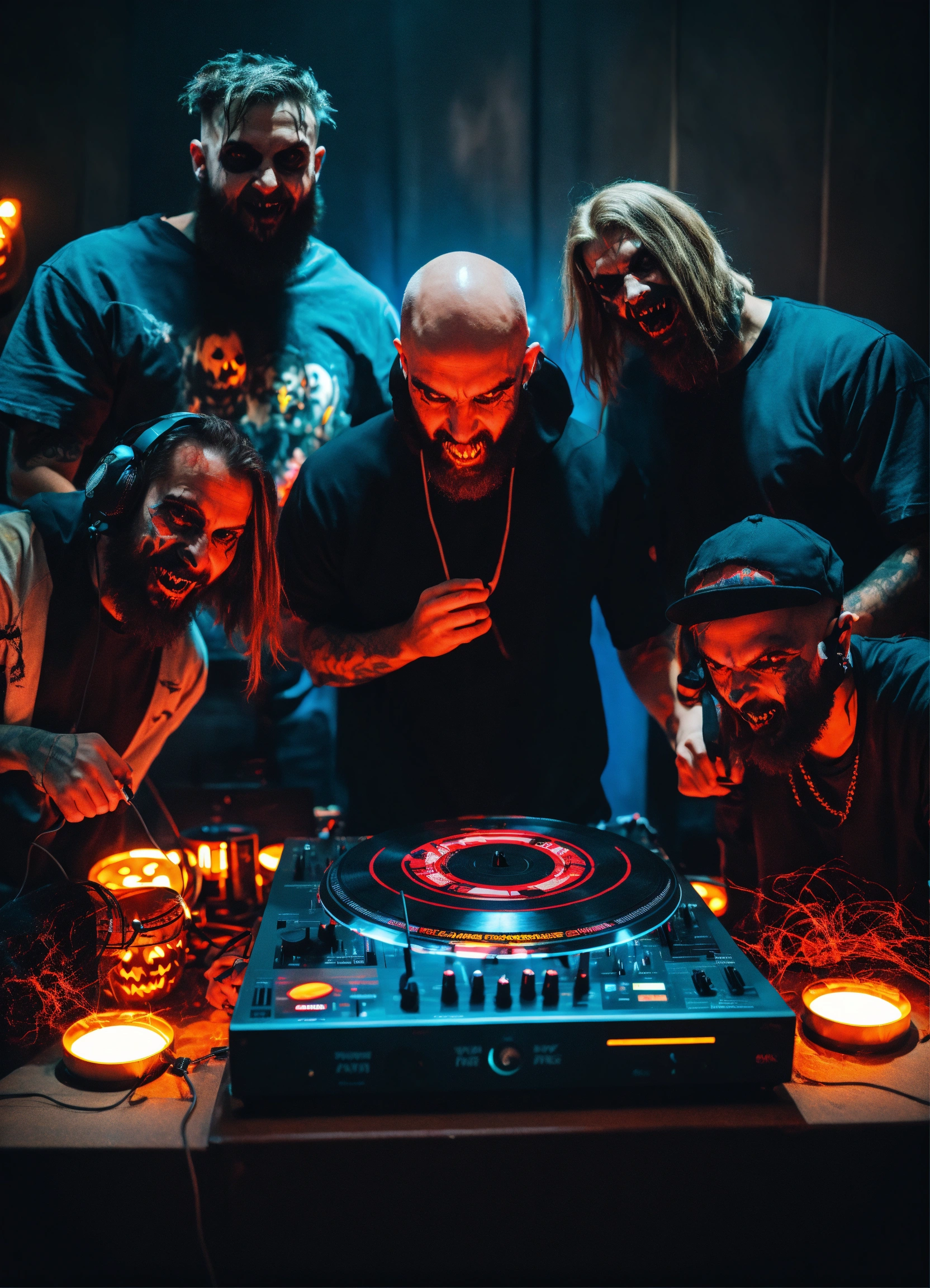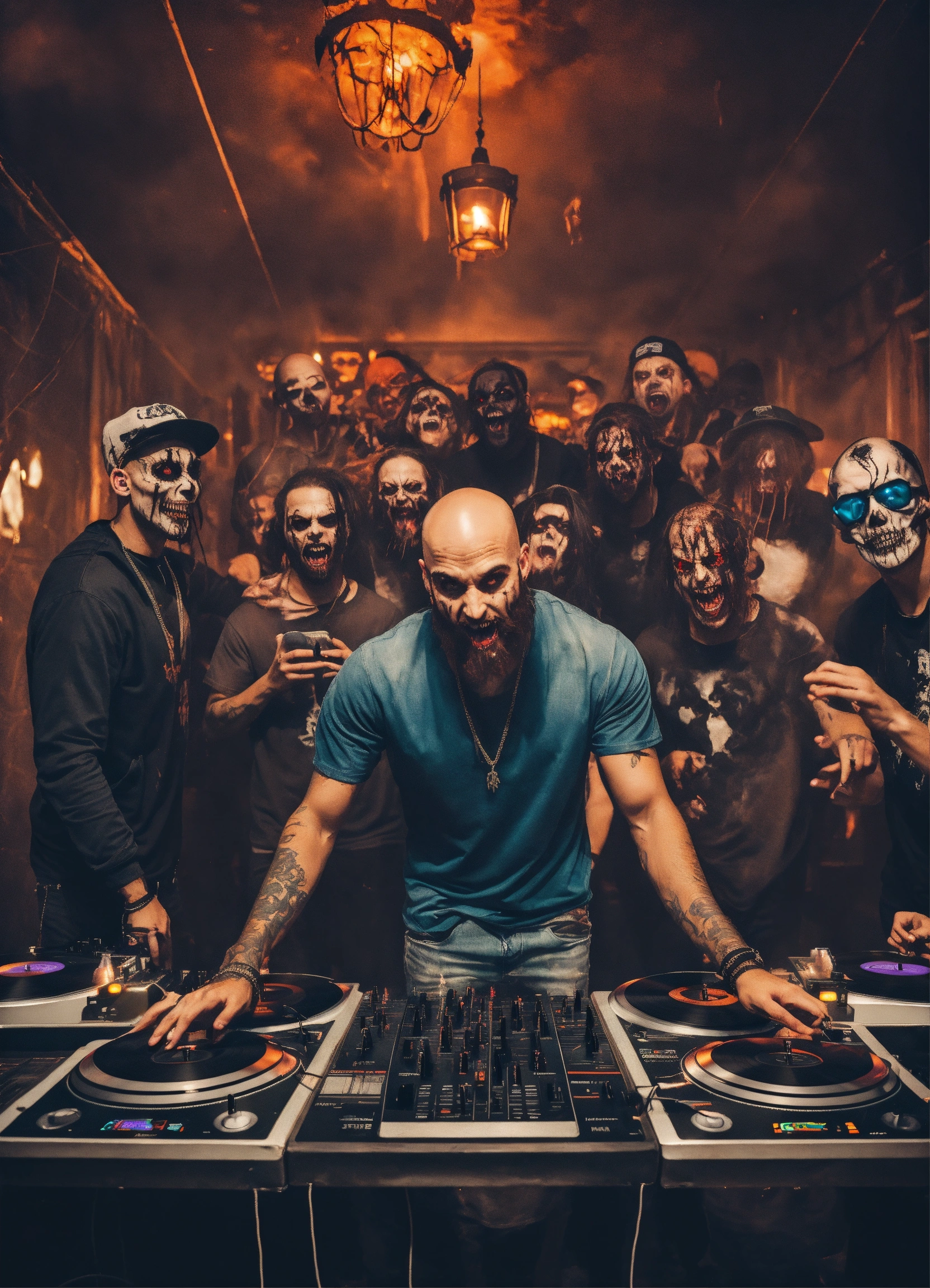 A young bald man with beard 8k modern day 2023 clothing t shirt and ripped jeans create a terrifying halloween tableau featuring a group of possessed individuals with twisted, demonic features and malevolent grins dj a booth with turntables and mixer and a mic