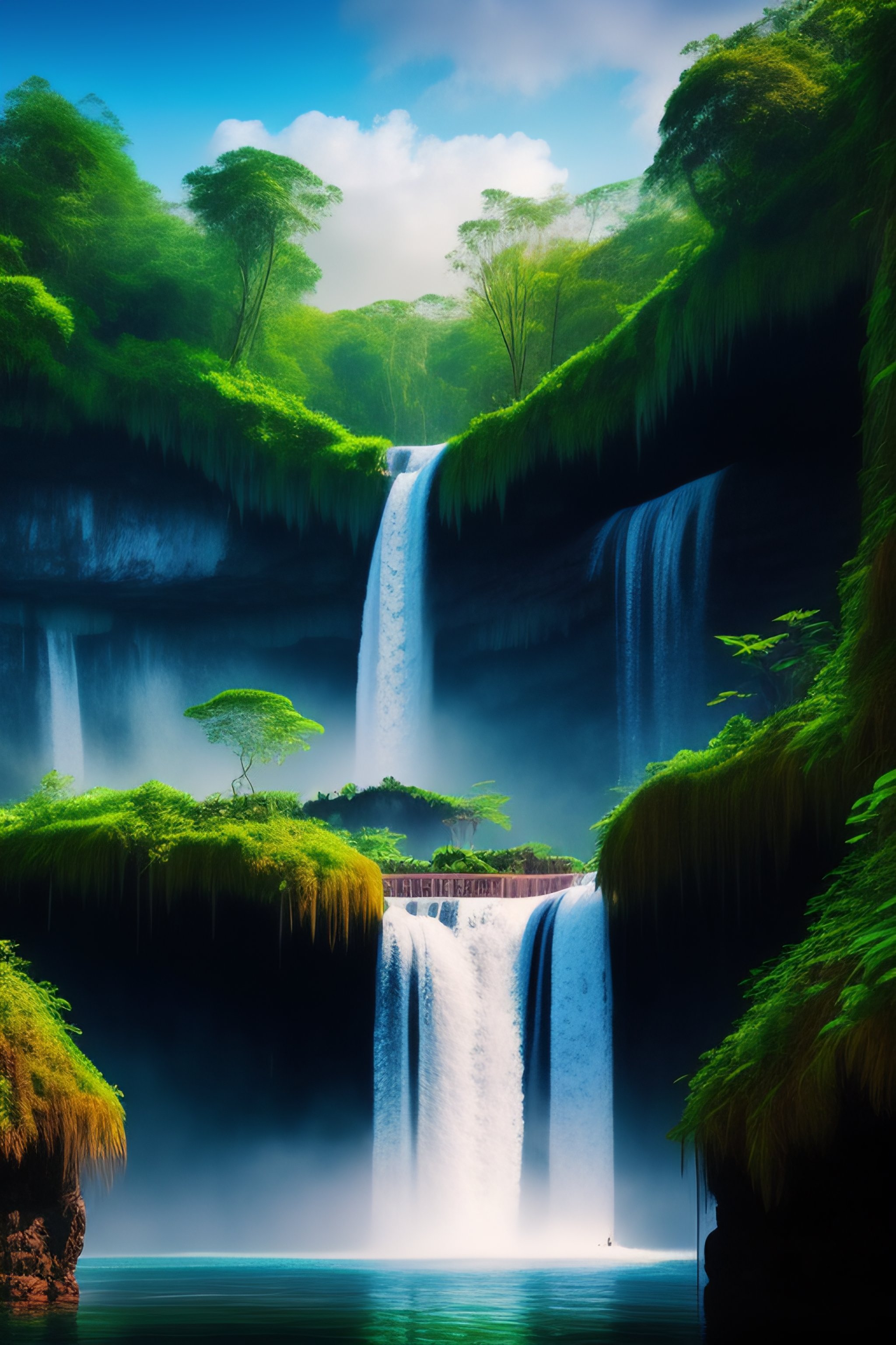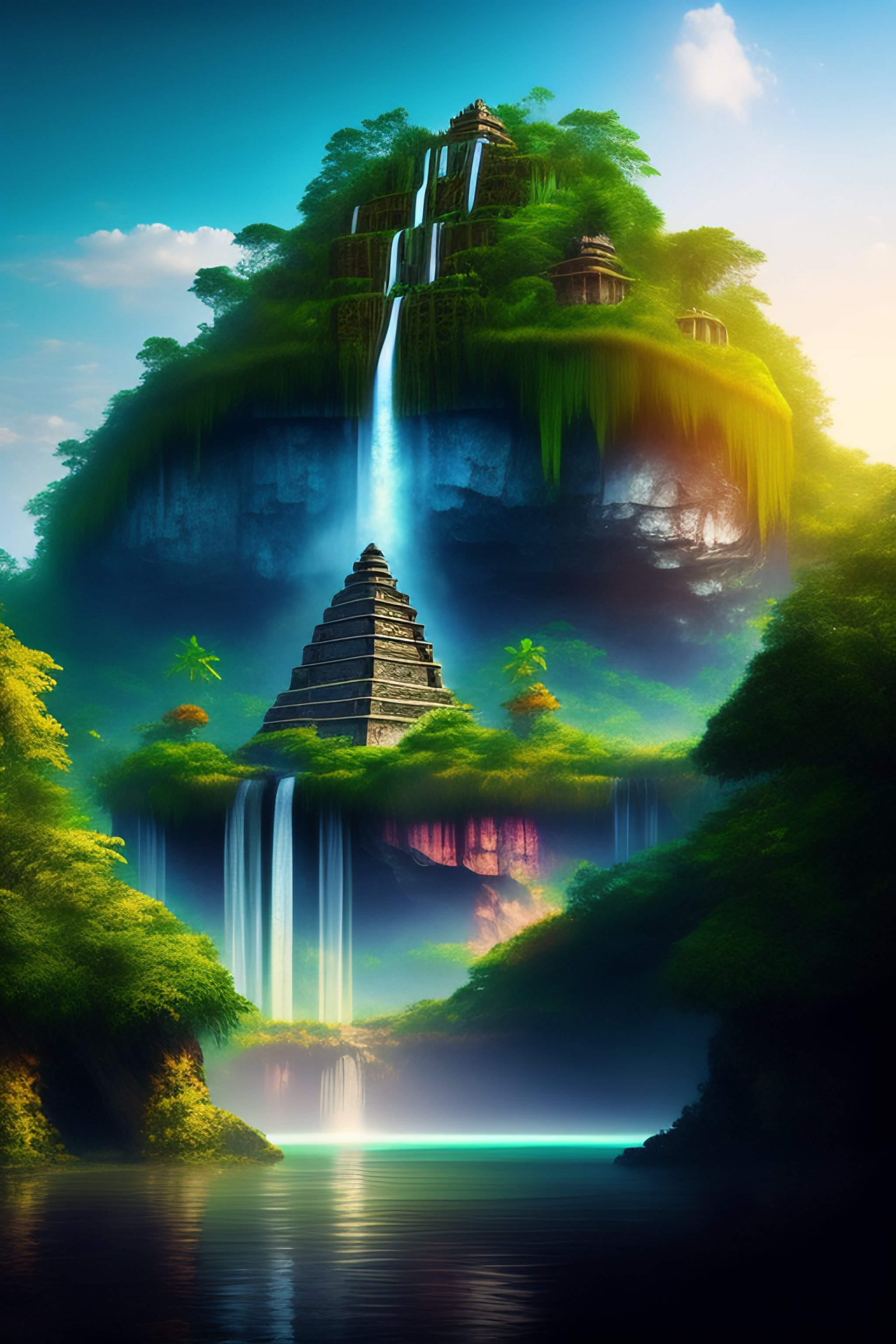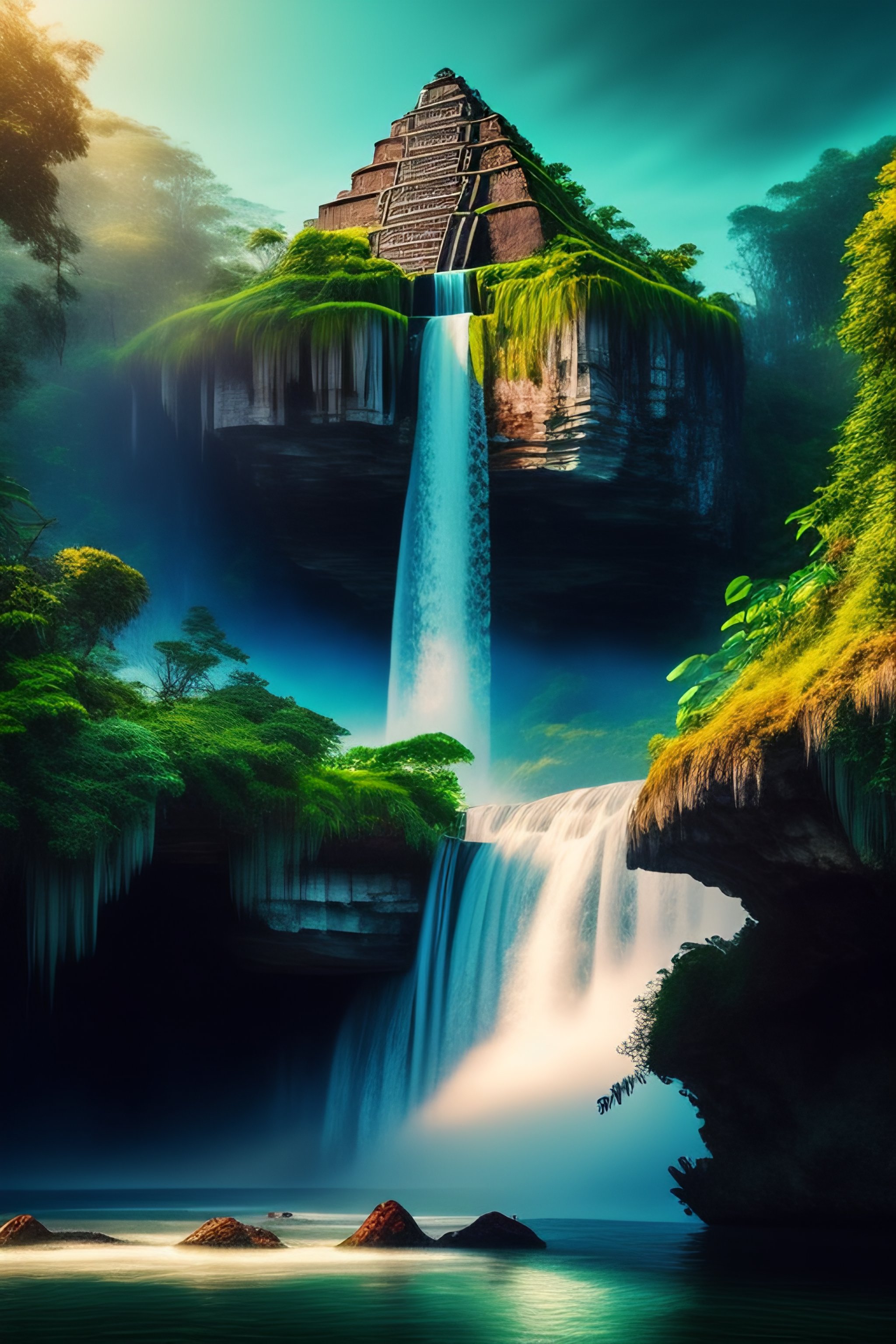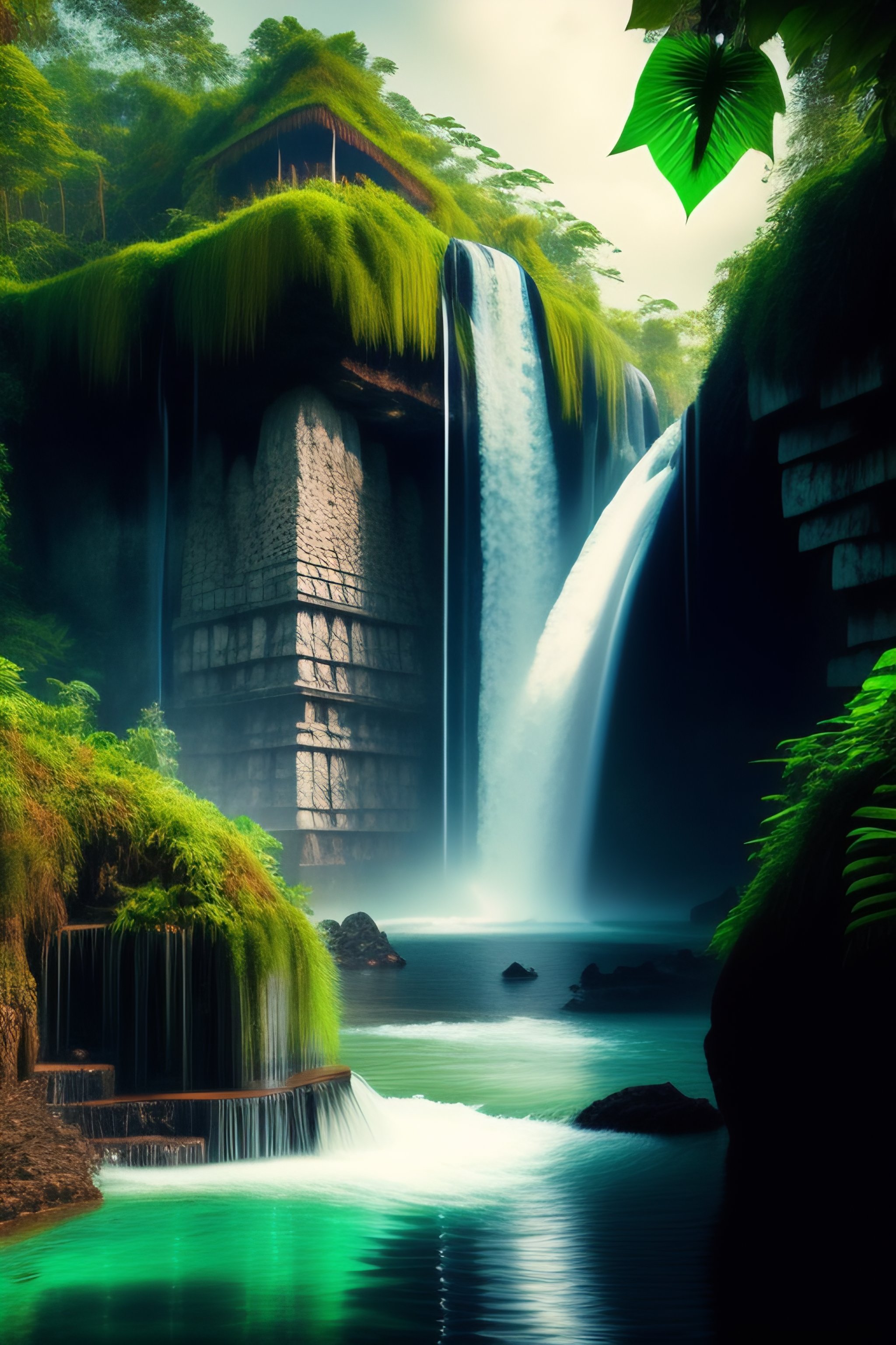 Mayan city pramid ivy foliage abandoned sculptures dark sky forest stars concept landscape environment depth water waterfall river realistyc