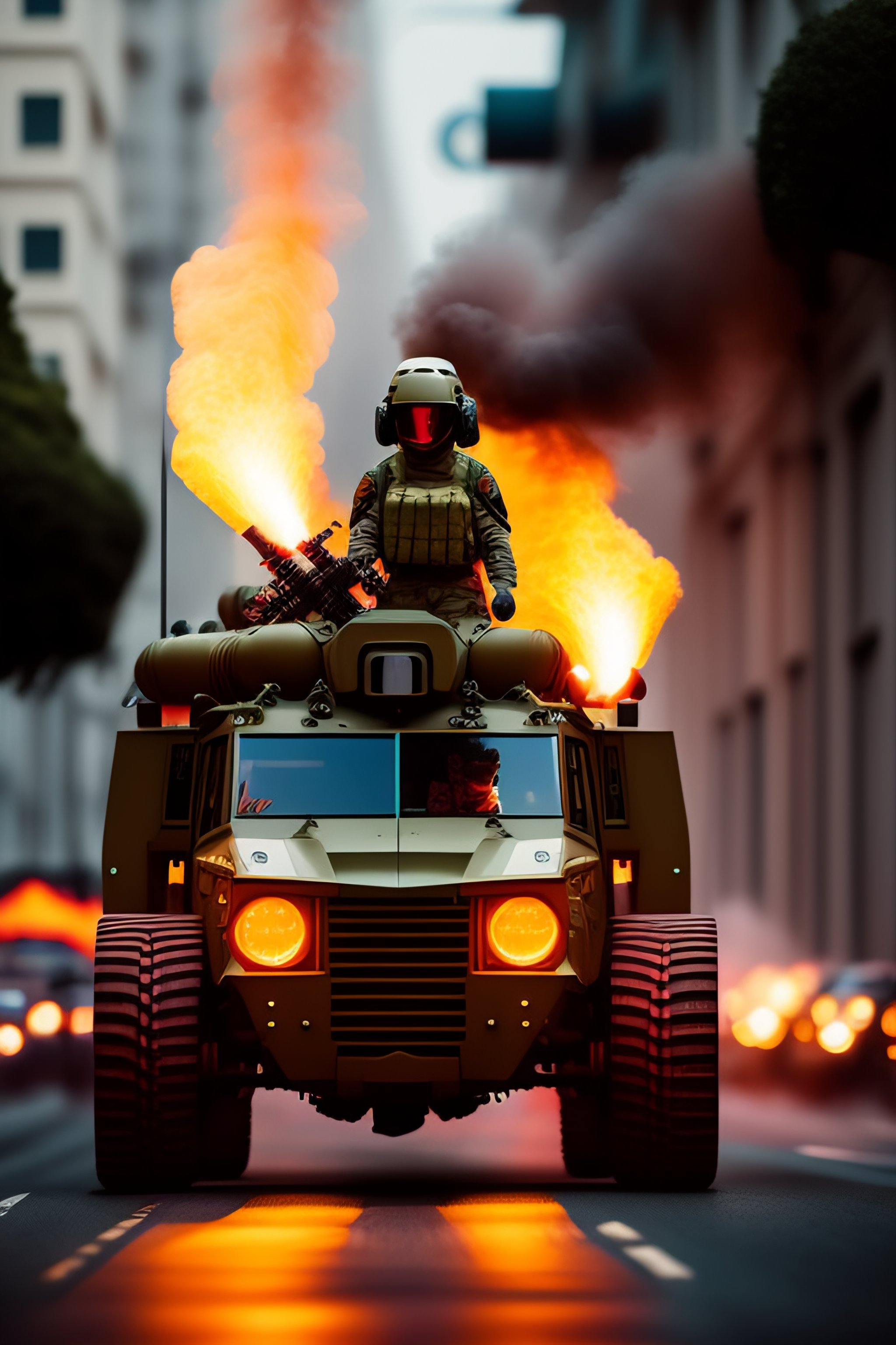Futuristic soldier with special ops team driving a mechanical spider with a flame thrower