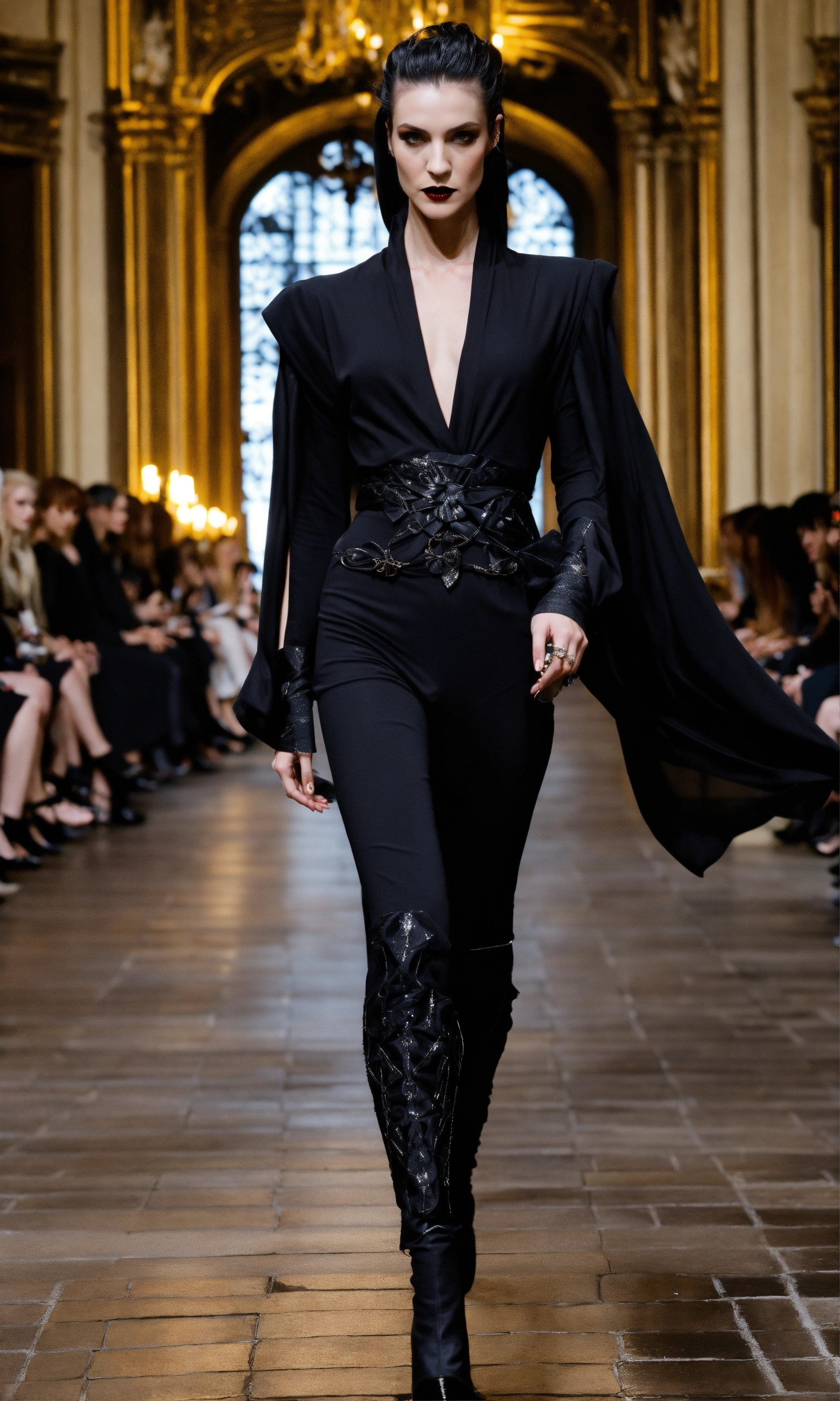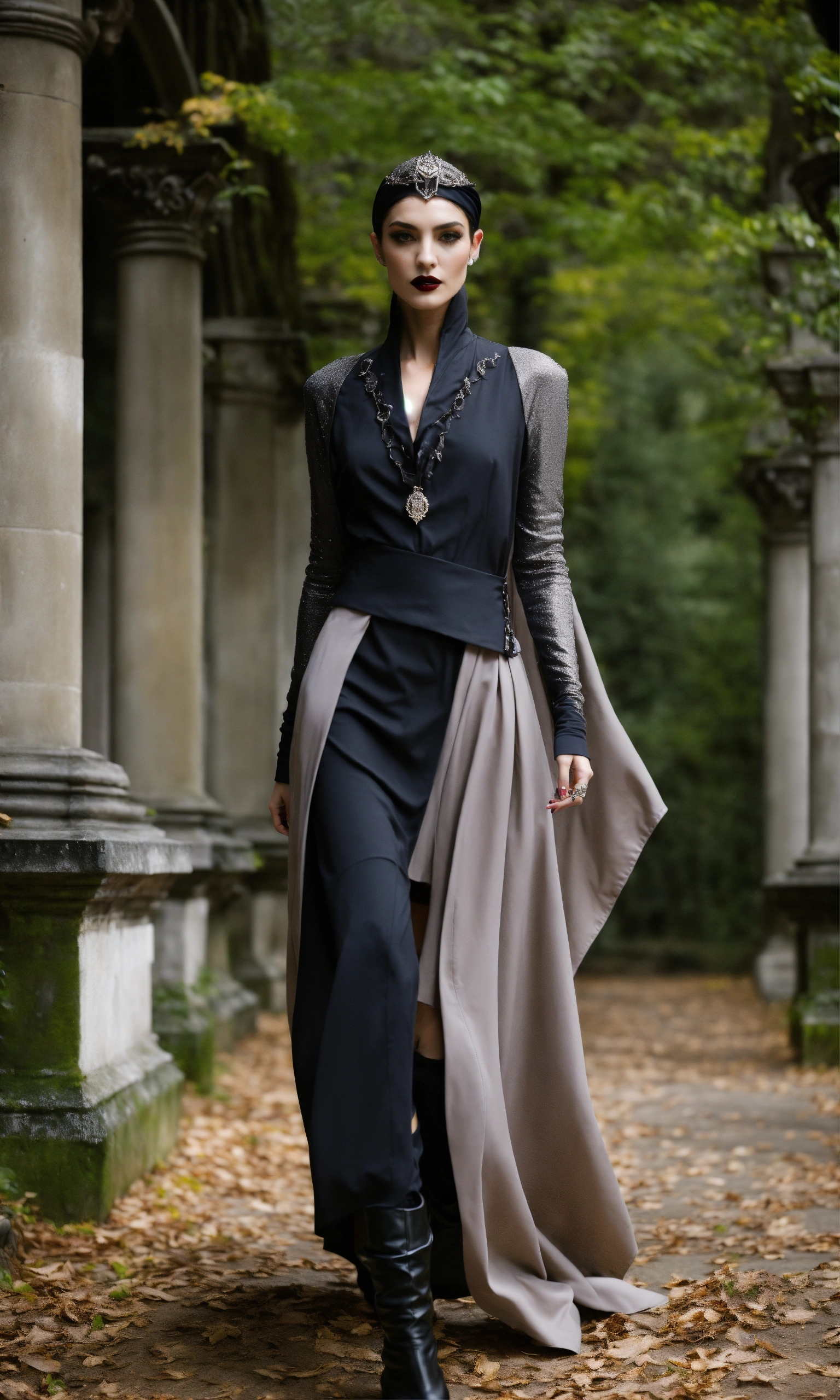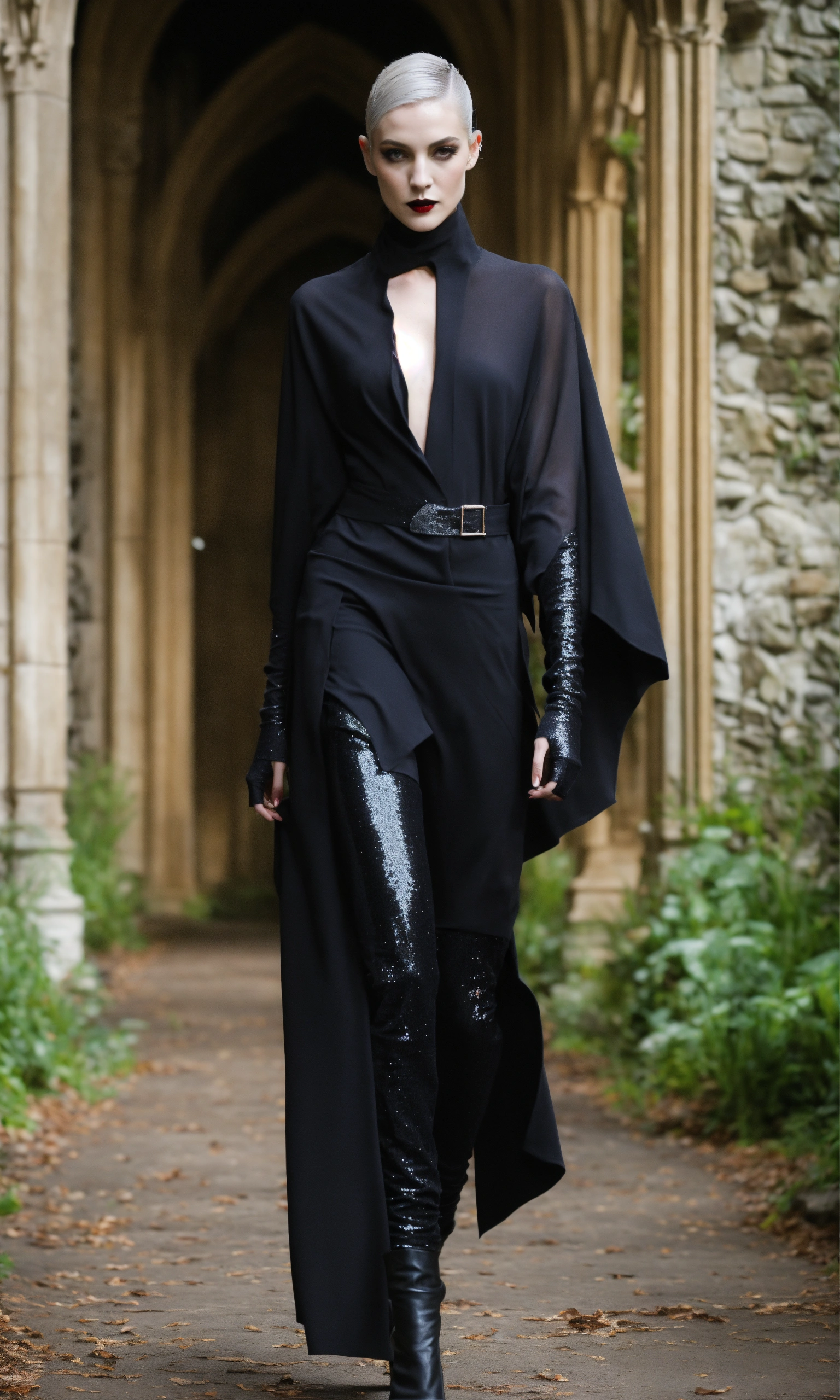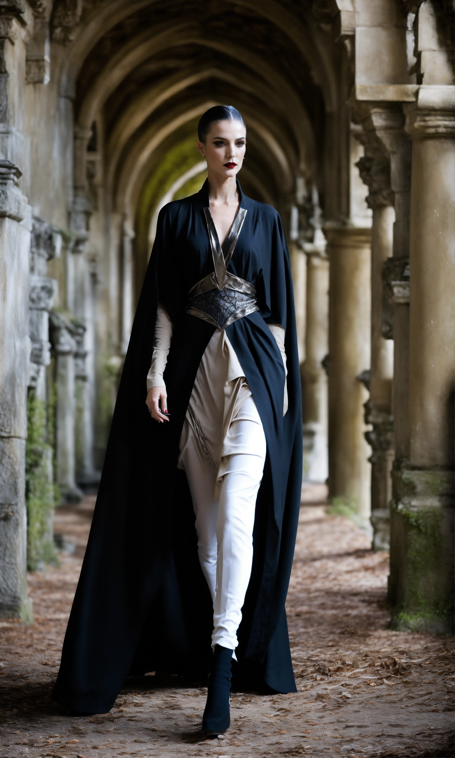 Lothlorien androgynous royal vampire walking runway during vamp fashion week wearing dolman sleeve dark donna karan vamp fashion in black, white, grey, beige, stone, metallics, shimmer walking runway at a goth castle