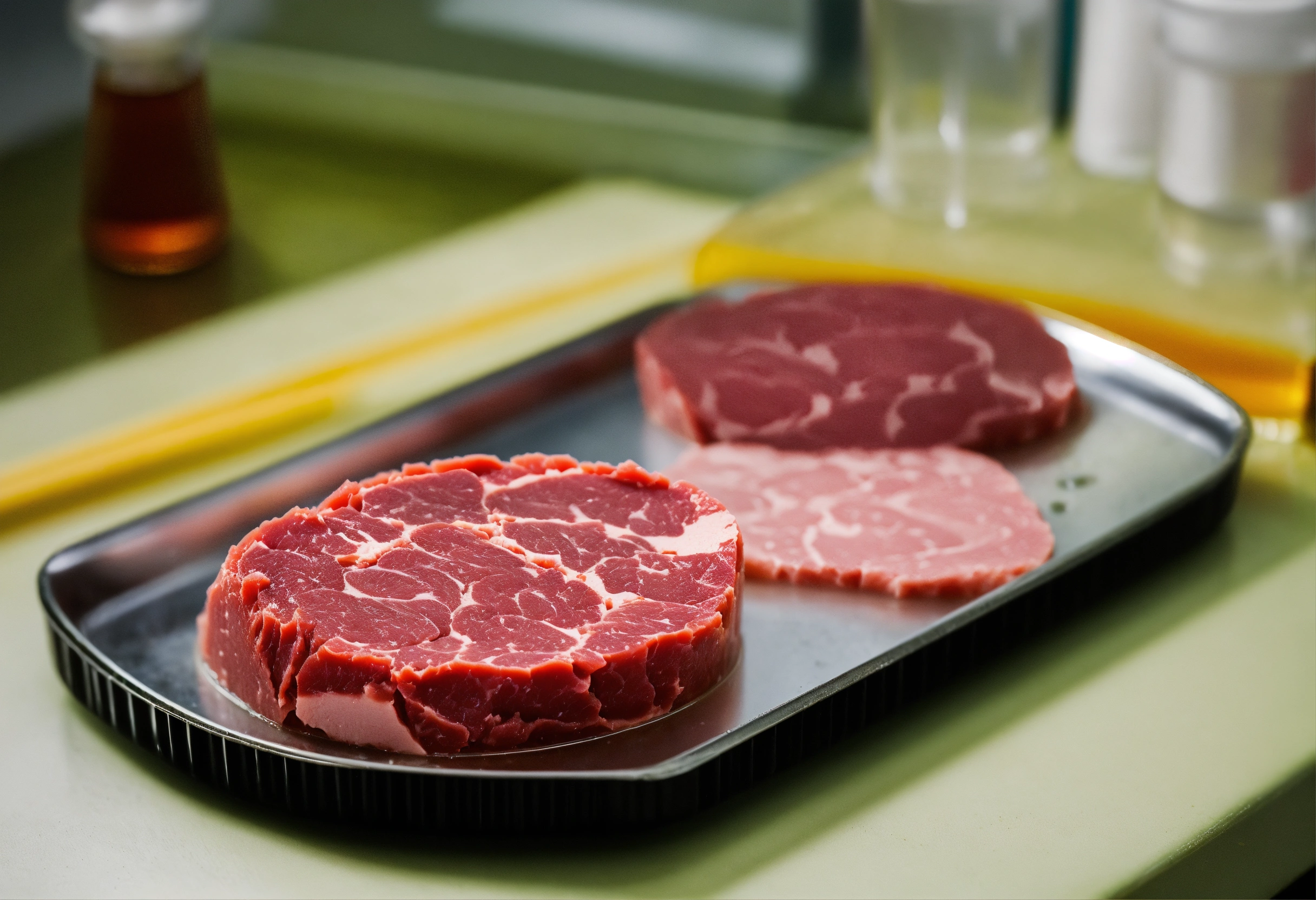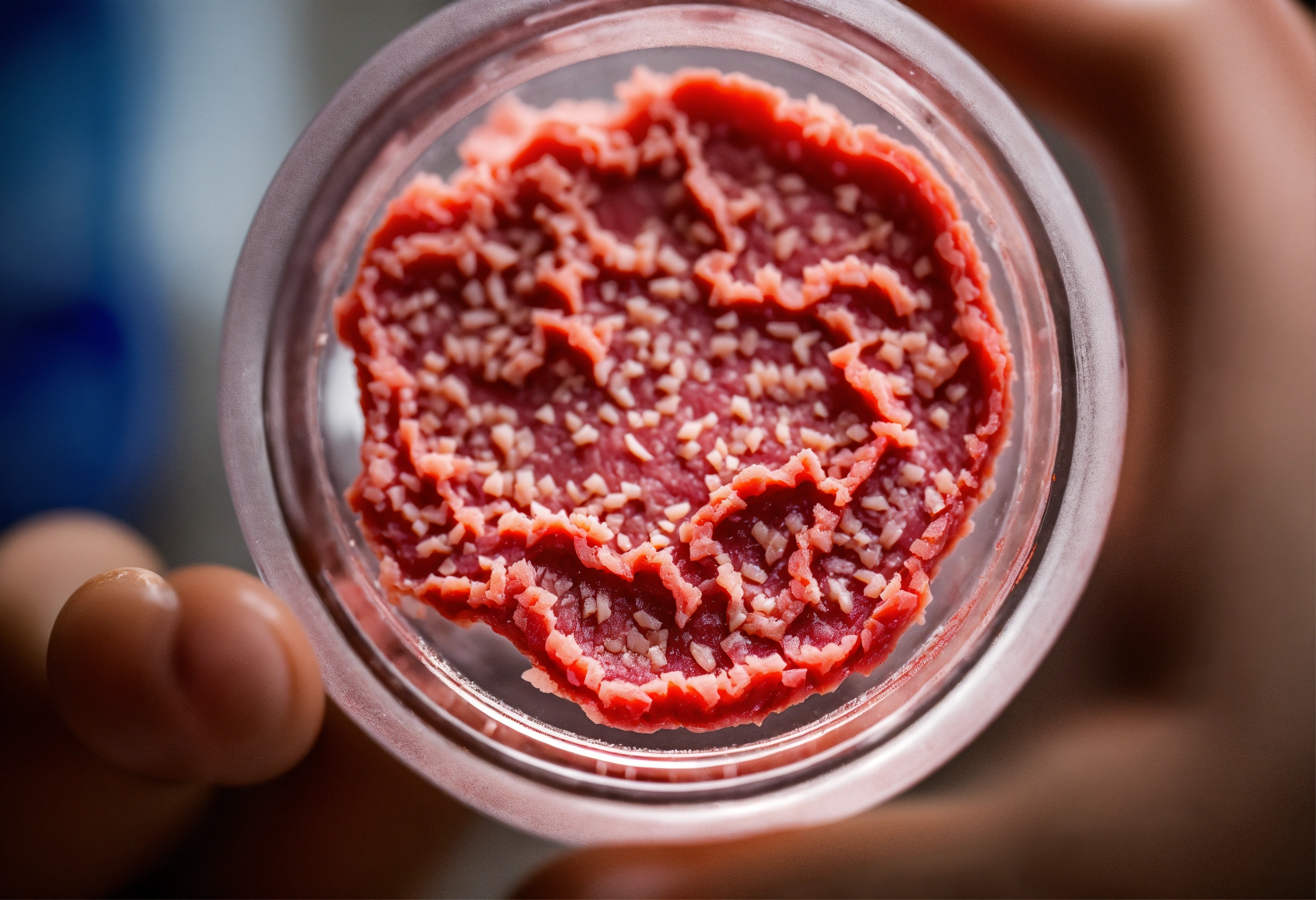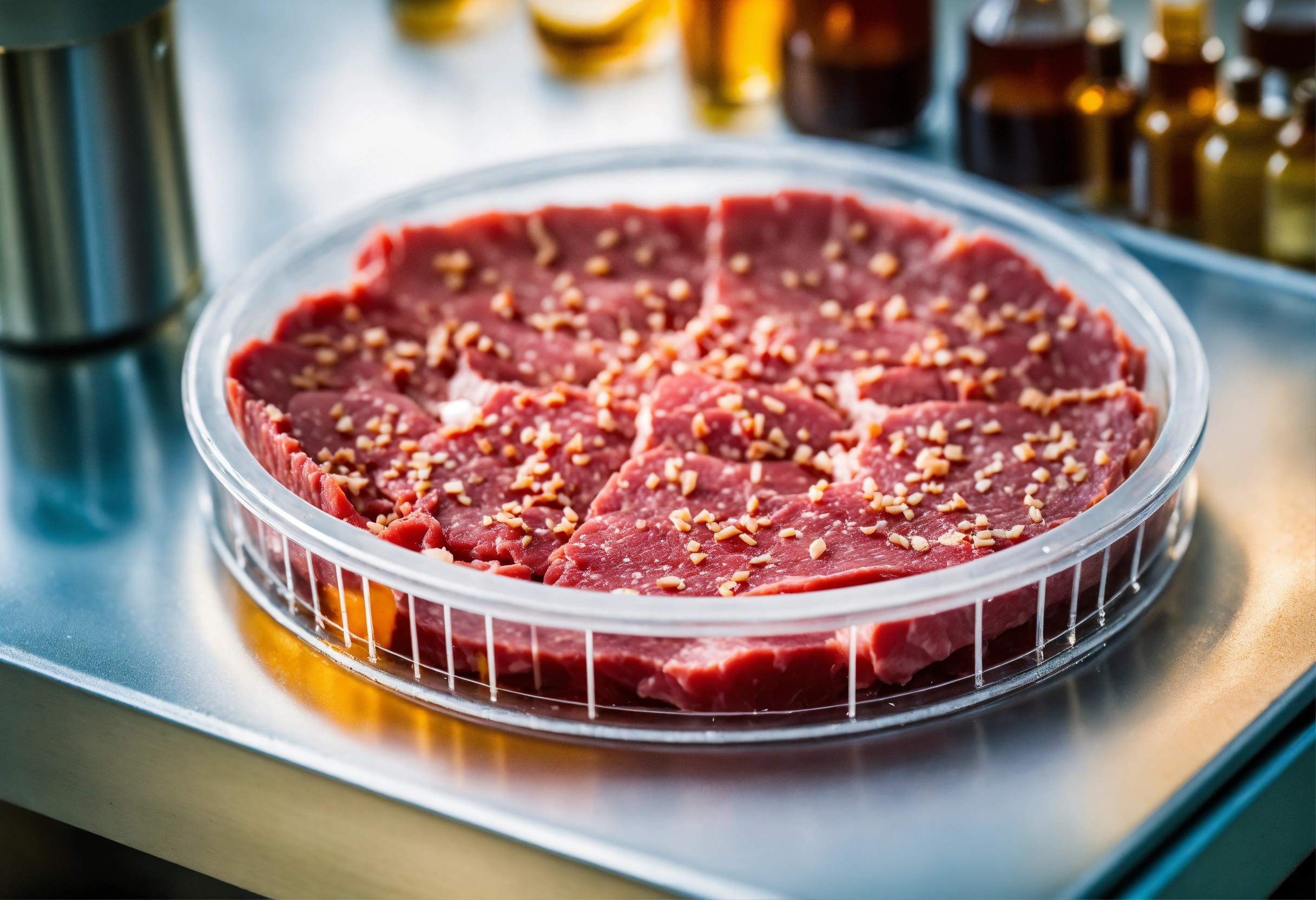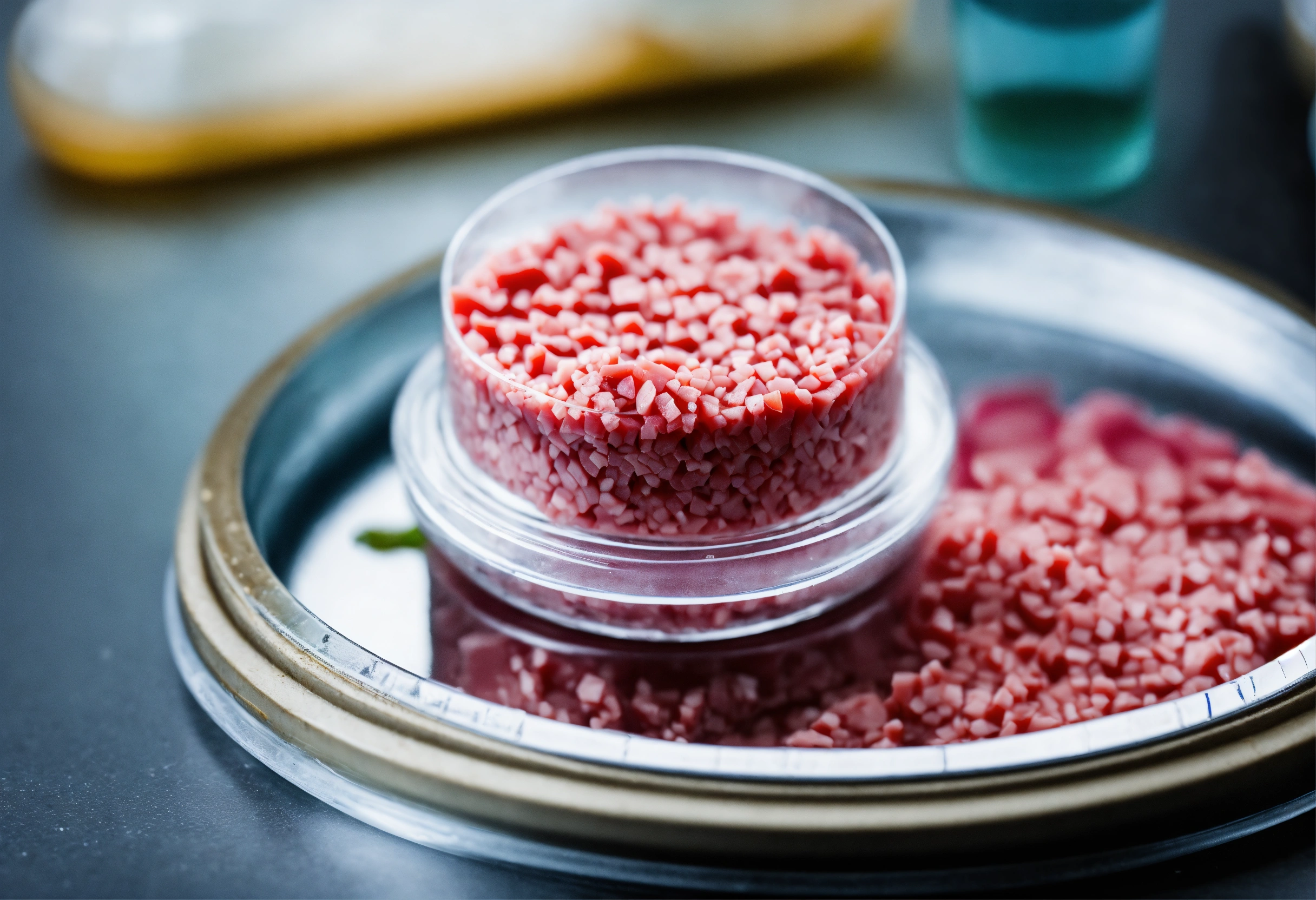 Miature piece of raw meat sample in a petri dish on a laboratory bench