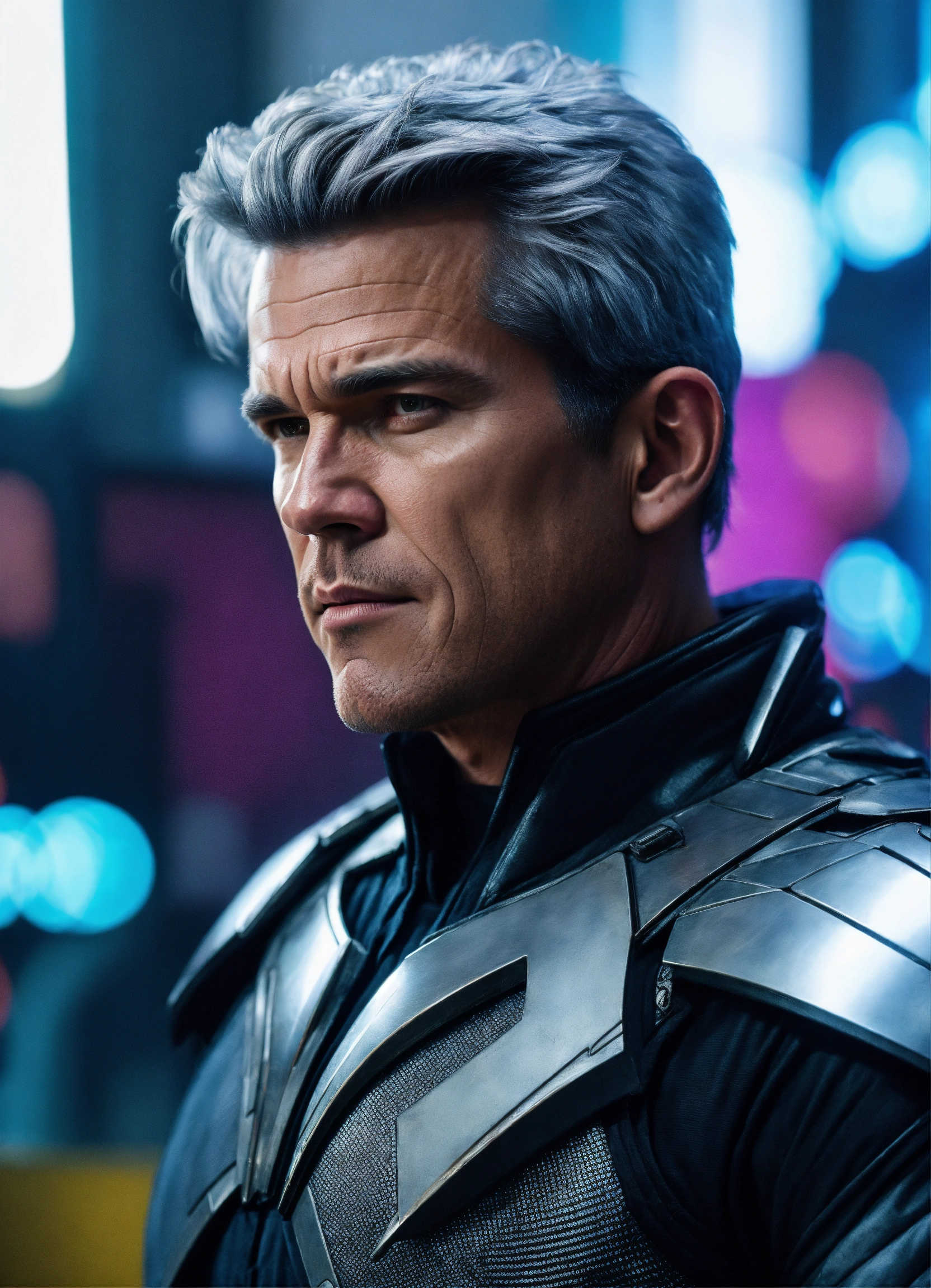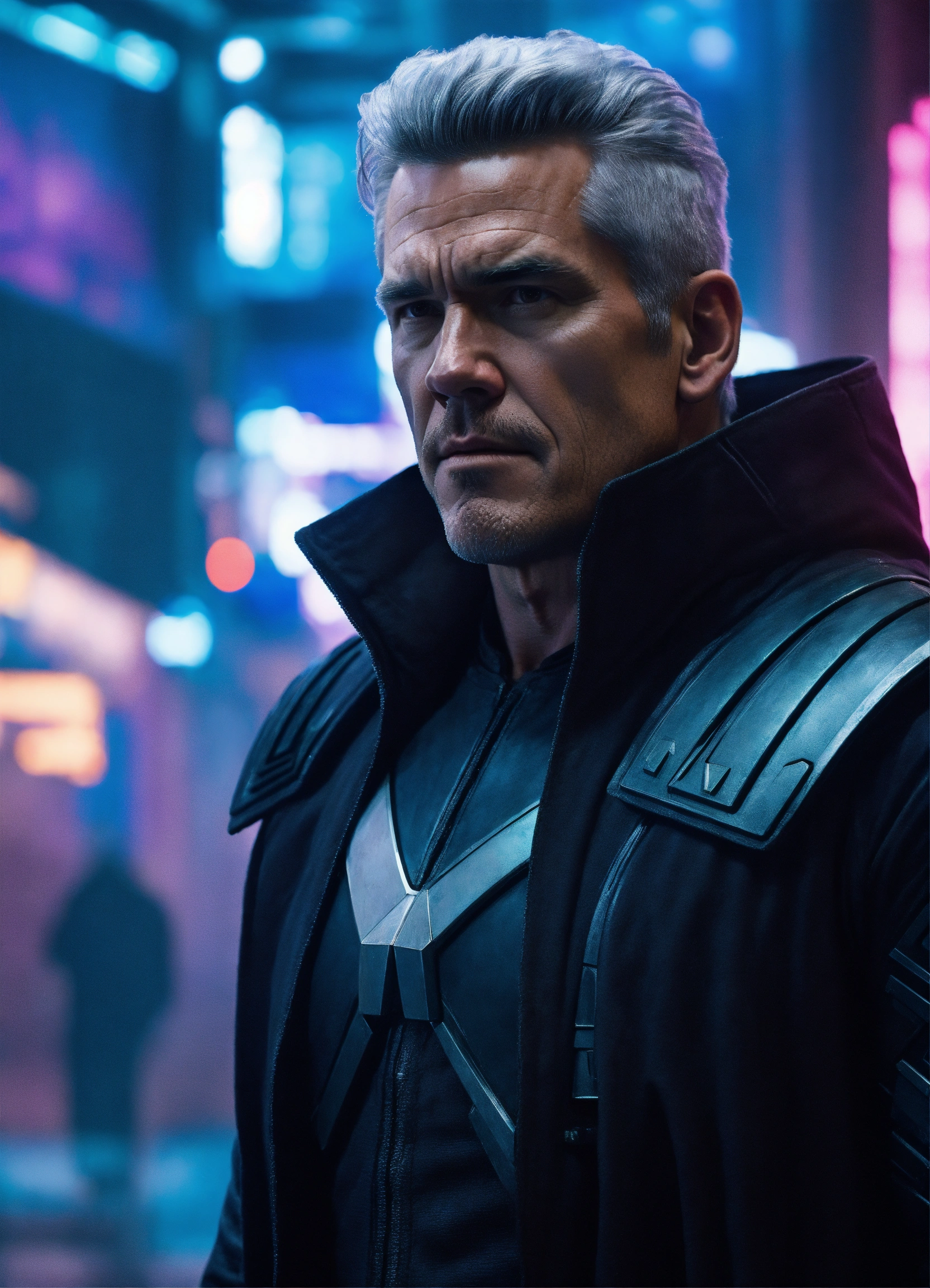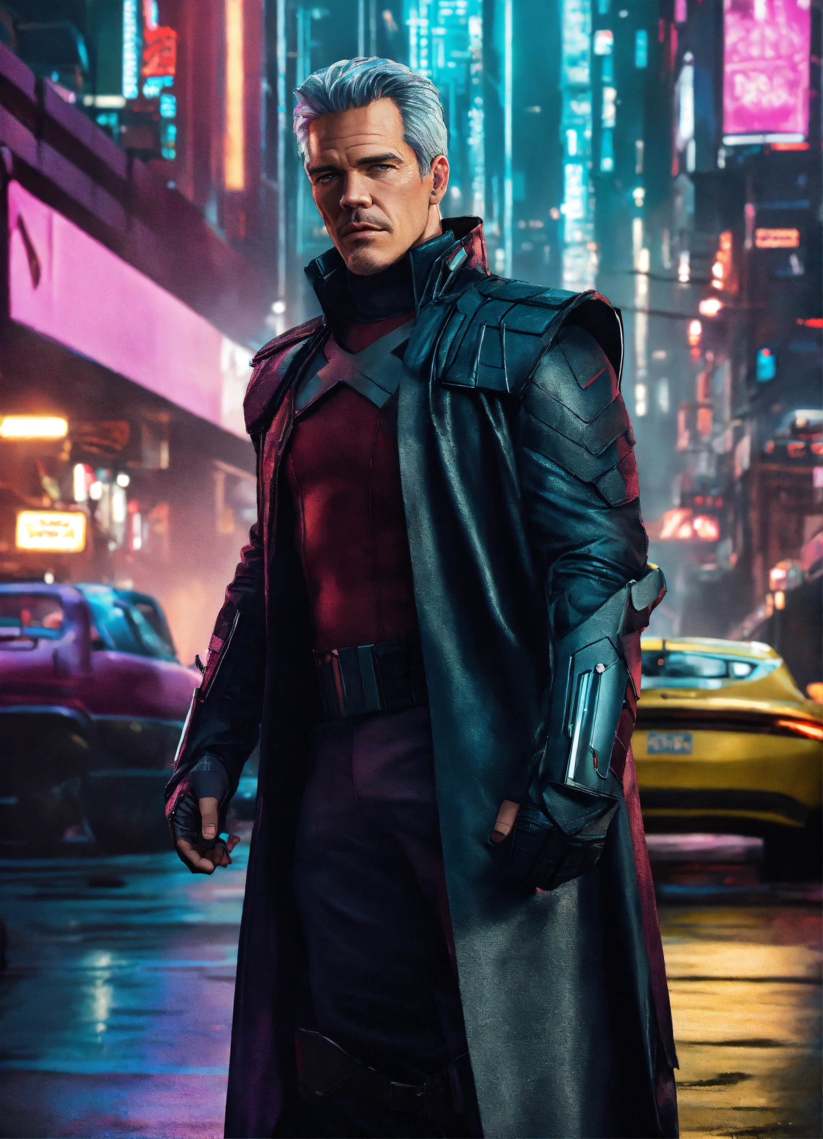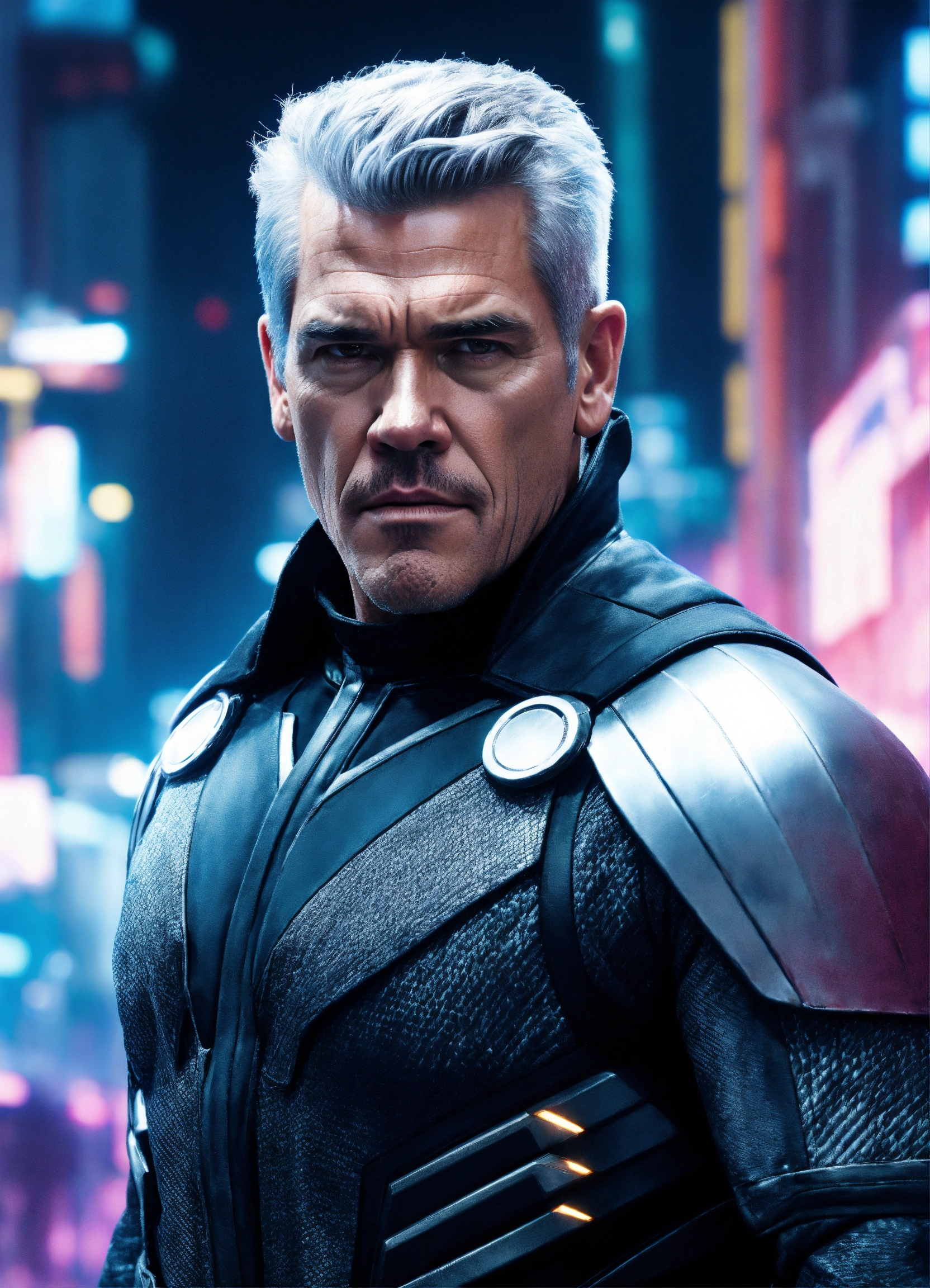 Josh brolin with silver hair, is dressed like magneto, of x-men, in a cyberpunk metropolis, 8k resolution, hyper detailed