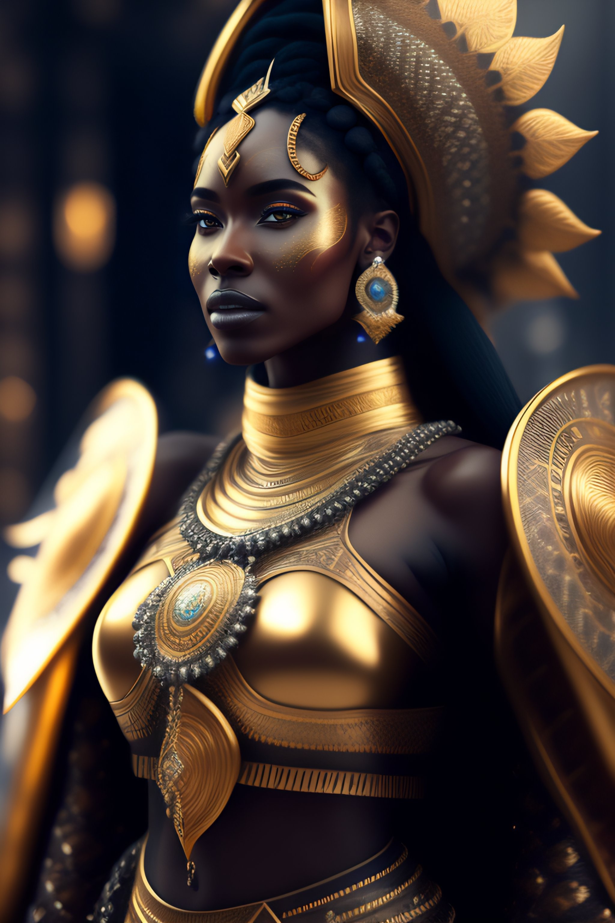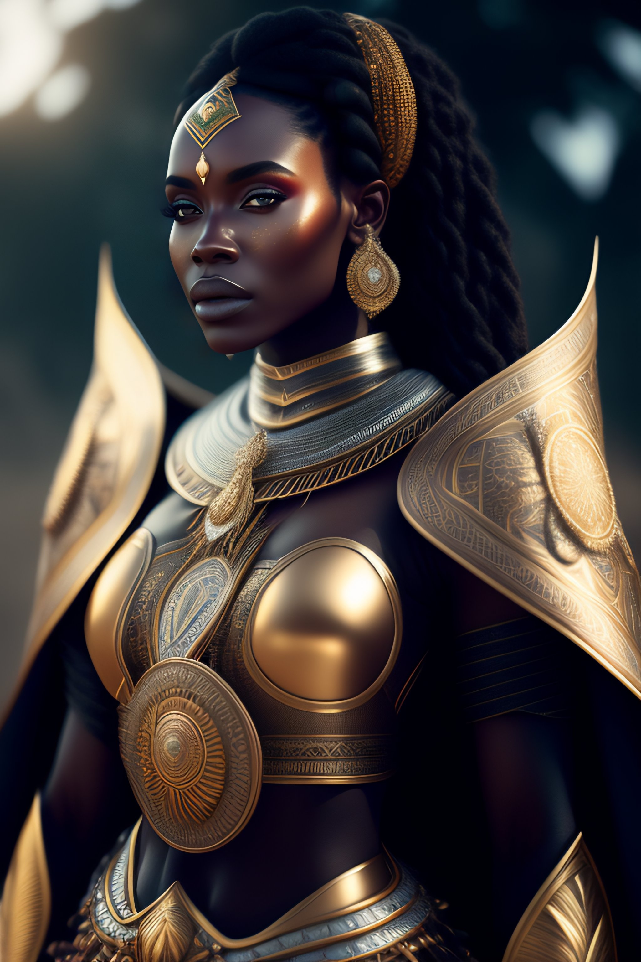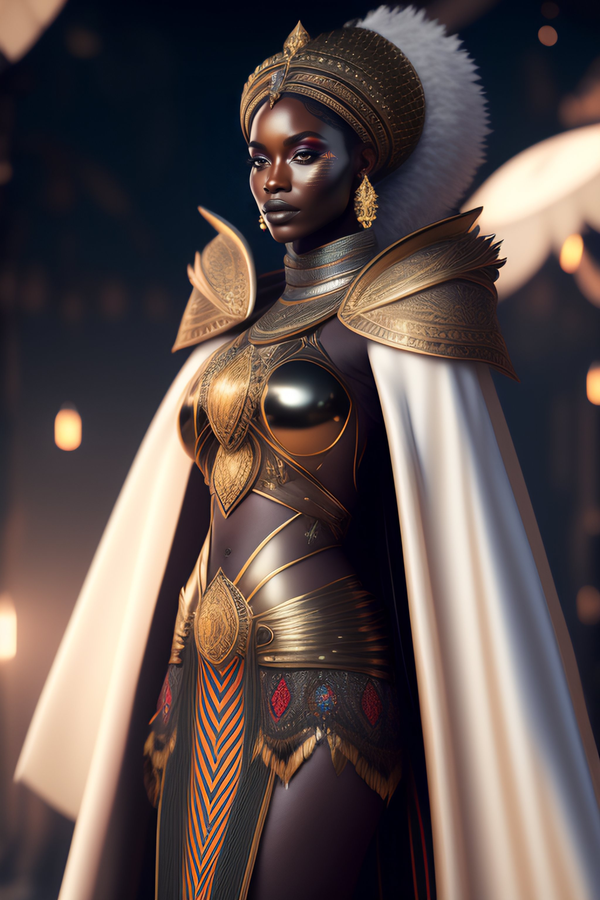Female celestial being, artstation, full body, character concept, intricate african clothing and cape, black and white photography, magical, tribal patterns in armour, sparks, cinematic lighting, cinematic atmosphere, 8 k octane render, unreal engine 5