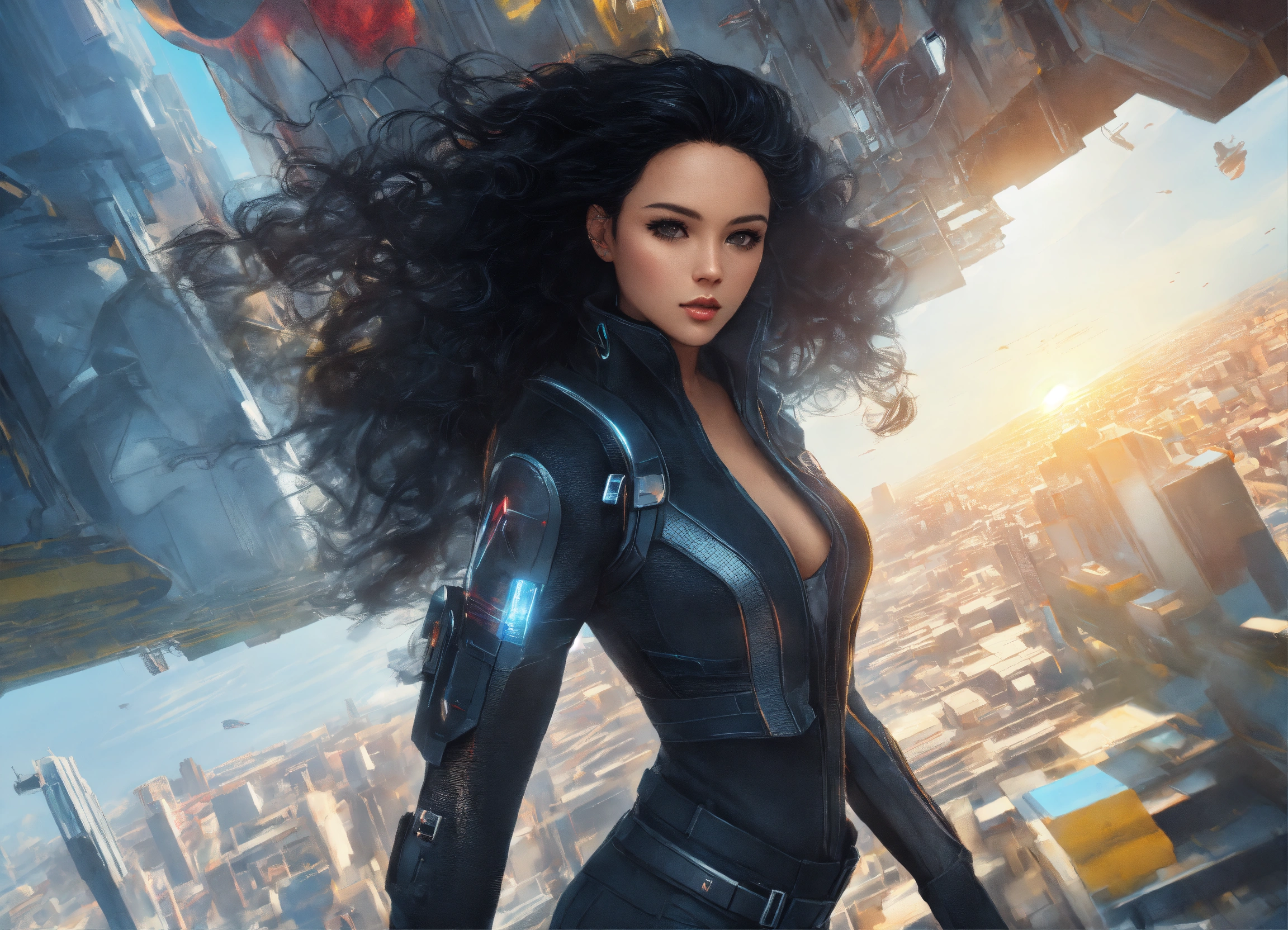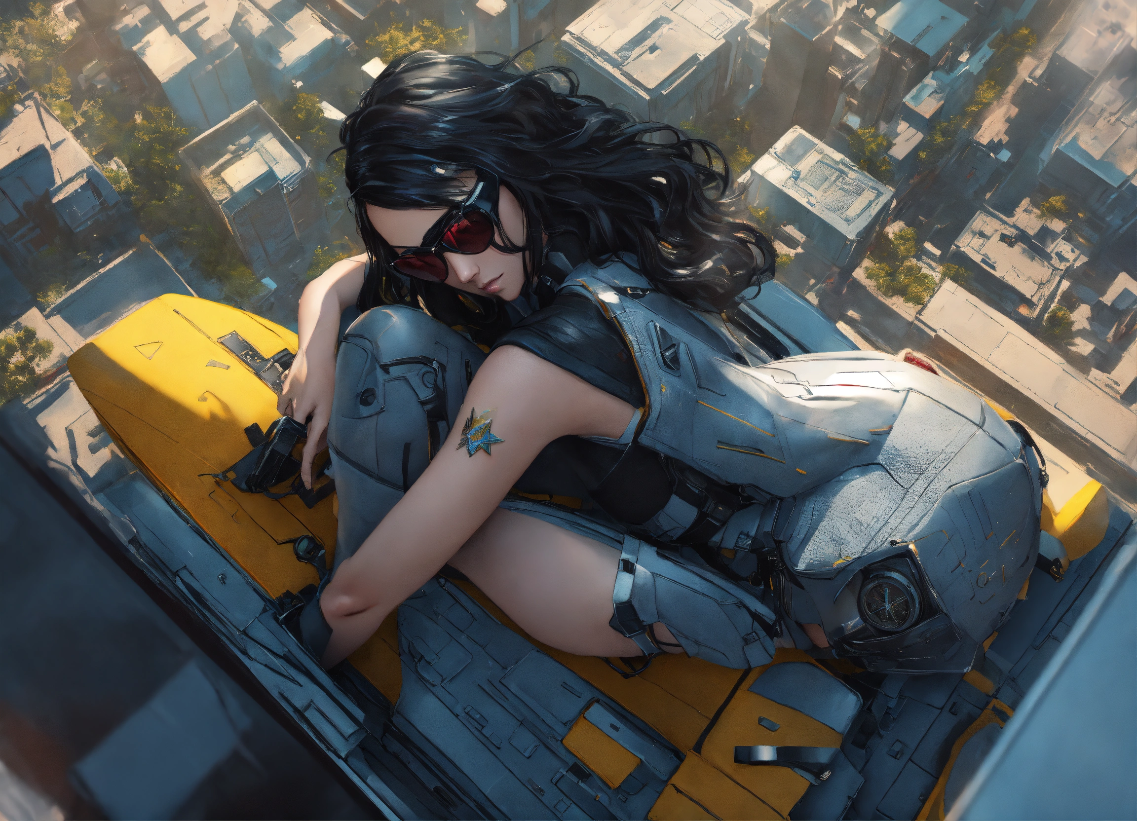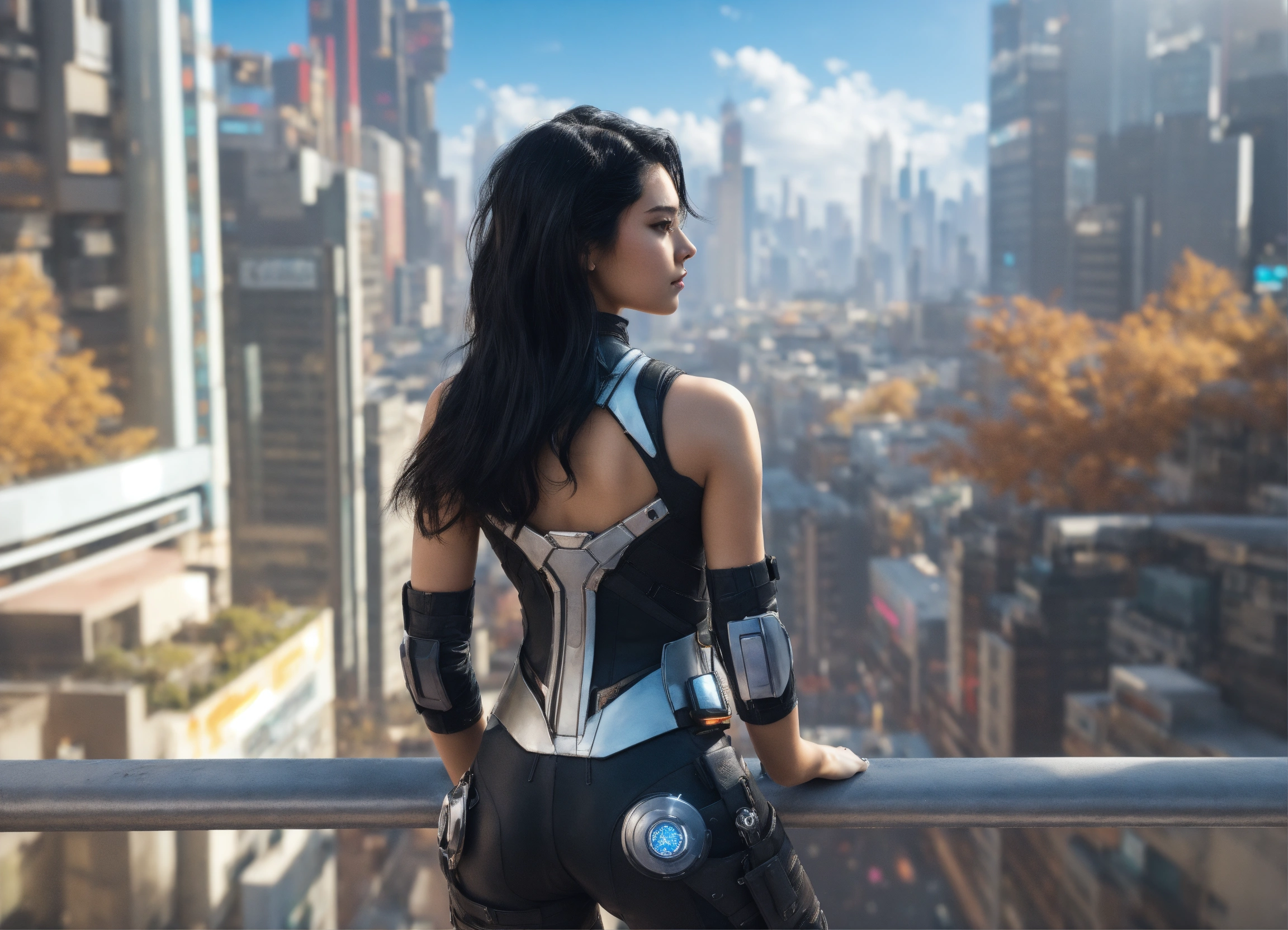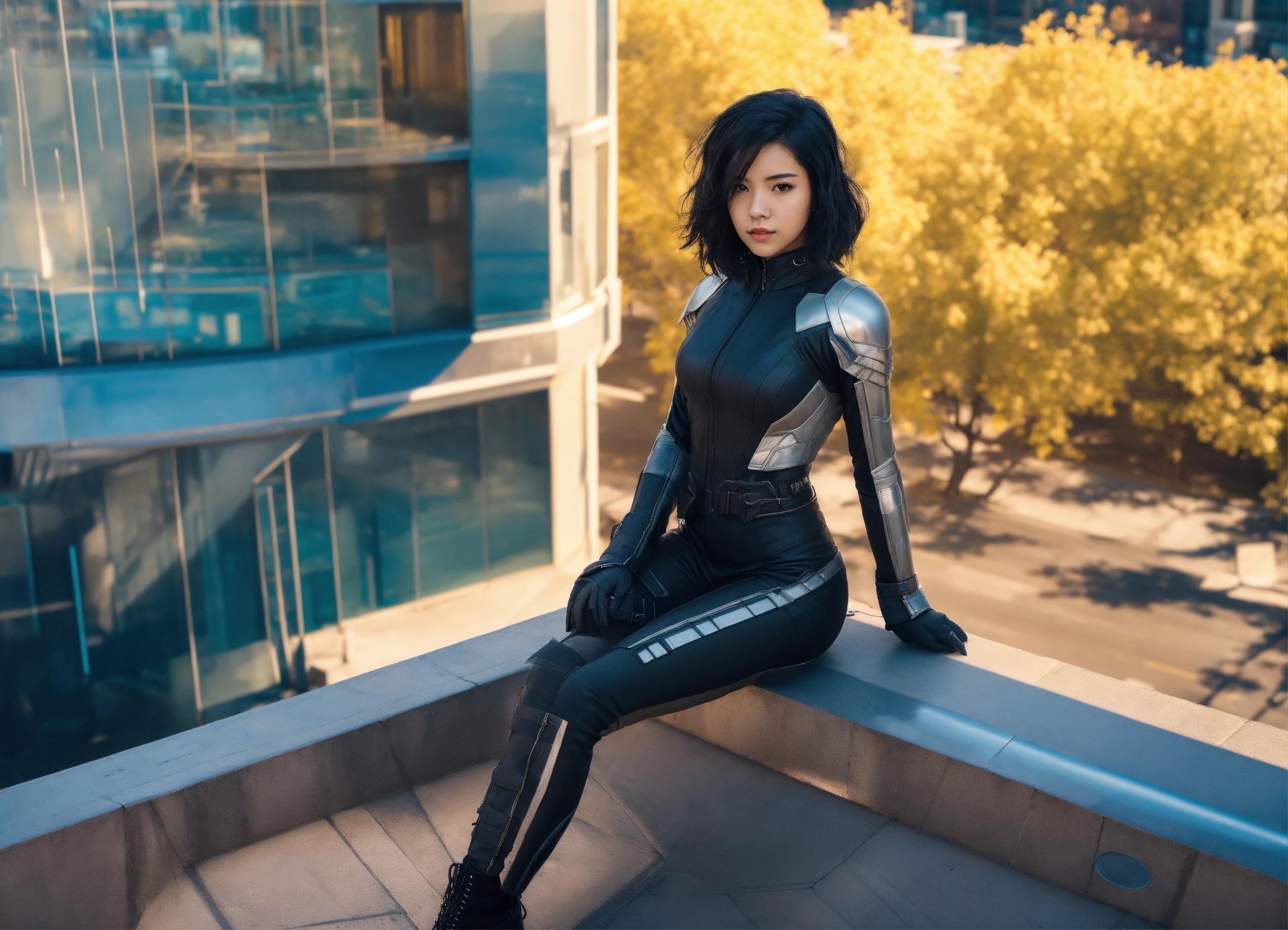 Top view full body high detailed photo realistic natural photo cyberpunk dream girl, futuristic, sunny weather. x-men black hair silver