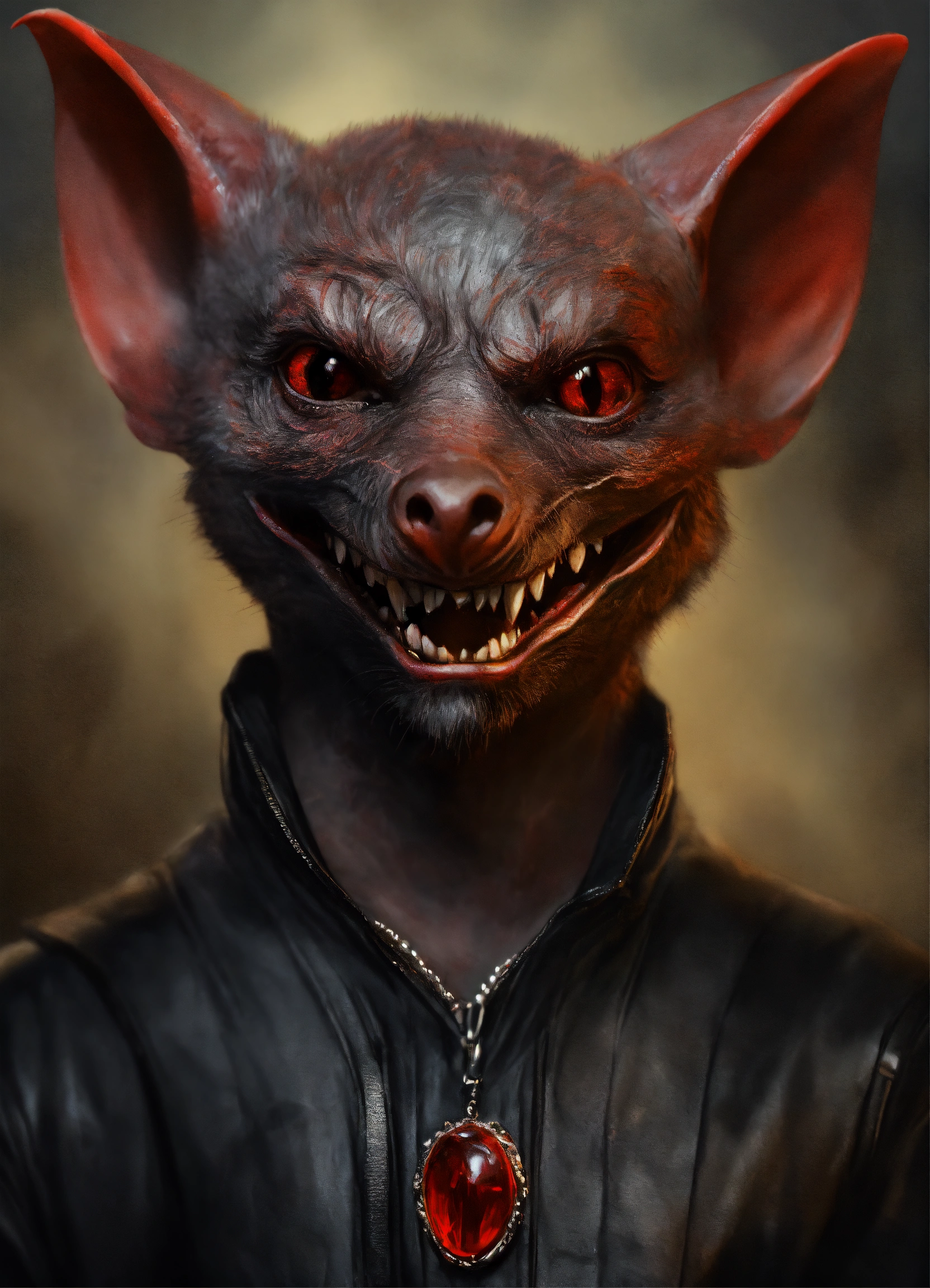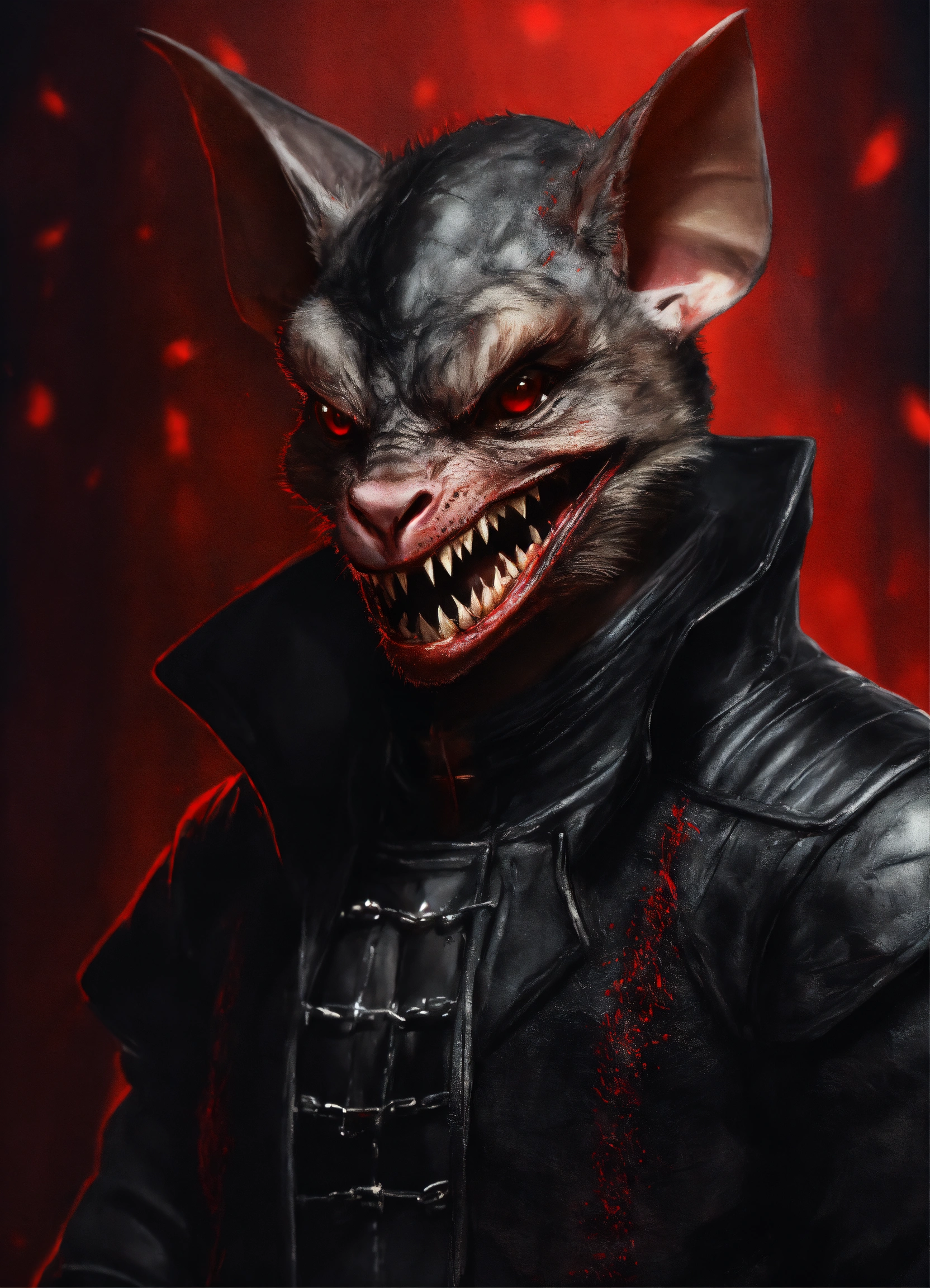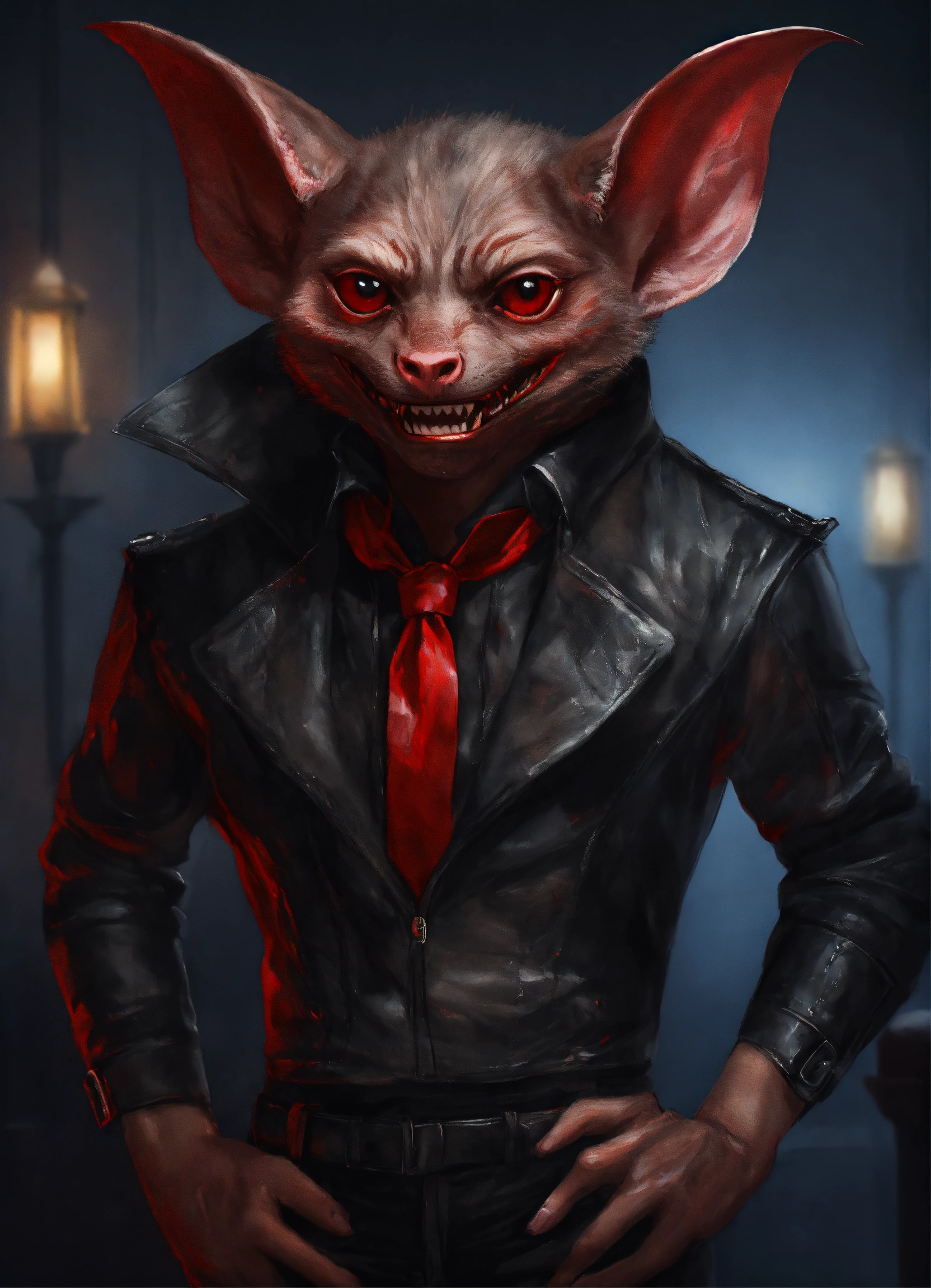 Realistic drawing a full body portrait of a vampire bat-human hybrid, with red reptilian eyes. feline smile. wearing a black leather outfit.