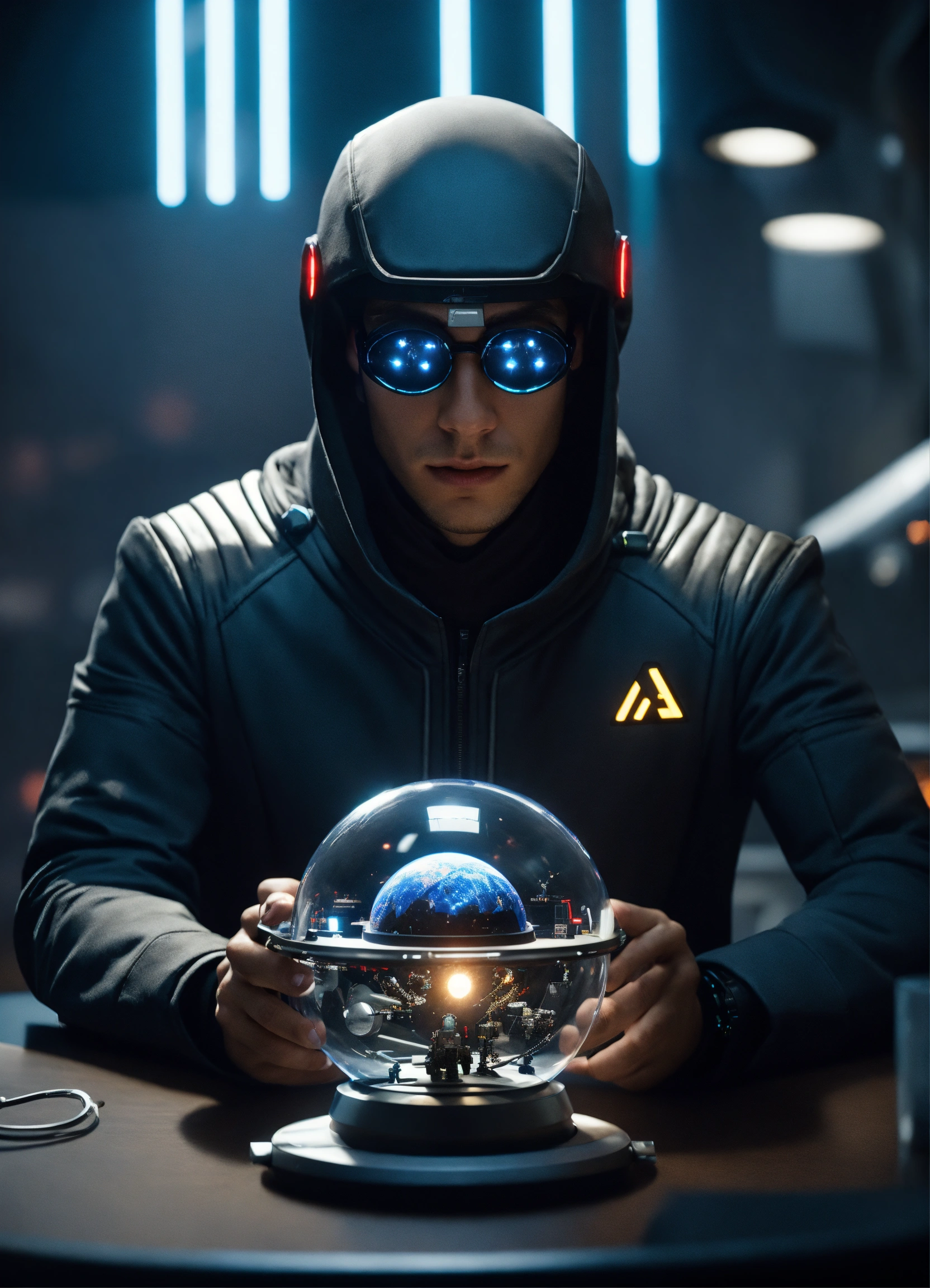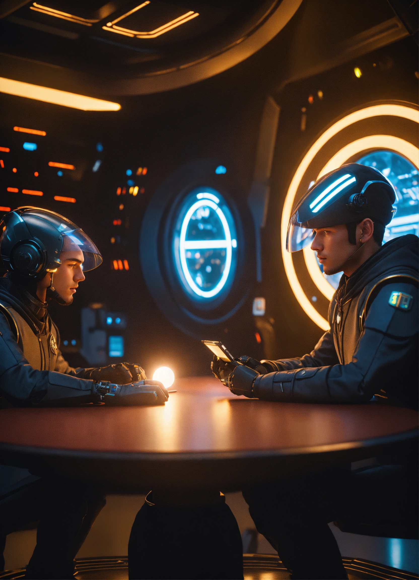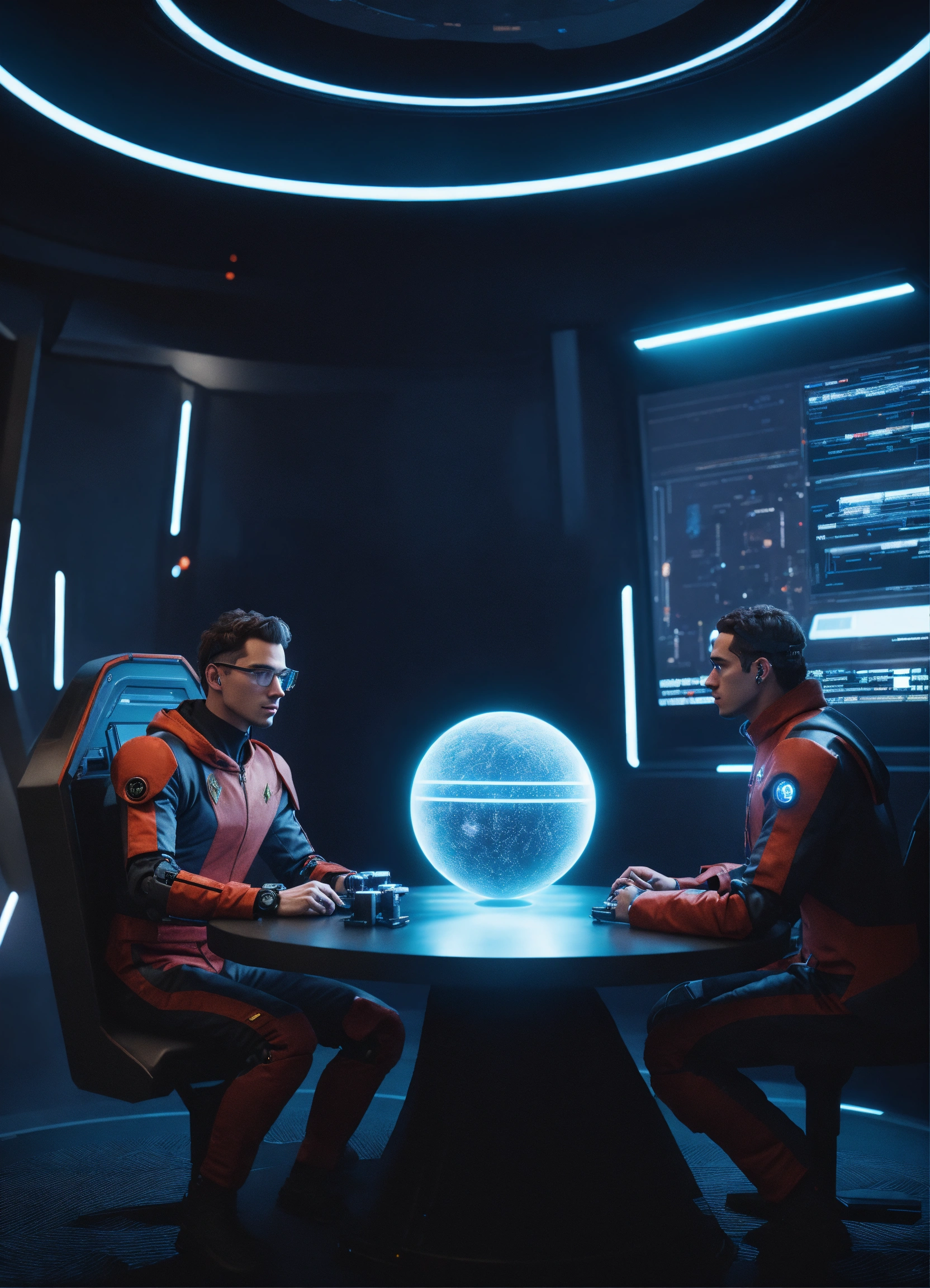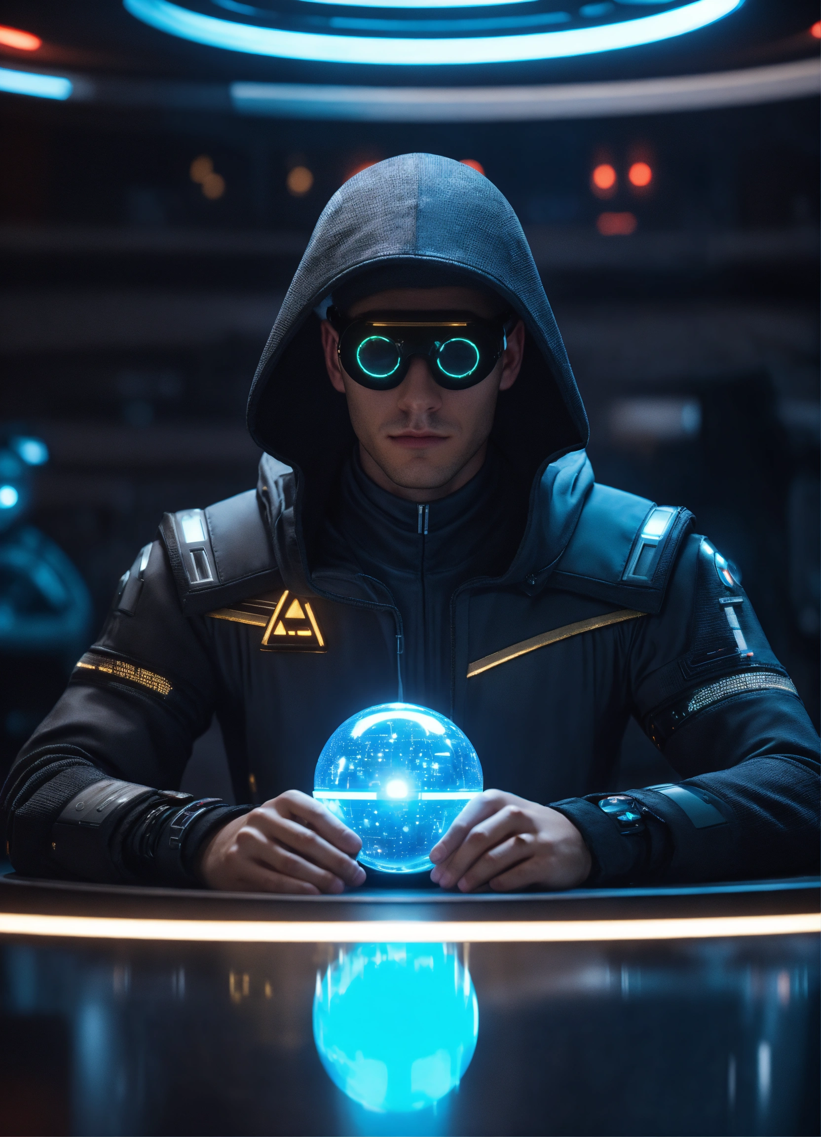 Nerdy 25 year old male cyborg hacker wearing futuristic clothing, hi-tech visor, hooded cloak, sitting at a round dining table with 2 starfleet officers, examining a black robotic orb on a dark space craft. 8k, realistic. unreal engine, pixar