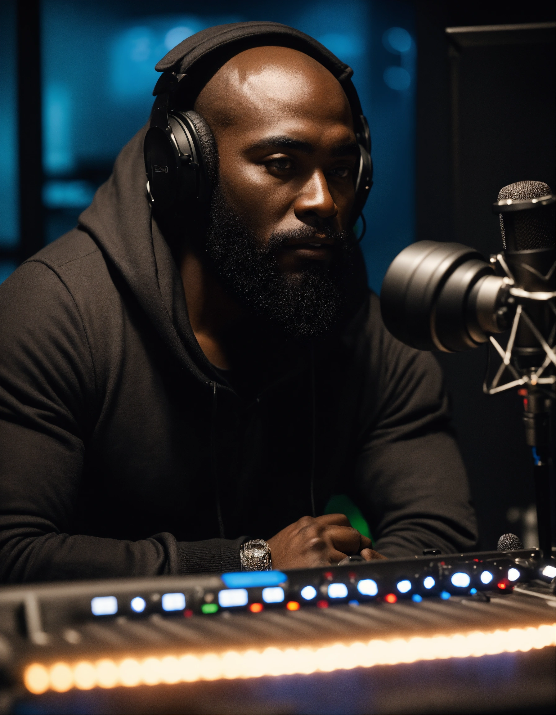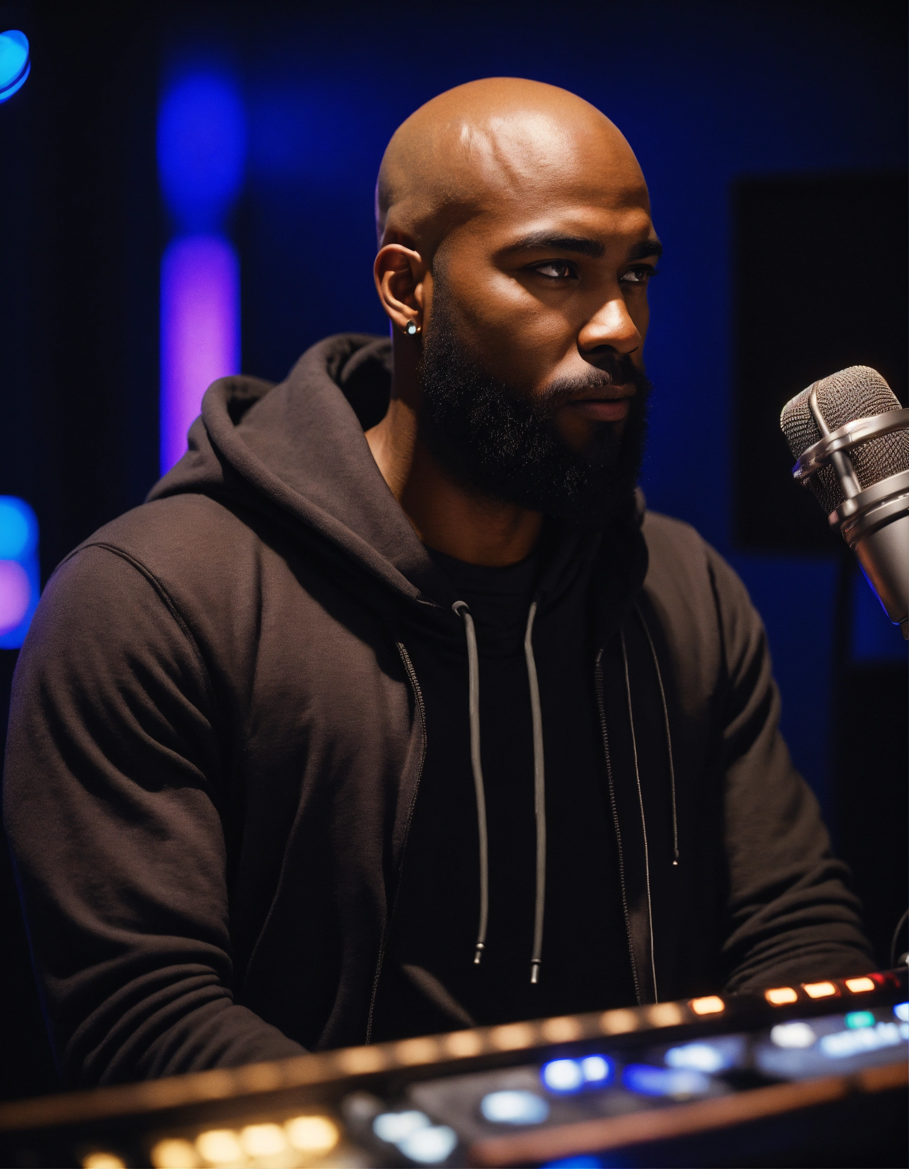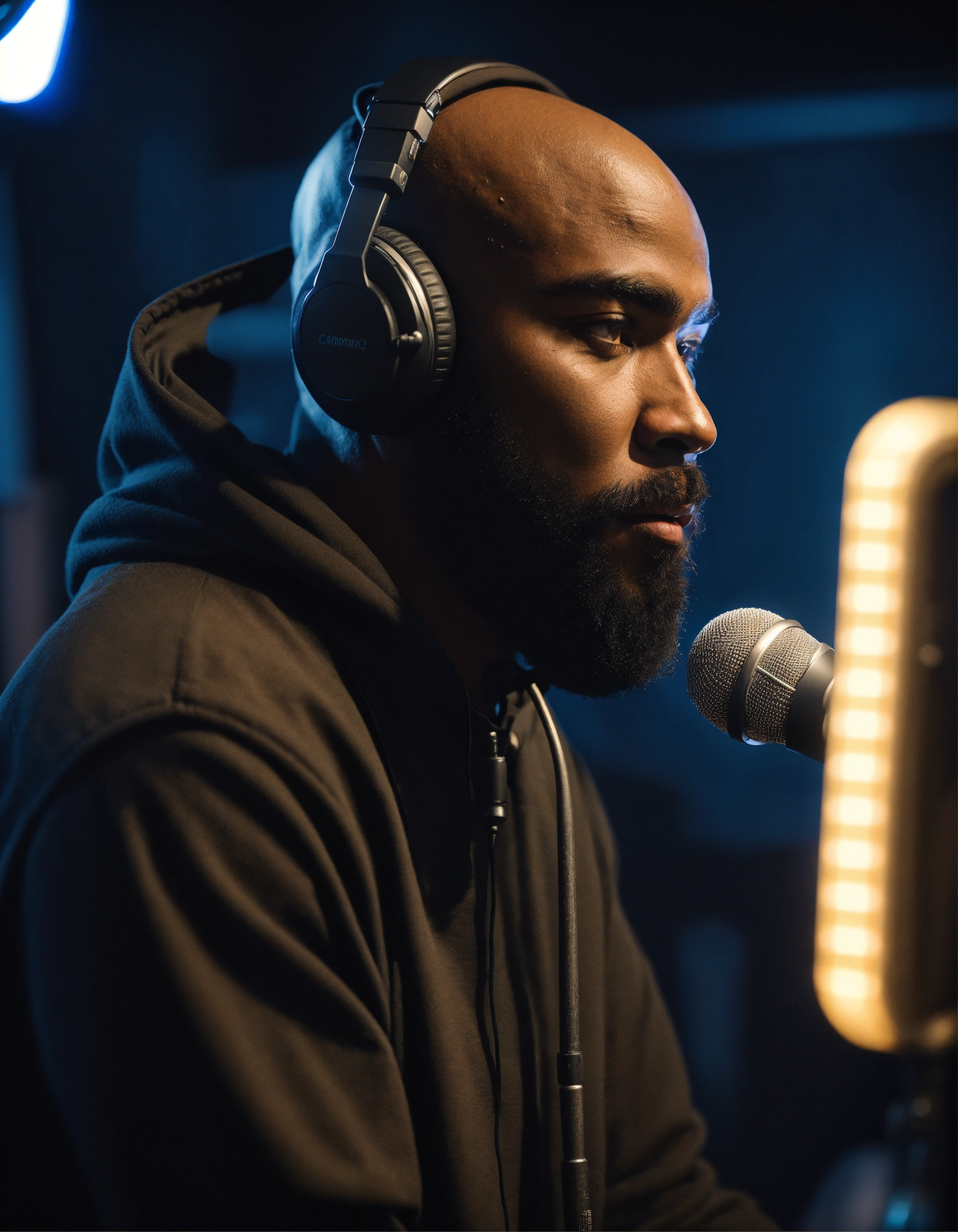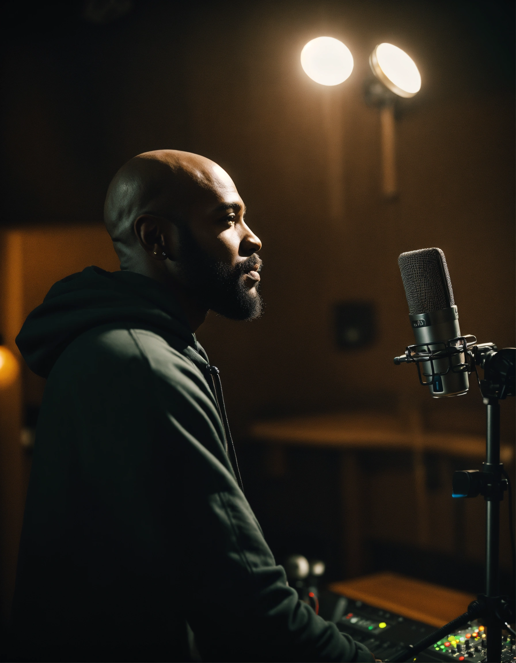 Dimmed fancy recording studio, bald dark skin black handsome man with beard, talking into a mic on a mic stand, 8k, he is wearing a black hoody, he's very dark skin, he's facing the camera in a front profile, his eyes at looking right into the camera, very real, actual human photo, very detailed, 8k, everything looks like a real photo, cinematic lighting.