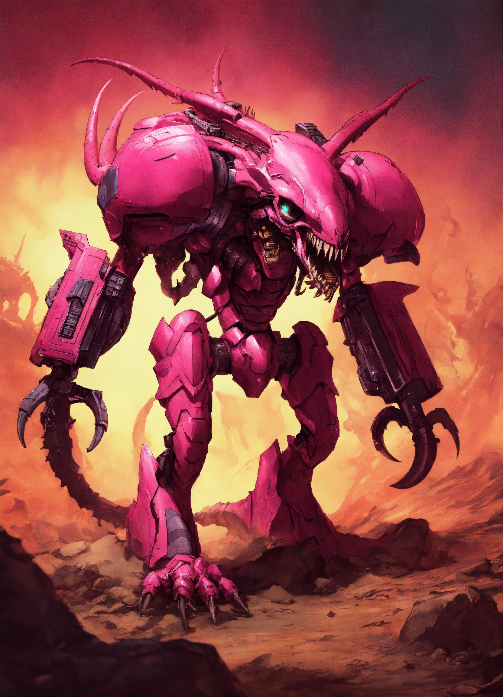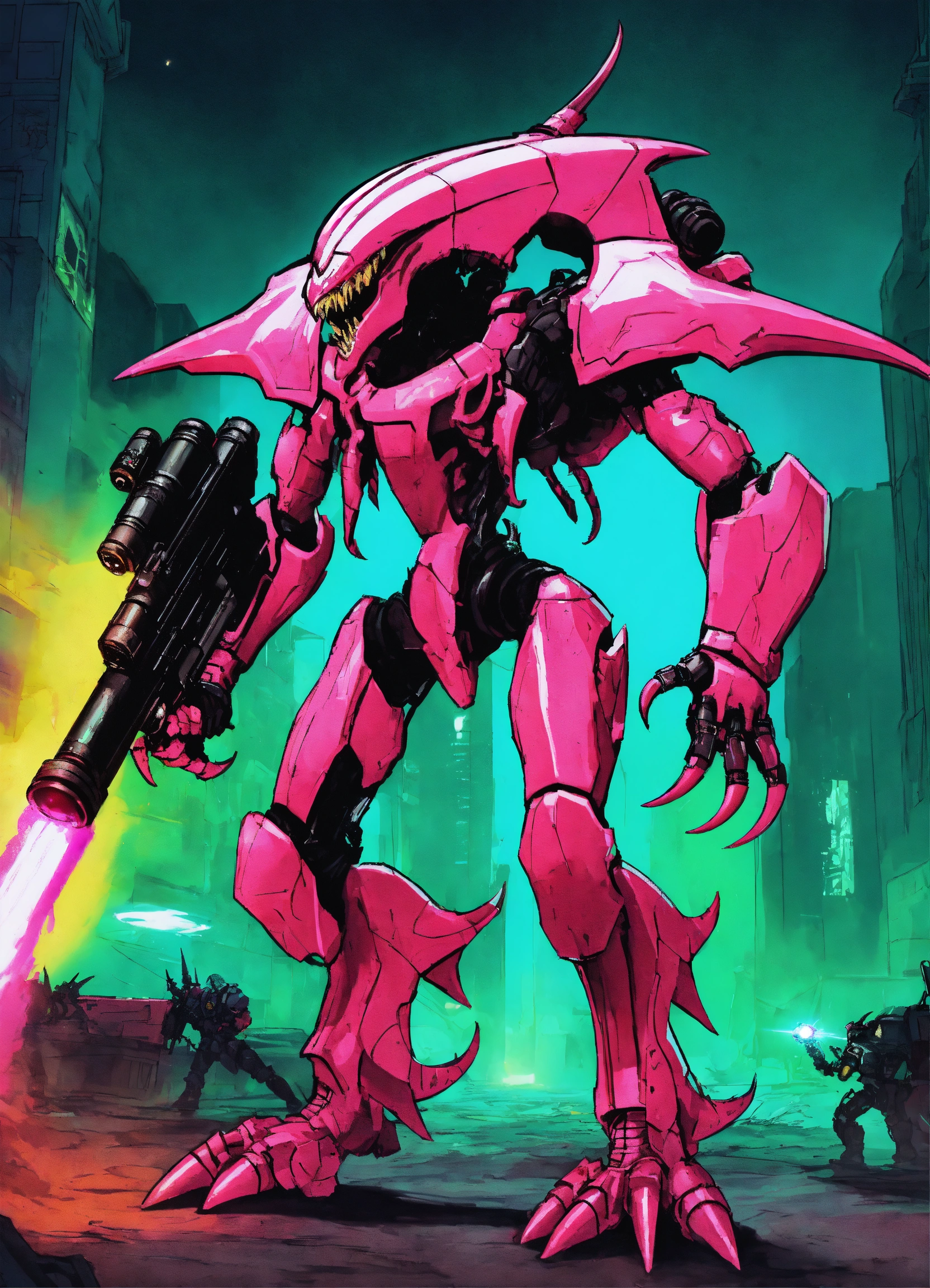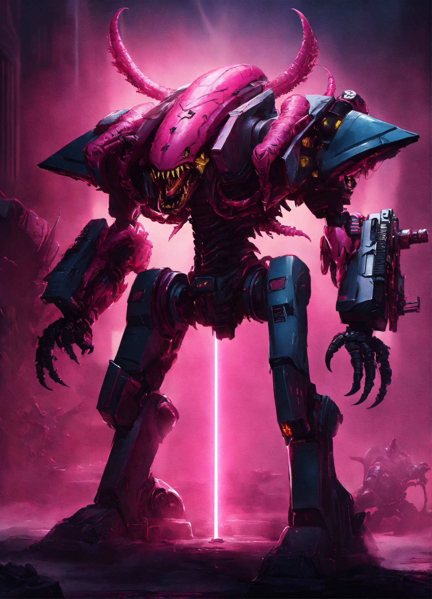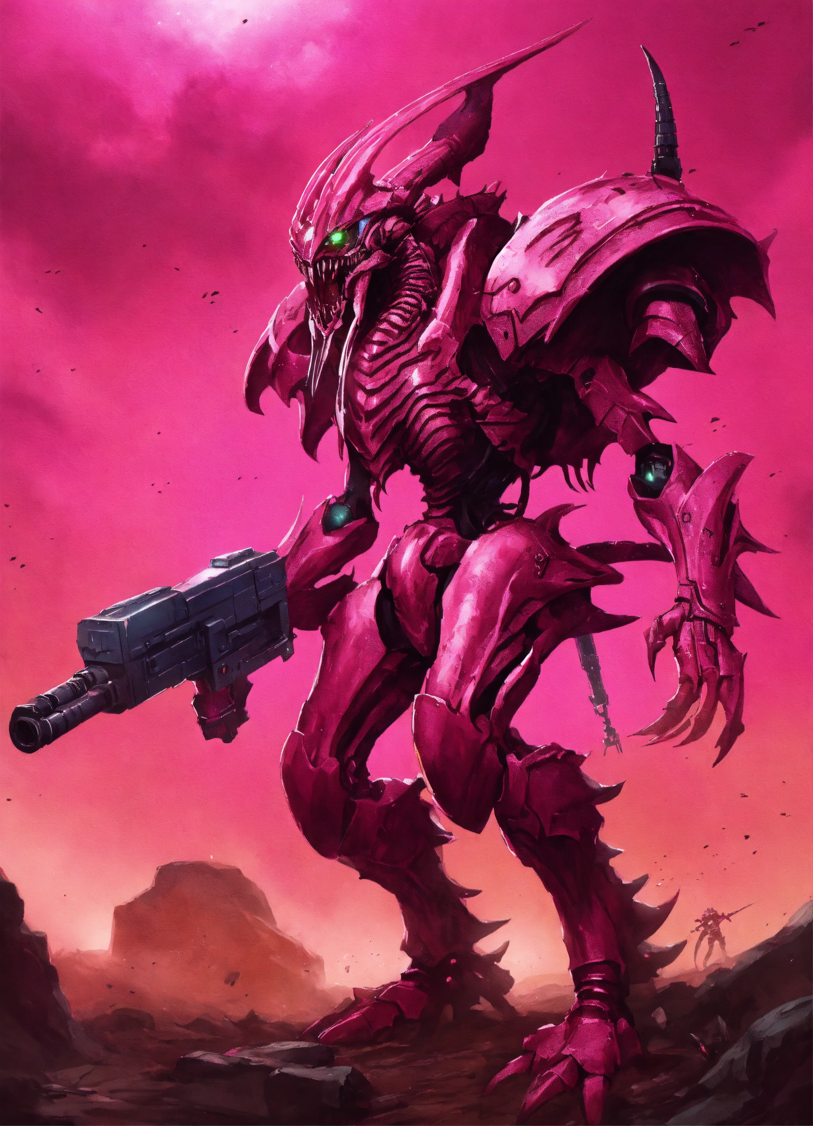 An illustration of an pink tyranid from warhammer 40k, it has 4 arms and a laser cannon in a comic-book style with volumetric lighting. evil, alien, sci-fi guns, weaponry, cybernetic, advanced, apocalyptic.
