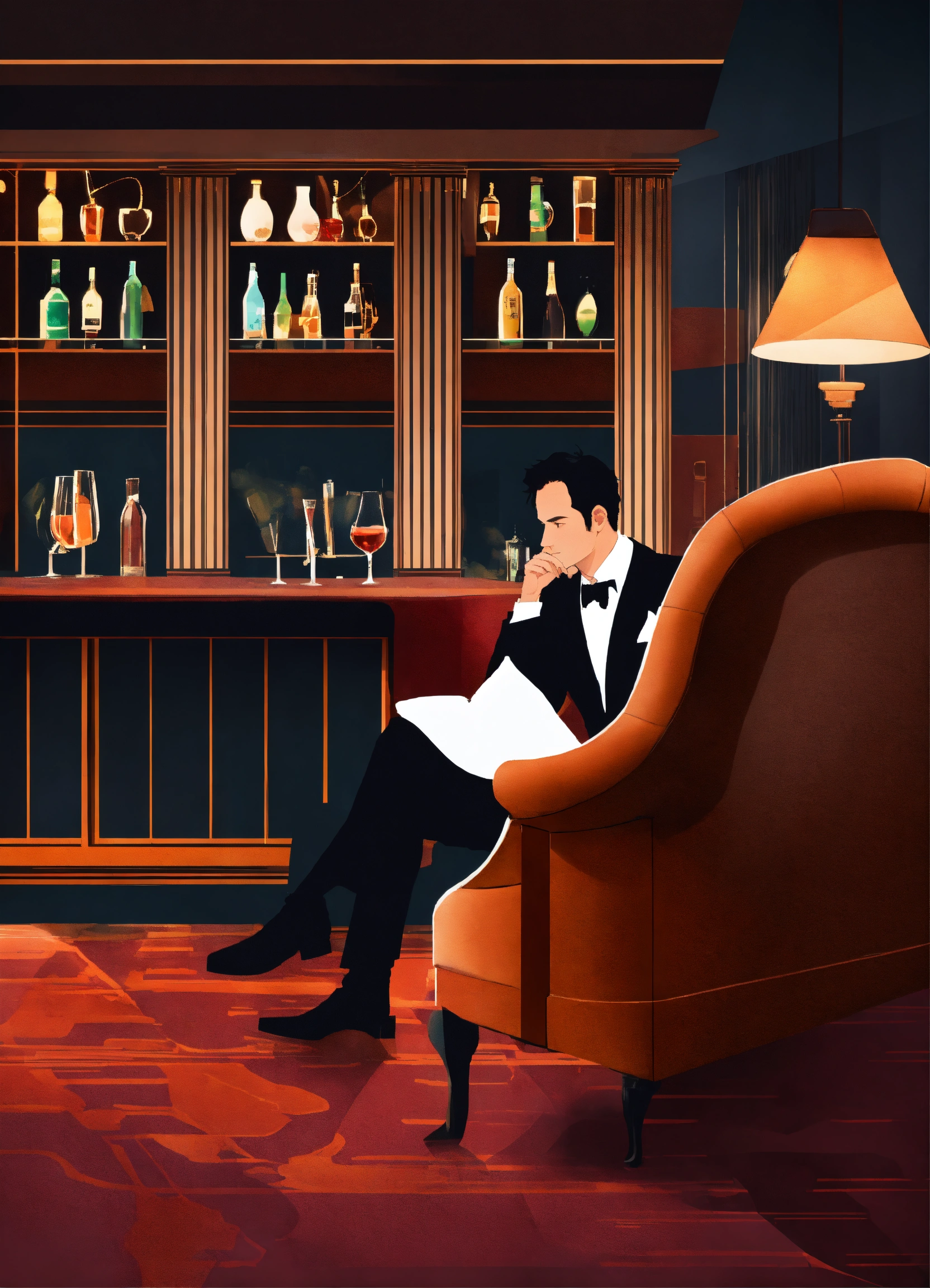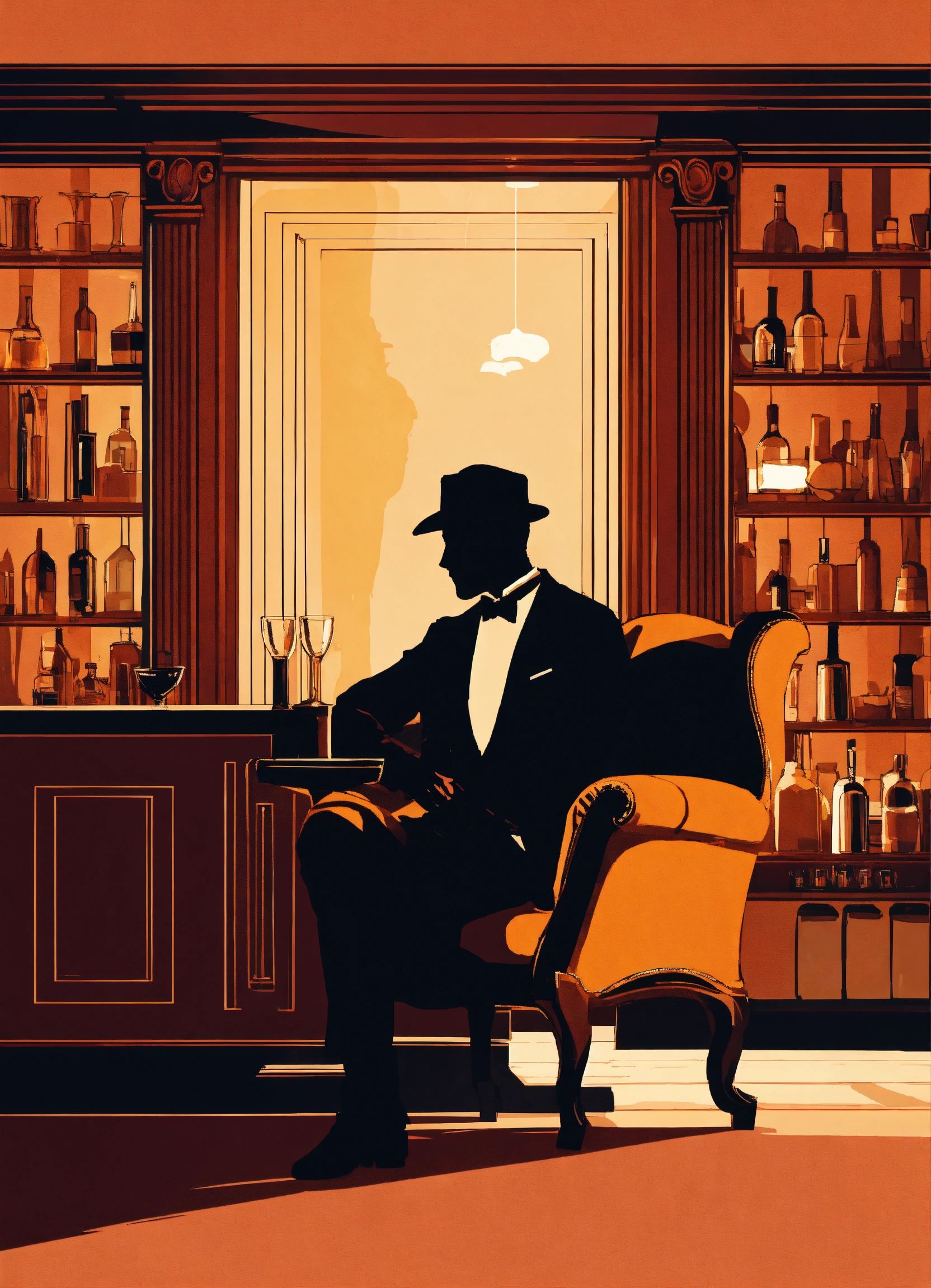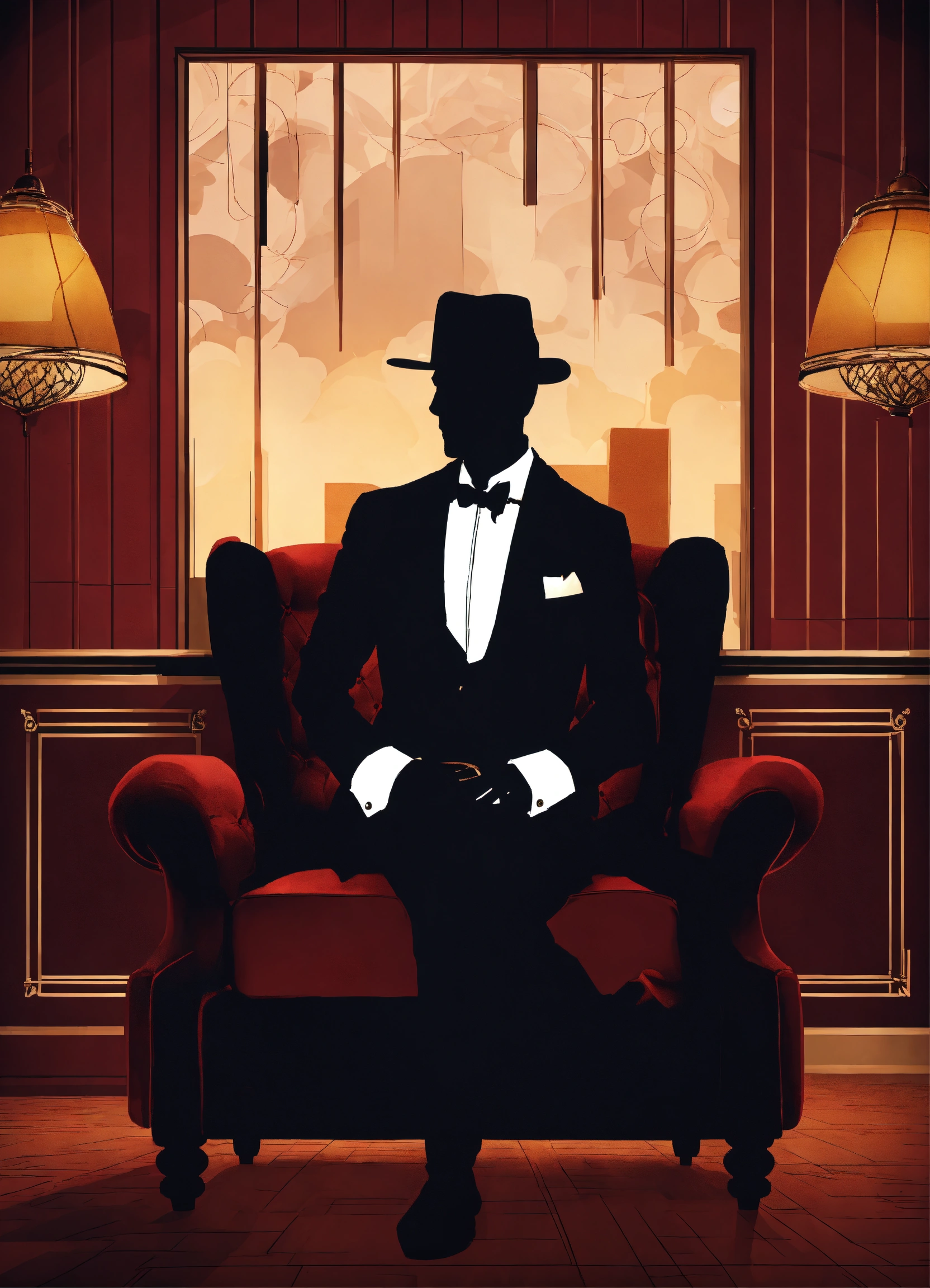 Smart and cosy bar lounge background with the silhouette of a man in tuxedo seating in an armchair