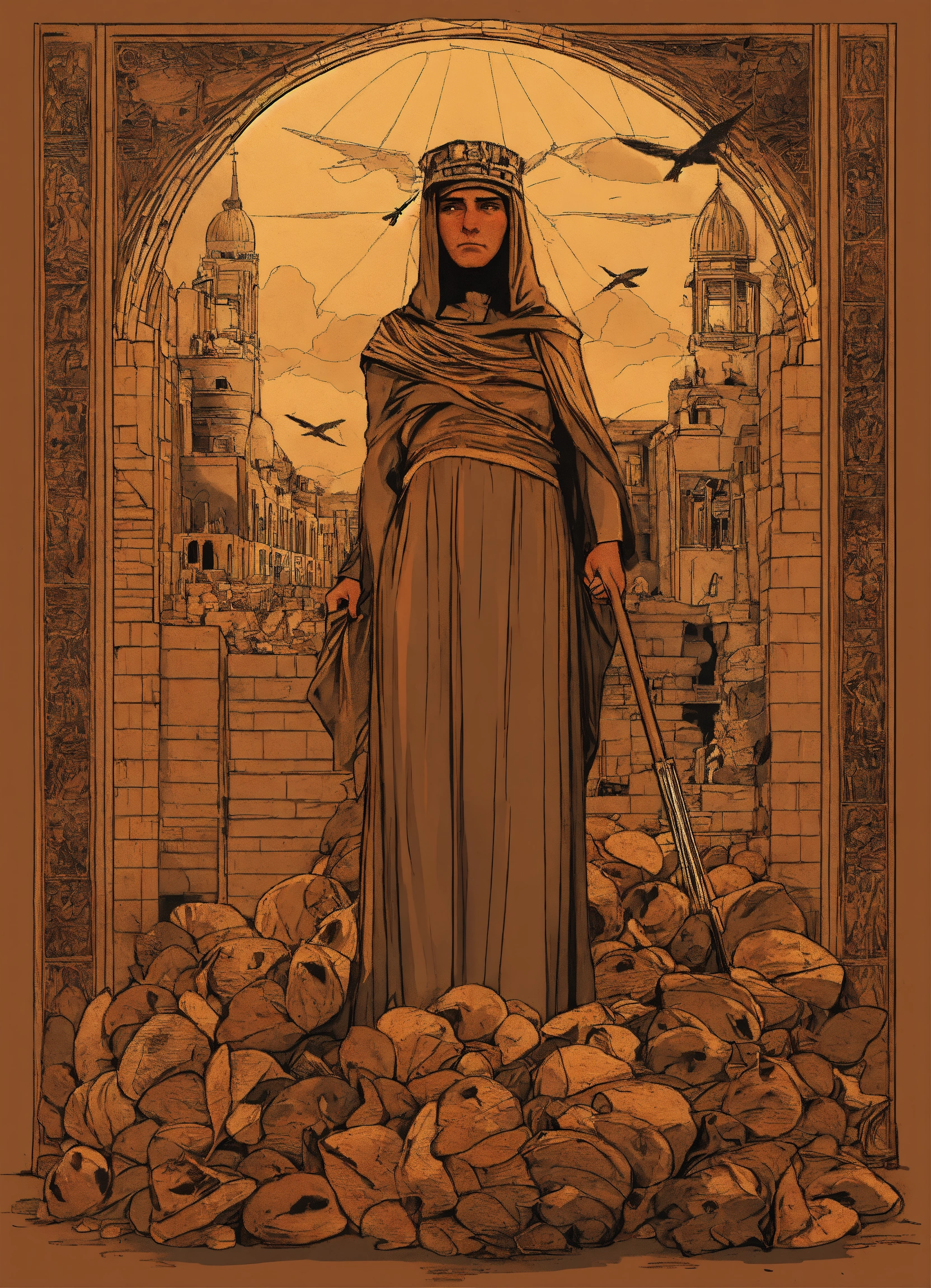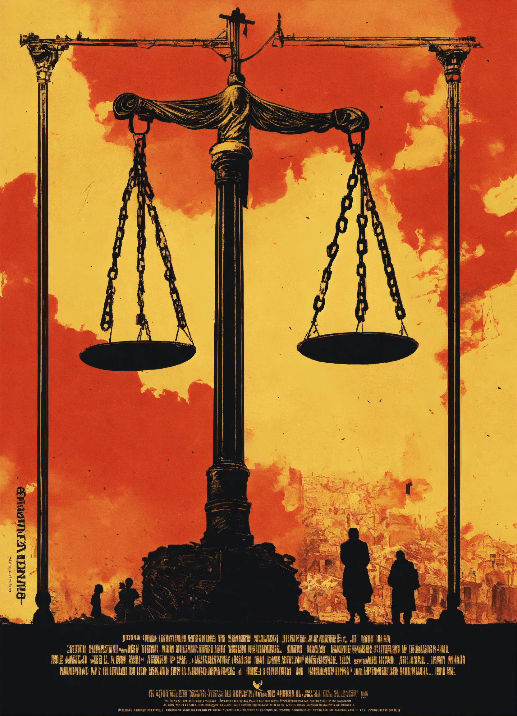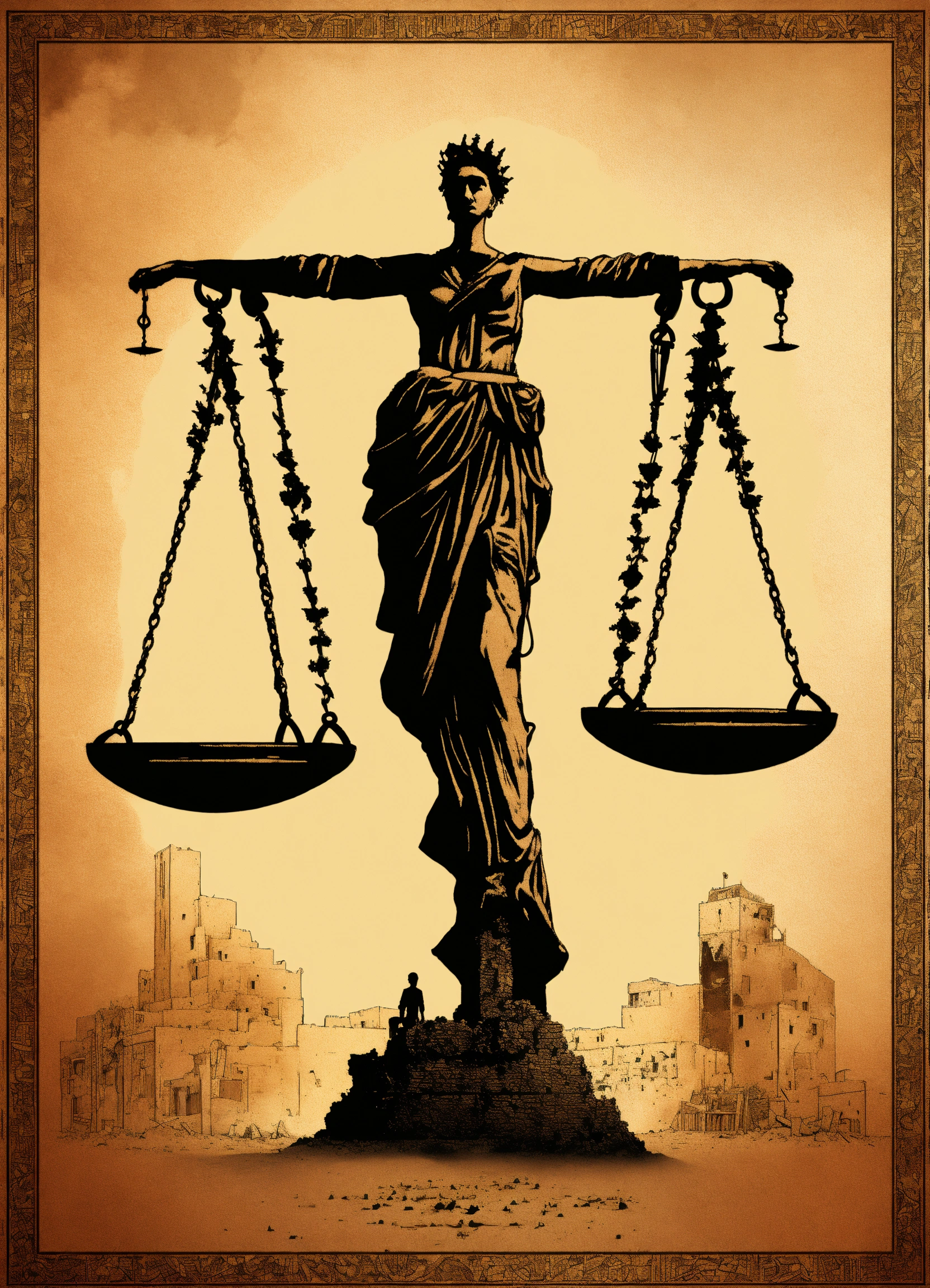 "a design expressing the trial of war criminals who annihilated children and women and committed the most heinous crimes, the design might feature the scales of justice next to shrouds of deceased palestinians due to the bombing and siege of gaza and its starvation by the israelis, "