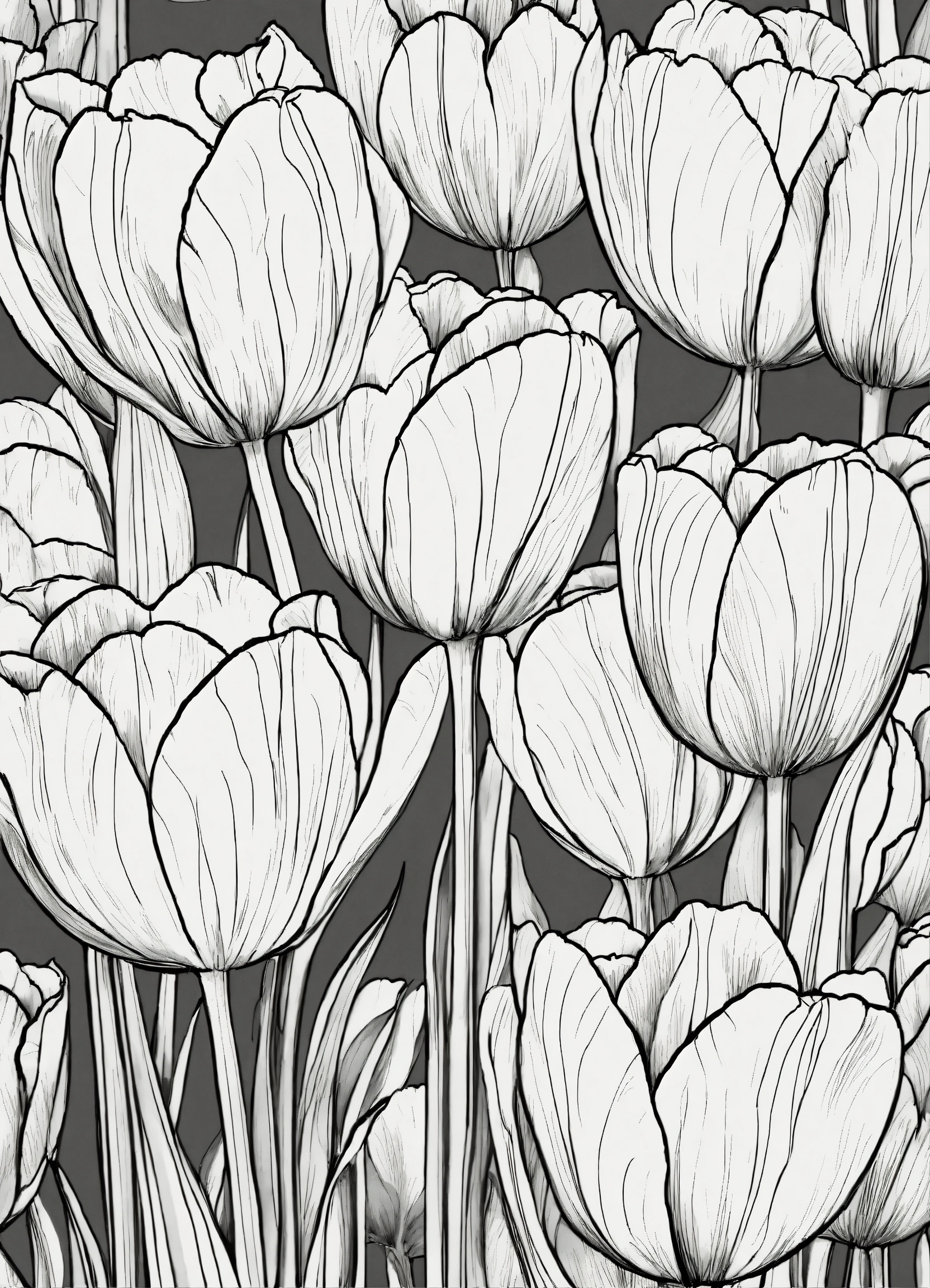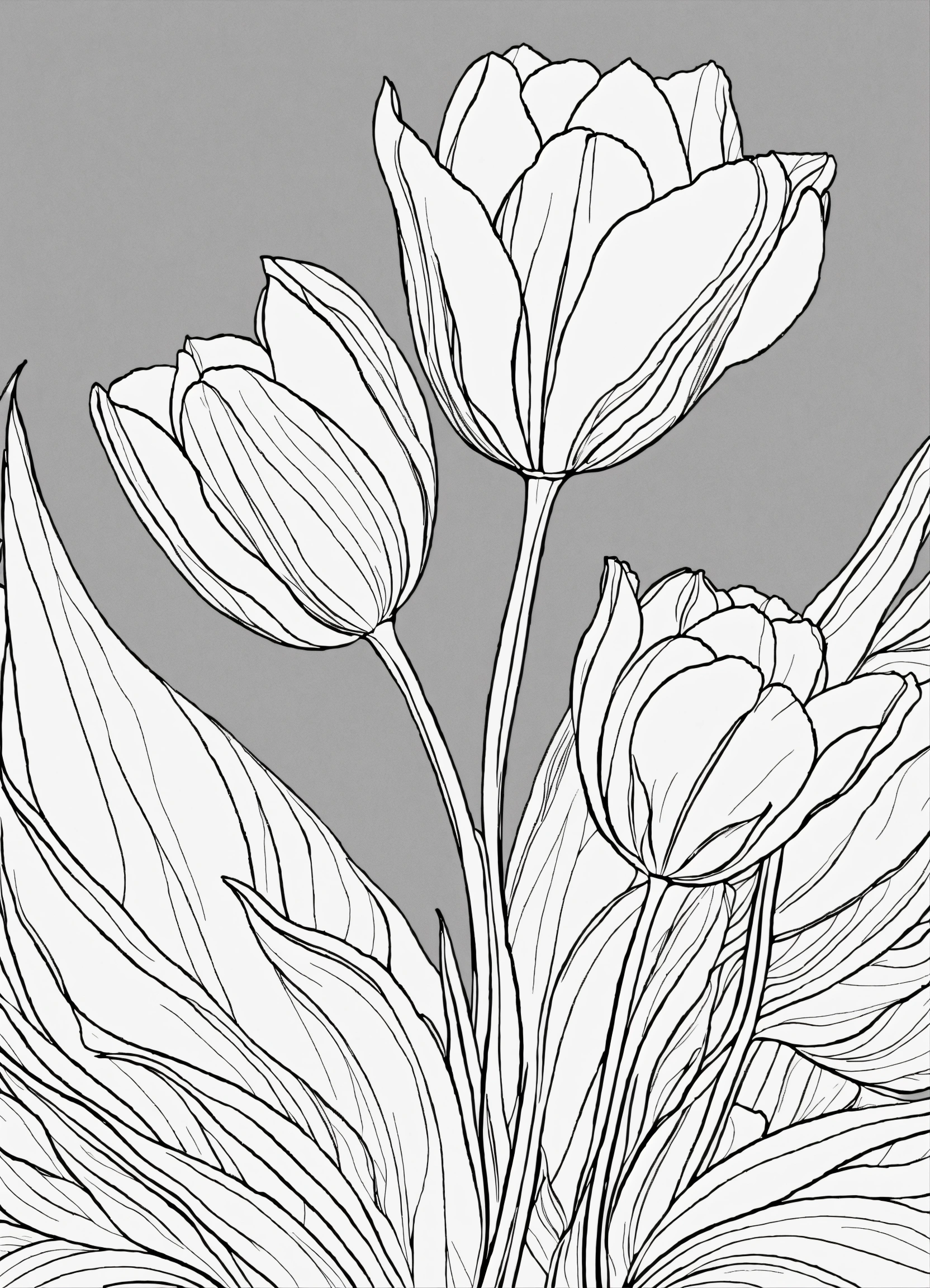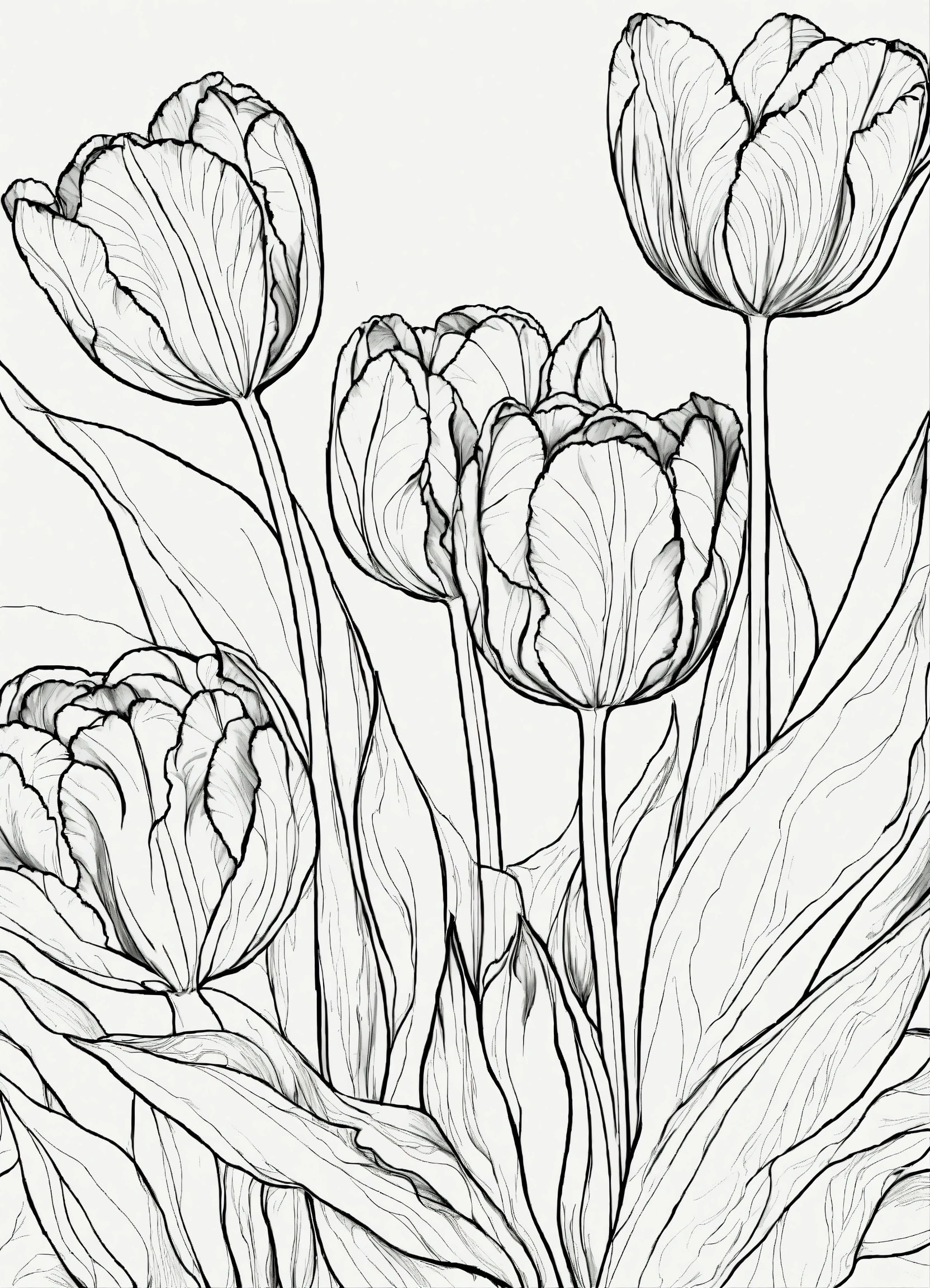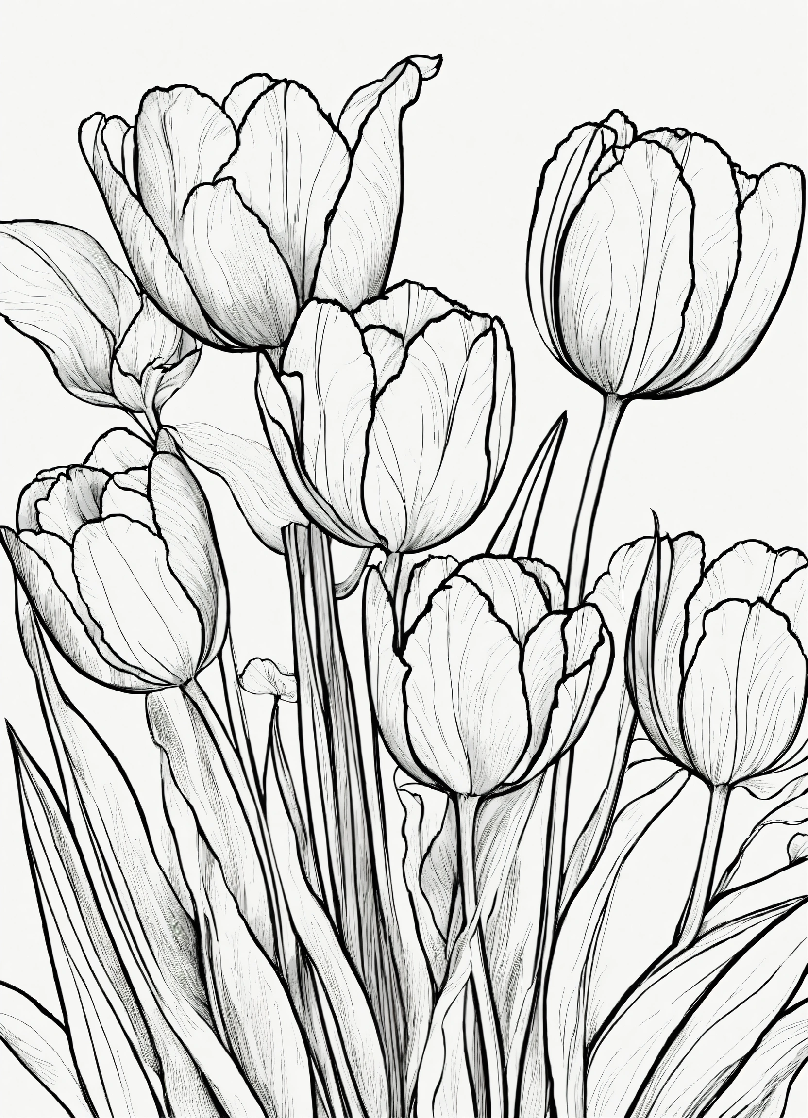 A black and white drawing for a coloring book, black thin lines. white background, the drawing of a beautiful set of tulips