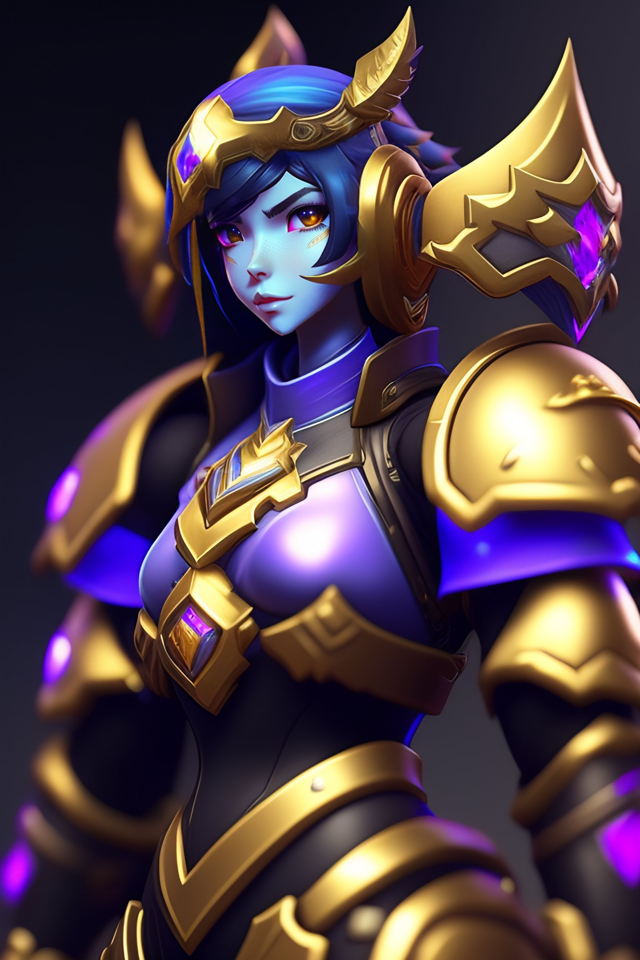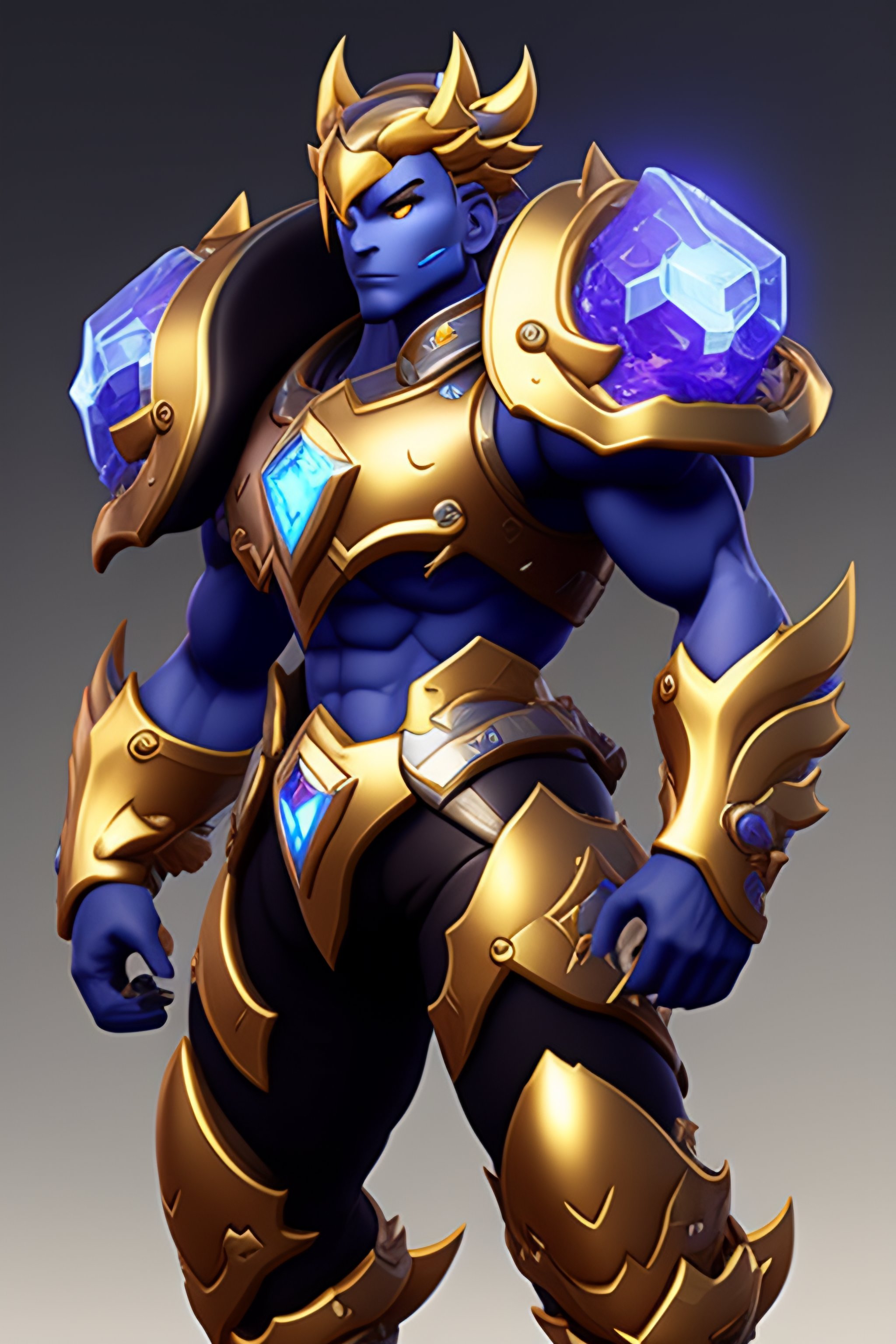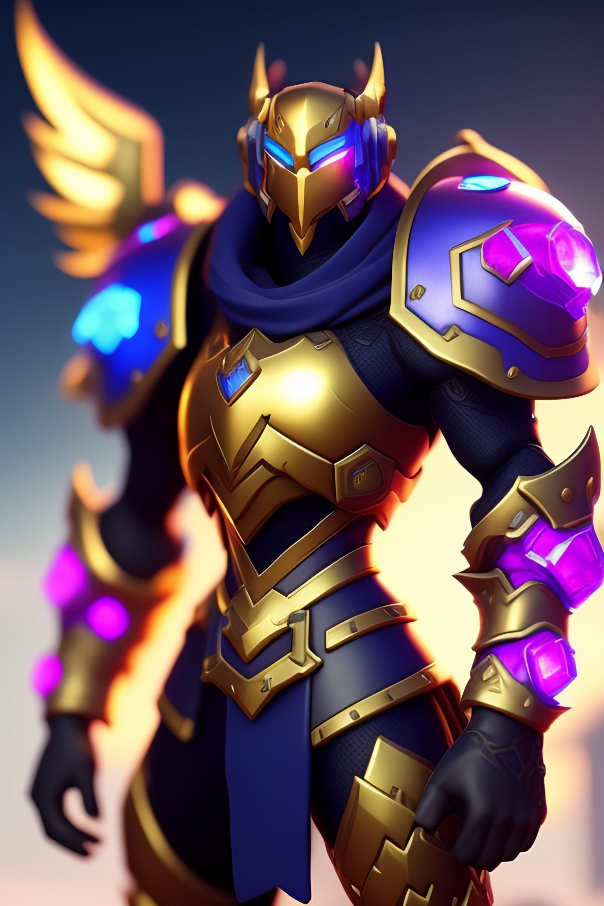 In the style of overwatch, league of legends and fortnite create a paladin armor powered by blue crystal, have golden trim and blue cloth flag