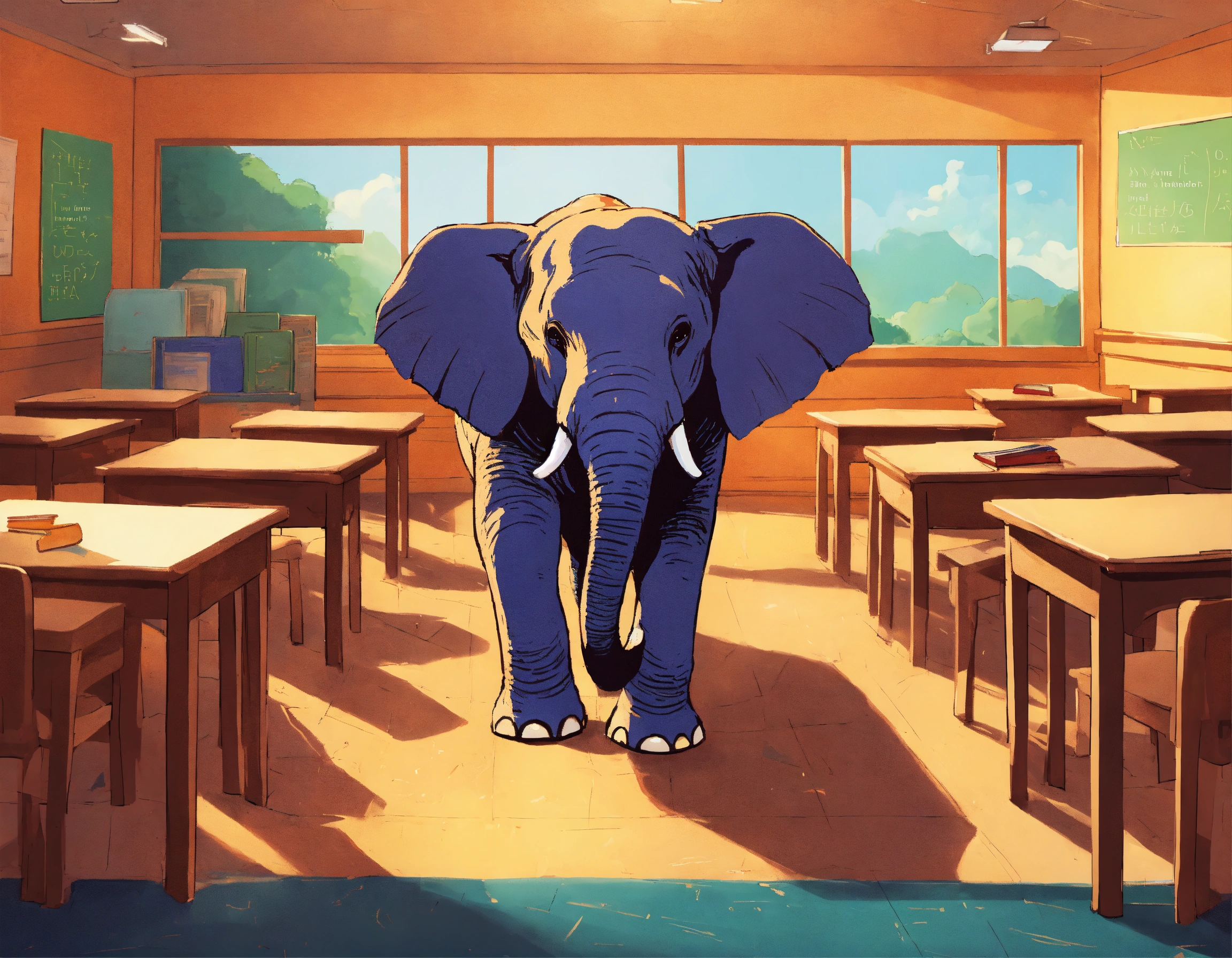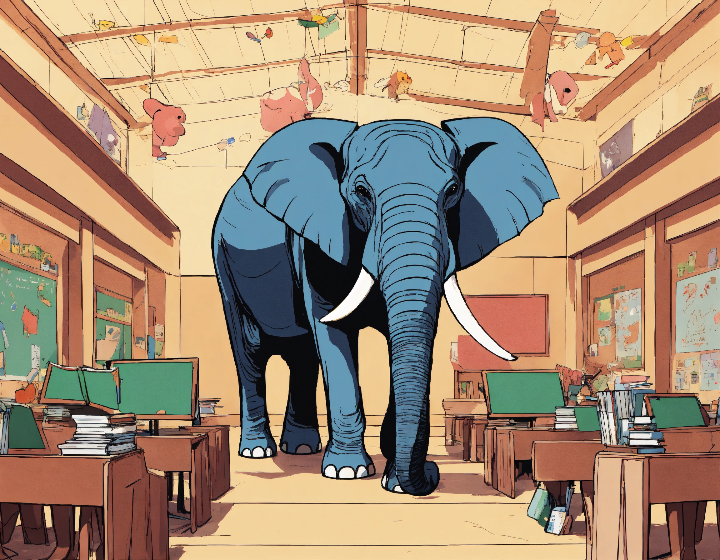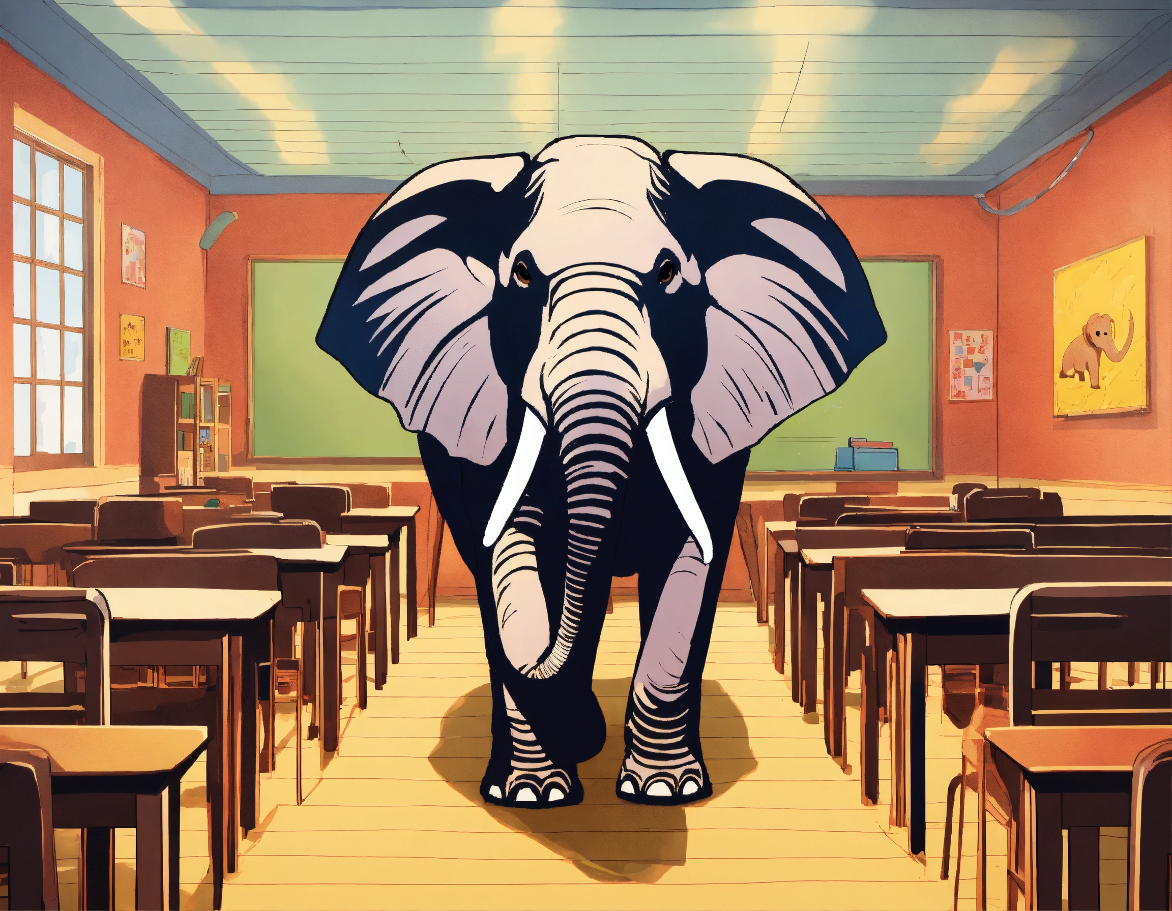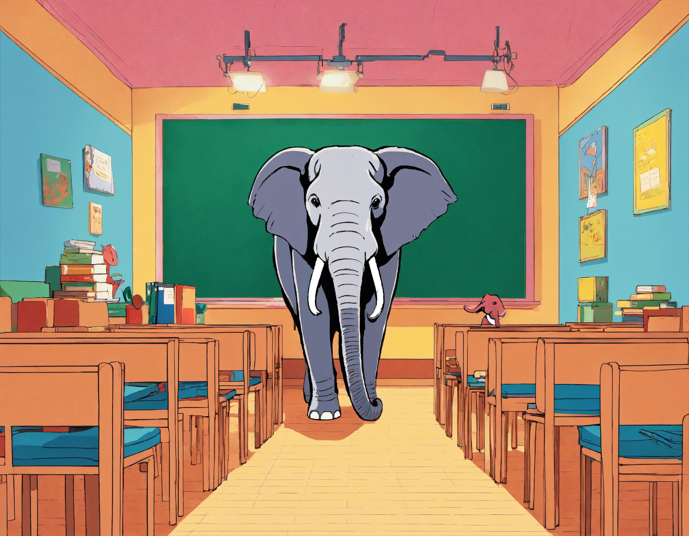 A book cover, illustration, an elephant stands in the center of a classroom, it occupies a lot of the space