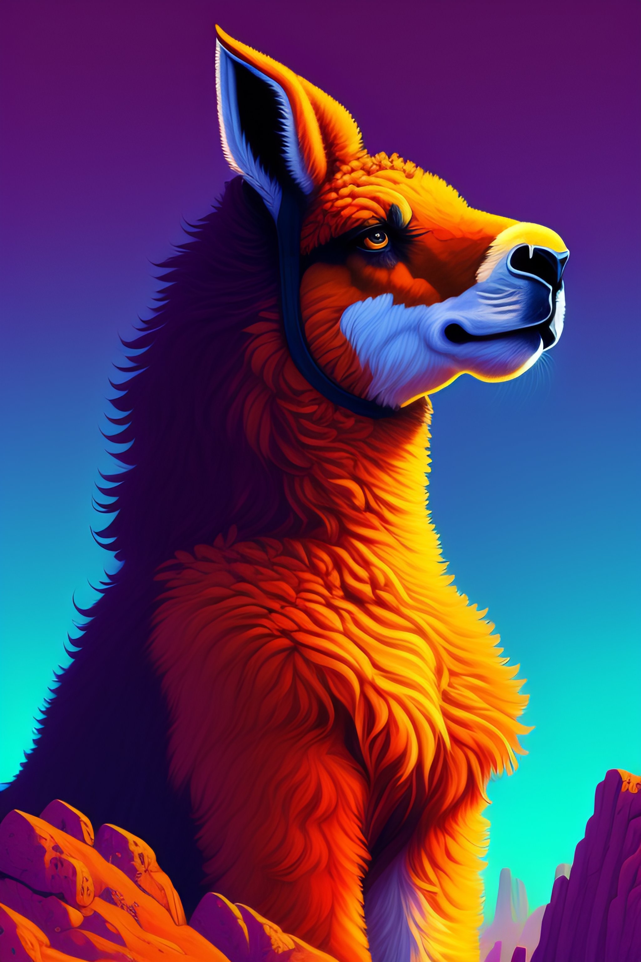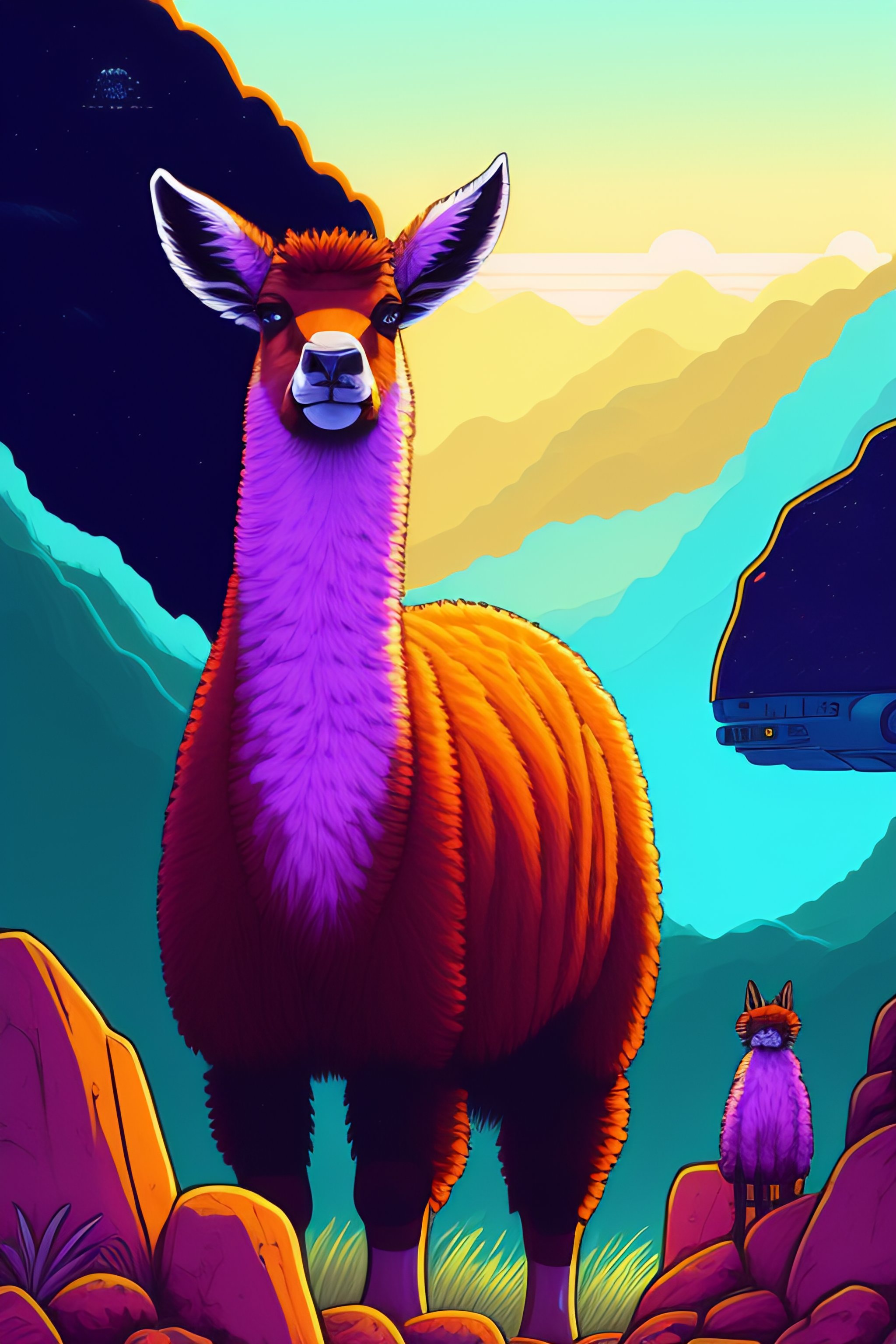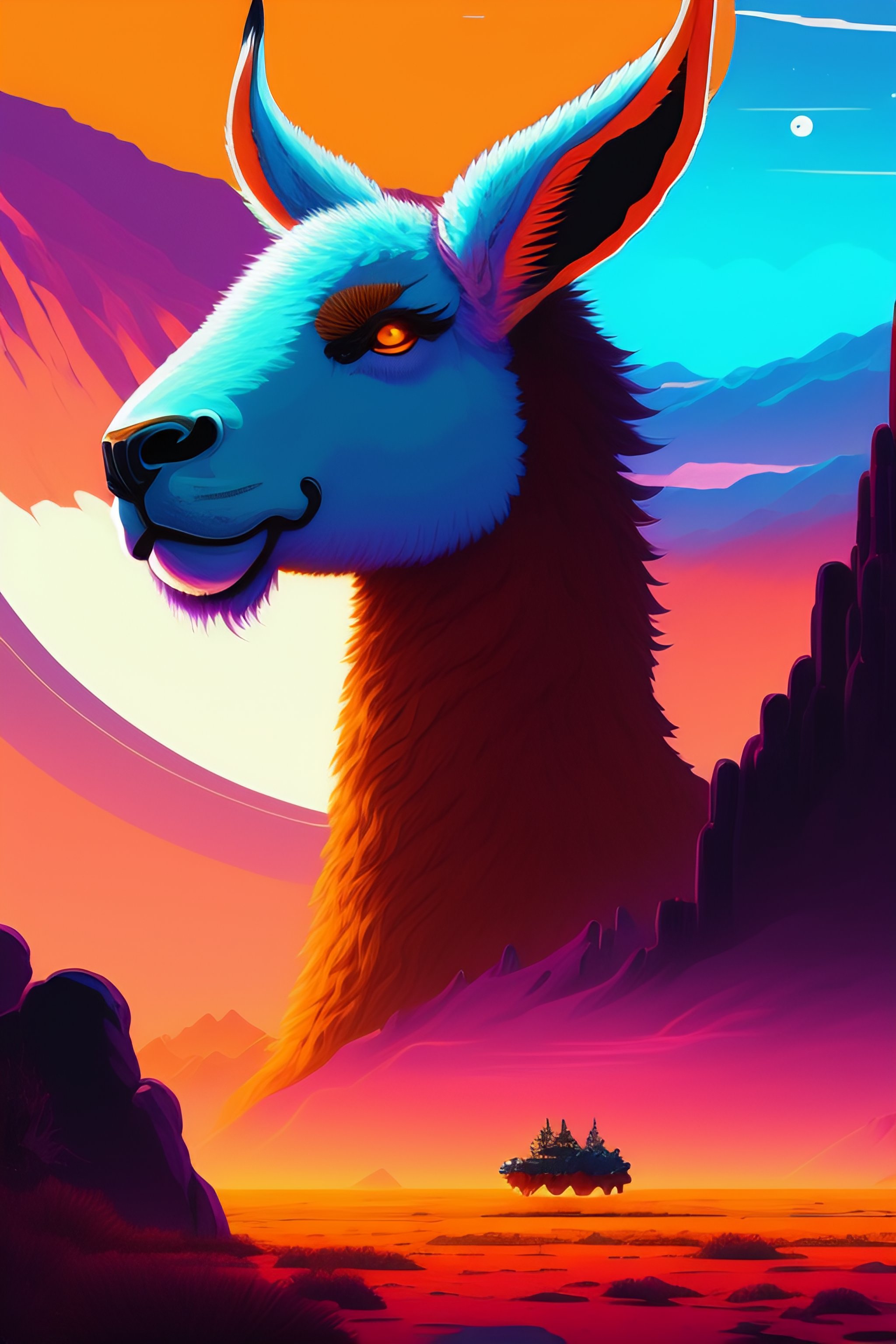 Photo of a huge savage llama monster in the space, style of laurie greasley, studio ghibli, akira toriyama, james gilleard, genshin impact, trending pixiv fanbox, acrylic palette knife, 4k, vibrant colors, devinart, trending on artstation, low details