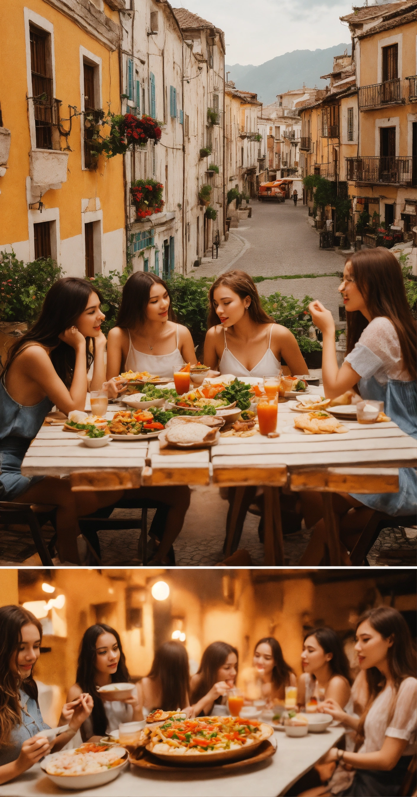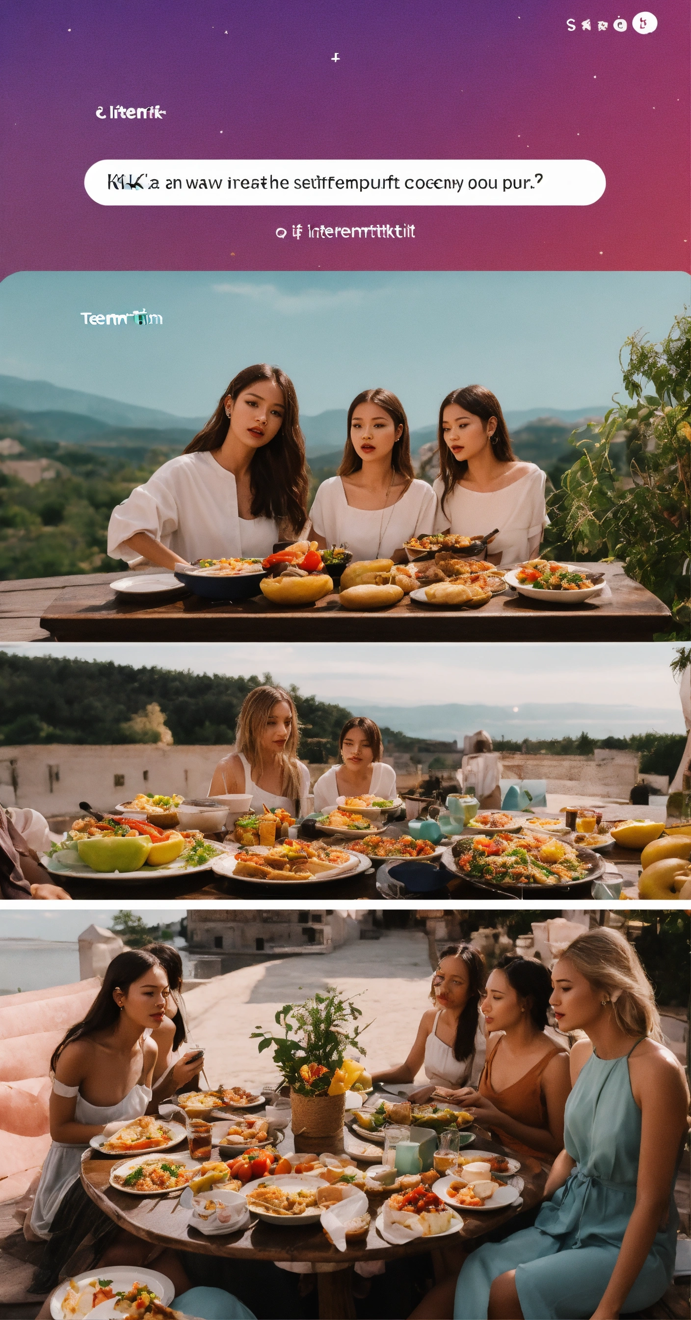A group of women sitting at a table with plates of food, tiktok video, southern european scenery, meme template, kuntilanak, empty city, inspired by sebastian spreng, frequency indie album cover, trending on interfacelift, local close up, tiktok, left, 1 4 4 p, terem, text