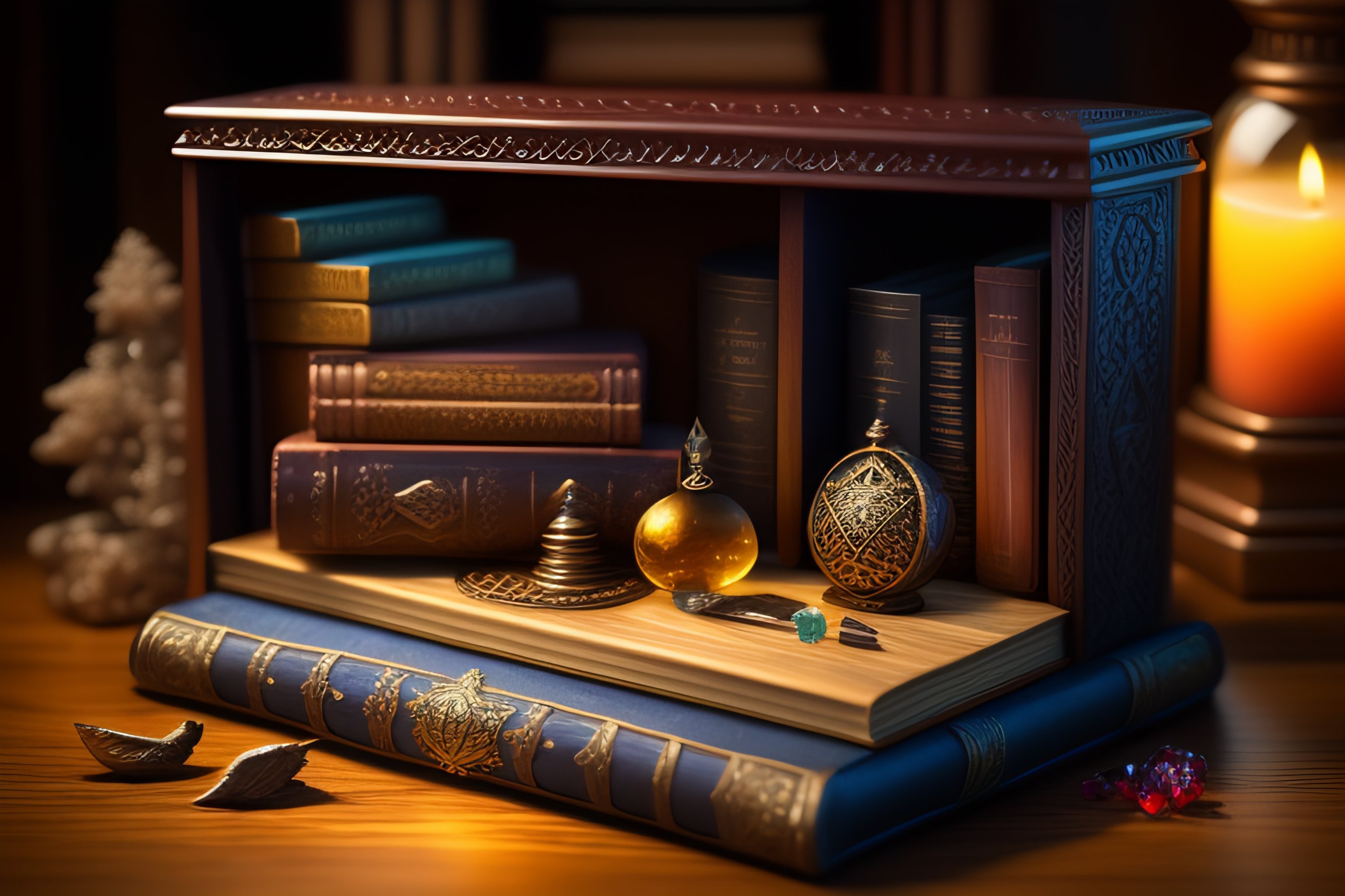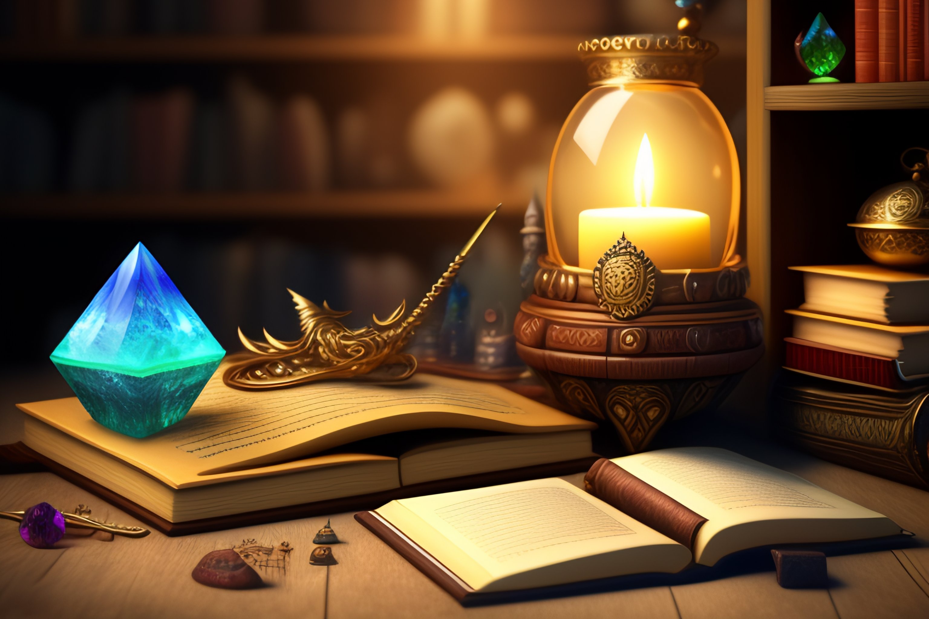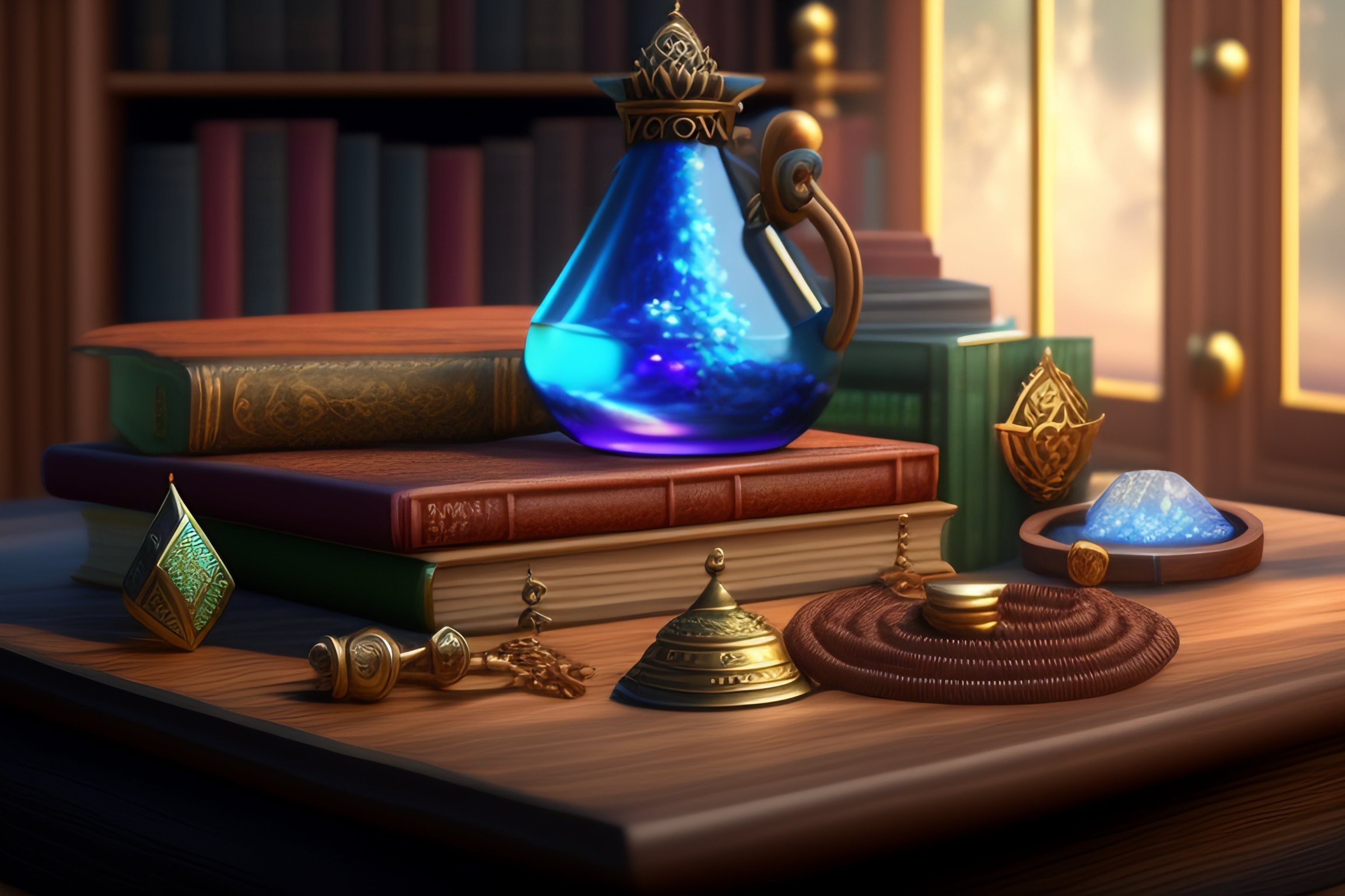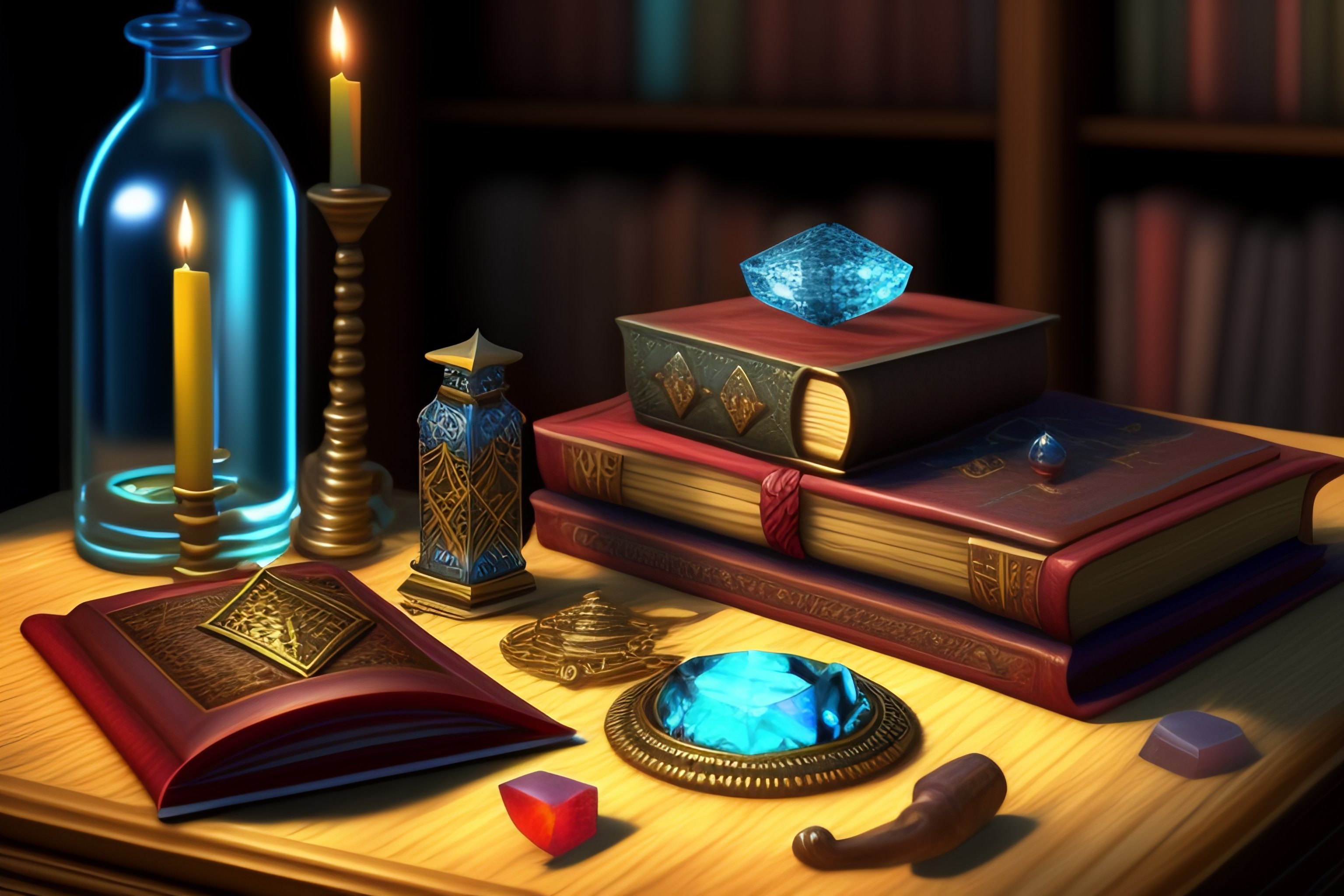 Fantasy wizard's work table with magical artifacts