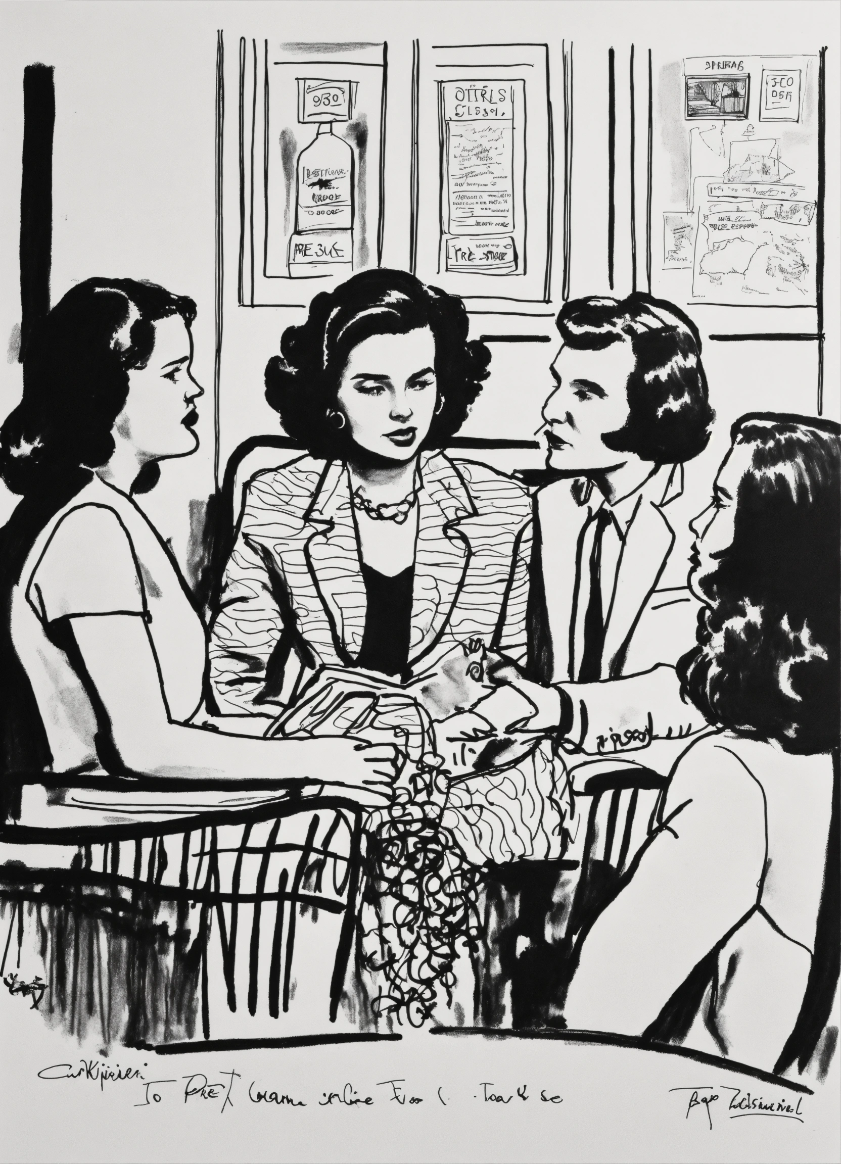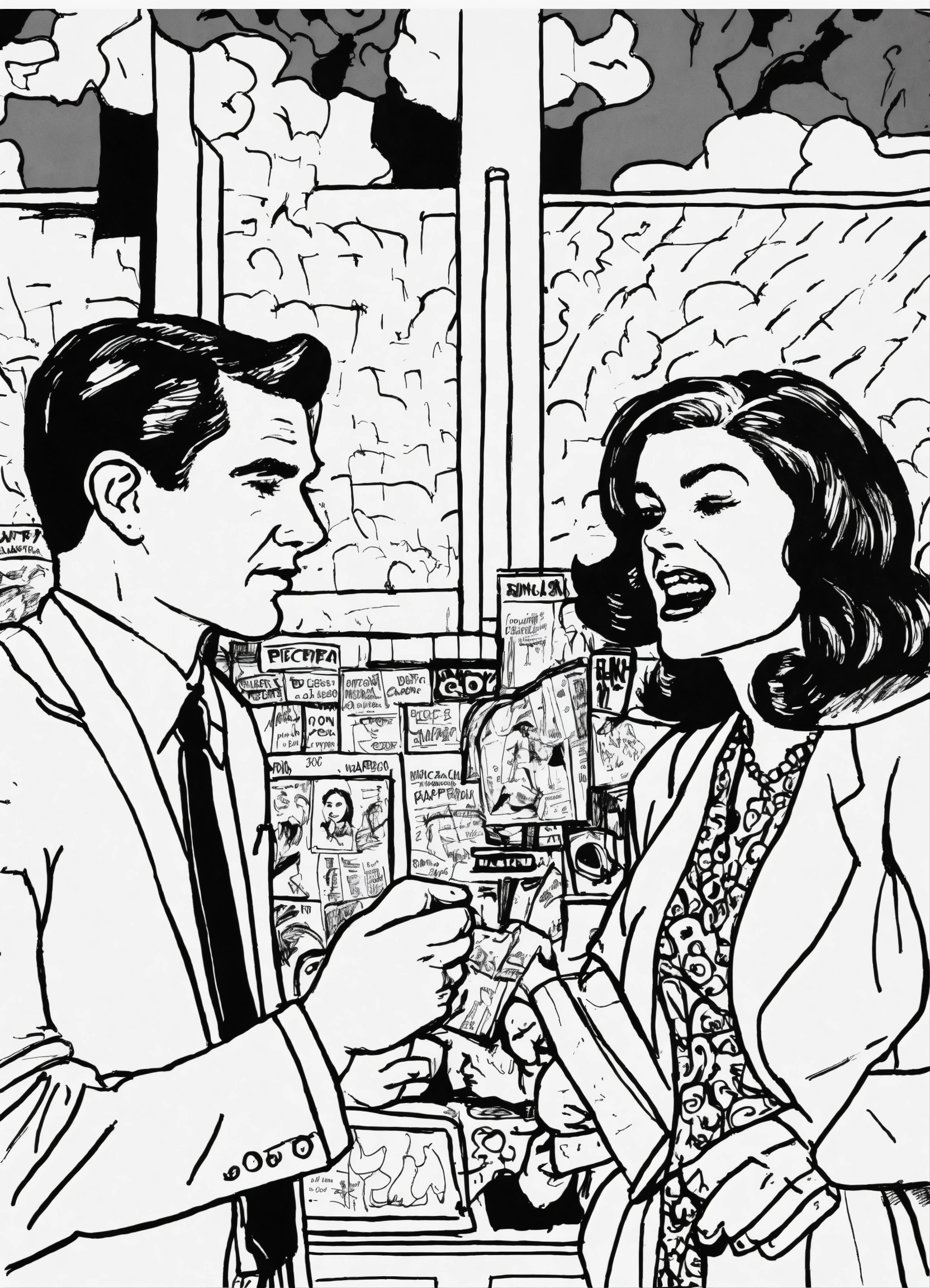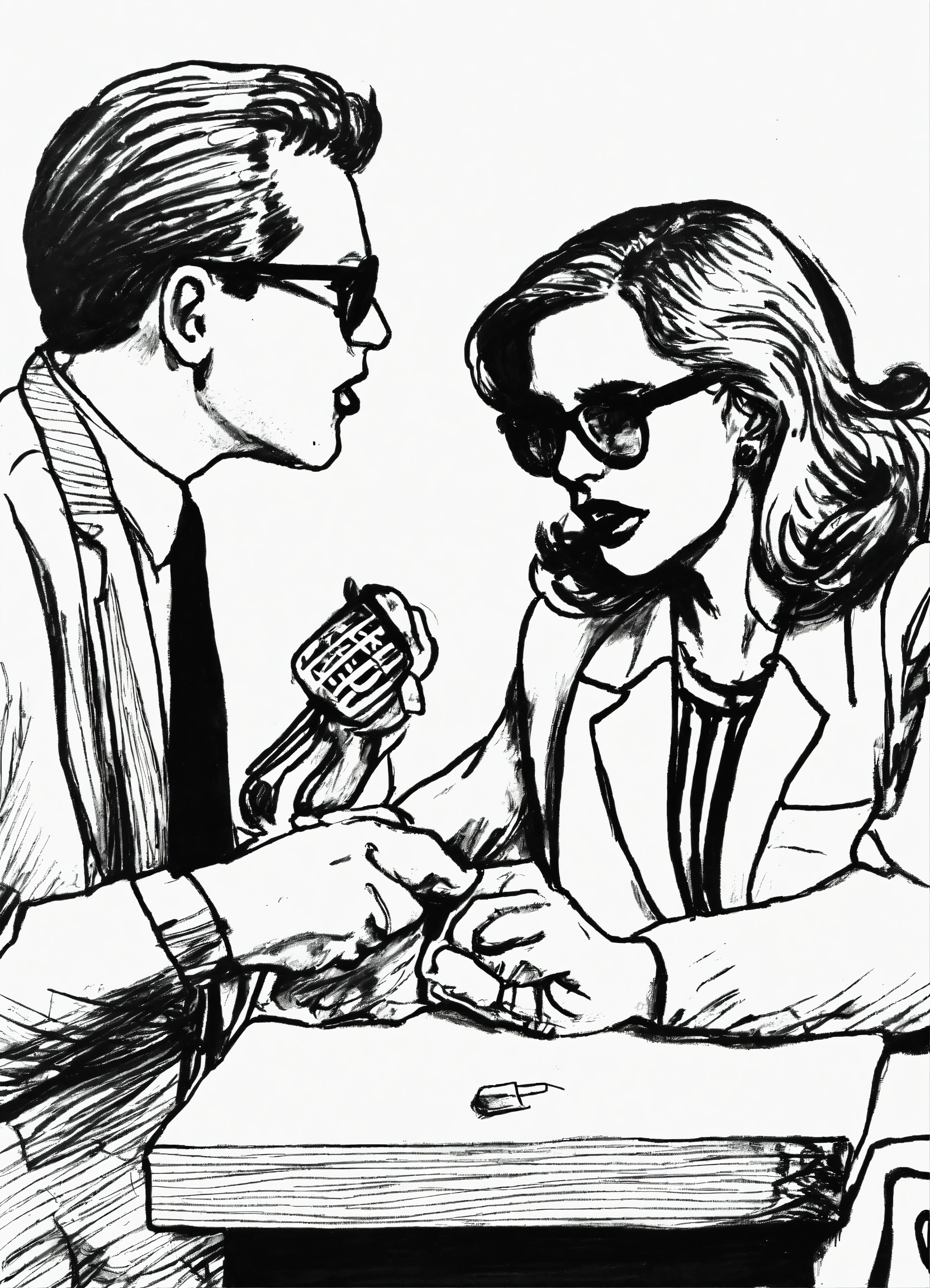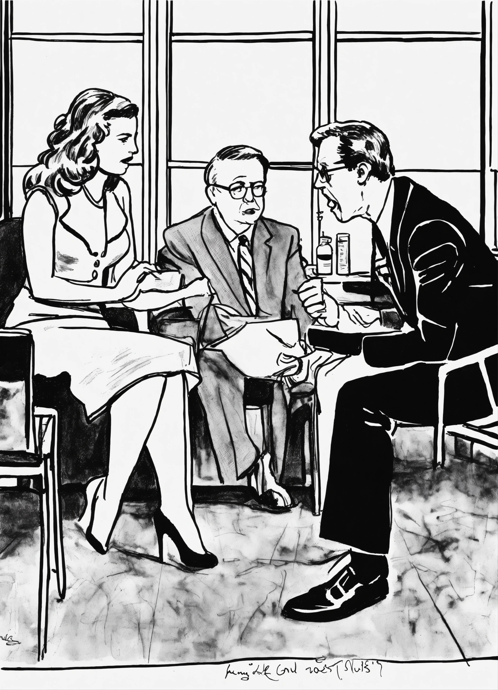 Simple 1950s sharpie drawing black and white only.. three people engaged in a passionate debate. one person resembles a politician from the republican party, while the other is a woman politician from the democrat party, along with a hippie girl. they are on white background.