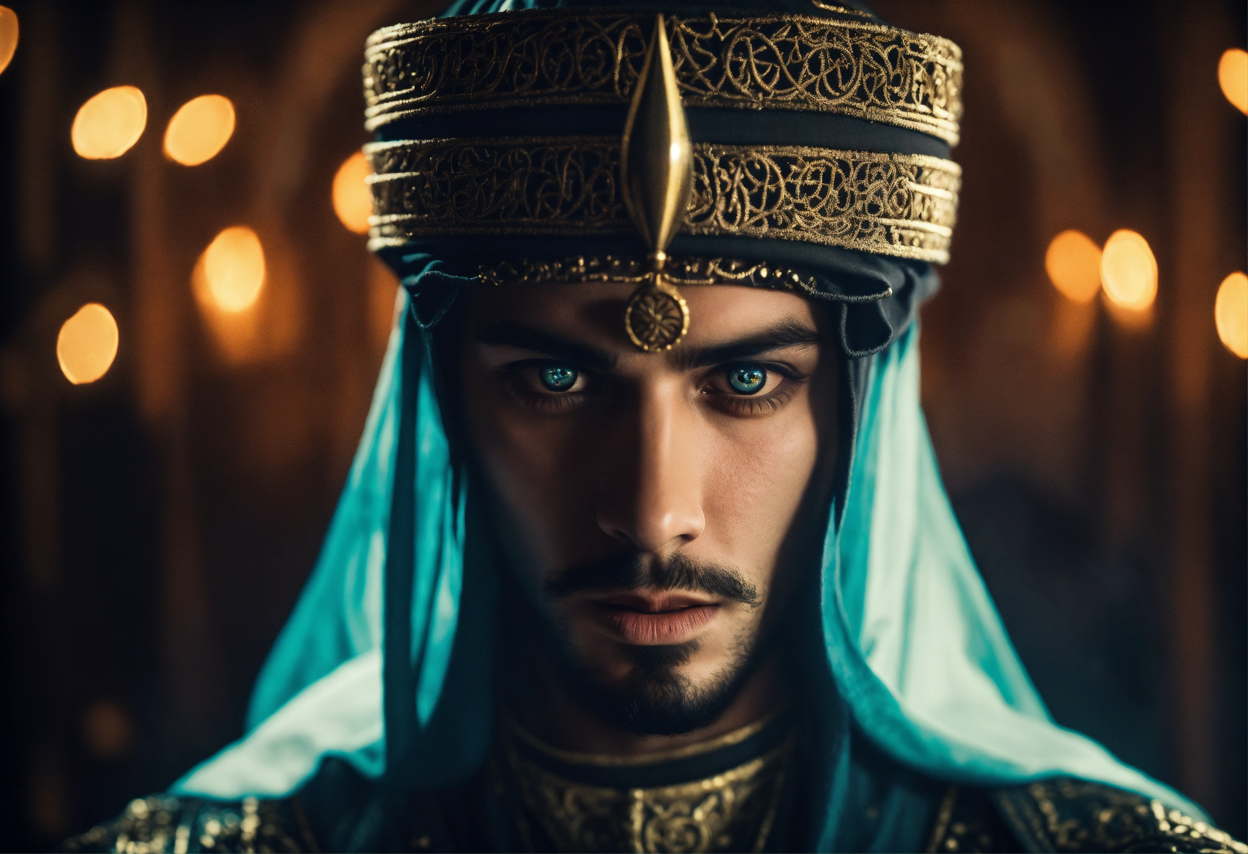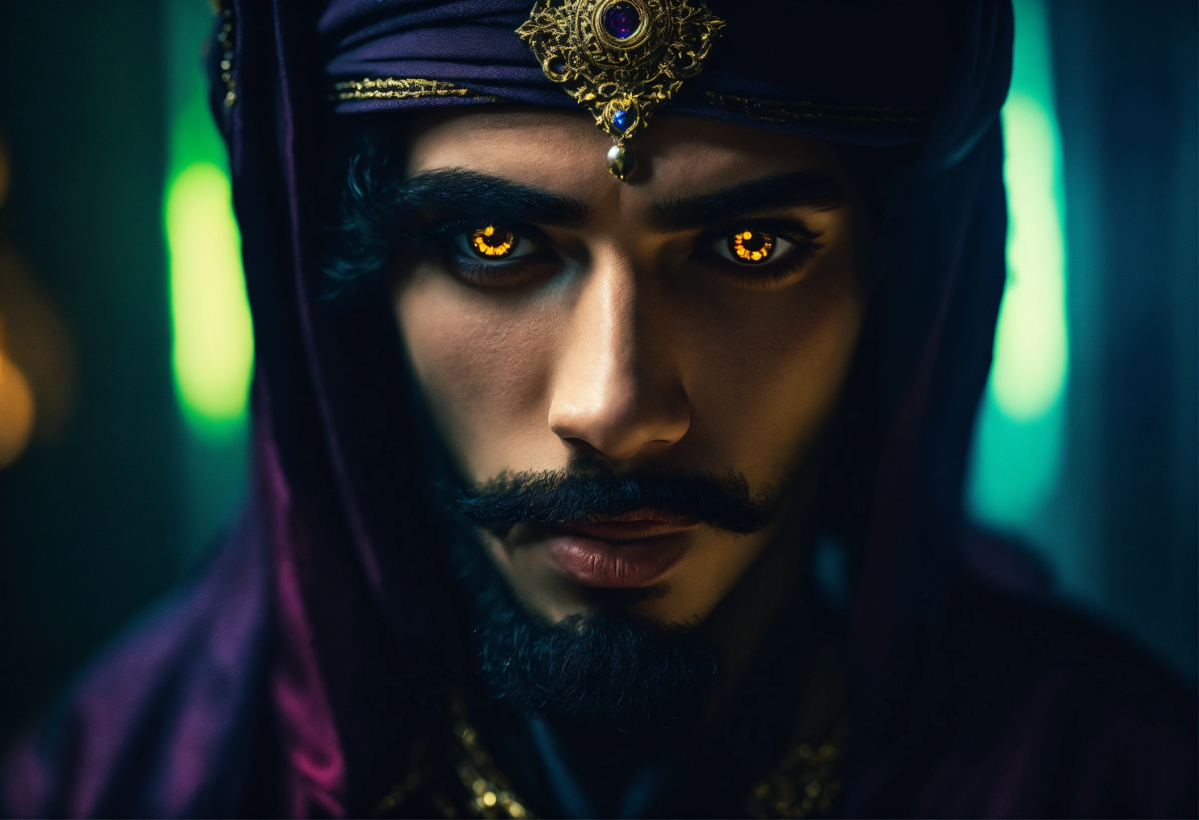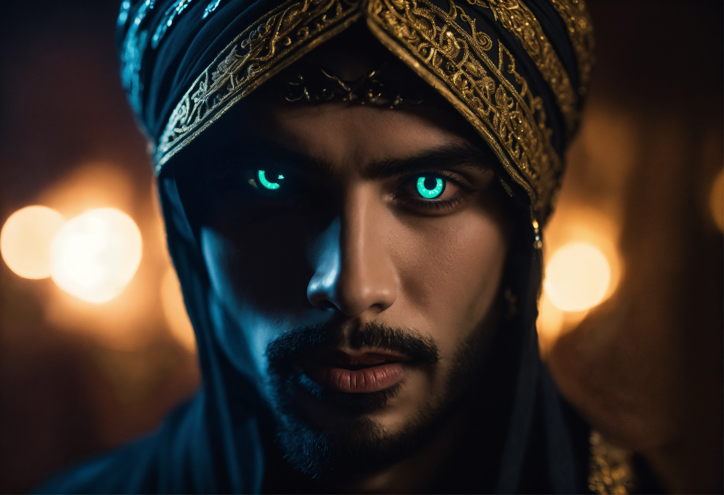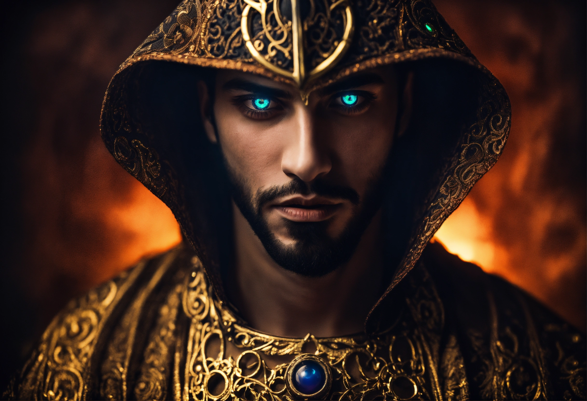 Dark dramatic headshot of a young handsome arabic evil sorcerer with glowing hypnotic eyes, mysterious, enigmatic, elaborate clothing